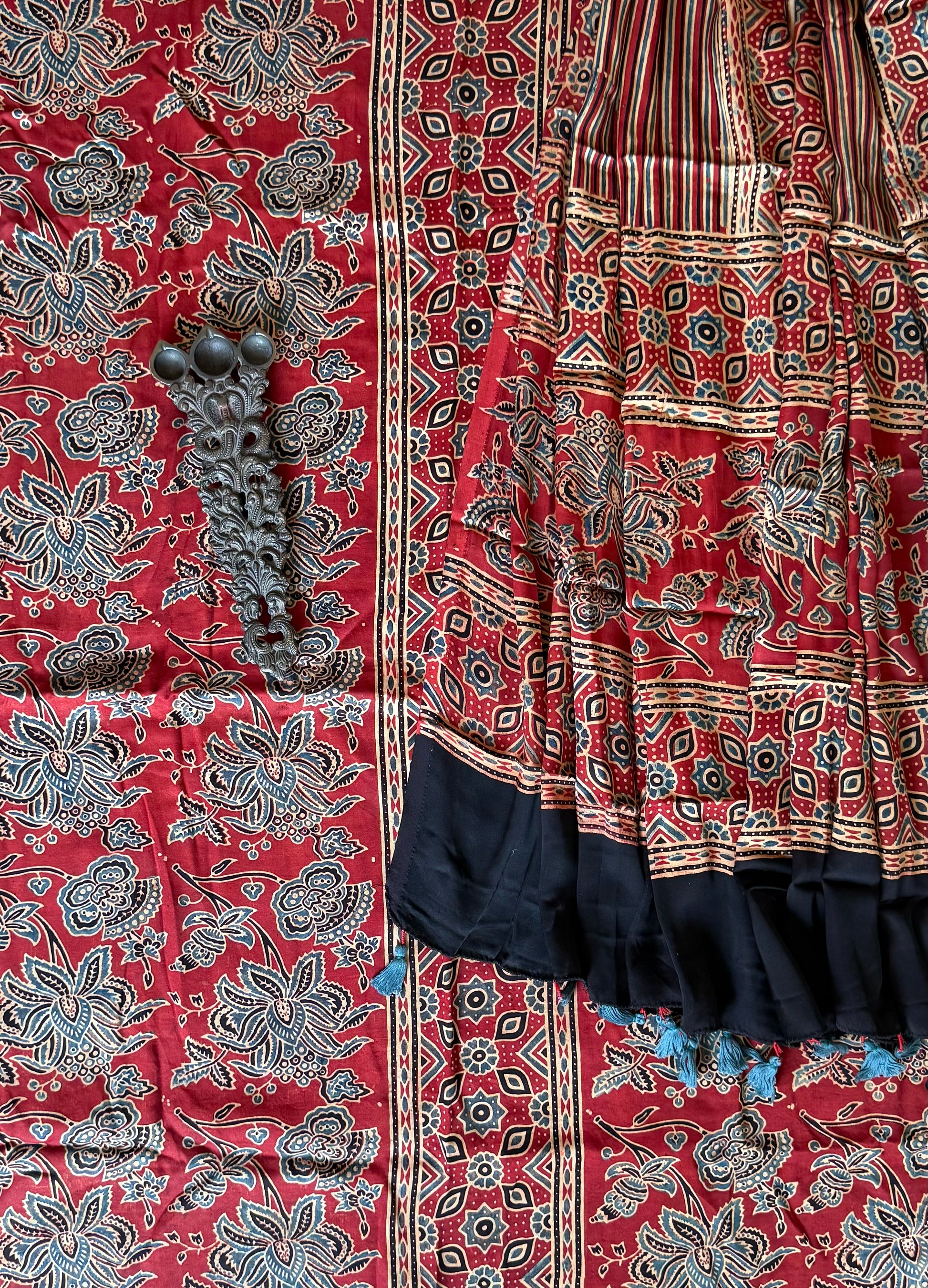 Red  modal silk ajrakh hand crafted kurta dupatta with zari border