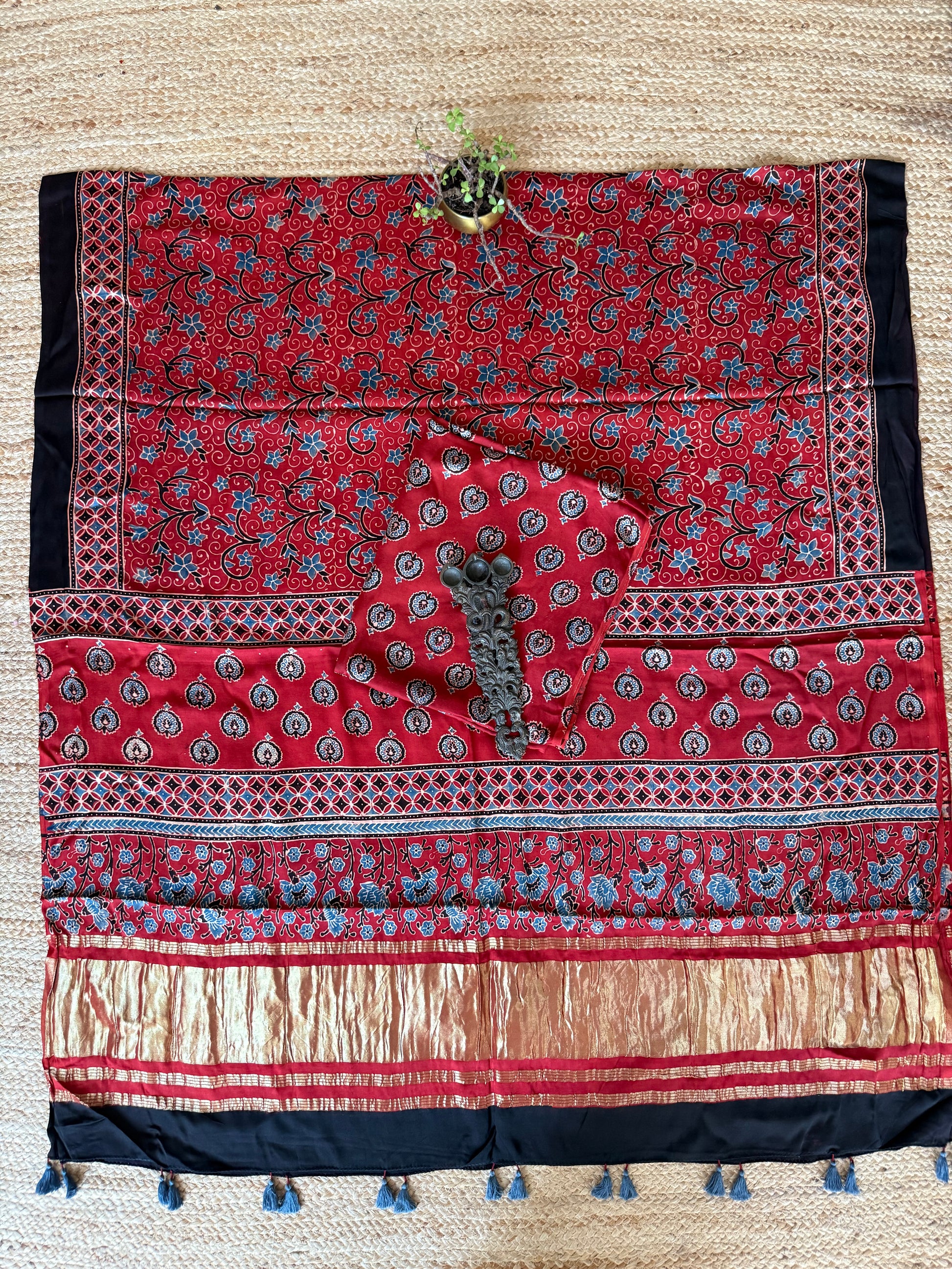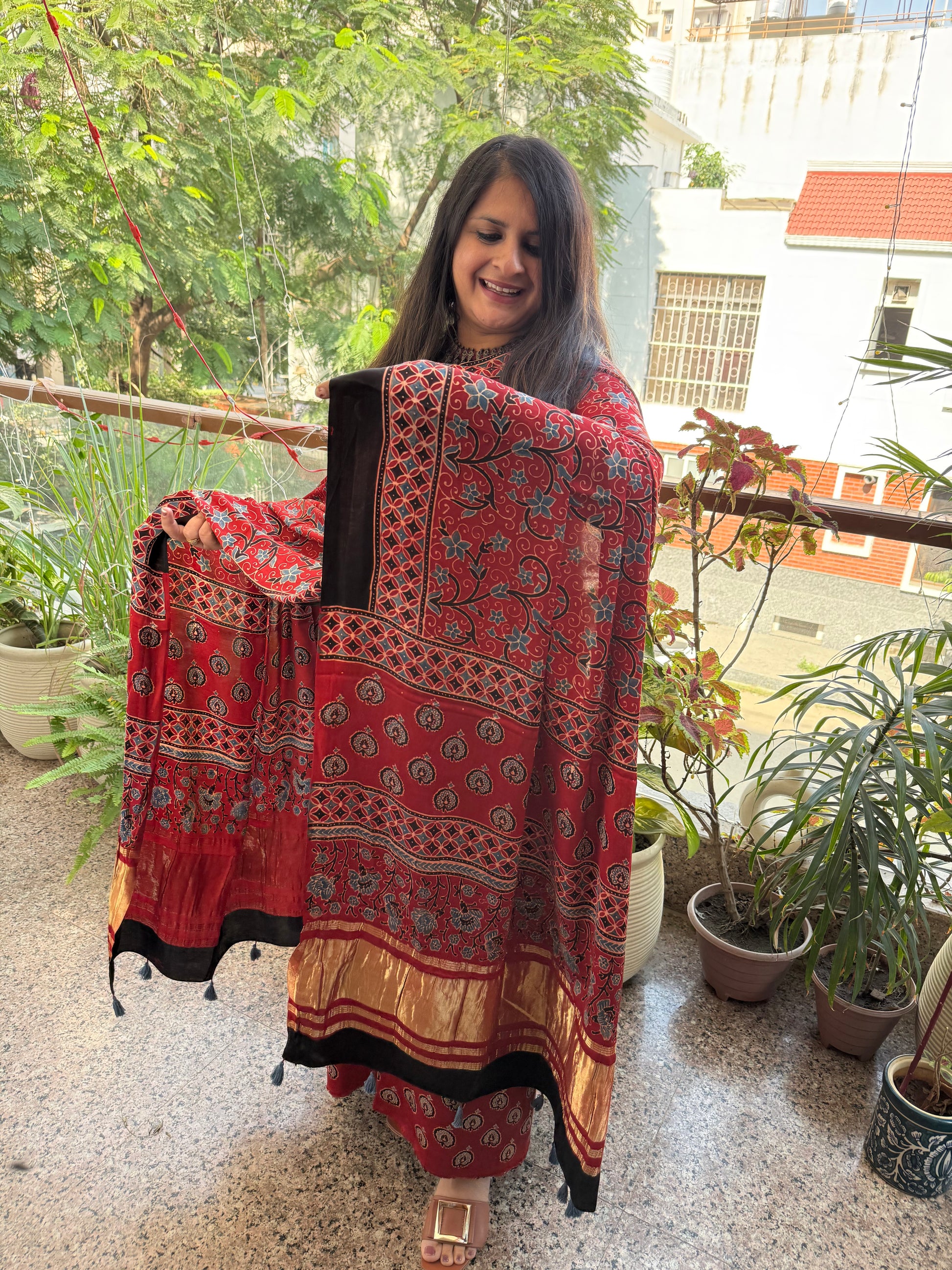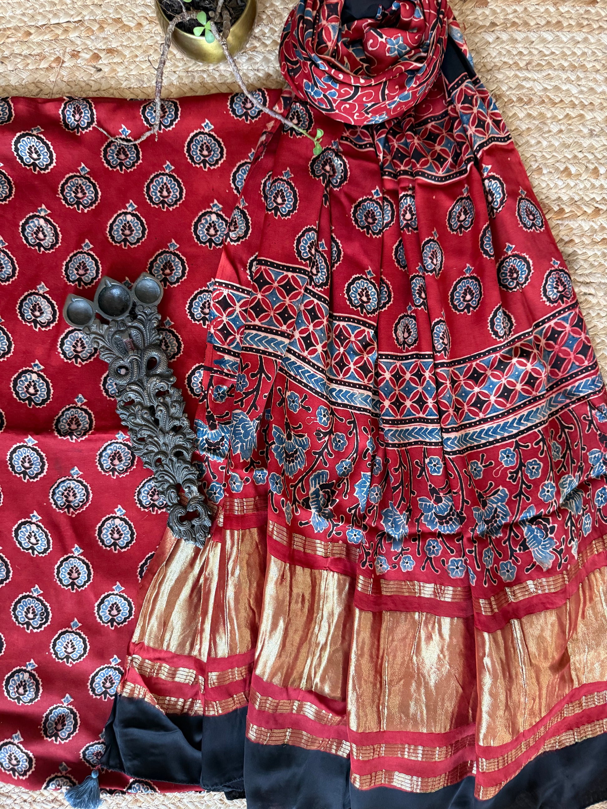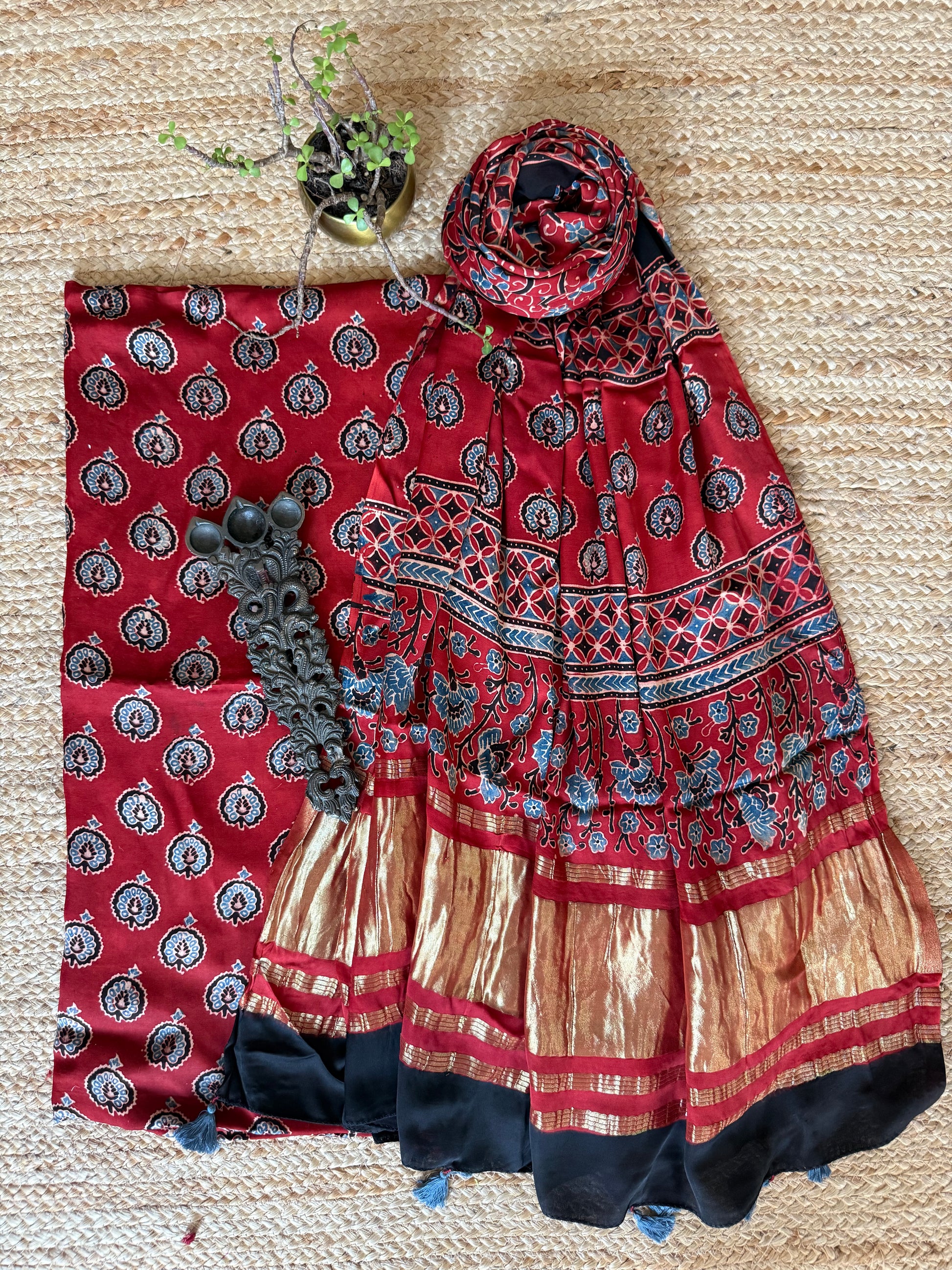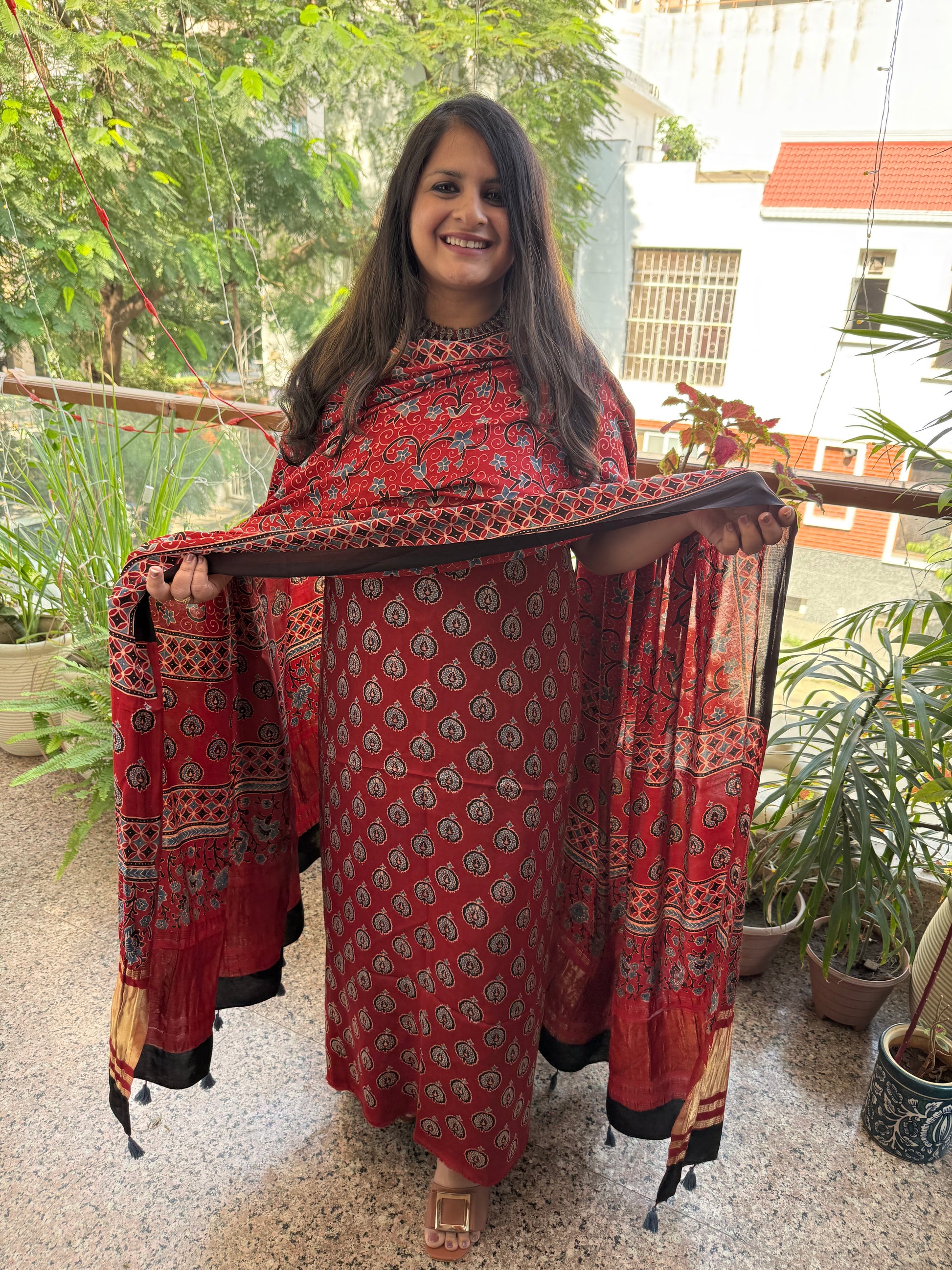 Maroon modal silk ajrakh hand crafted kurta dupatta with zari border