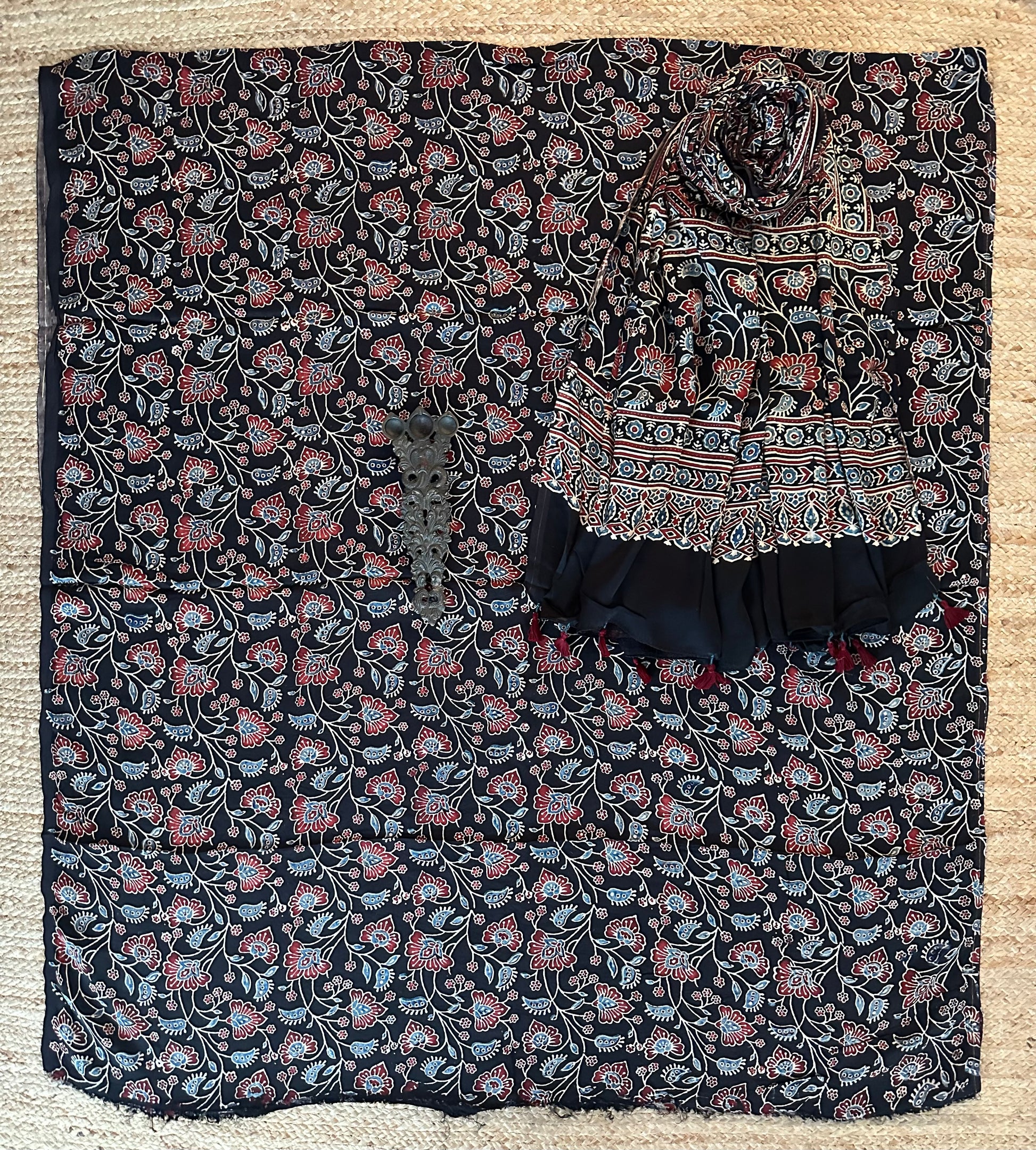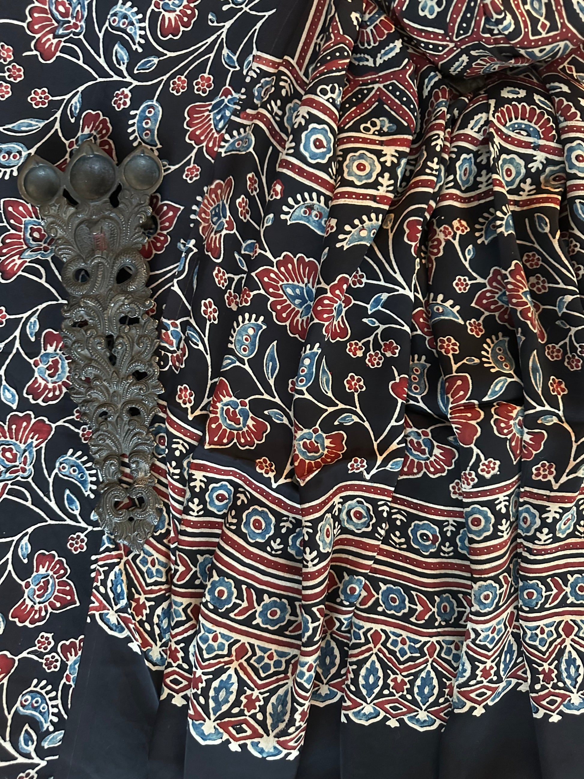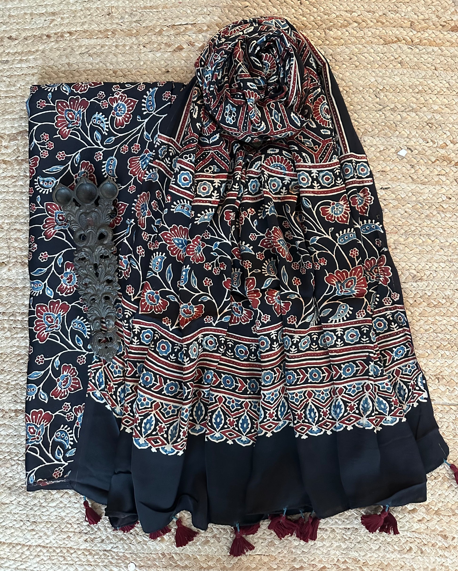 Black modal silk ajrakh hand crafted kurta dupatta with zari border