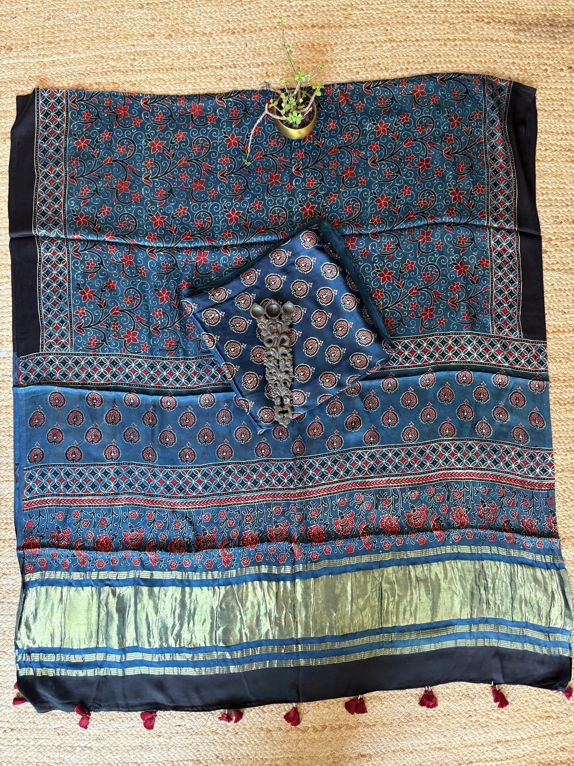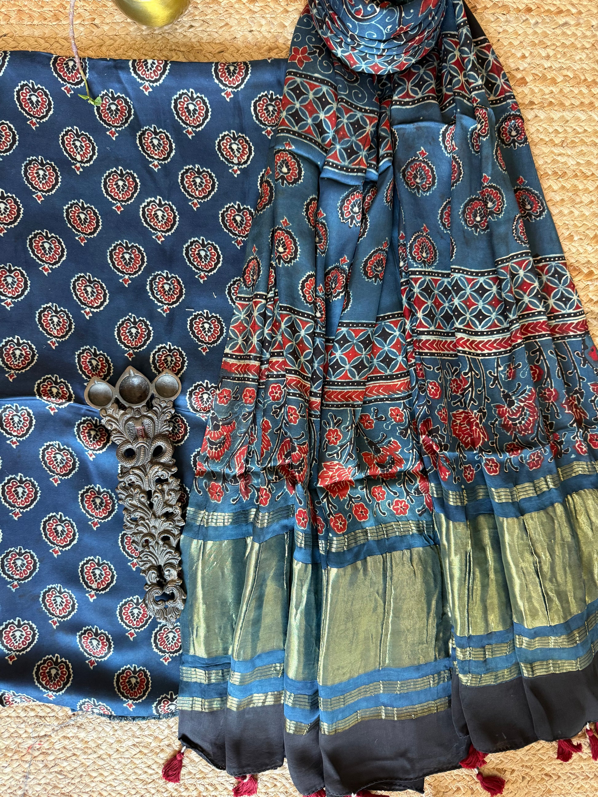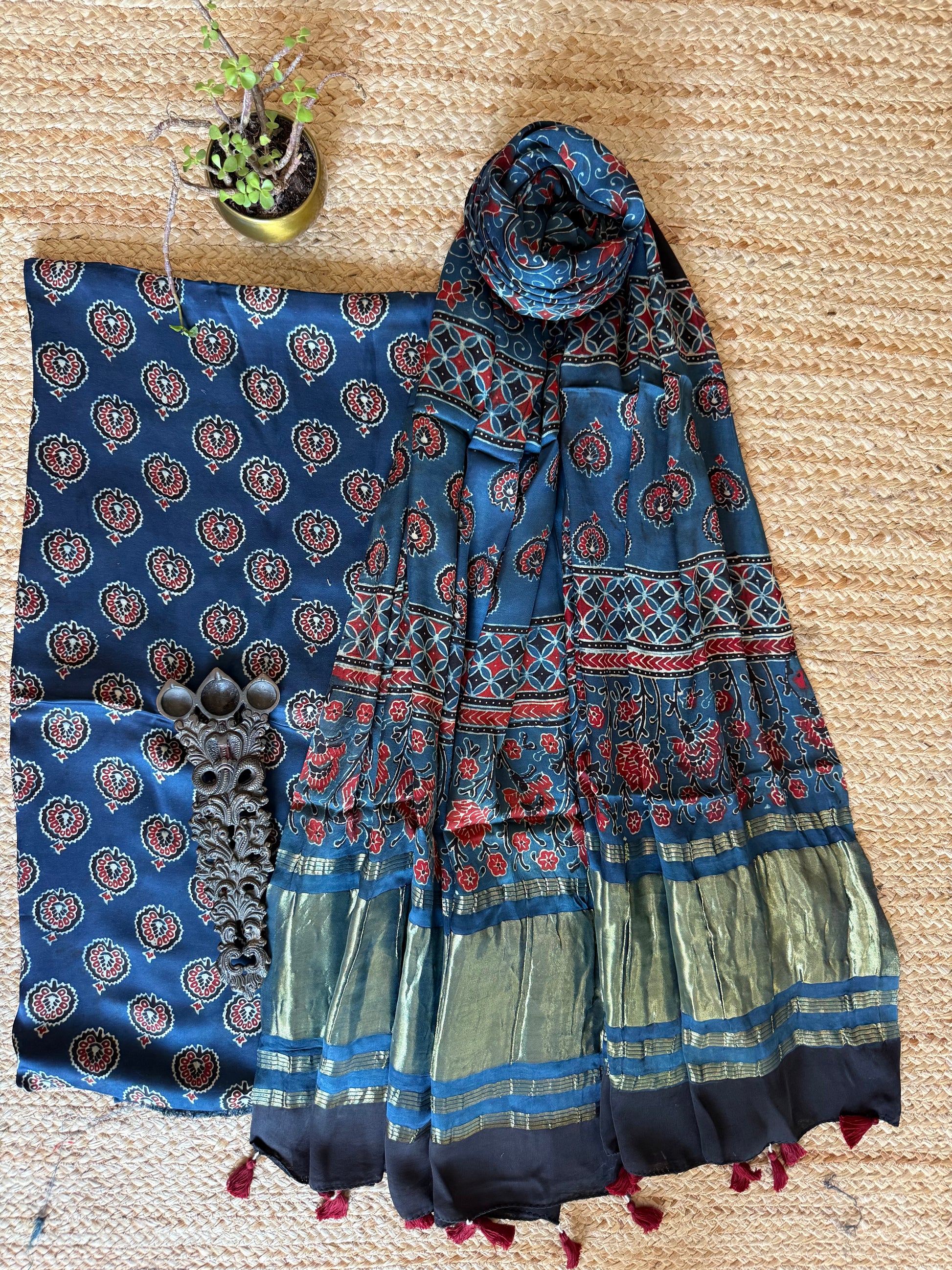 Indigo blue  modal silk ajrakh hand crafted kurta dupatta with zari border
