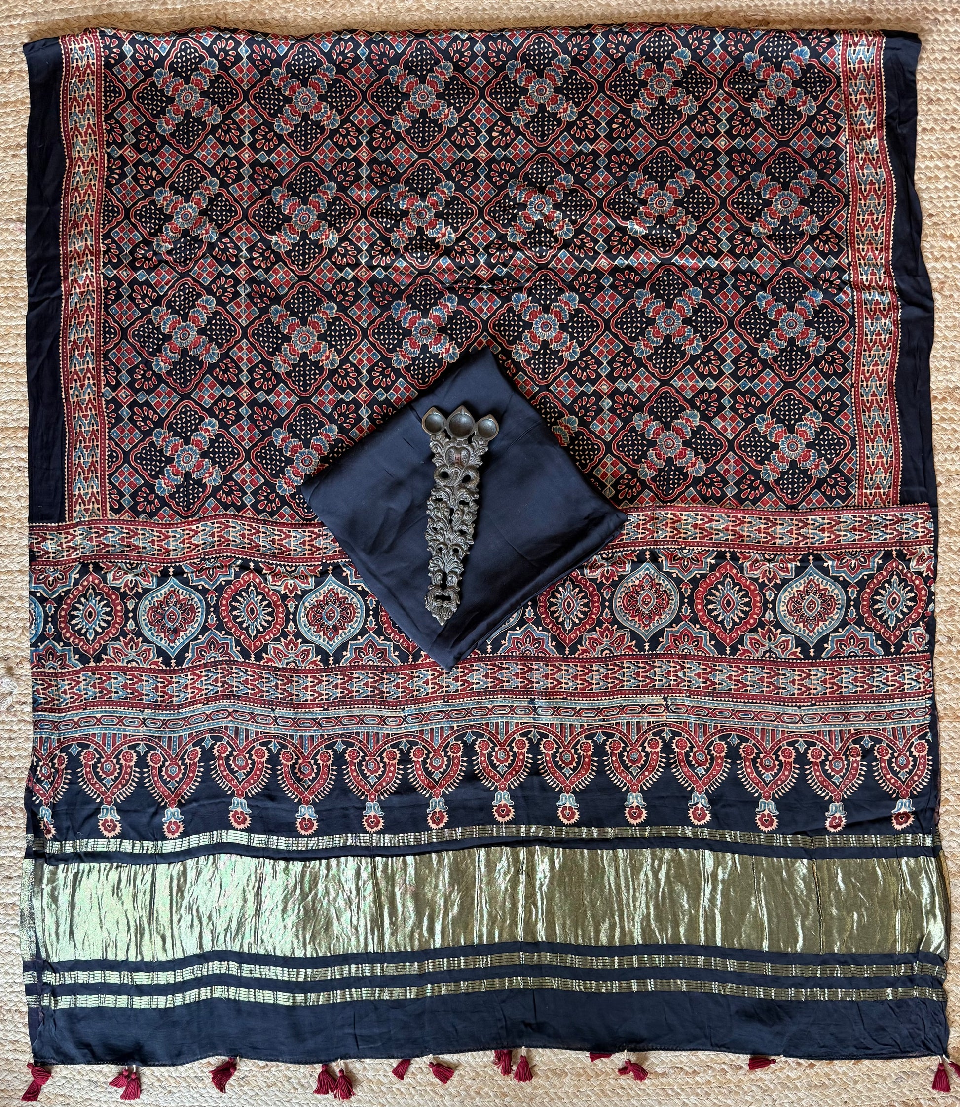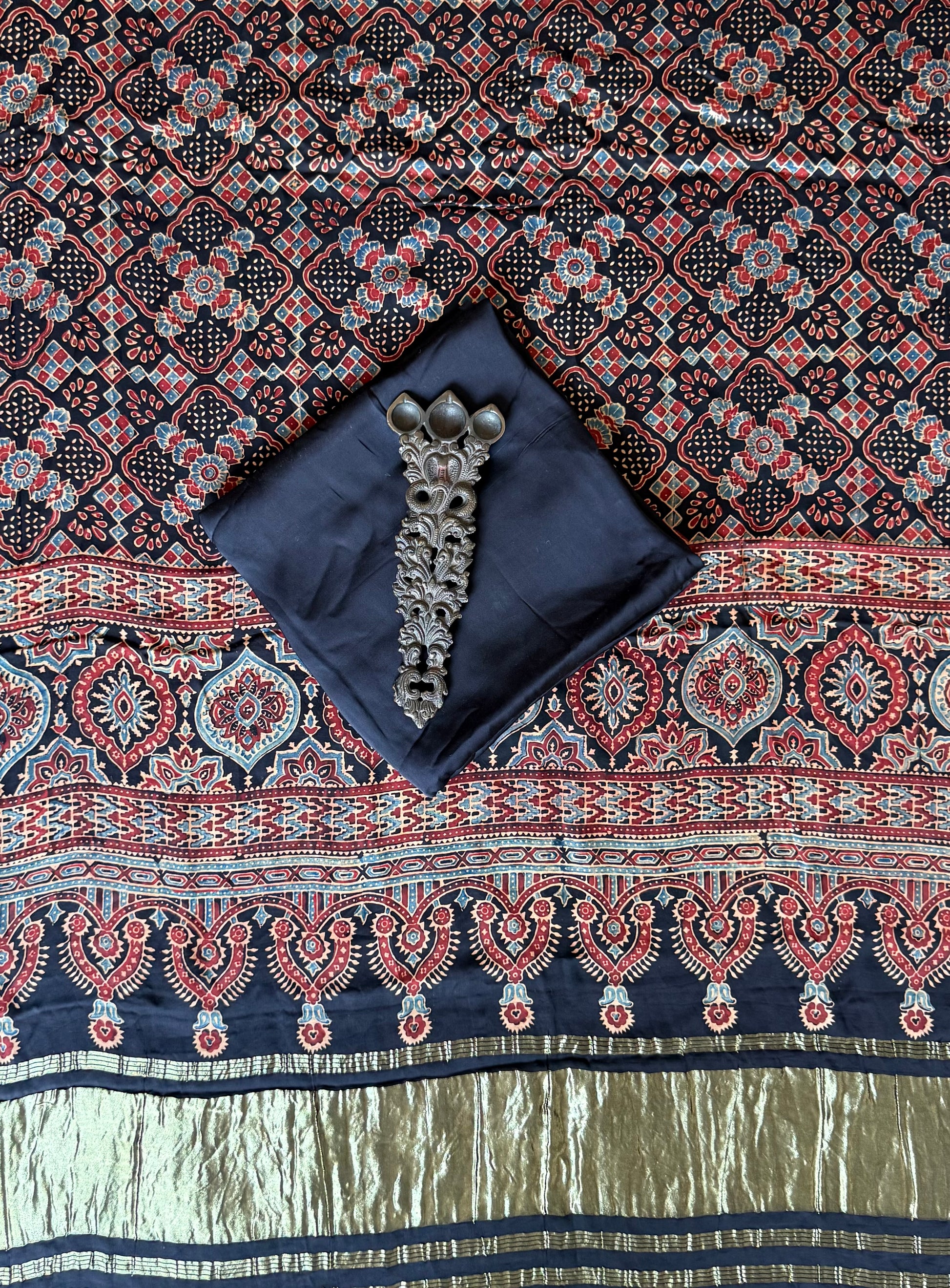 | Black Solid modal silk ajrakh hand crafted kurta With Ajrakh dupatta with zari border