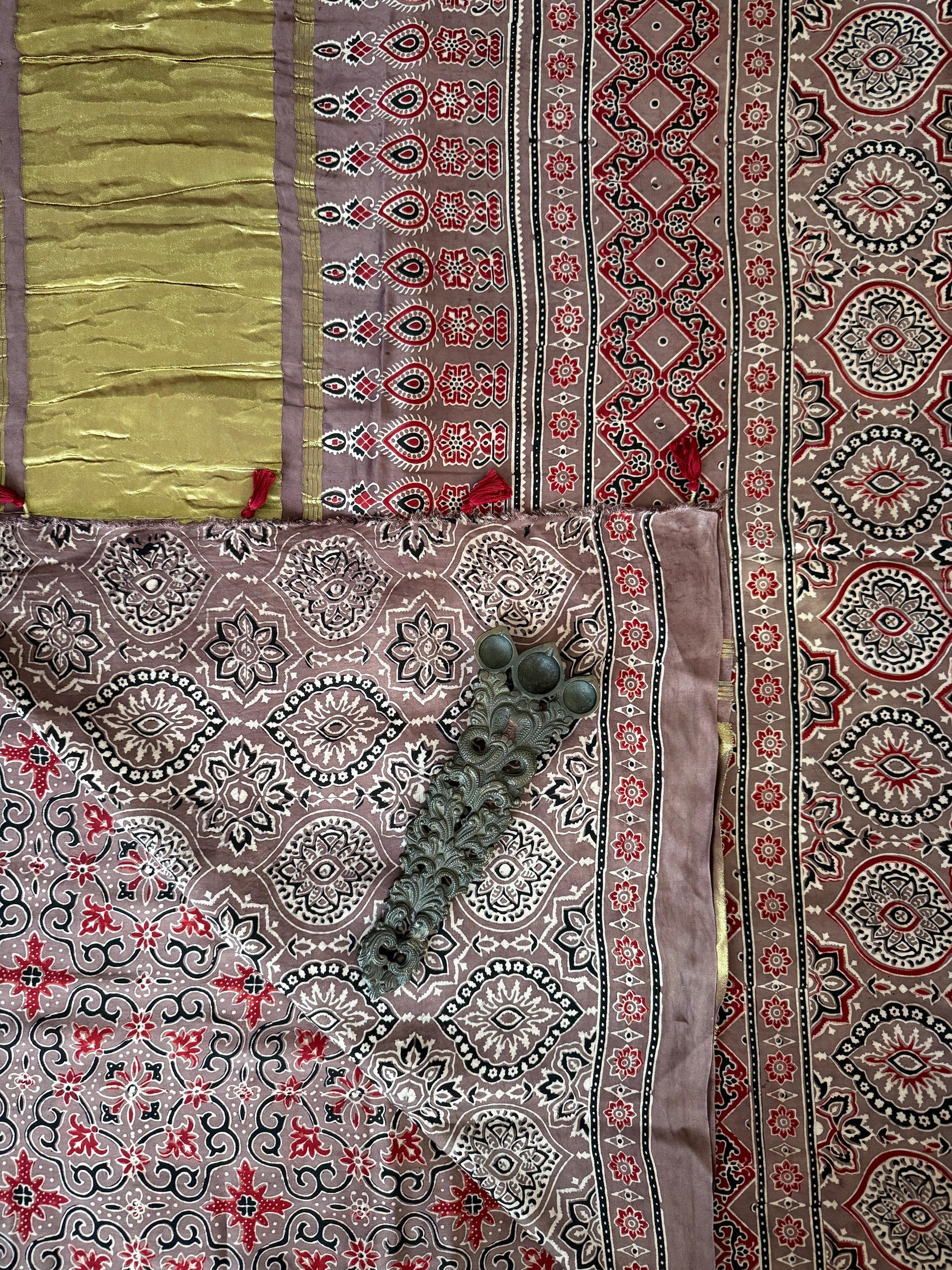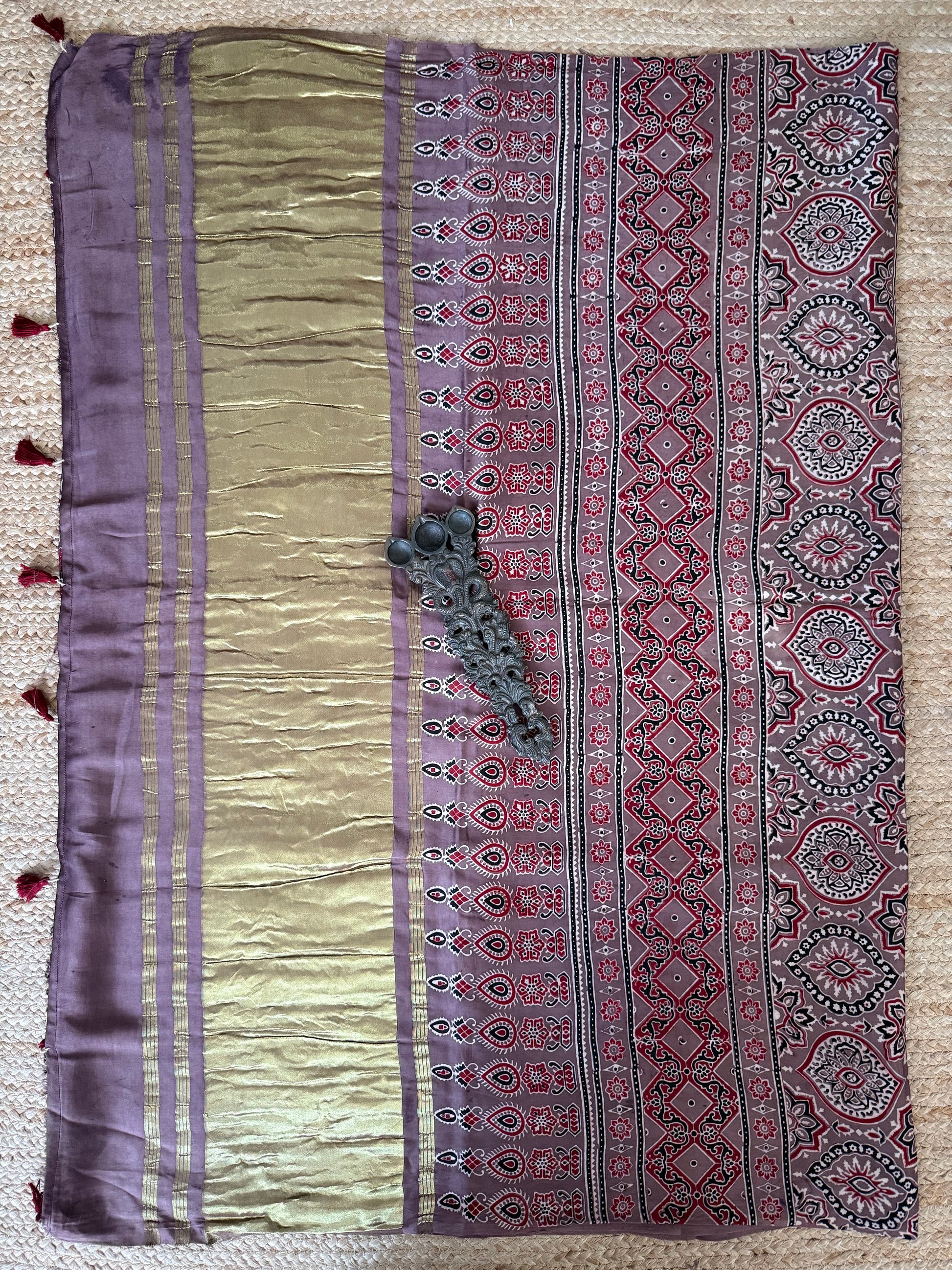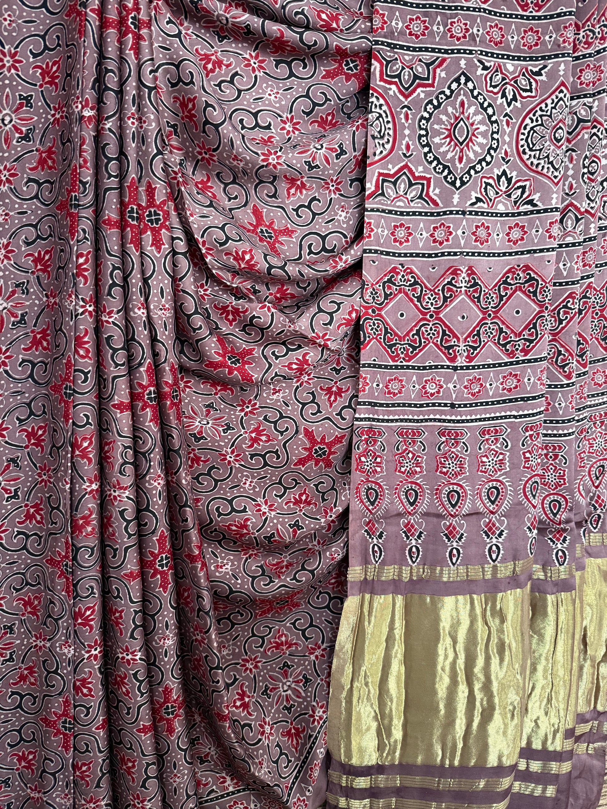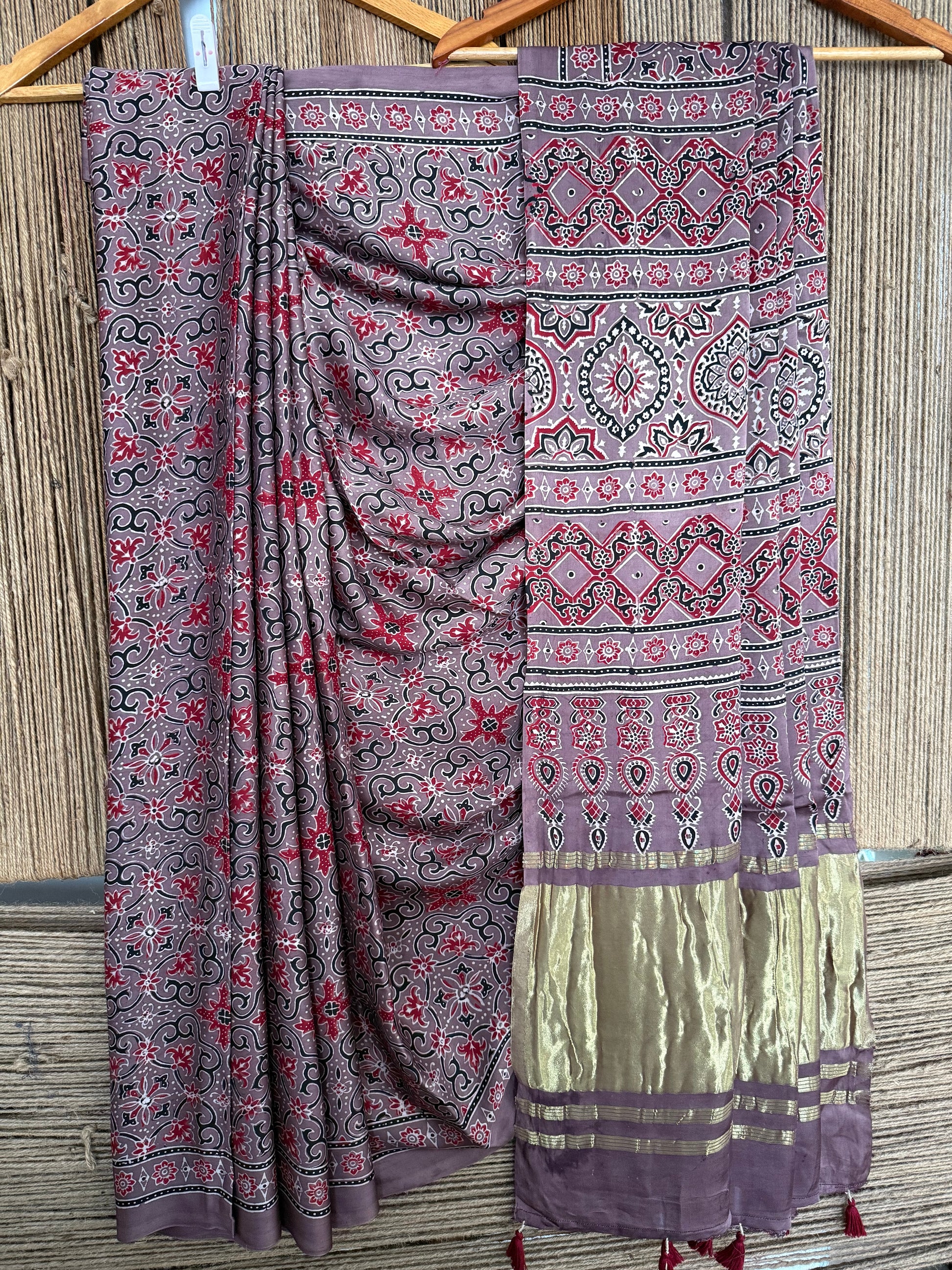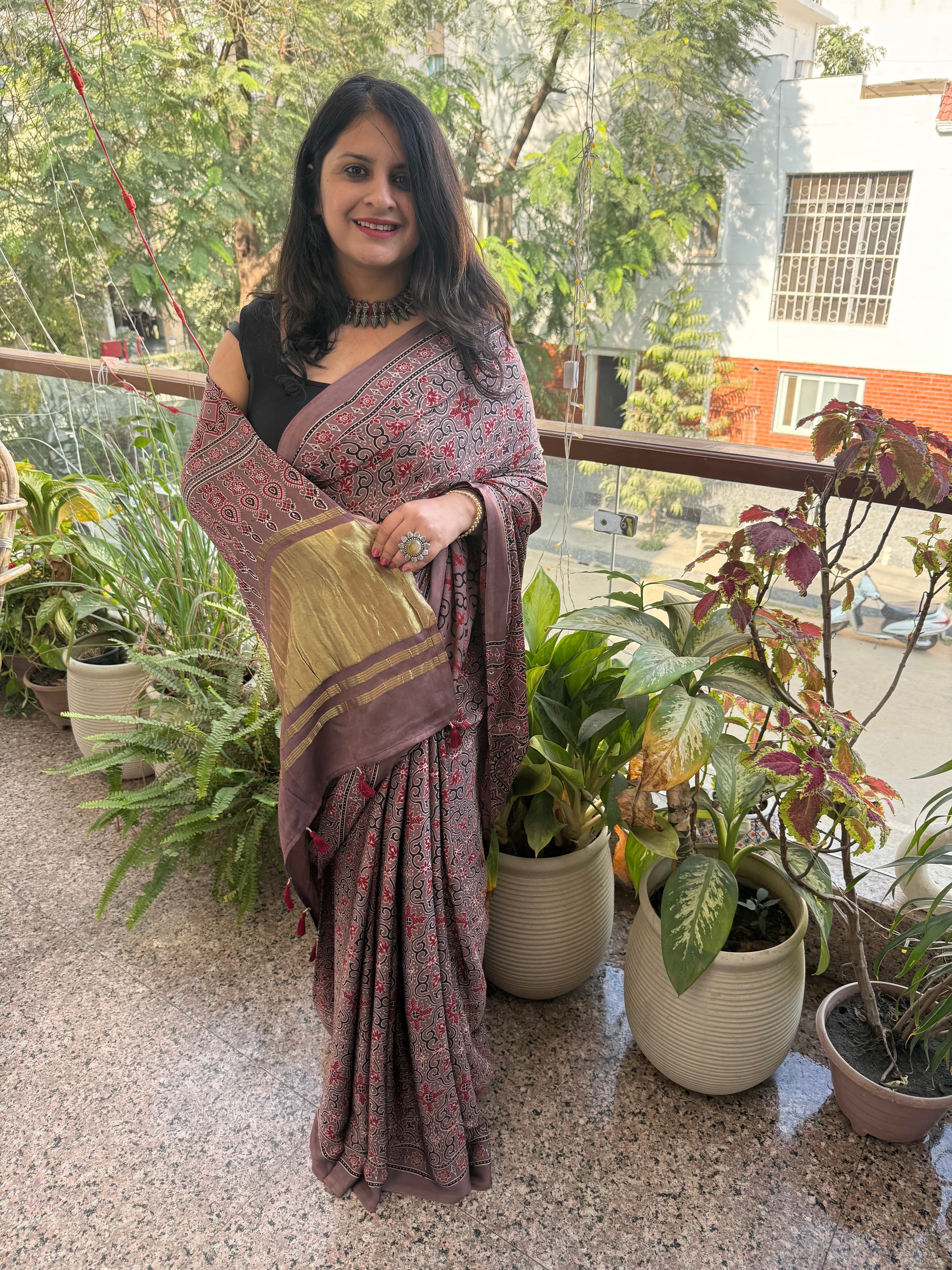 CHIKOO BROWN AJRAKH MODAL SILK SARI WITH ZARI PALLU
