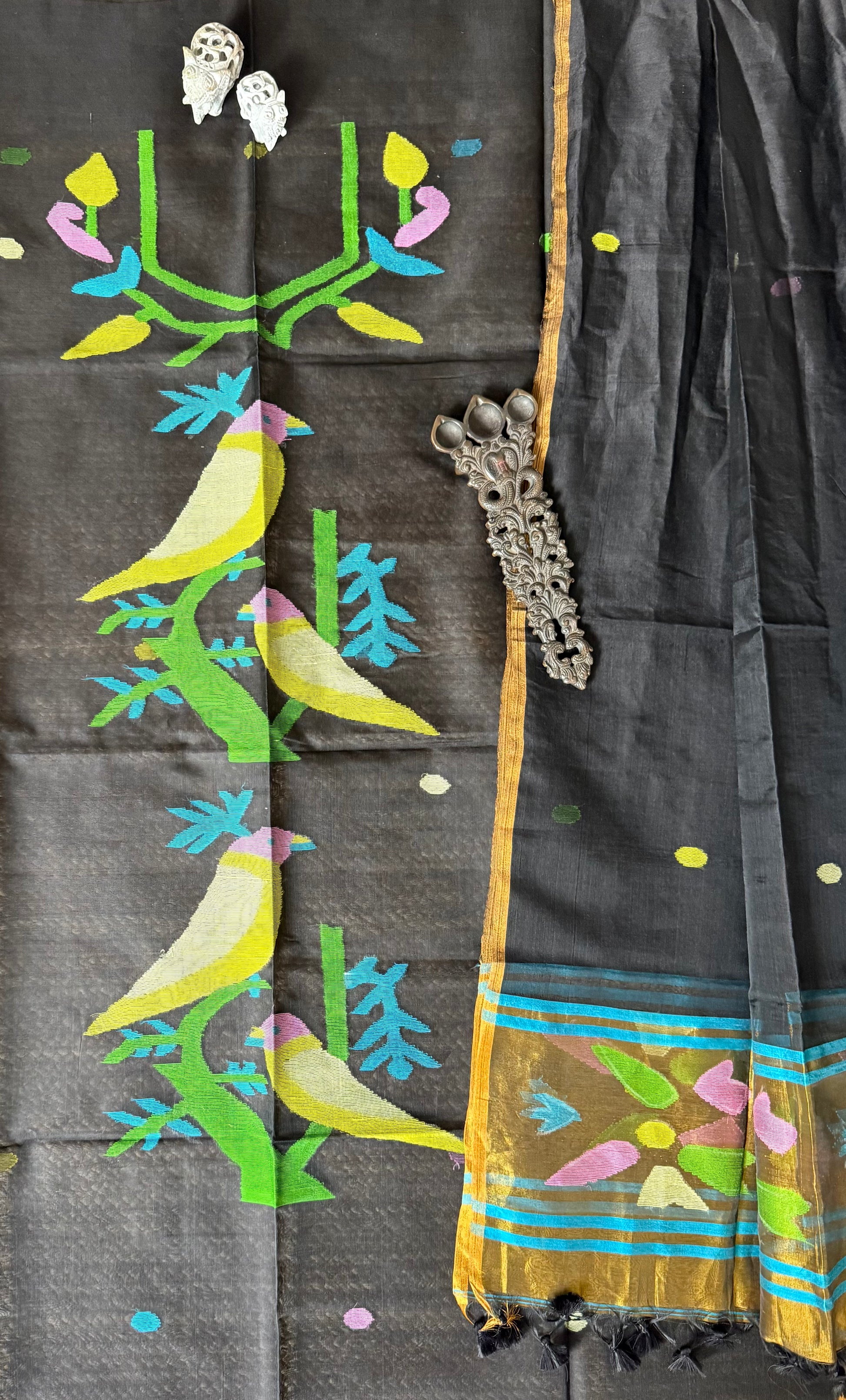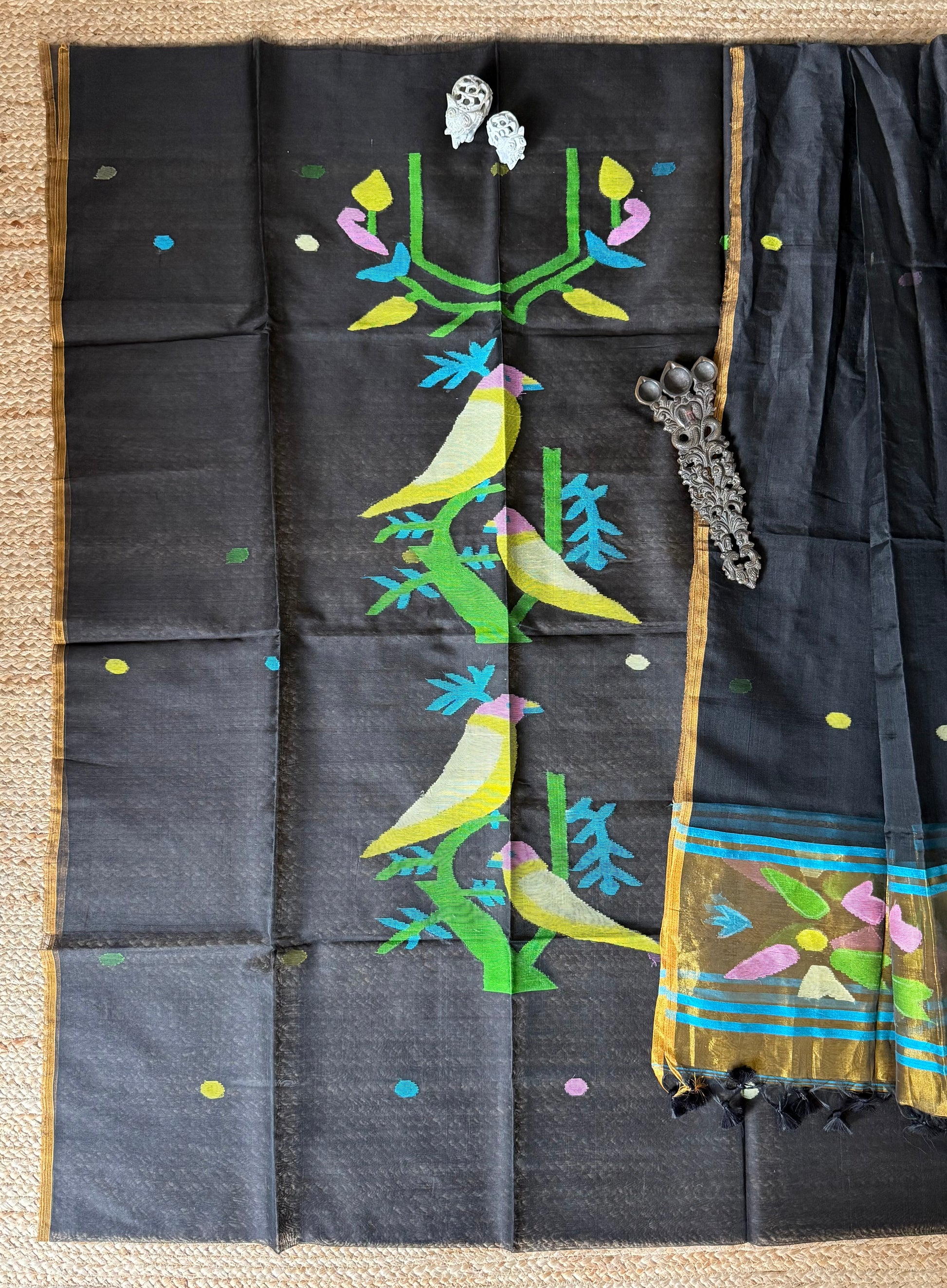 | ALL BLACK handwoven pure muslin silk kurta with resham jamdani muslin dupatta with handmade tassels fabric: 2.5 mtrs meter dupatta : 2.5 mtrs * 35'' slight difference in shade could be due to camera & lights. embrace the imperfection !! happy handloom dry clean only |