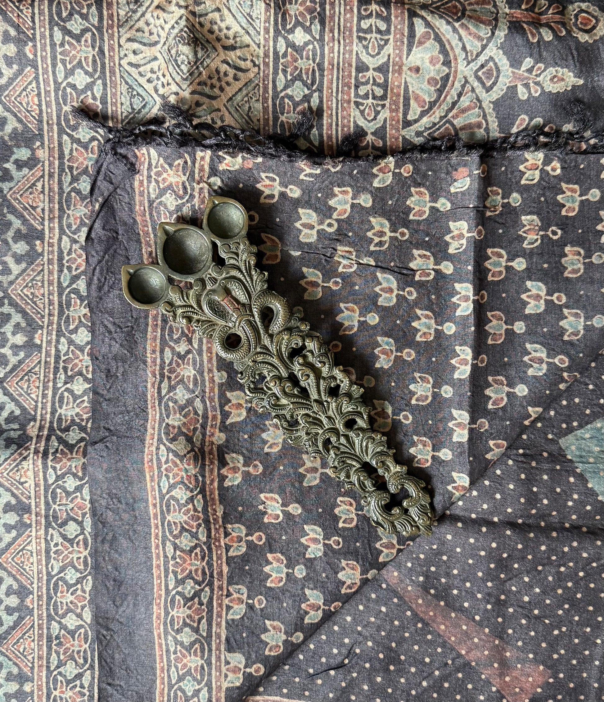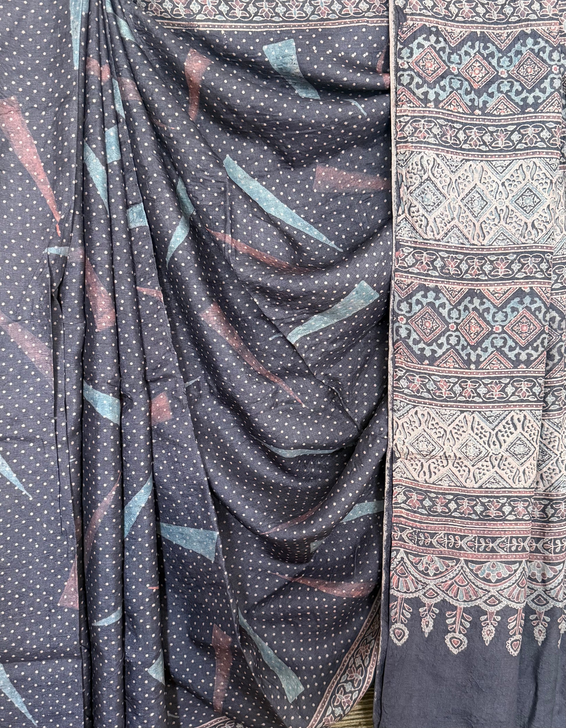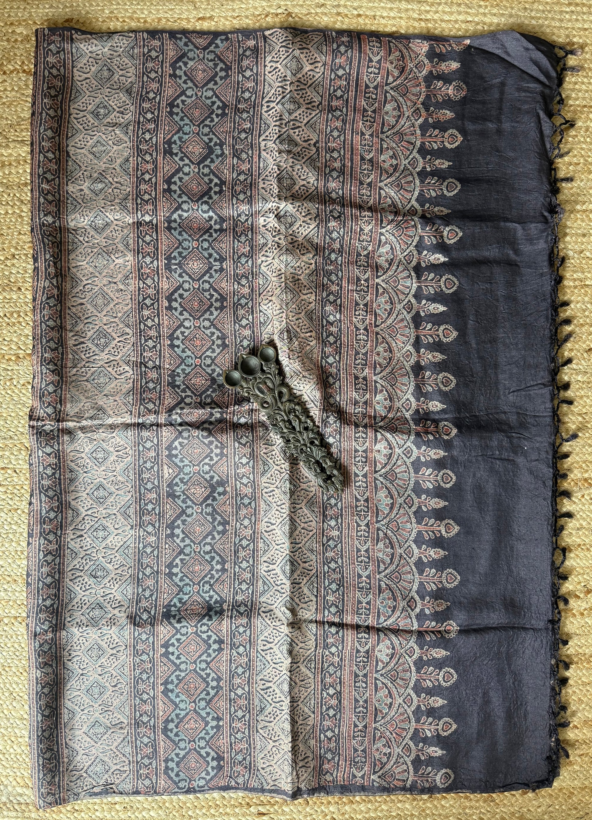CHARCOAL BLACK AJRAKH TUSSAR HANDLOOM SILK SILK BORDER WITH BLOUSE PIECE SIZE: 6.3MTRS