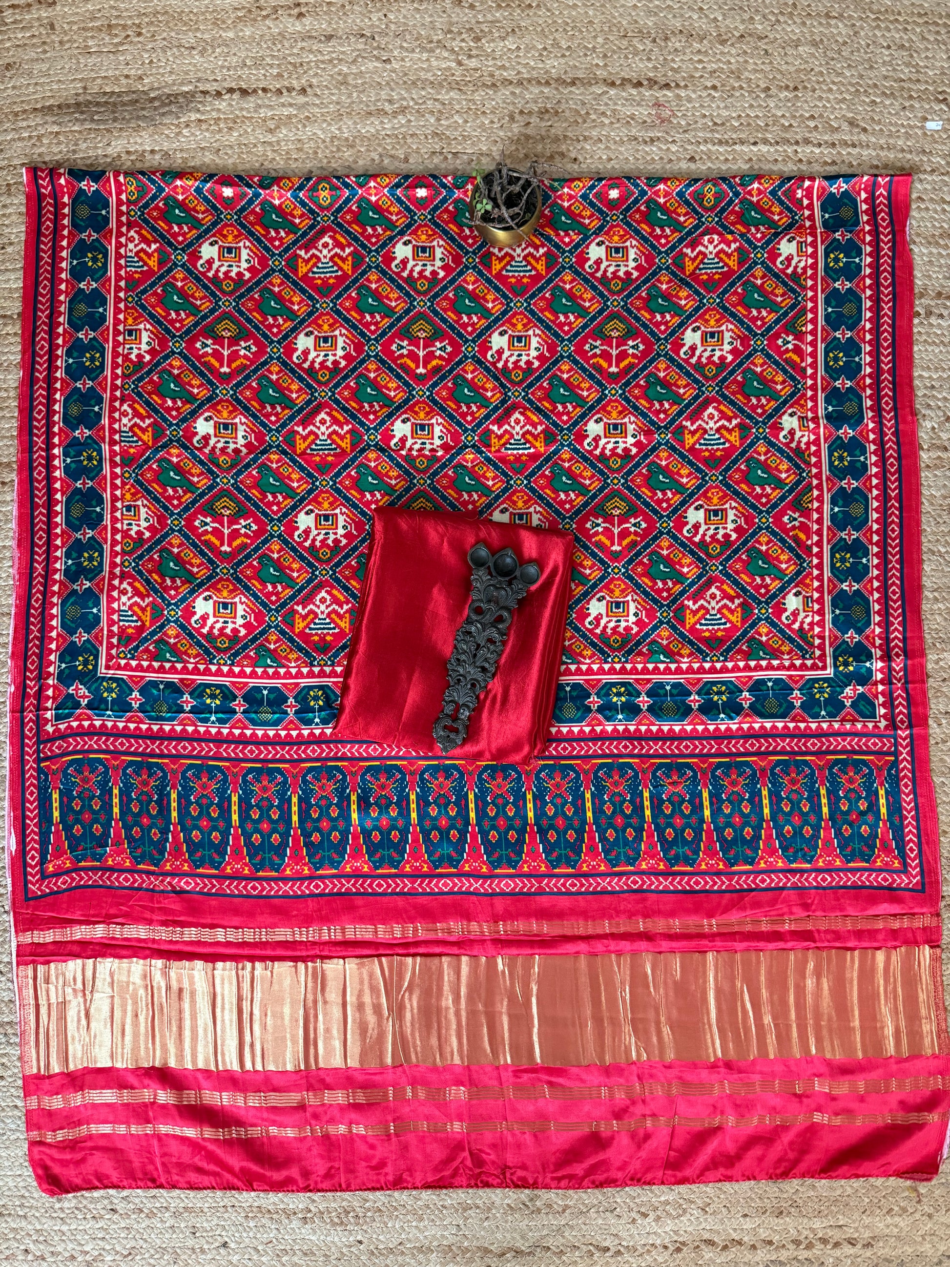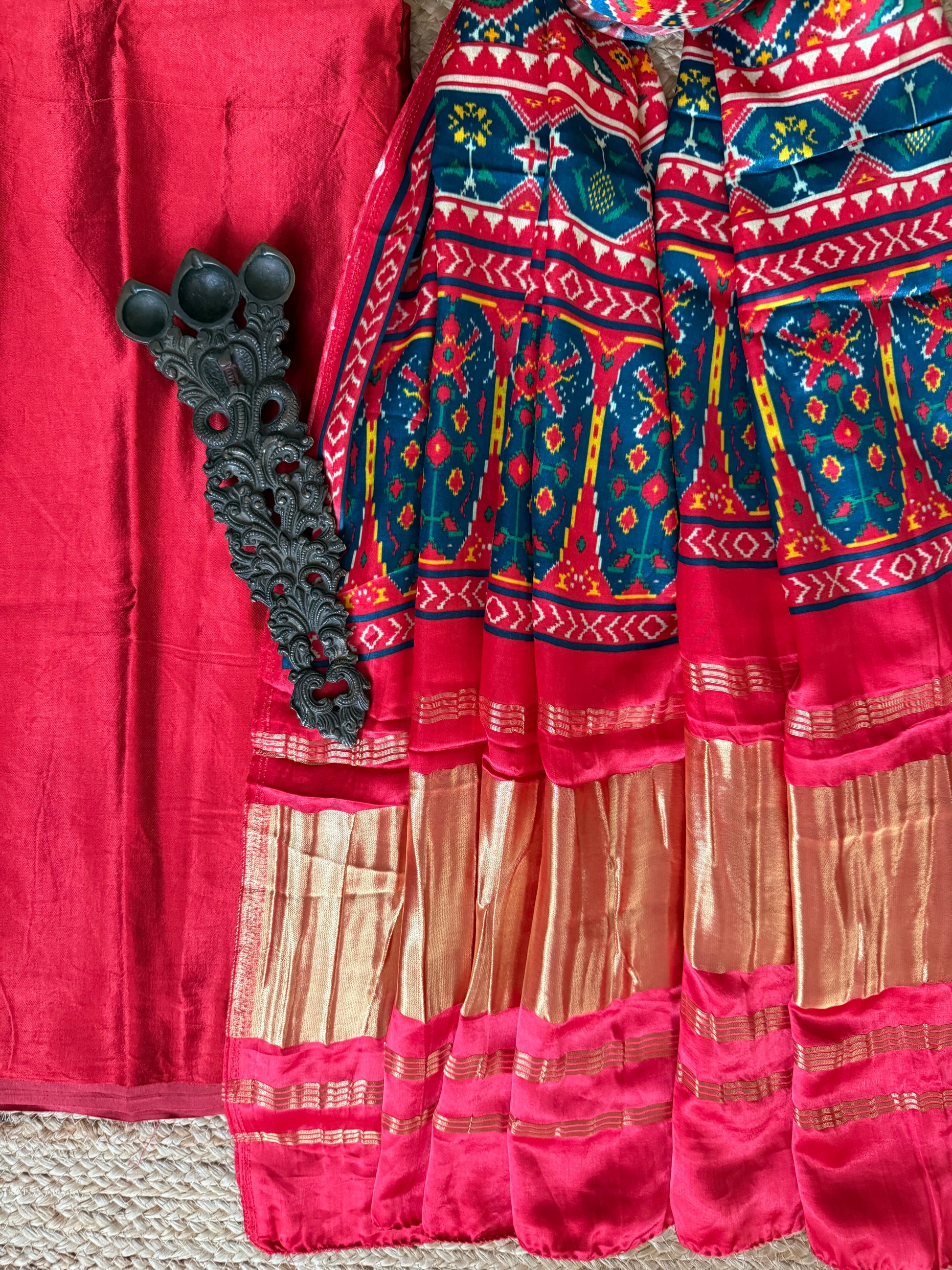 RED MASHRU SILK KURTA WITH PATOLA PICHWAI MODAL SILK DUPATTA FABRIC: 2.5 MTRS METER DUPATTA : 2.5 MTRS * 35'' A SLIGHT DIFFERENCE IN SHADE COULD BE DUE TO THE CAMERA & LIGHTS. EMBRACE THE IMPERFECTION !! HAPPY HANDLOOM DRY CLEAN ONLY |