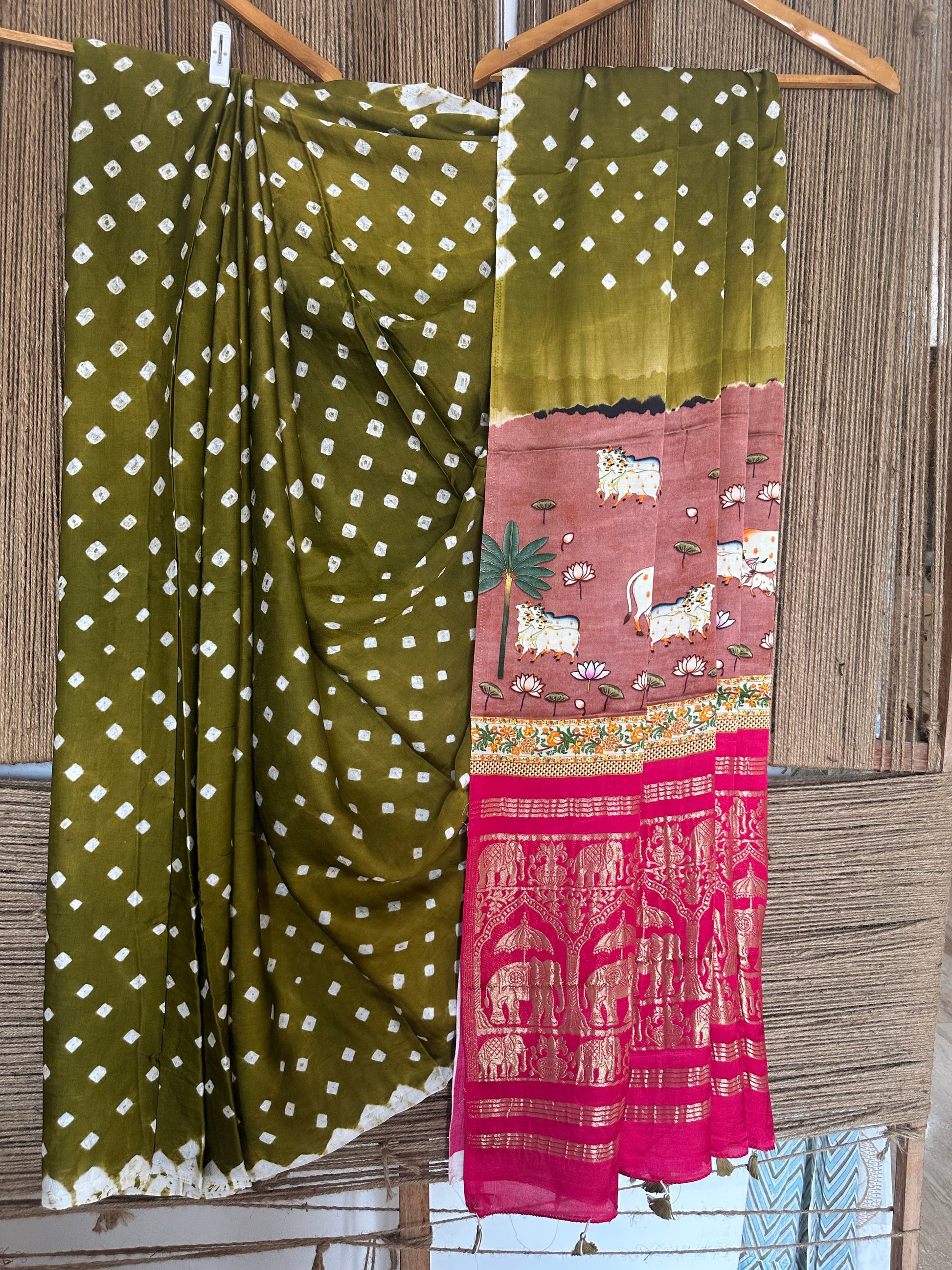 MEHENDI GREEN MODAL SILK BANDHANI WITH PICHWAI PRINT  NAKSHI ZARI WOVEN SARI WITH BLOUSE PIECE