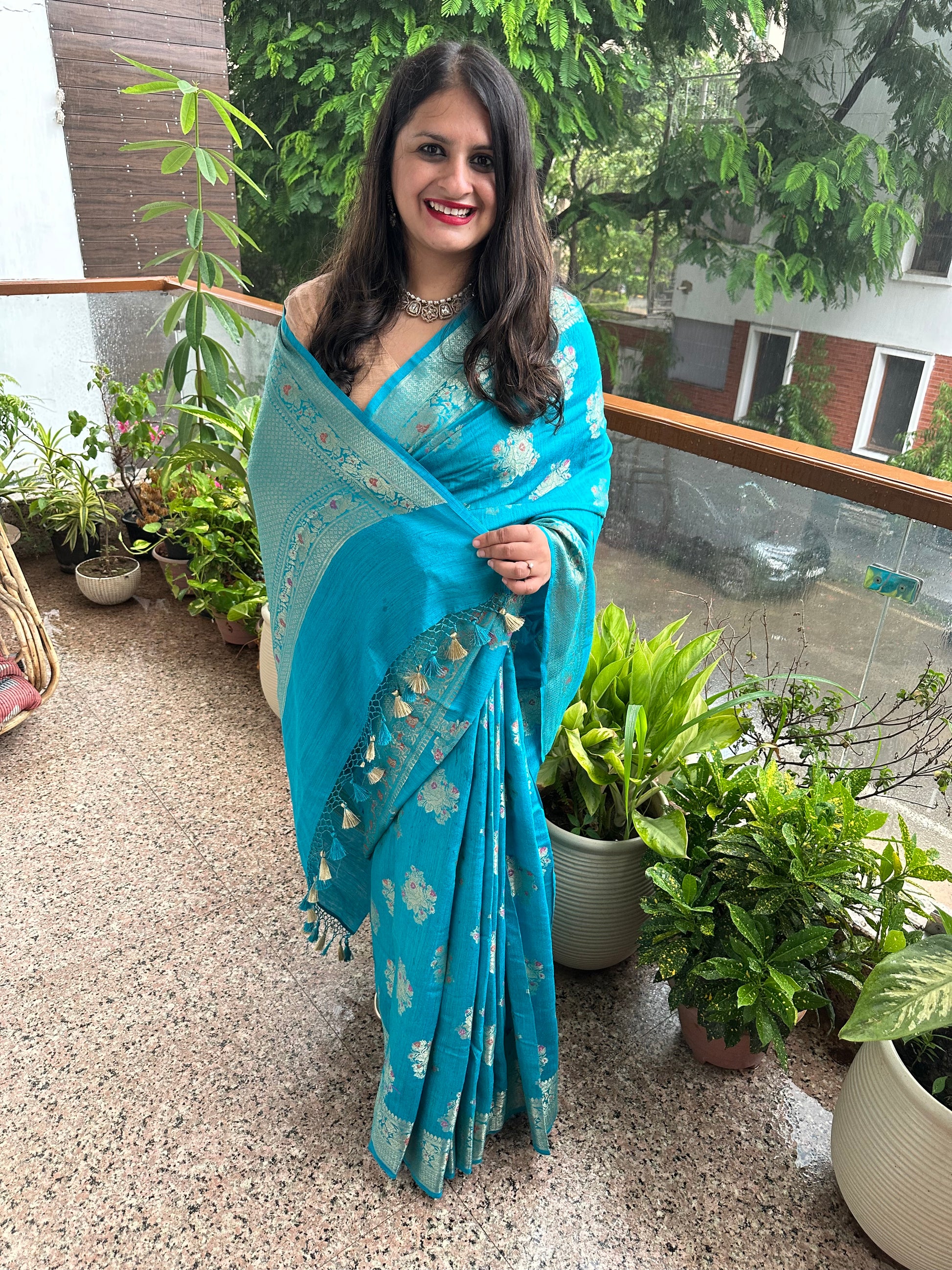 CYAN BLUE BANARASI MUGA SILK CERTIFIED ZARI WOVEN SARI