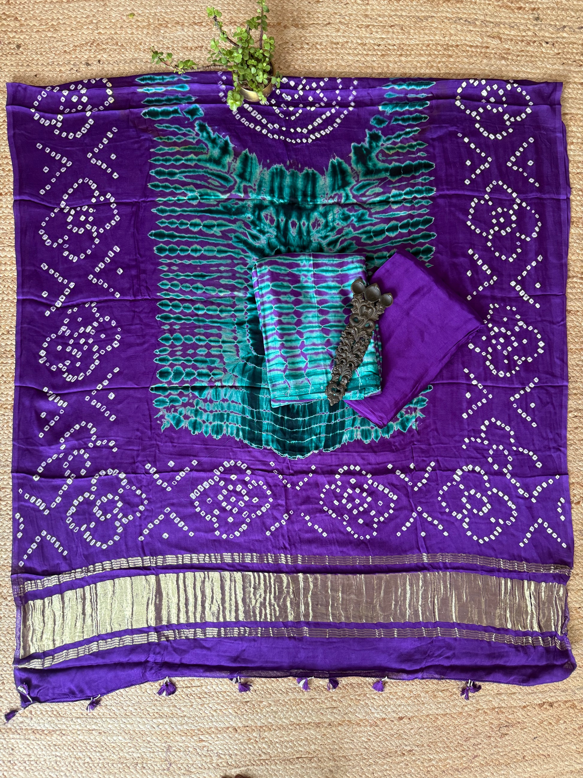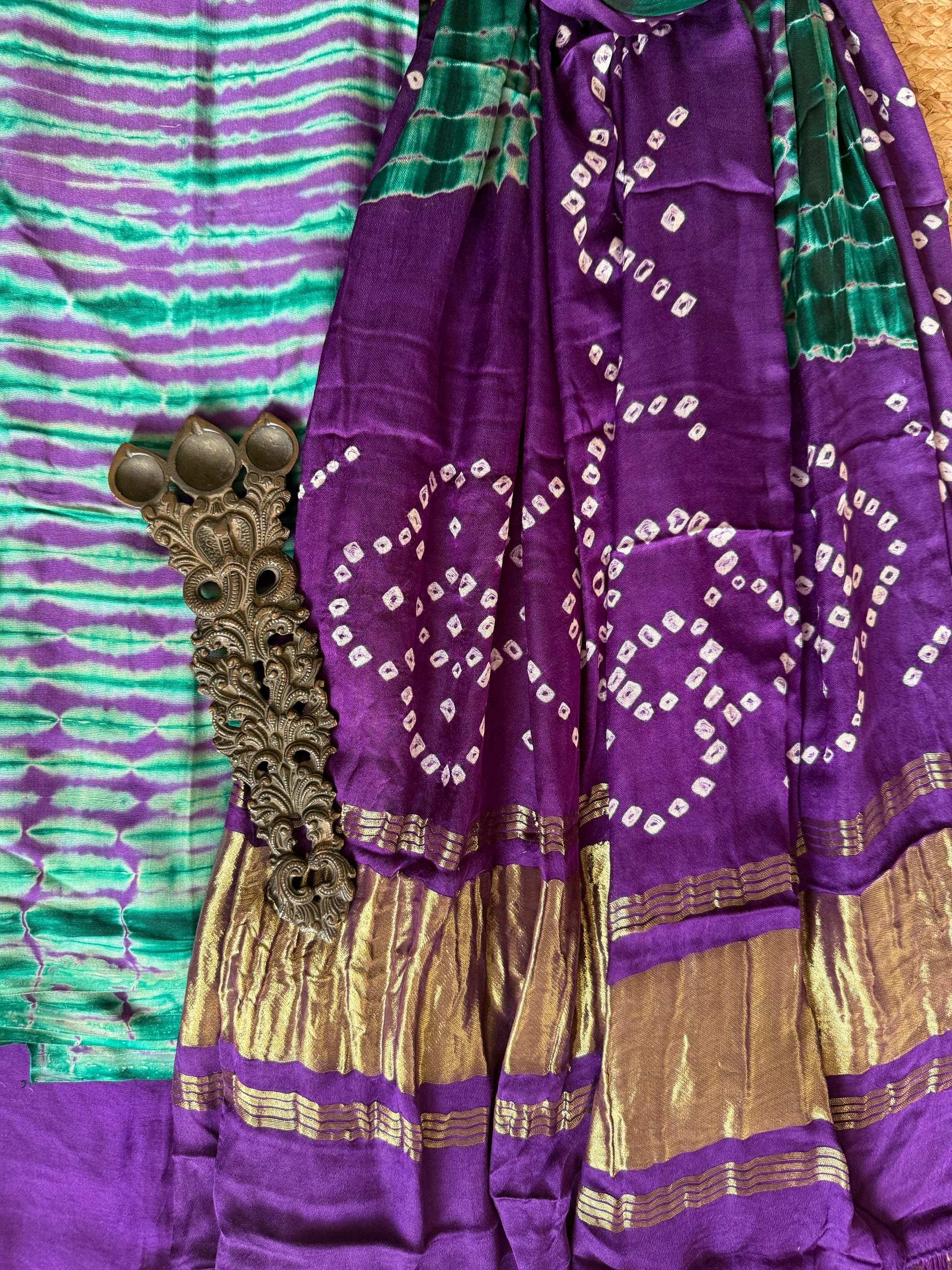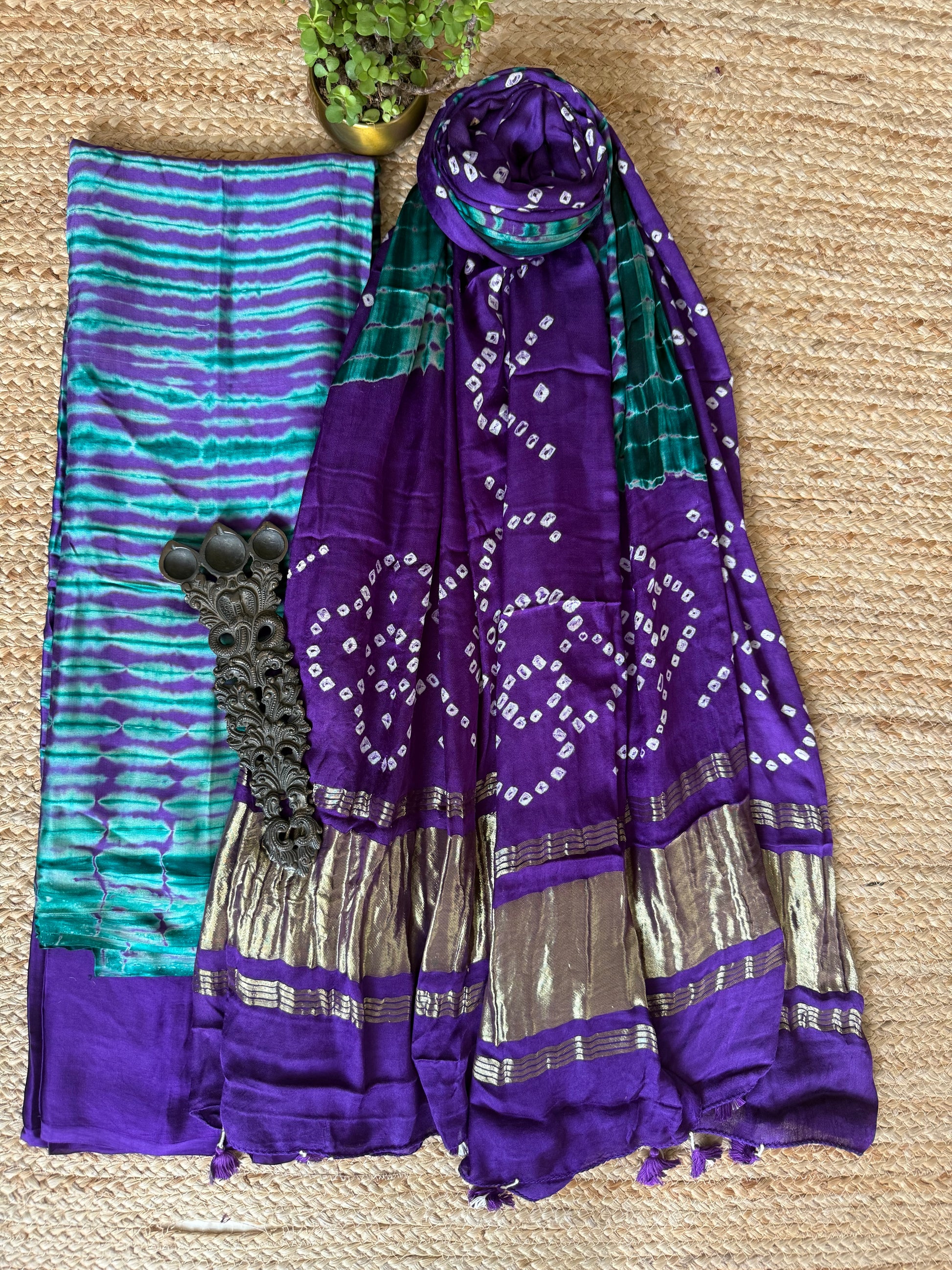 Violet purple & Green Modal Silk Shibori Kurta with Bandhani Shibori handcrafted Modal Silk Dupatta with thread tassels paired with plain modal bottom