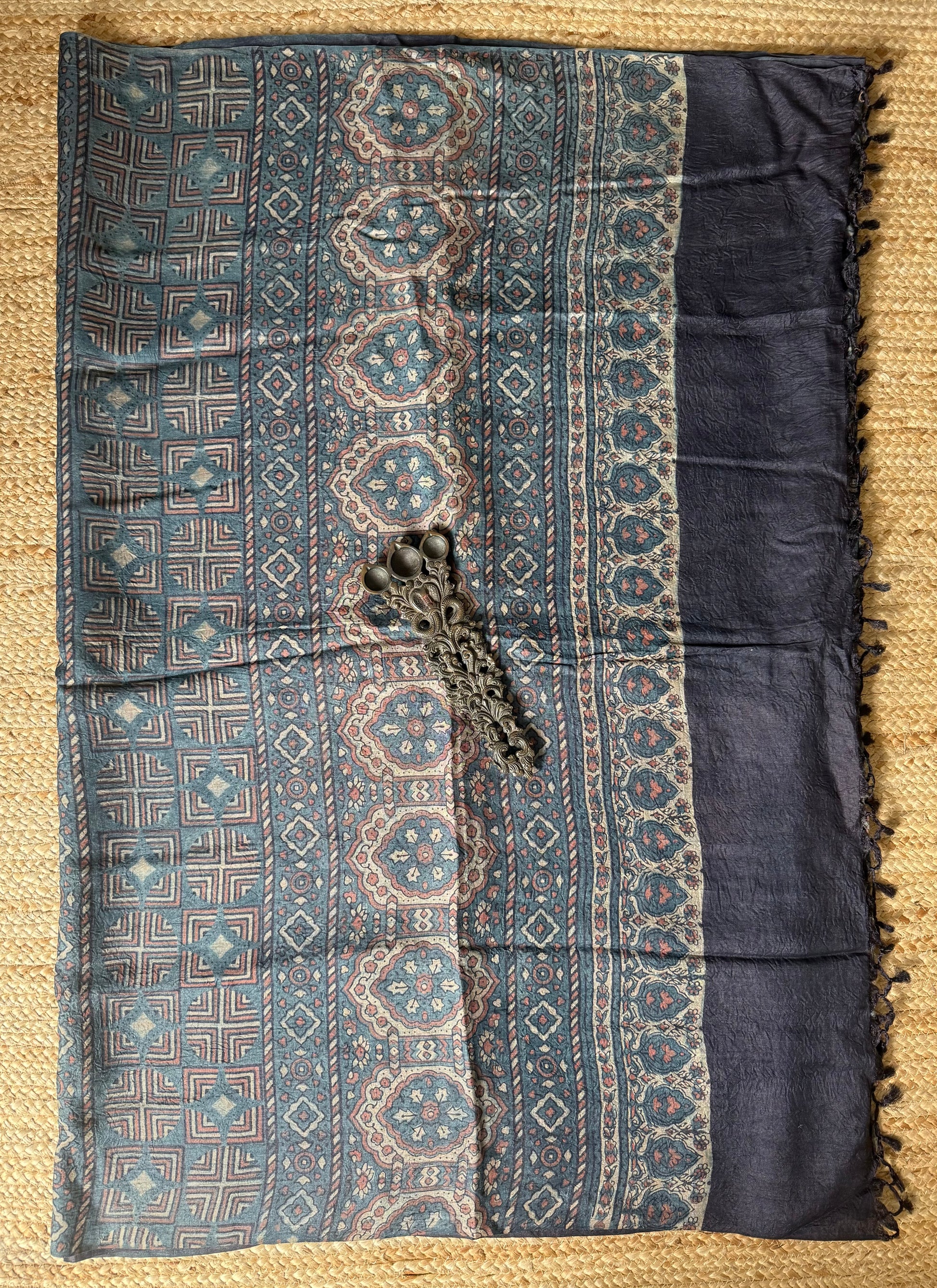 NAVY BLUE AJRAKH TUSSAR HANDLOOM SILK SILK BORDER WITH BLOUSE PIECE SIZE: 6.3MTRS