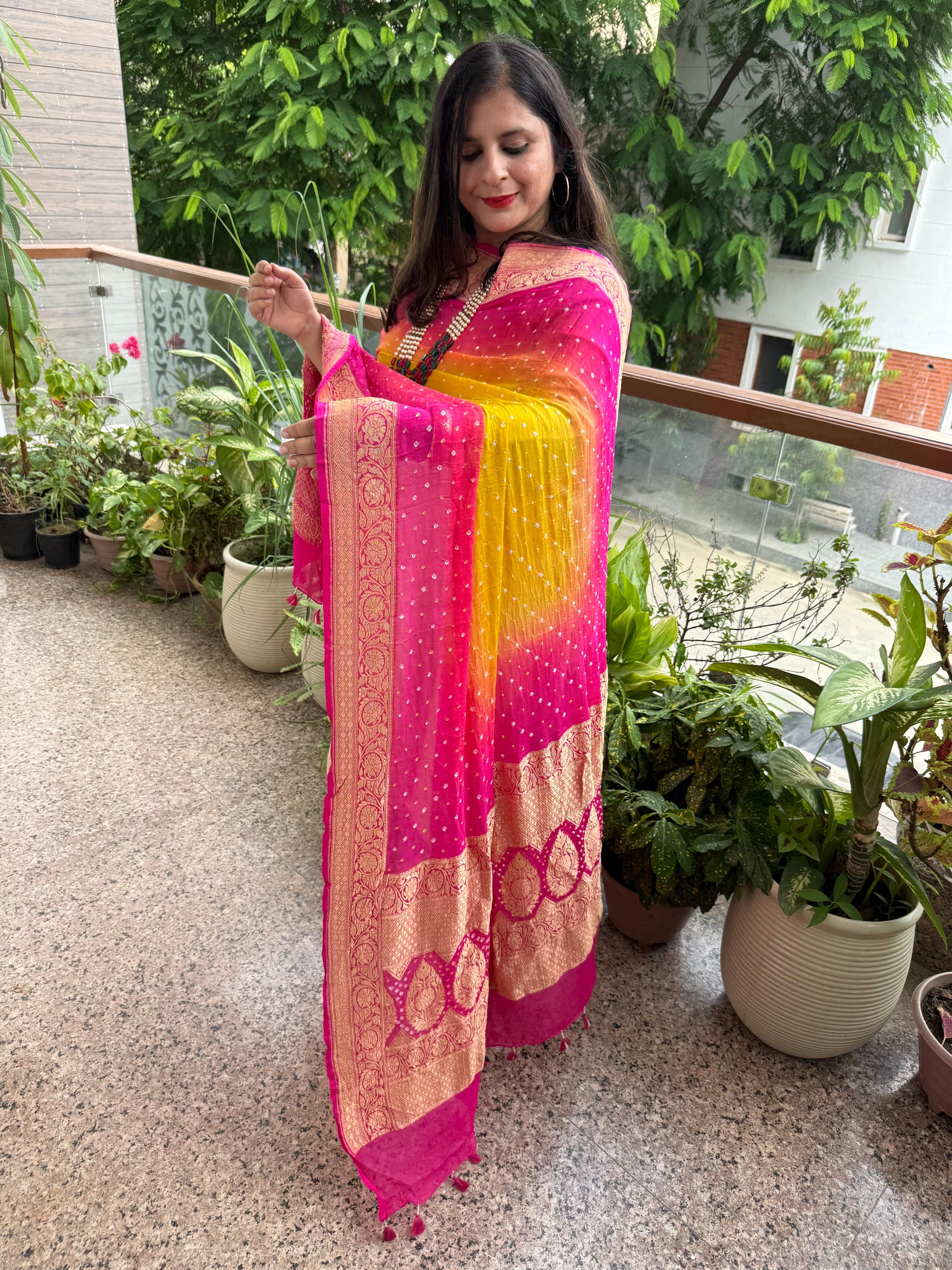 DEEP PINK & LEMON YELLOW OMBIE HANDWOVEN NEEM ZARI HANDWOVEN BAREEK BANDHANI IN KHADDI PREMIUM GEORGETTE