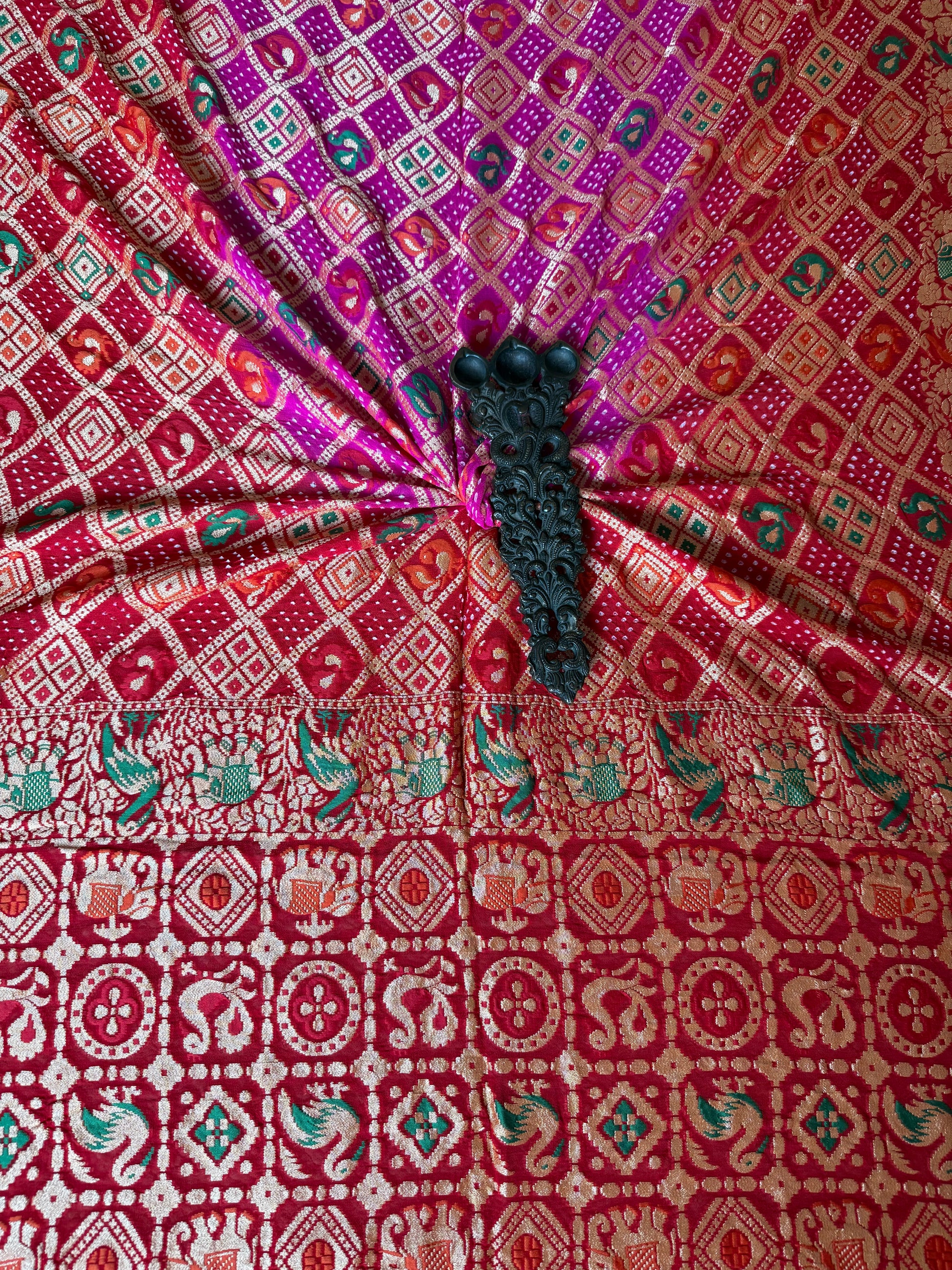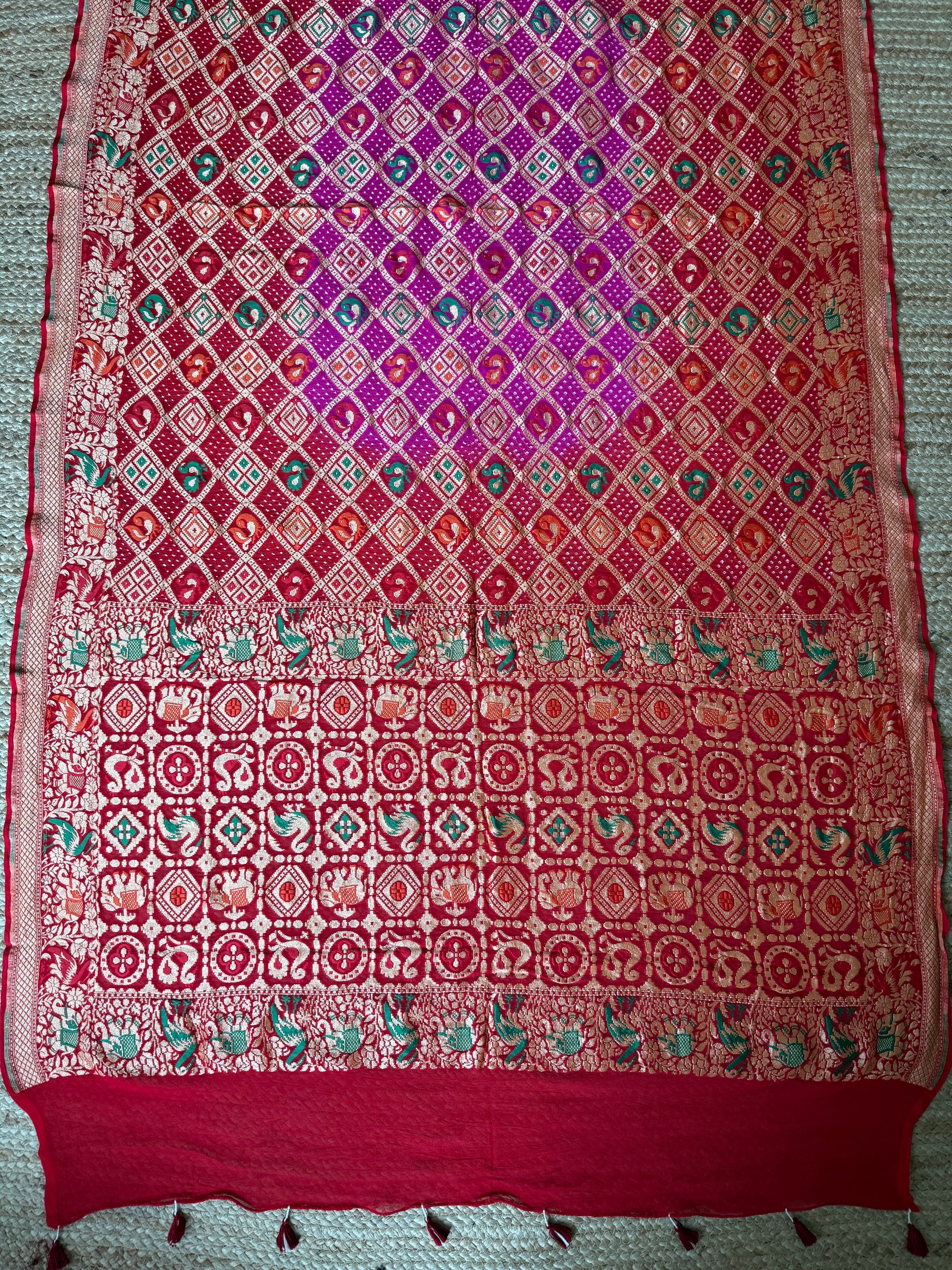 Red & pink ombré shade Handwoven Bareek Bandhani in Meenakari Jaal  Premium Georgette dupatta