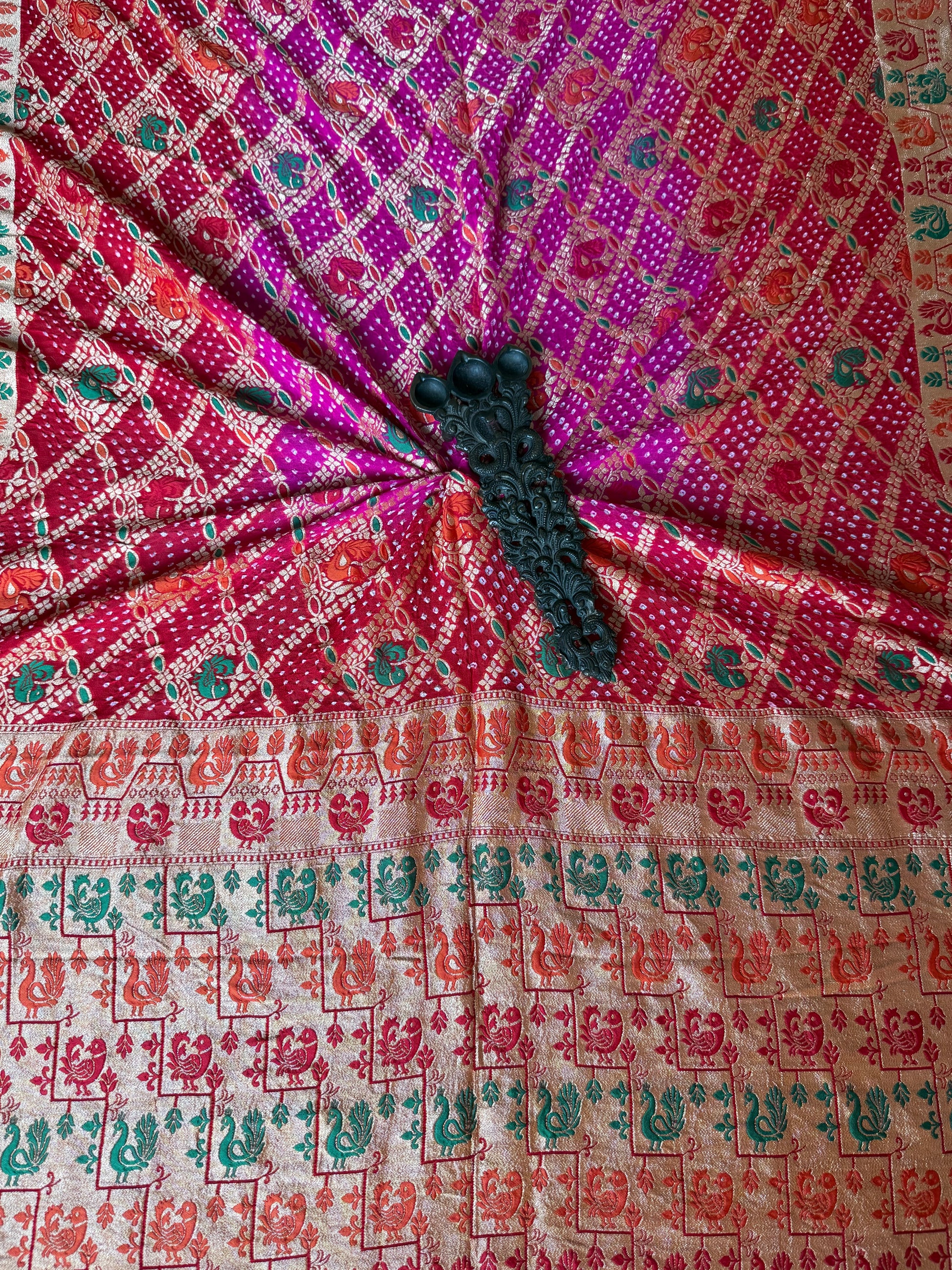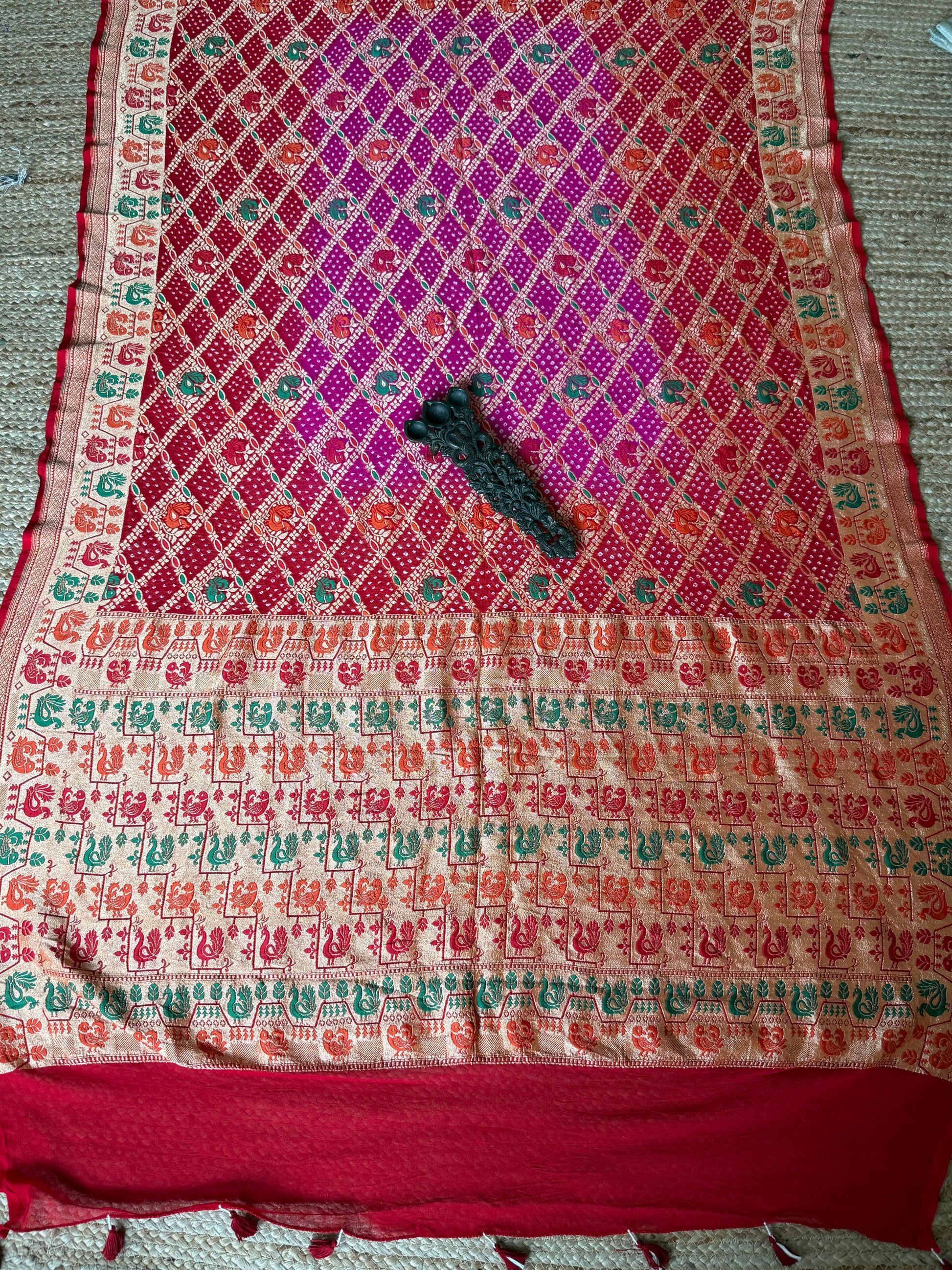 Red & pink ombré shade Handwoven Bareek Bandhani in Meenakari Jaal Premium Georgette dupatta