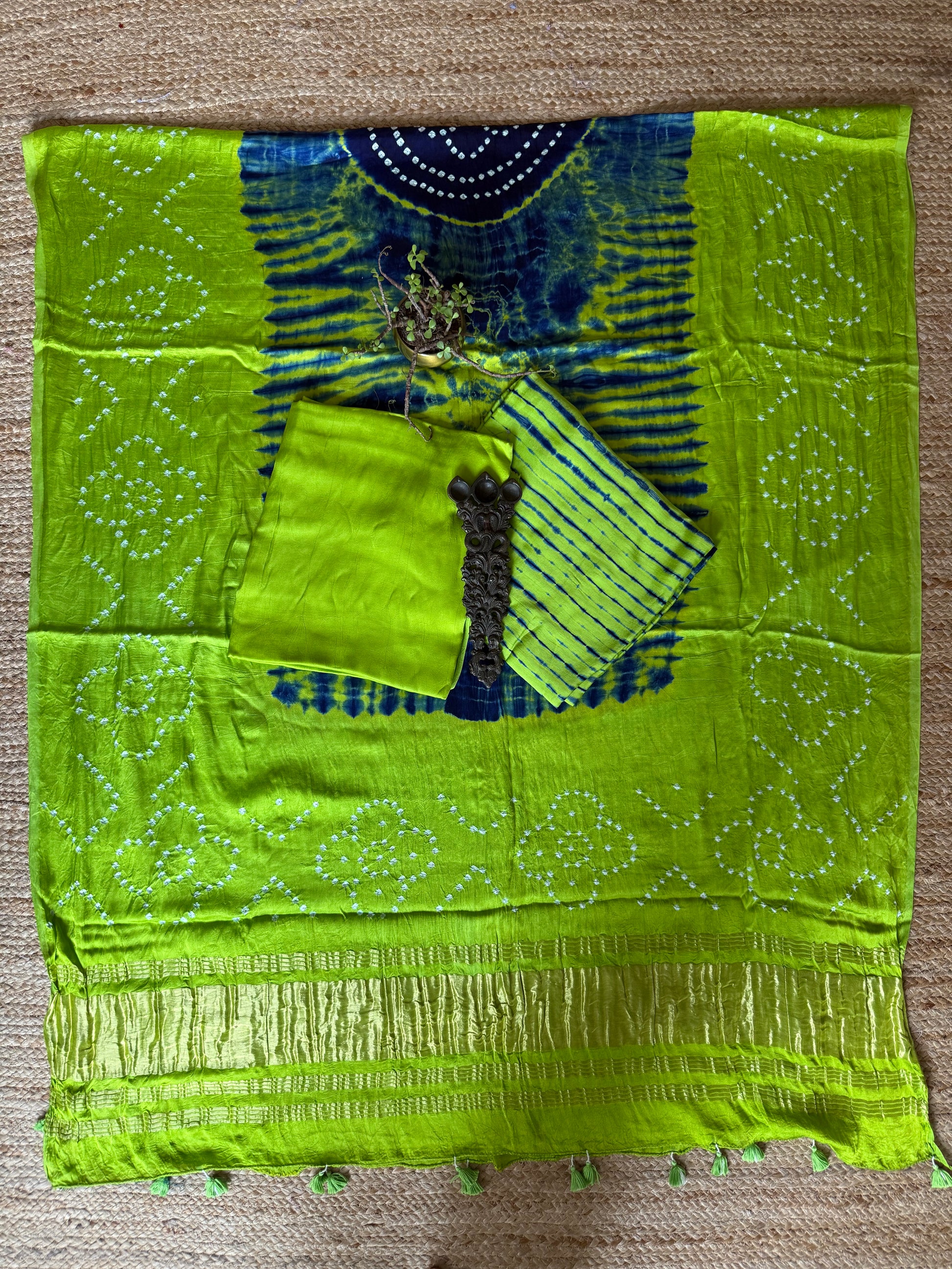 Chartreuse green & Blue Modal  Silk Shibori Kurta with Bandhani Shibori  handcrafted Modal Silk Dupatta with thread tassels paired with plain modal bottom
