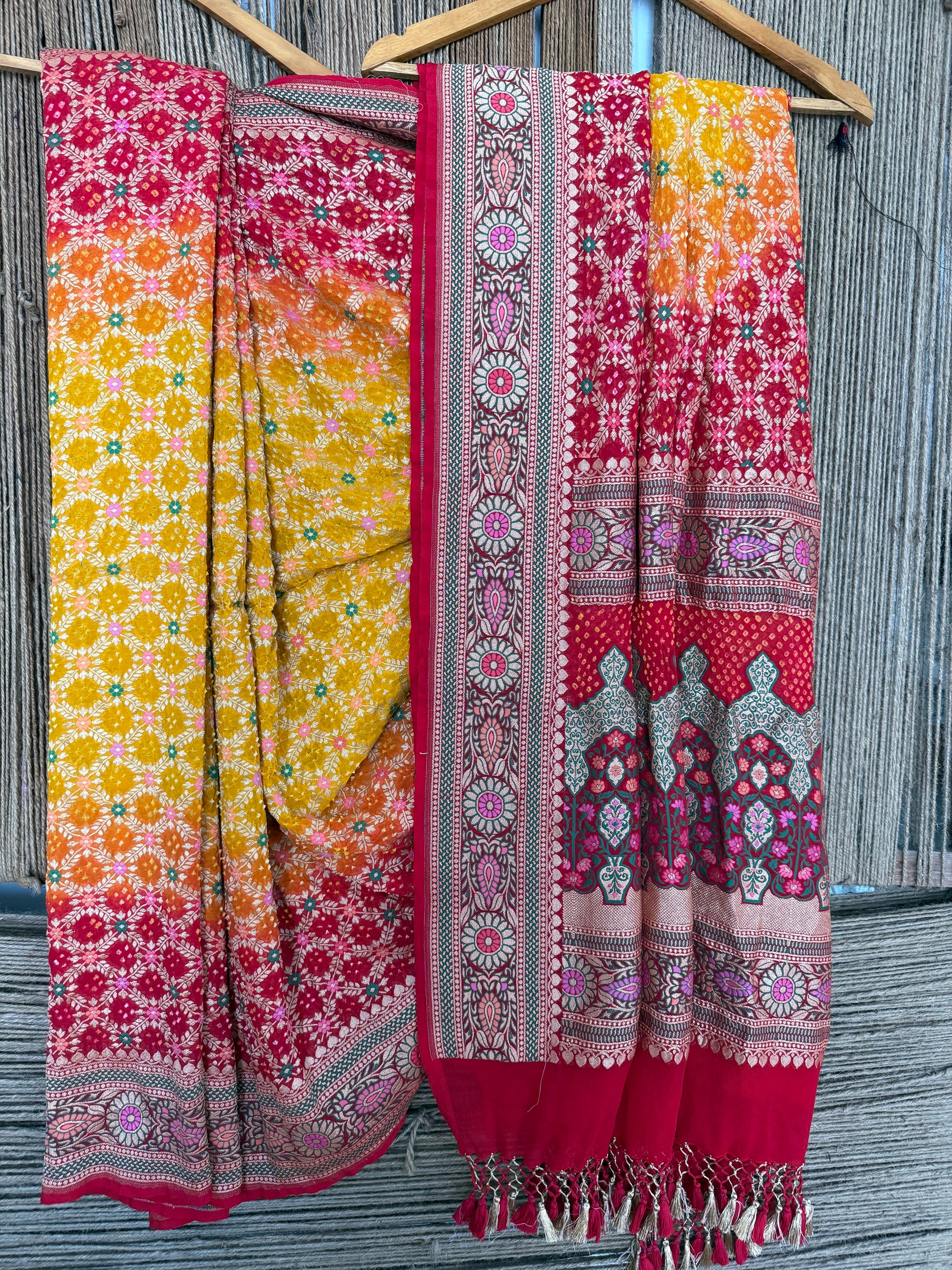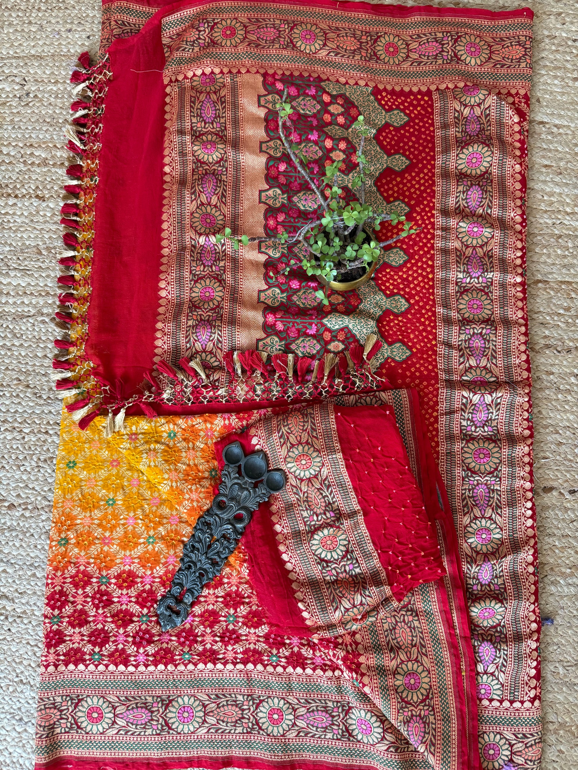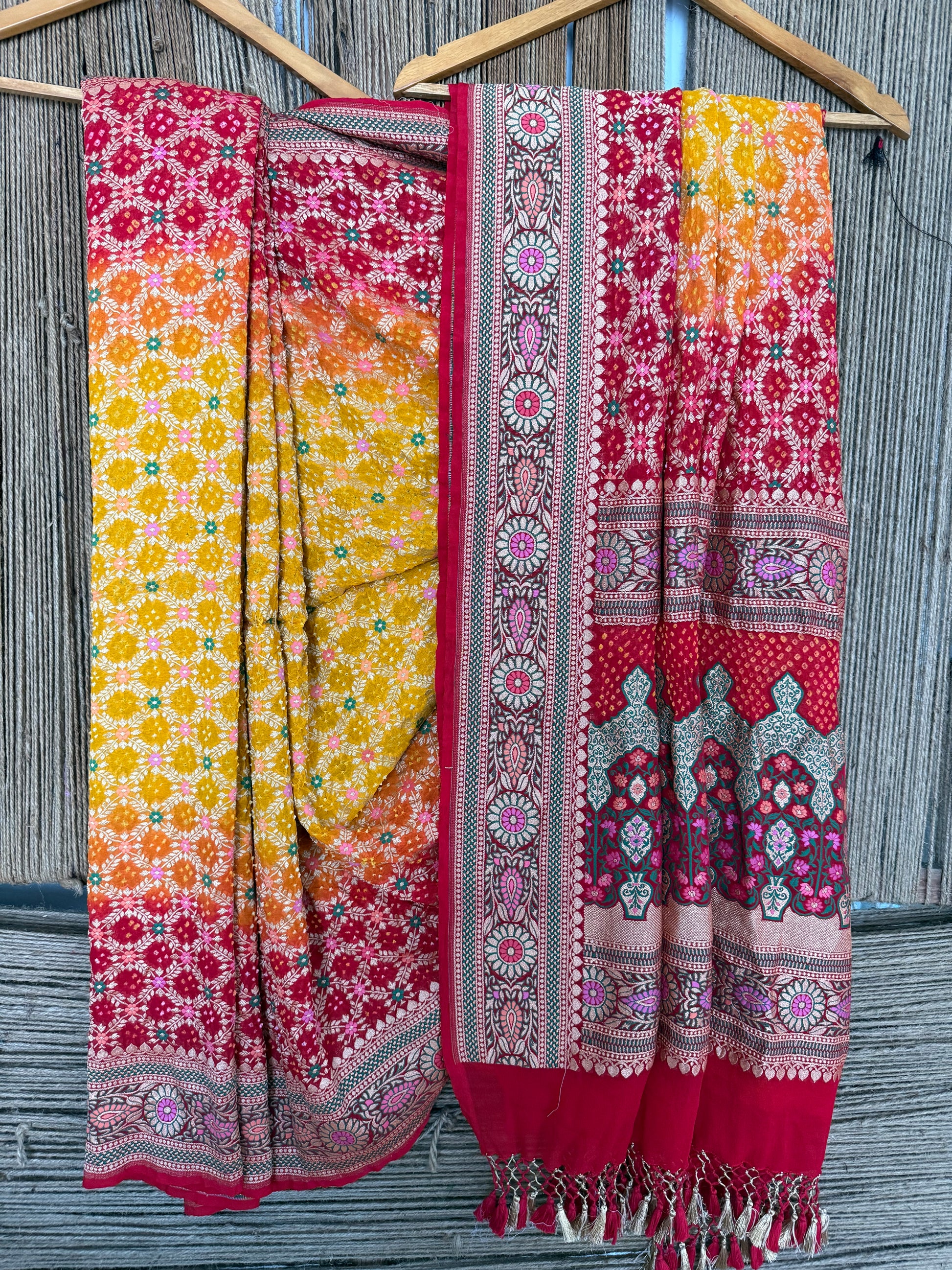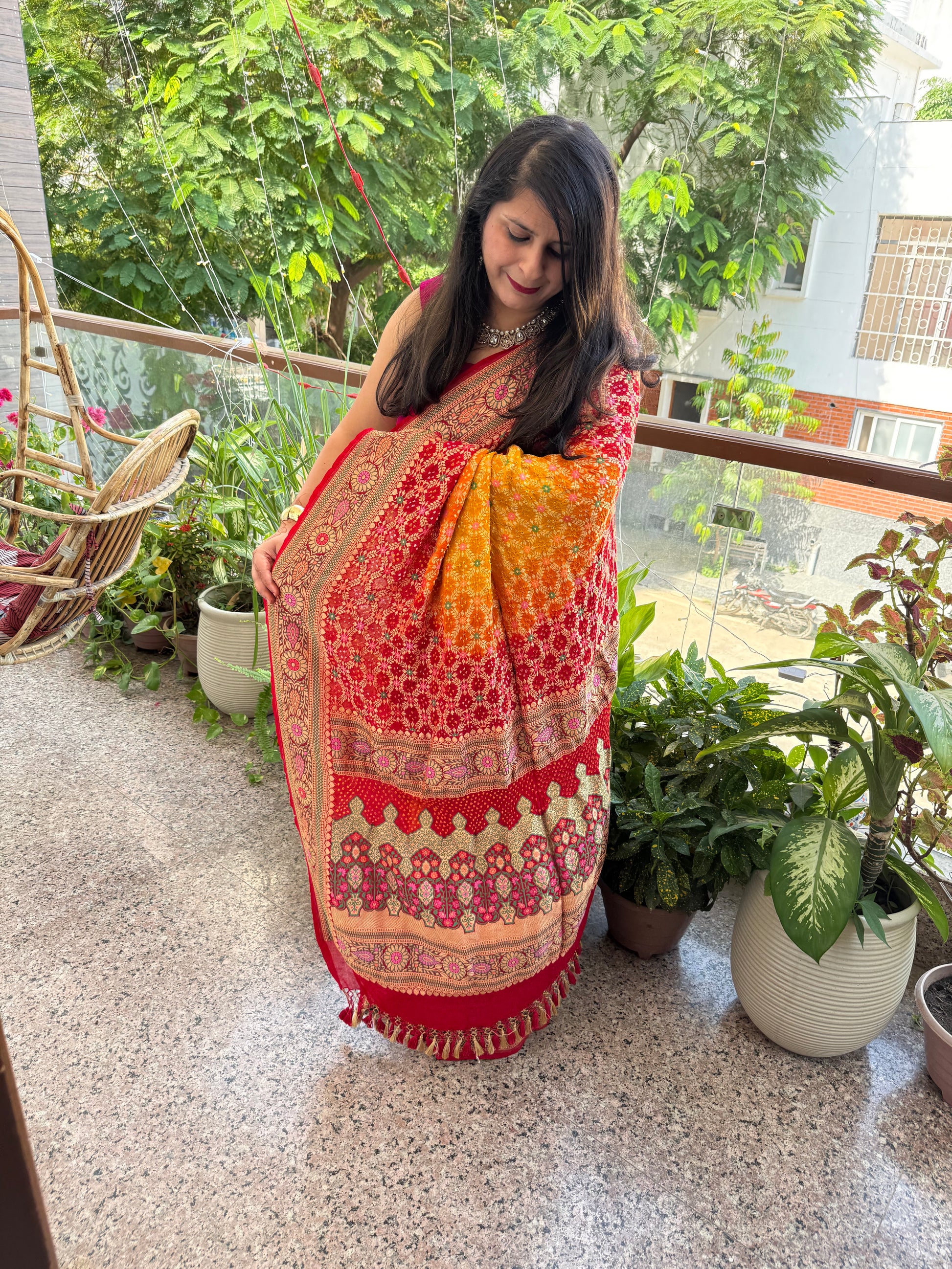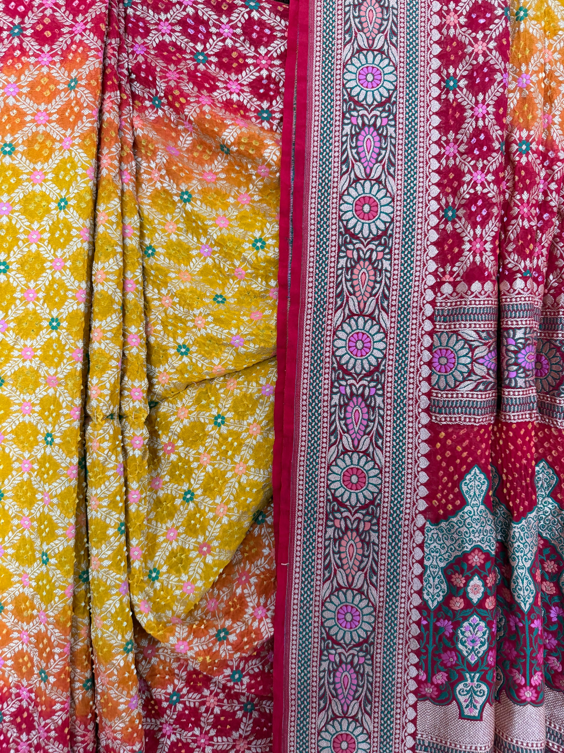 Red & Yellow dual shade Handwoven Rai Bareek Bandhani Saree Meenakari Jaal with Khaddi Georgette Mks-3