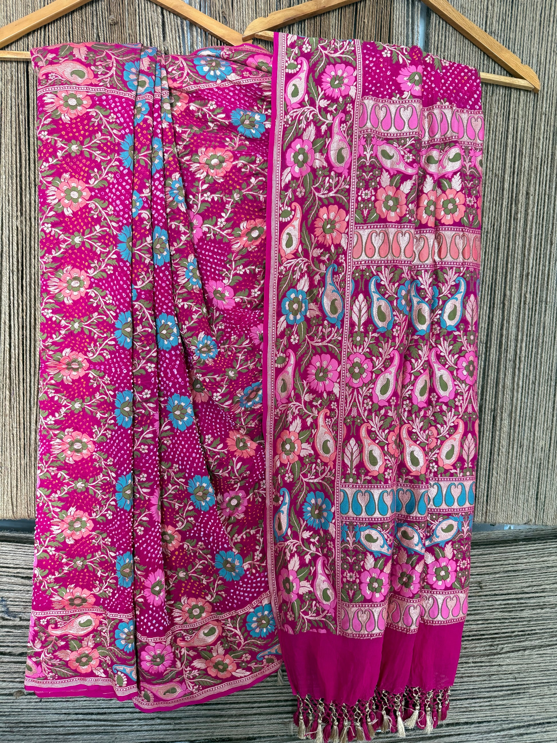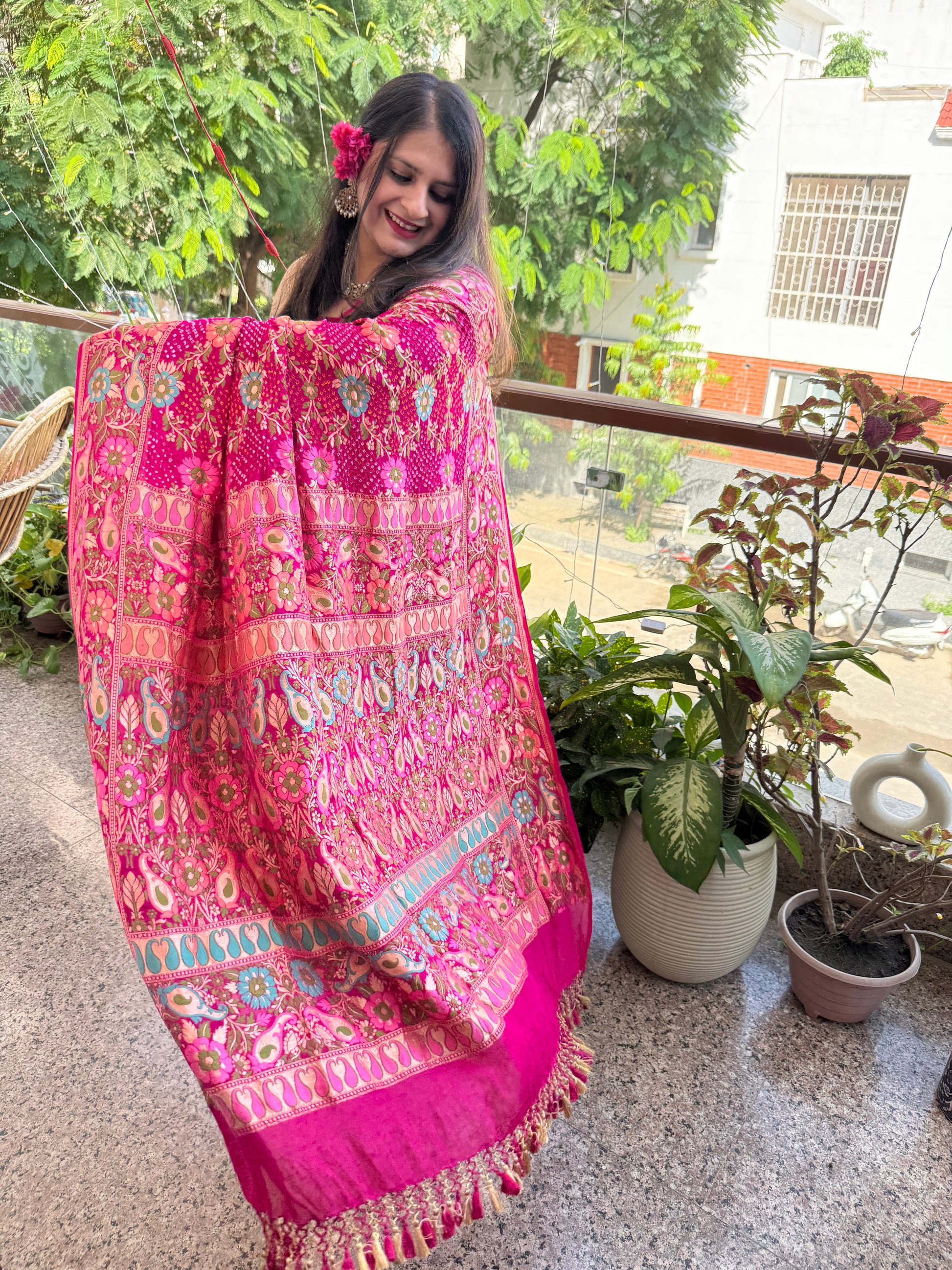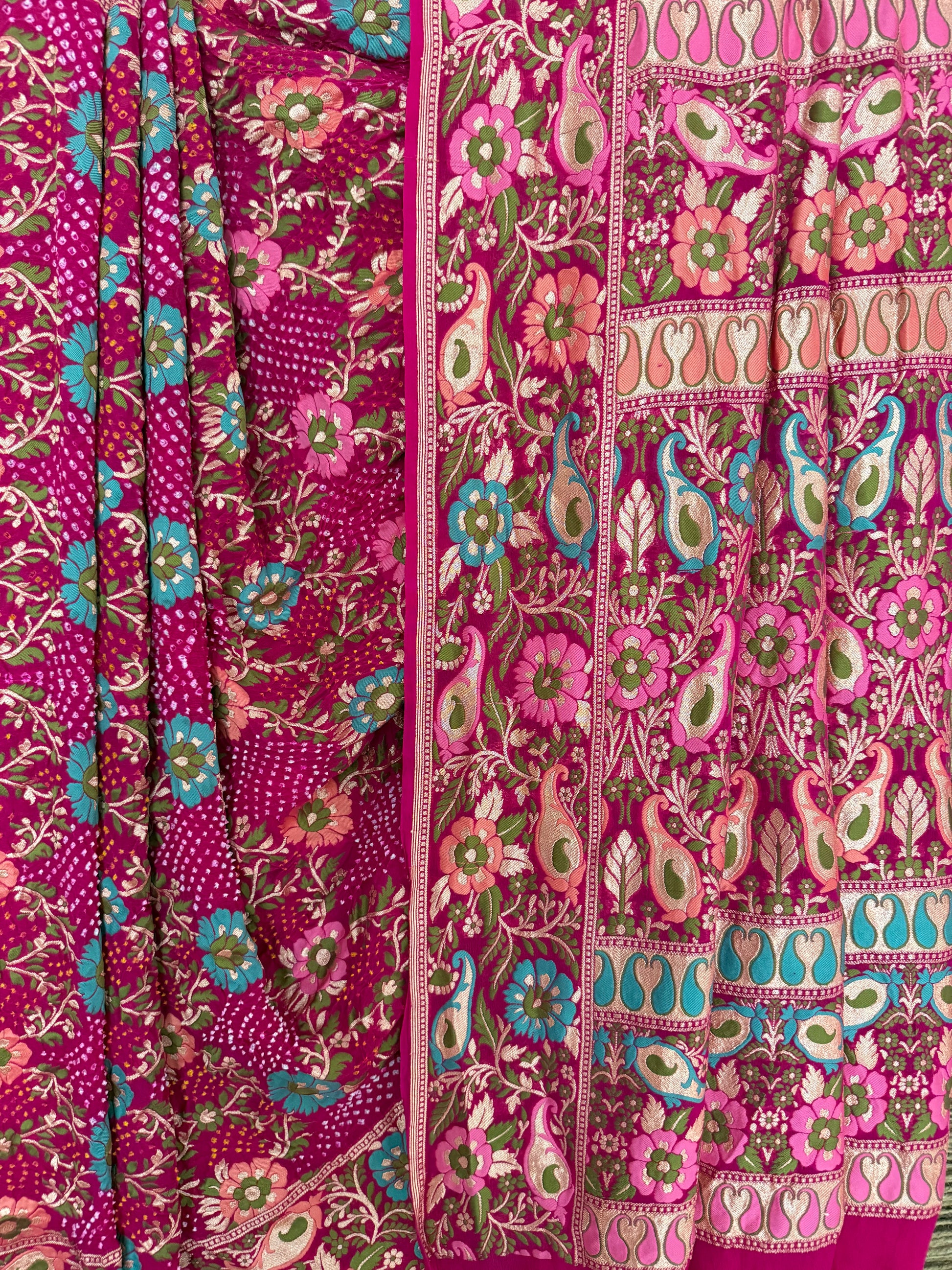 PINK Handwoven Rai Bareek Bandhani Saree Meenakari Jaal with Khaddi Georgette Mks-2
