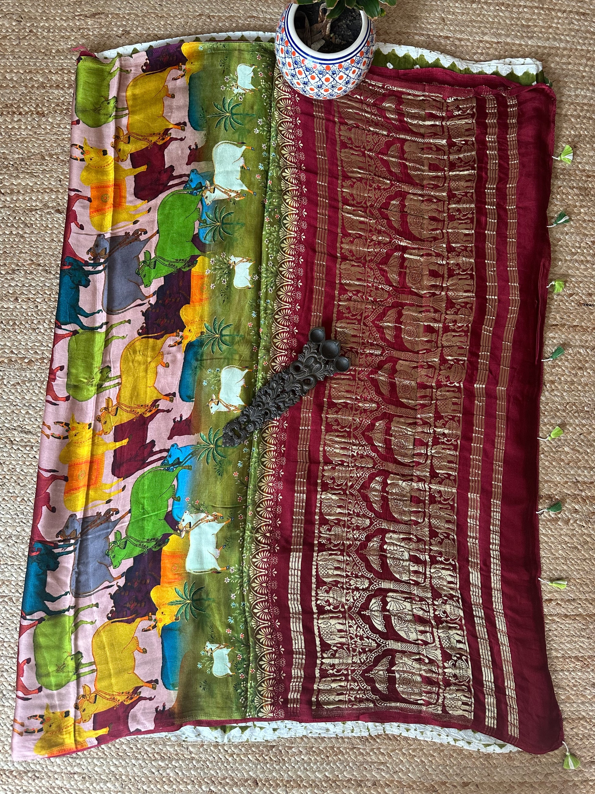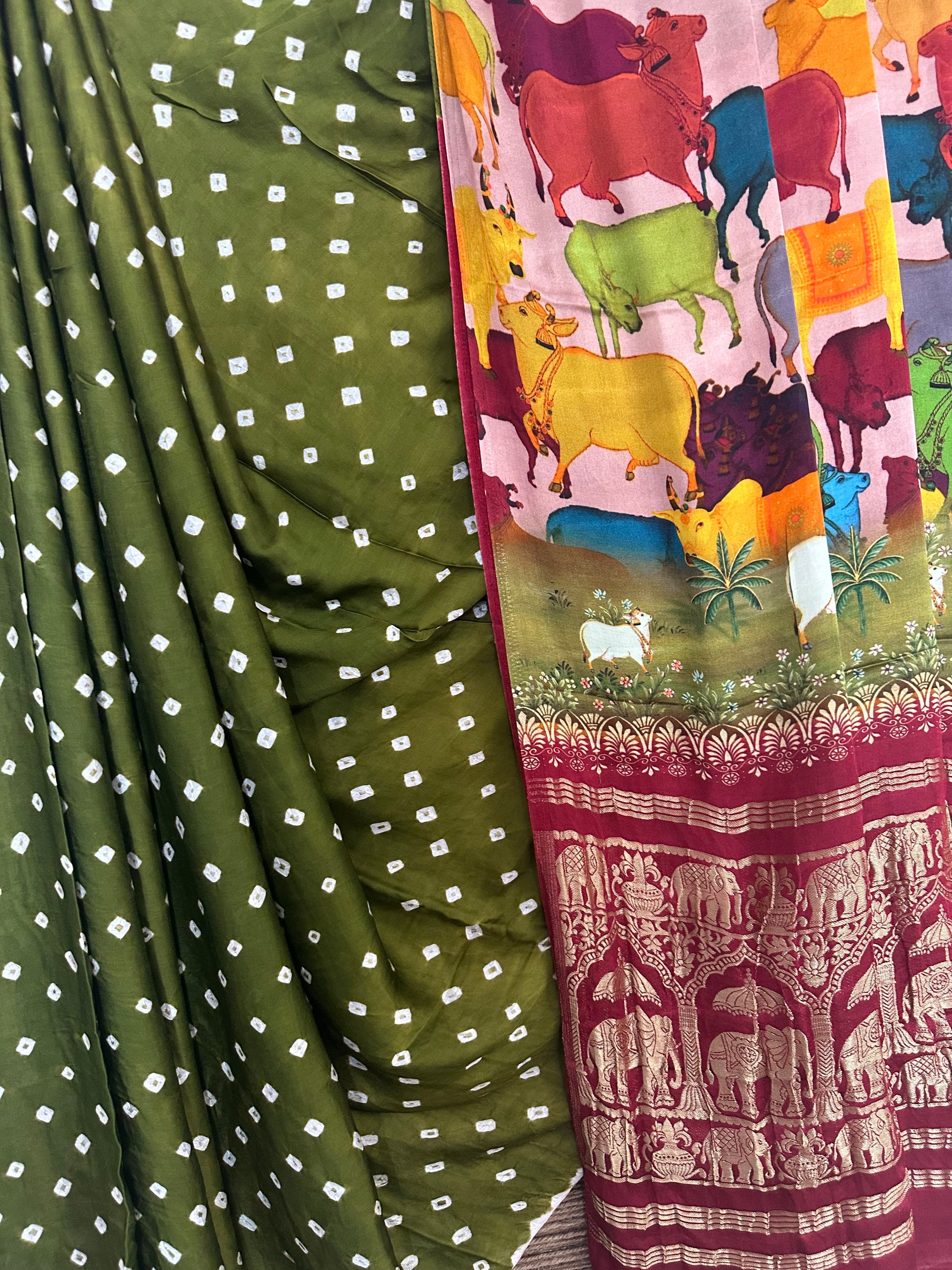 MEHENDI GREEN MODAL SILK BANDHANI WITH PICHWAI PRINT  NAKSHI ZARI WOVEN SARI WITH BLOUSE PIECE
