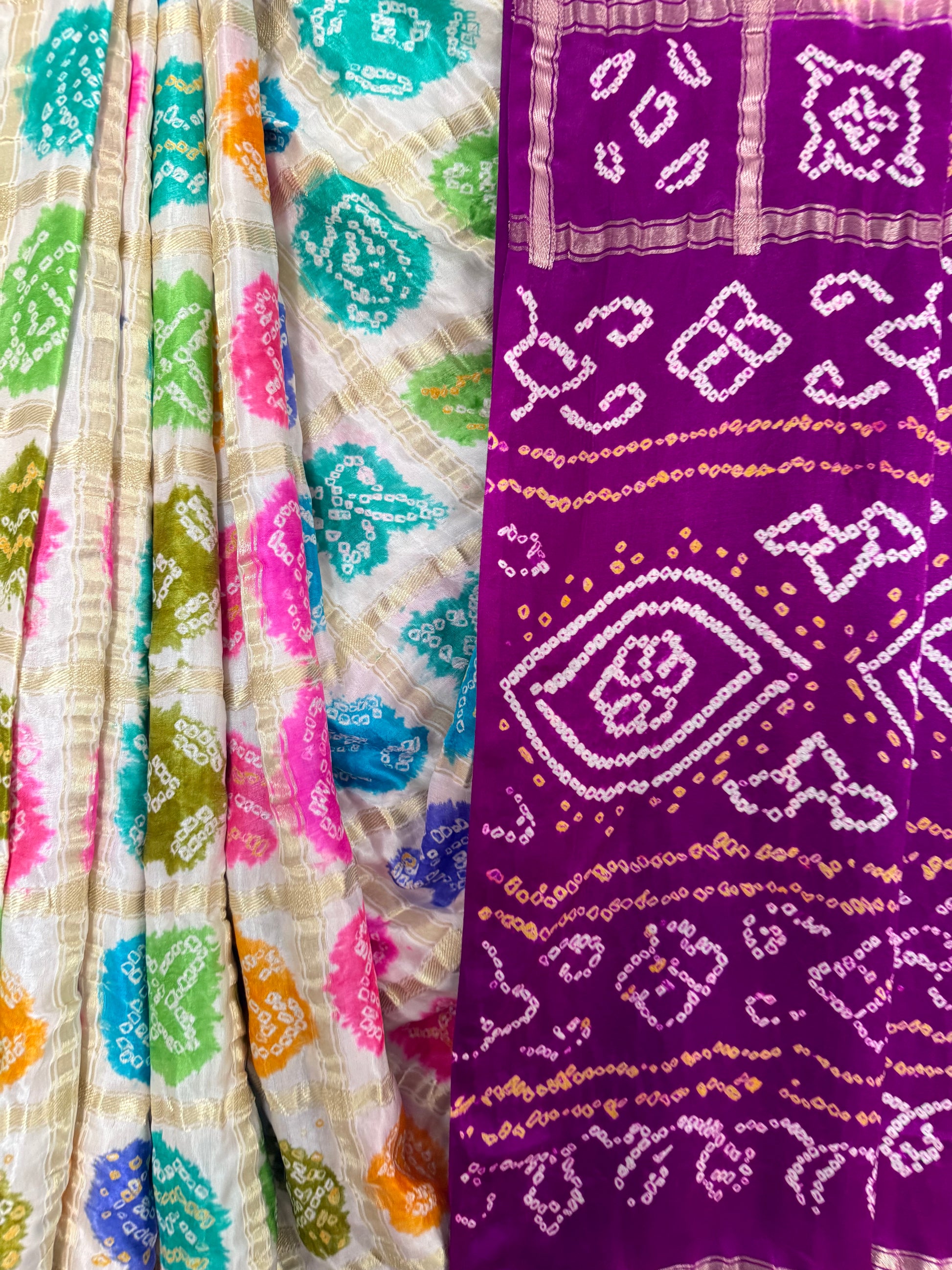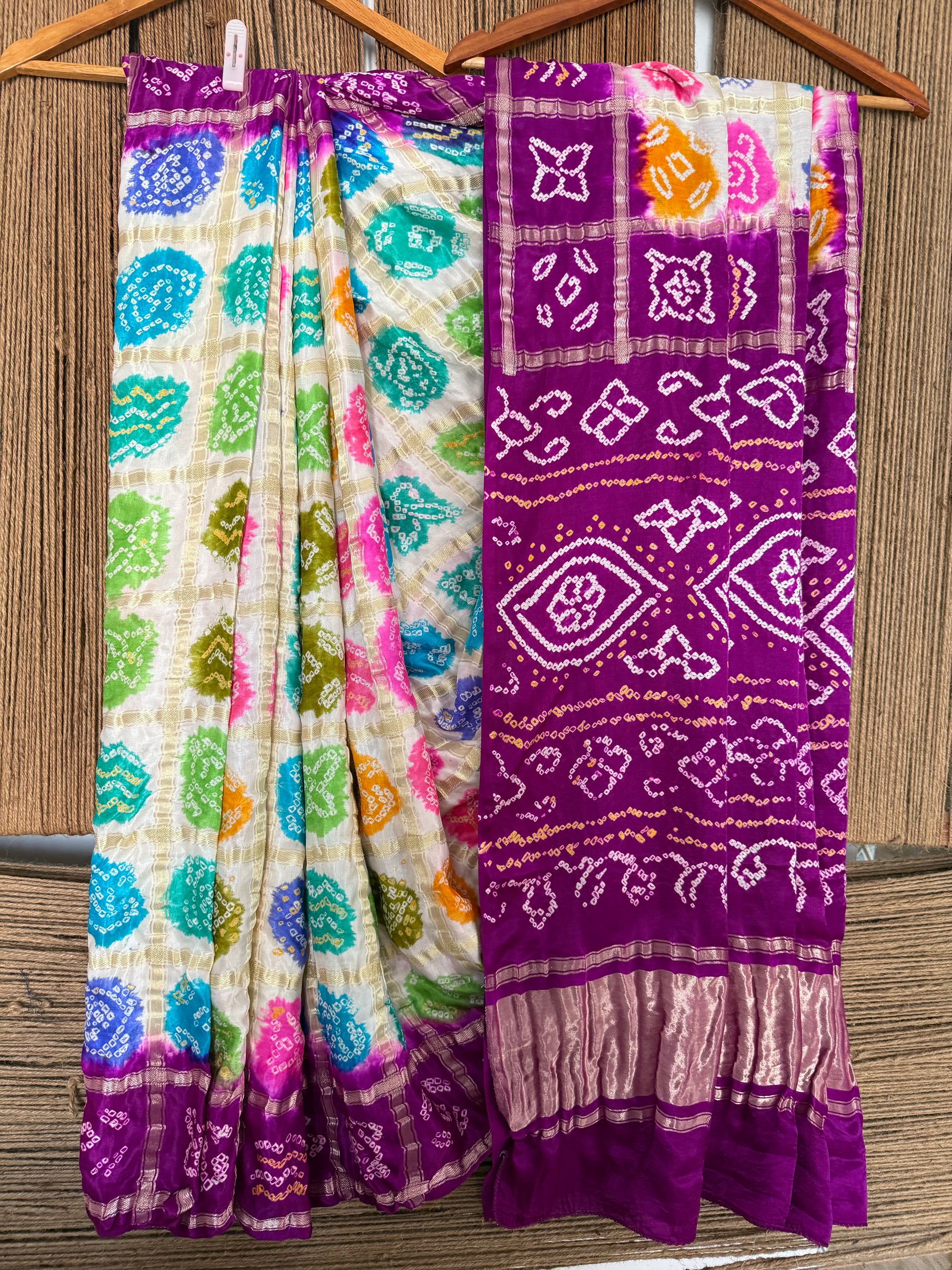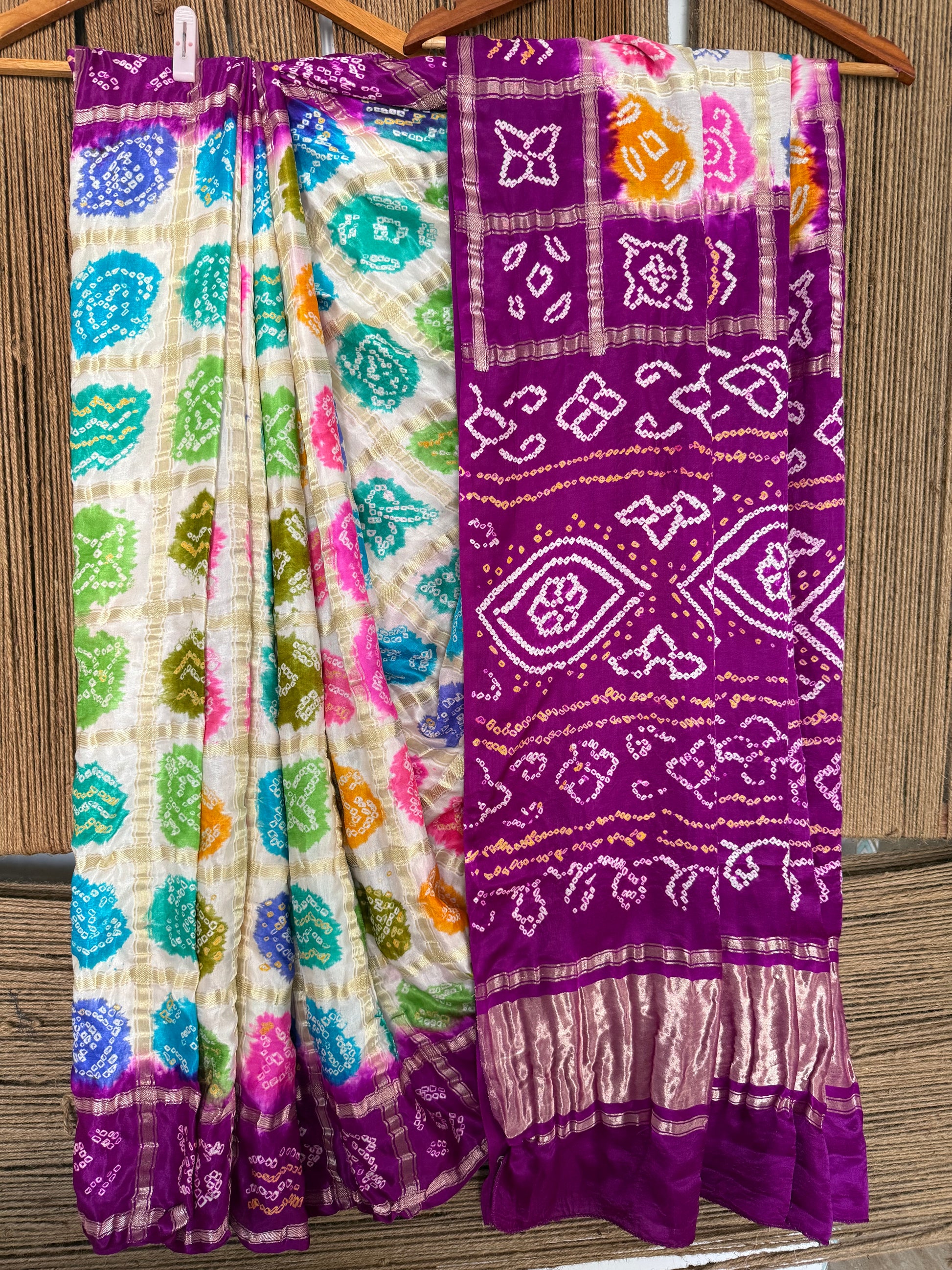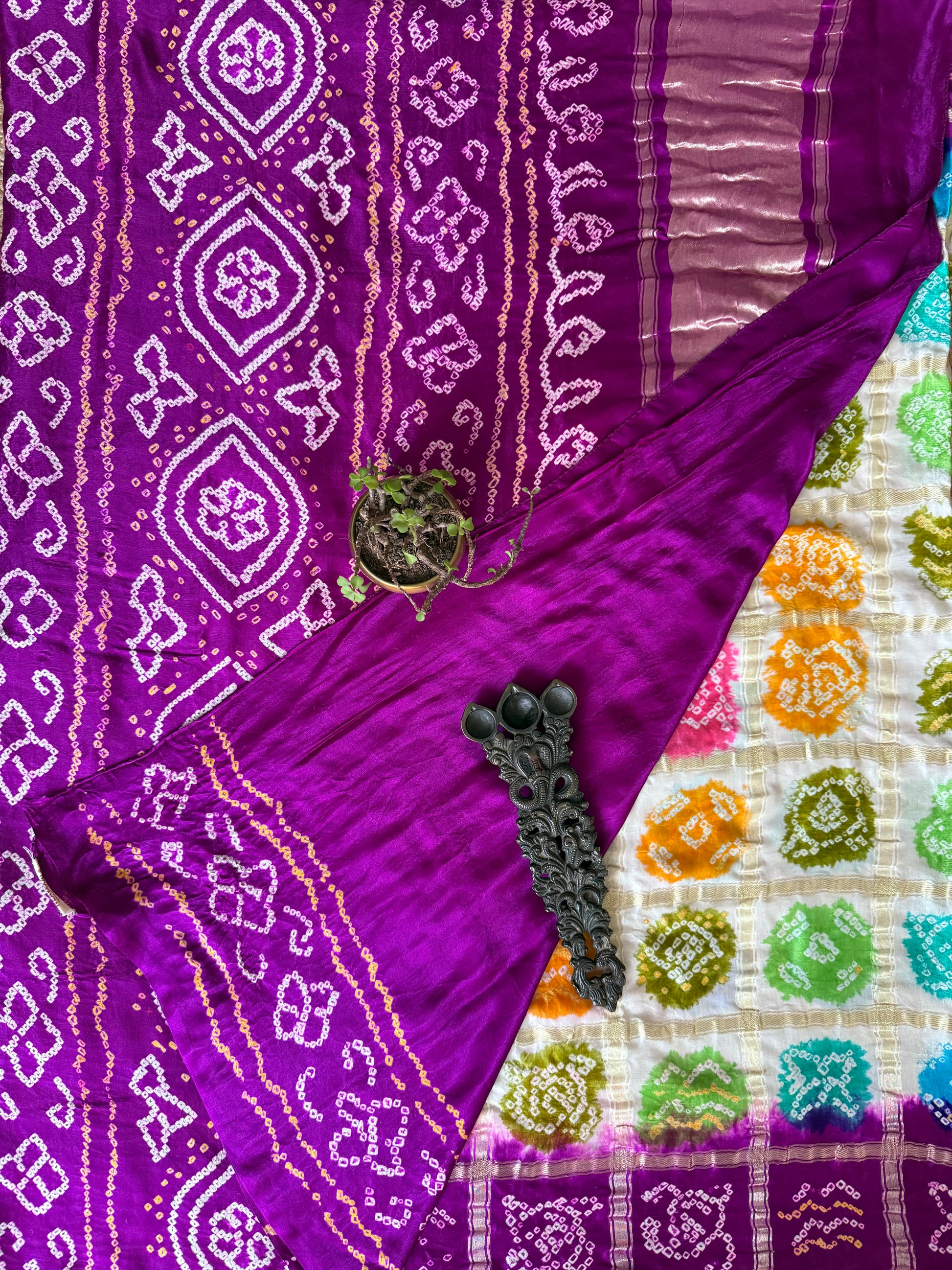 Purple & Multi colour Gajji silk Gharchola  rai bandhani  handknotted zari woven sari with blouse piece