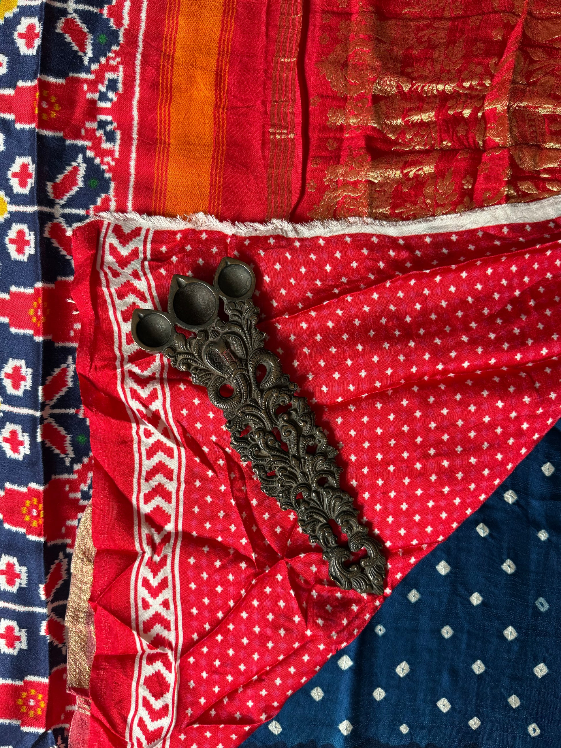 BLUE RED MODAL SILK BANDHANI WITH PATOLA NAKSHI ZARI WOVEN SARI WITH BLOUSE PIECE