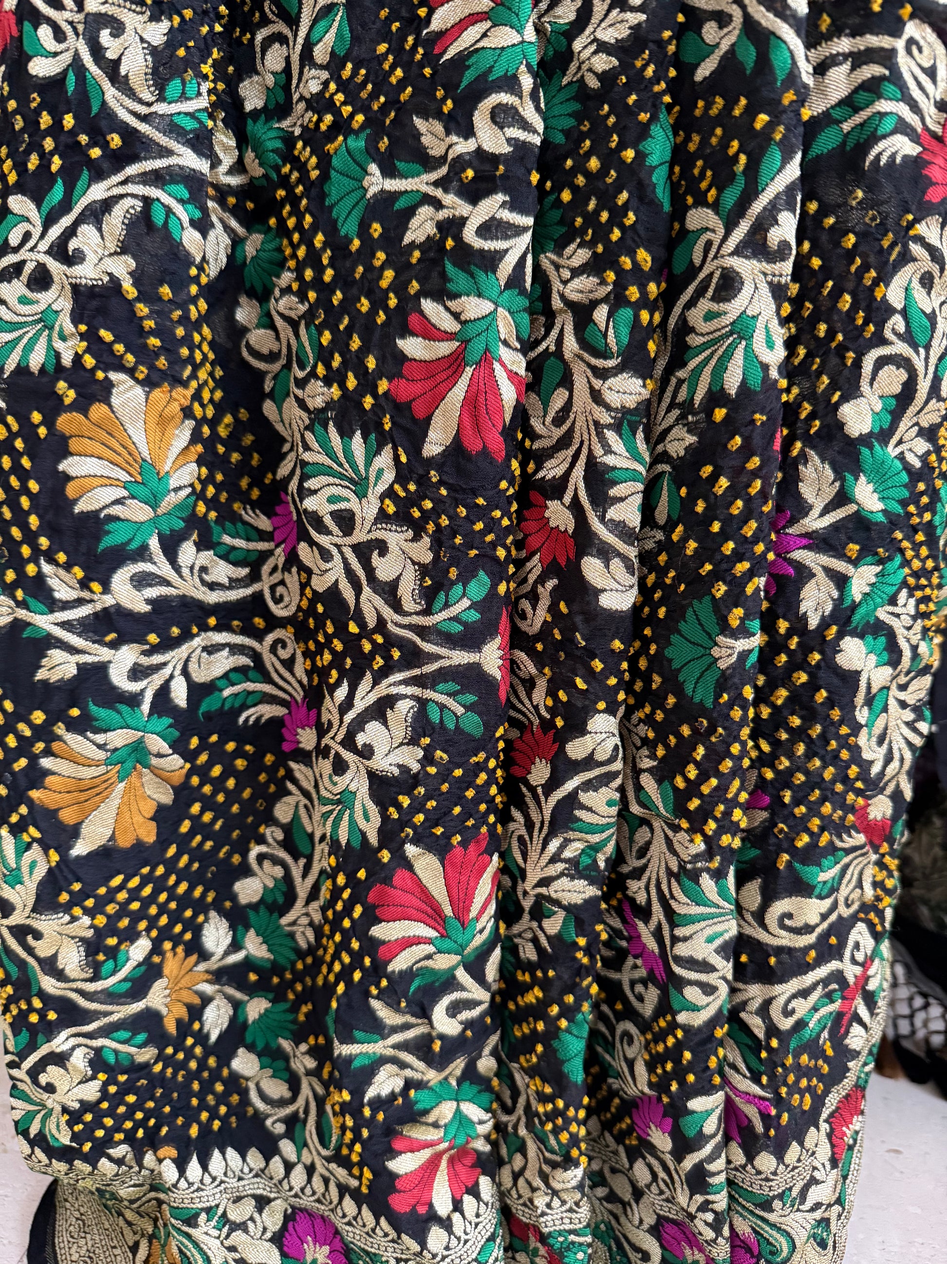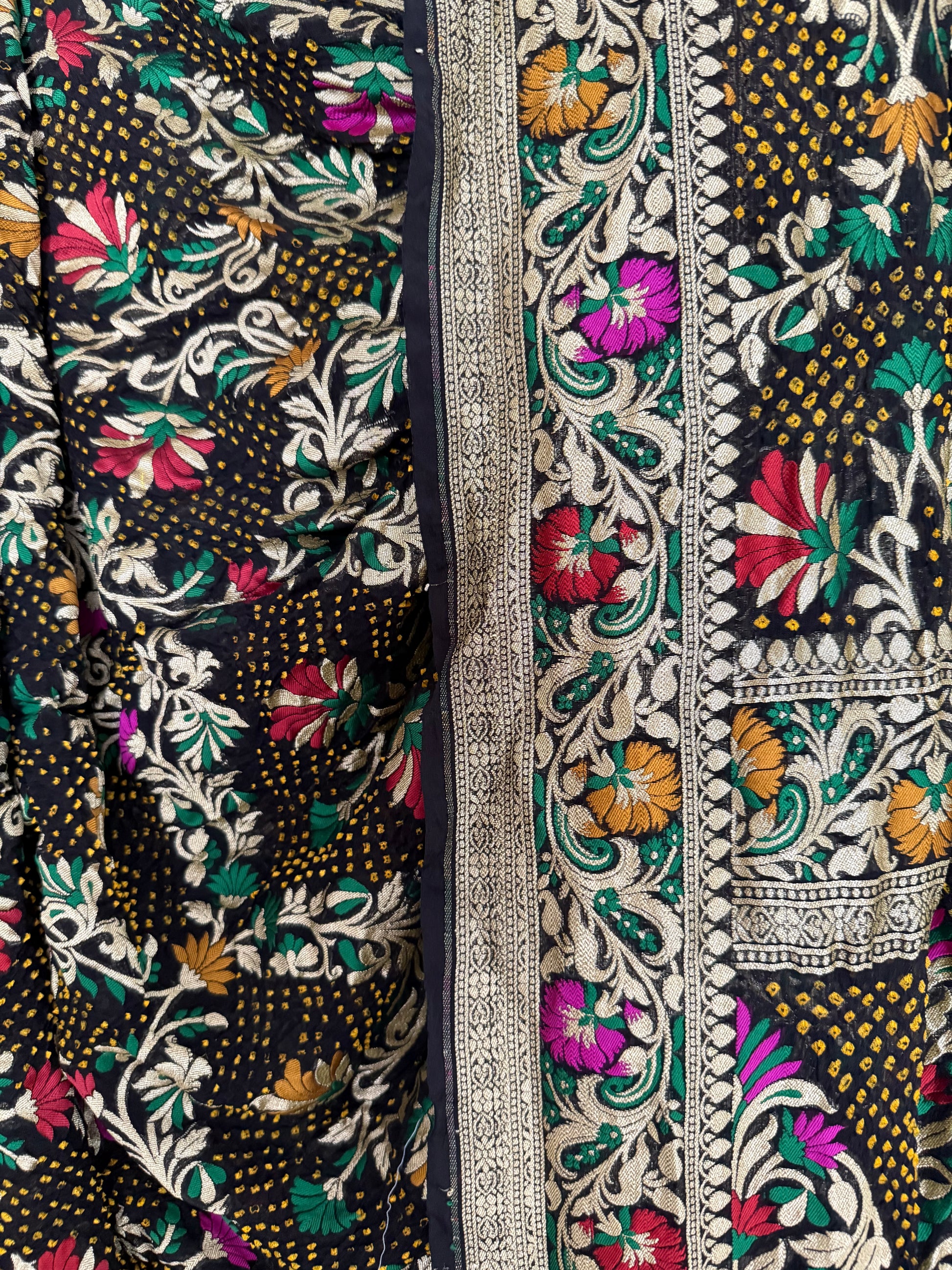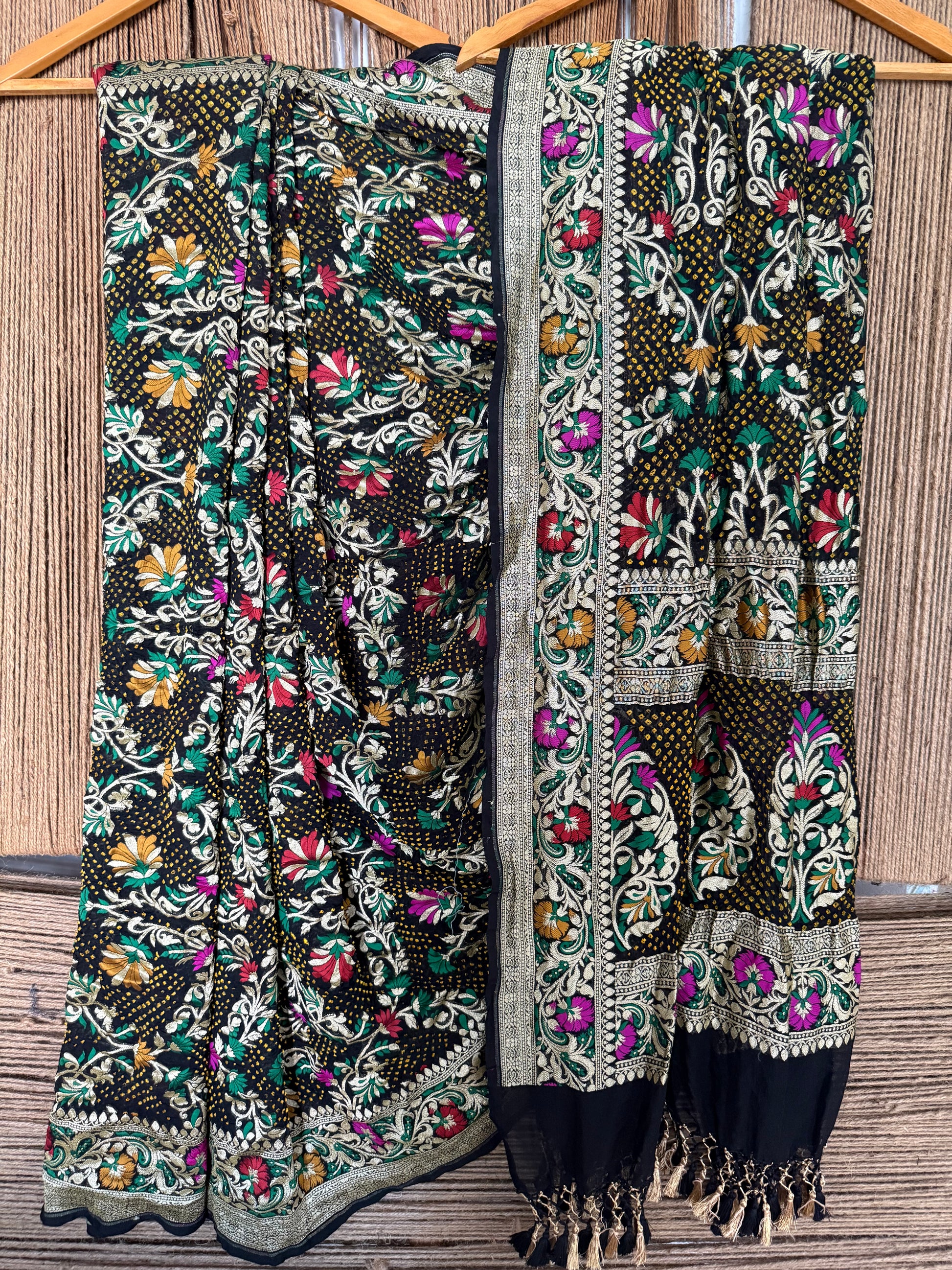 Black Handwoven Rai Bareek Bandhani Saree Meenakari Jaal with Khaddi Georgette Mks-2