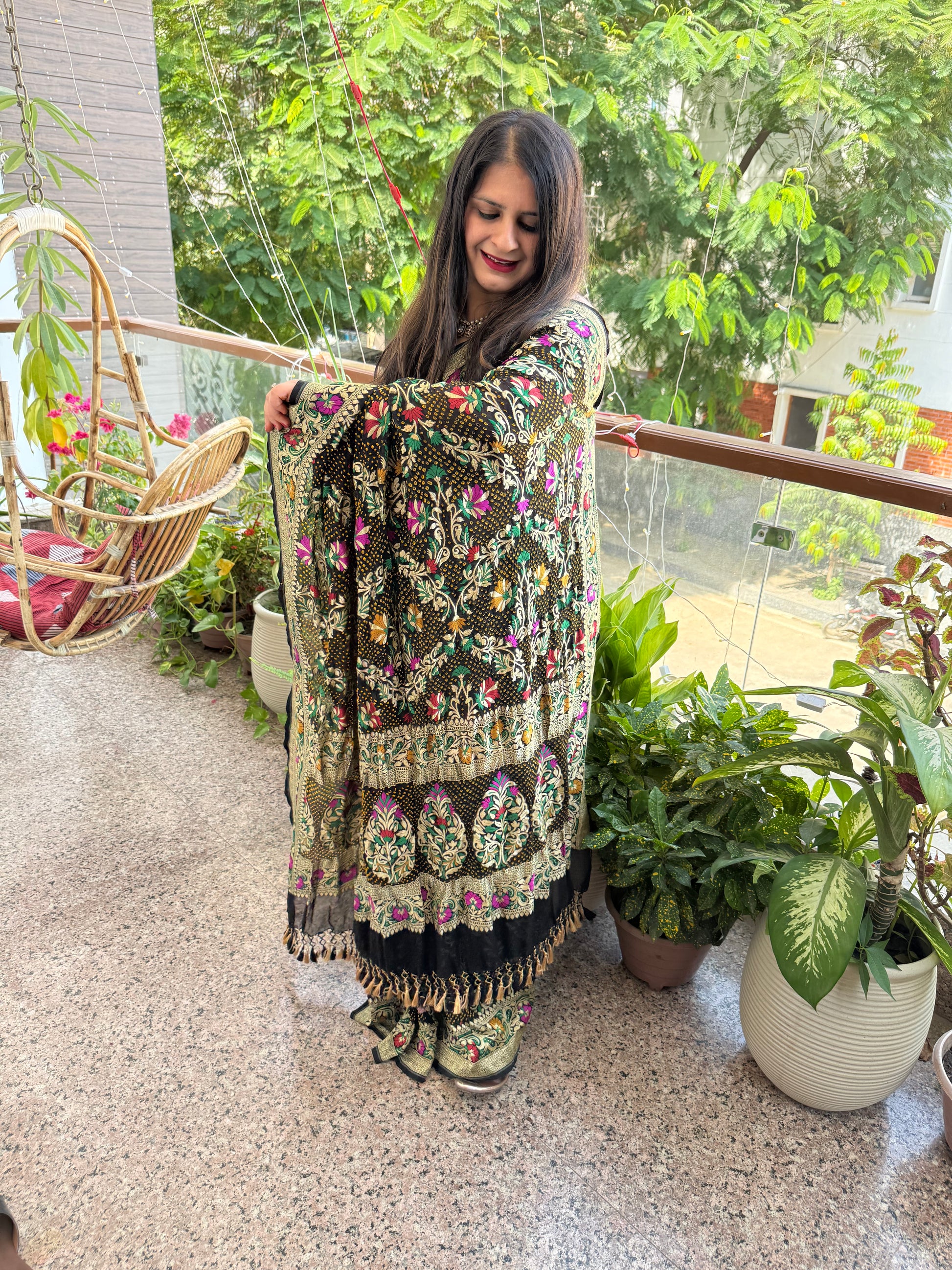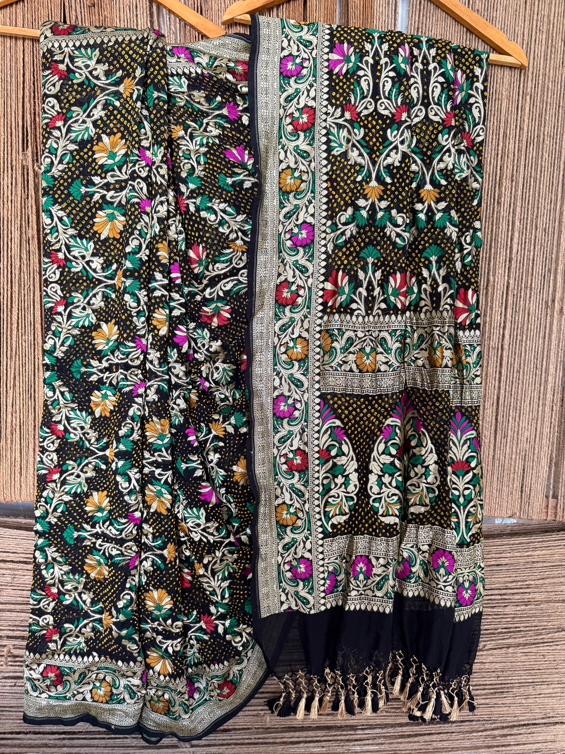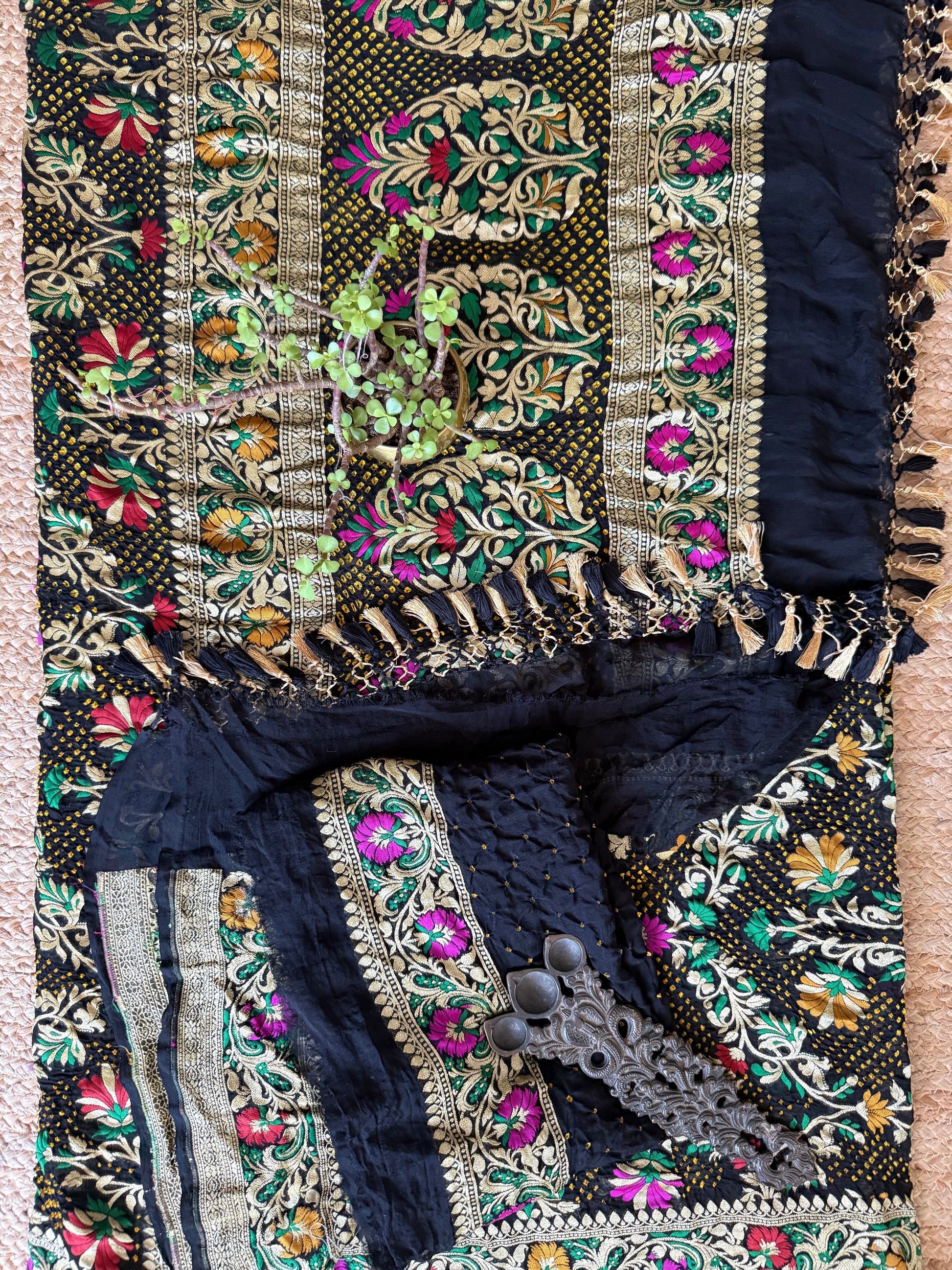 Black Handwoven Rai Bareek Bandhani Saree Meenakari Jaal with Khaddi Georgette Mks-2