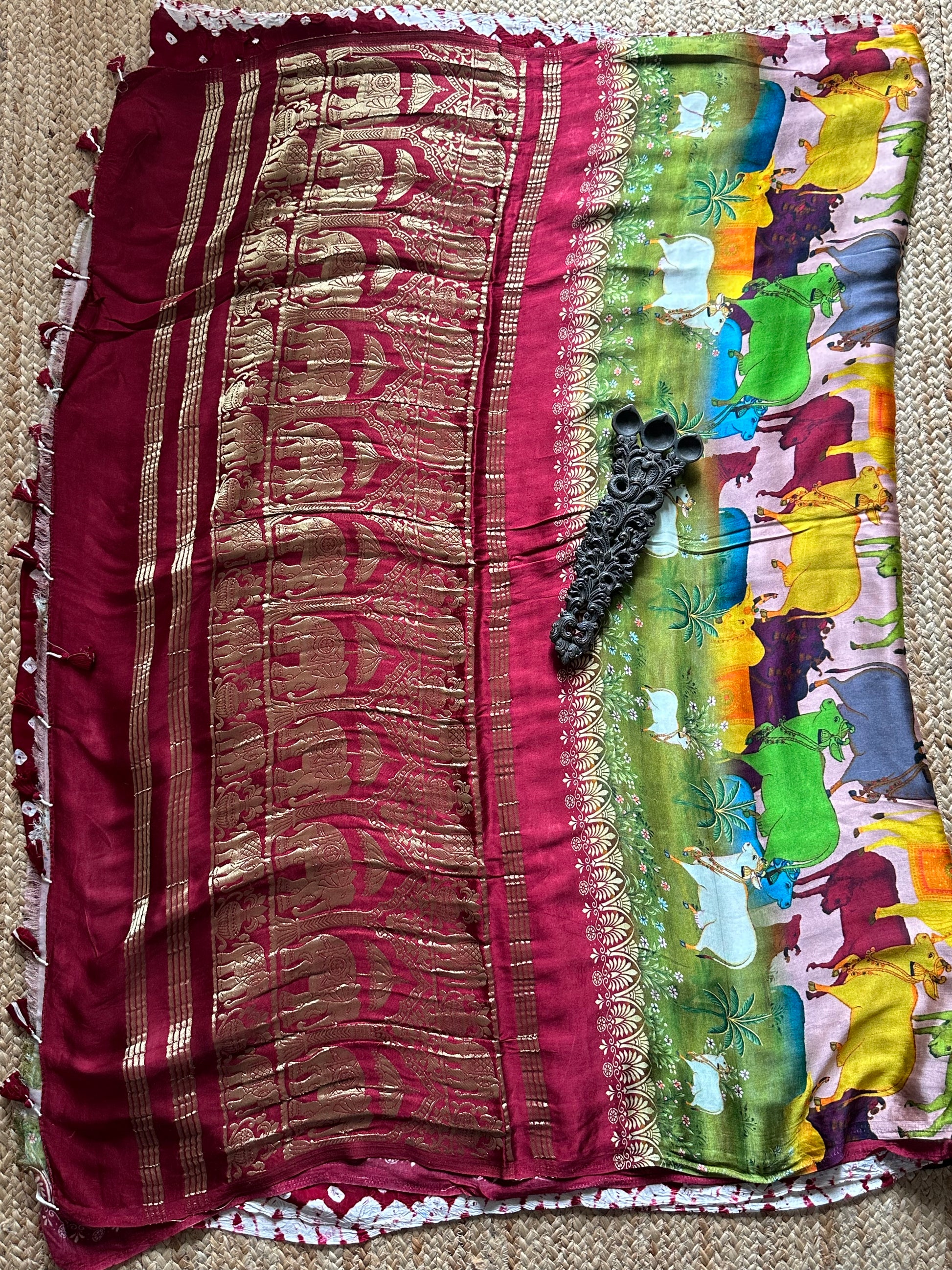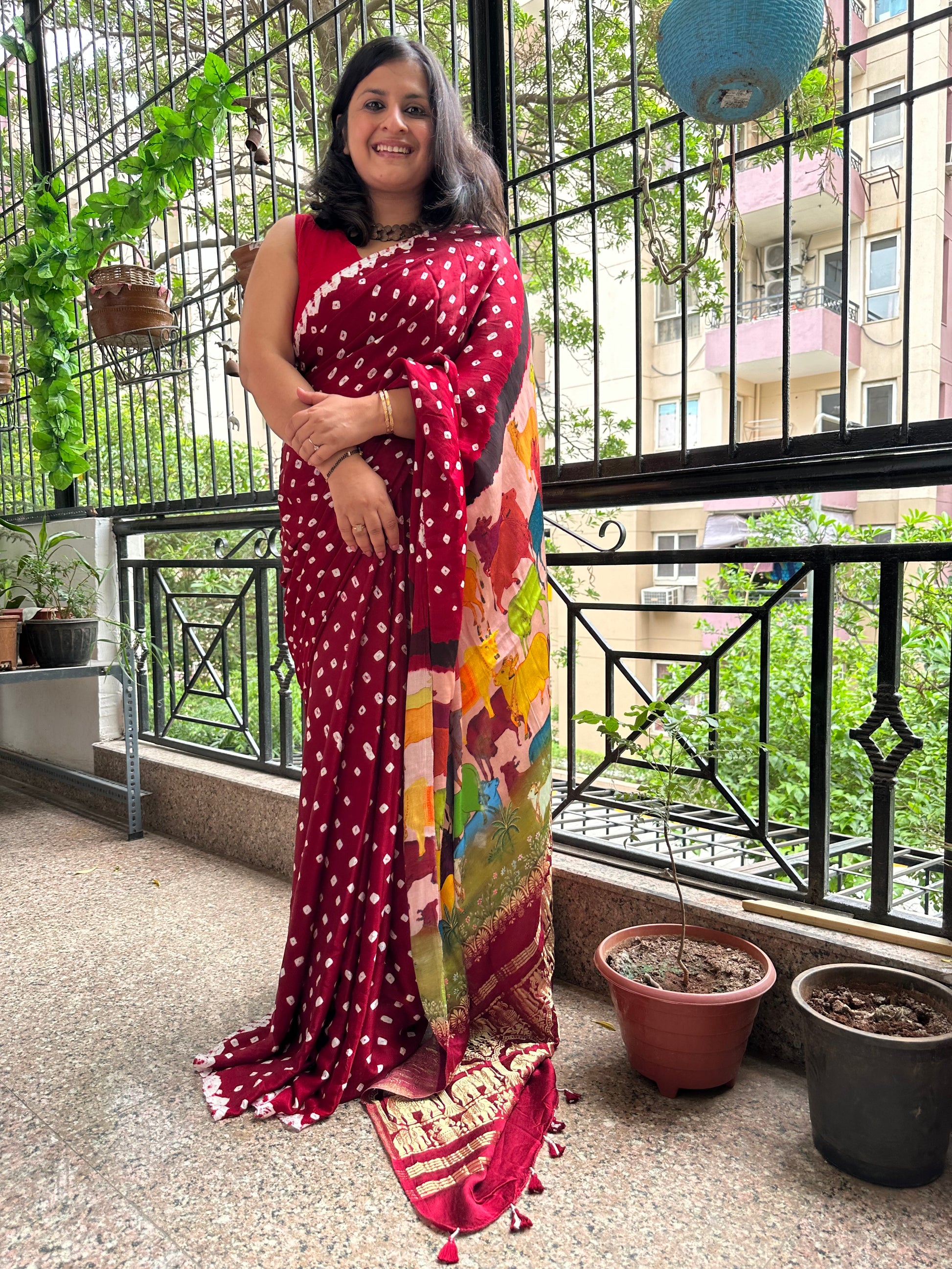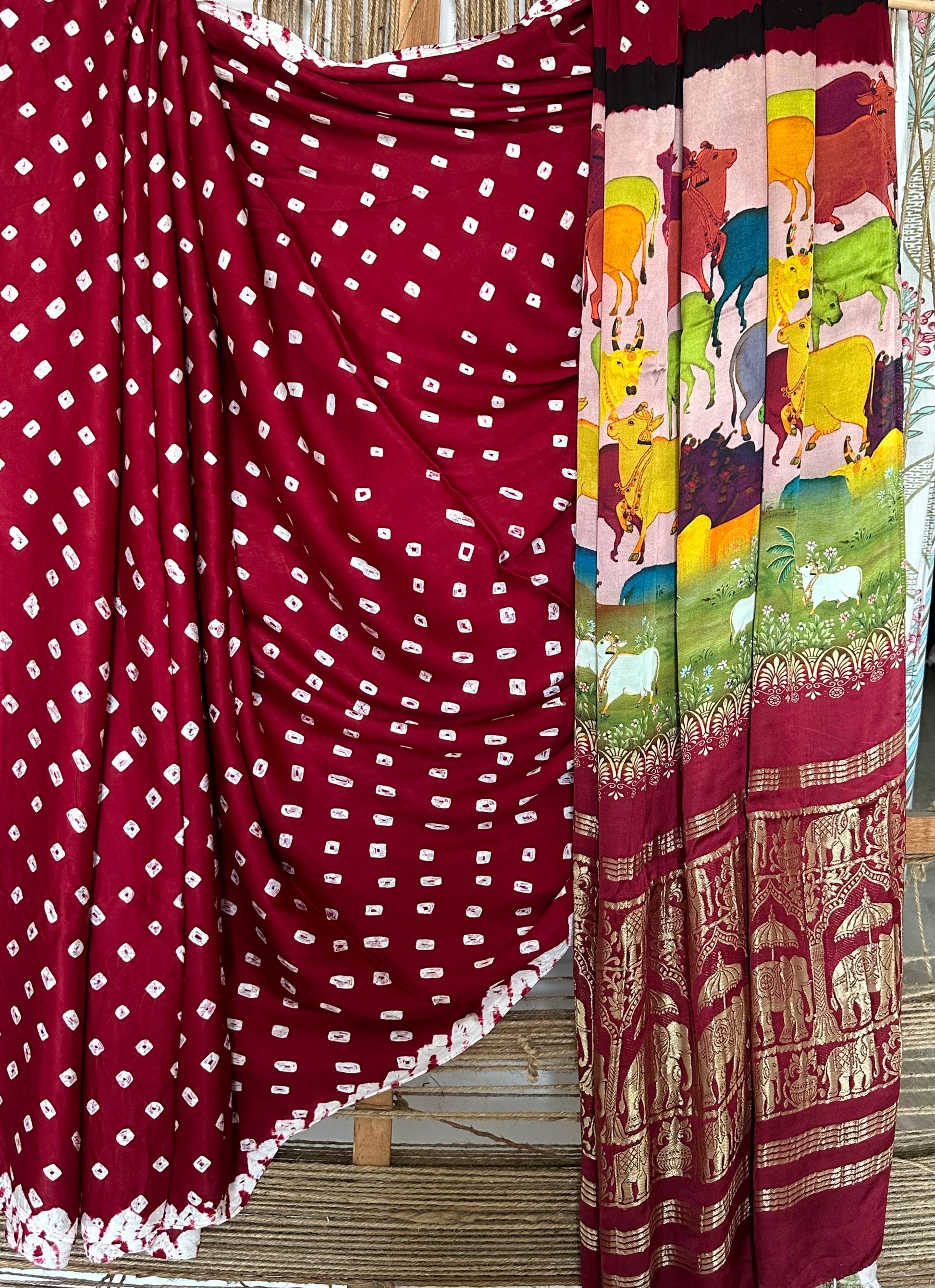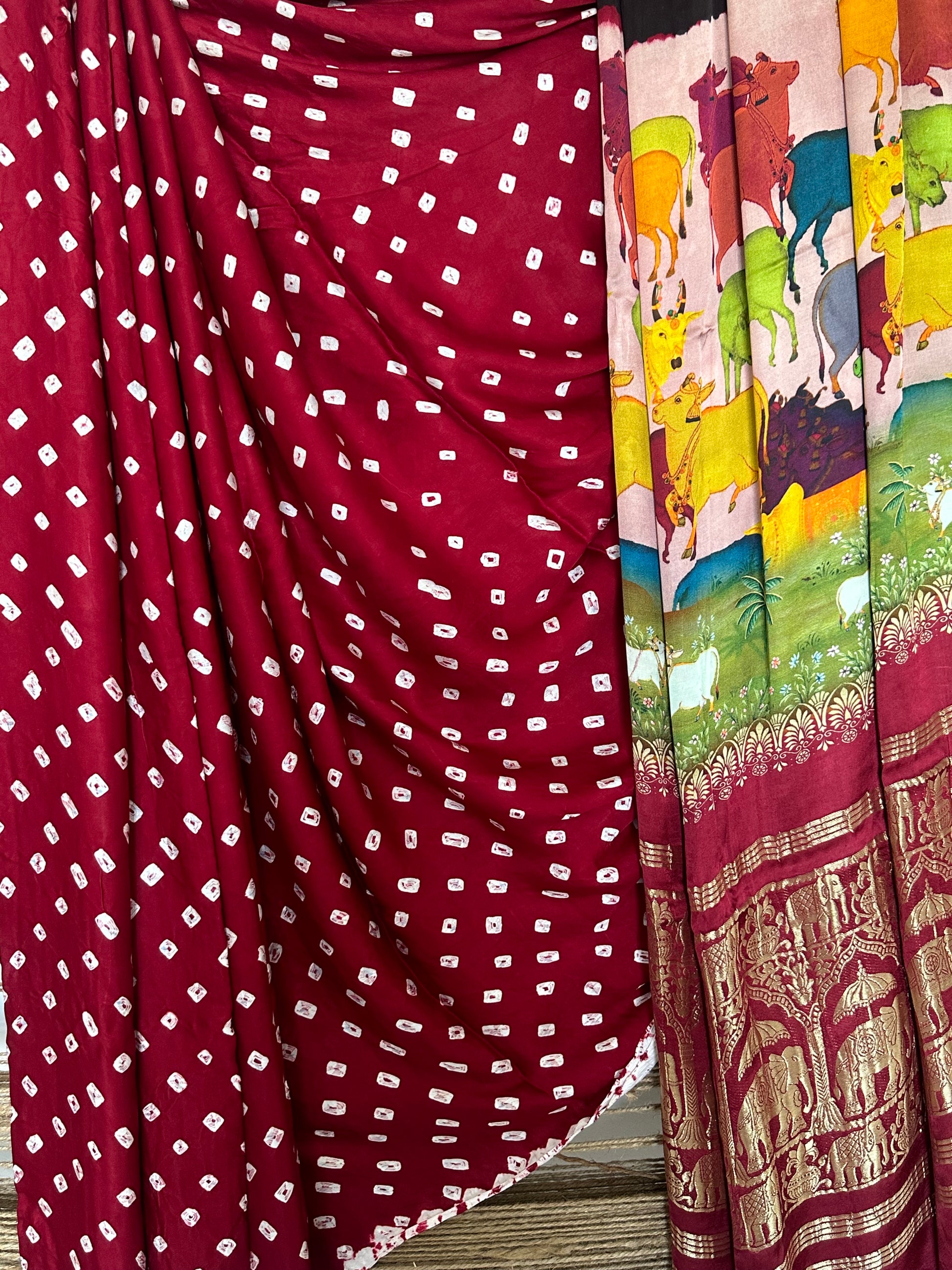 Maroon Modal silk bandhani handcrafted with Pichwai Print Sari in Nakshi Elephant Border BPS 11
