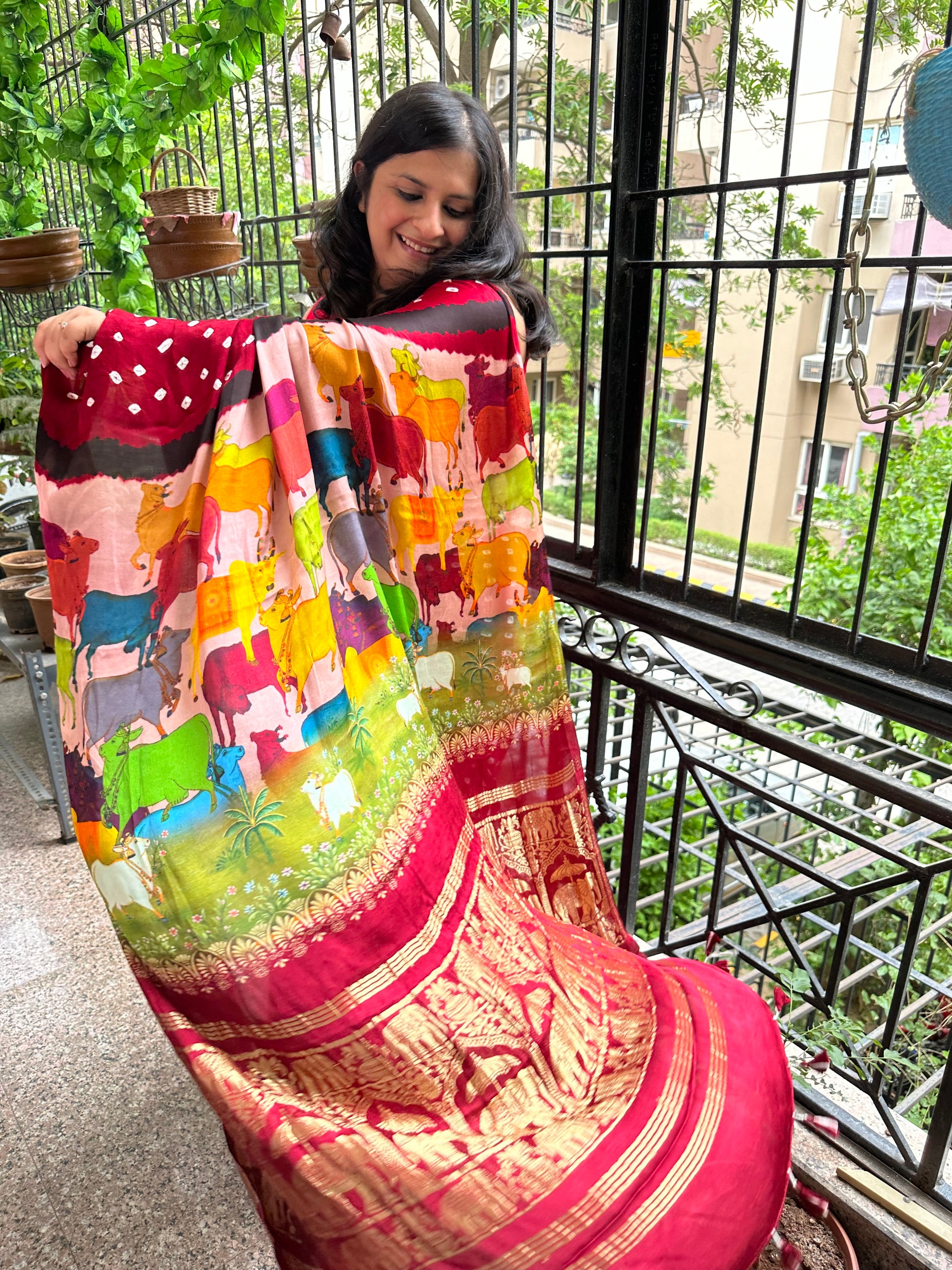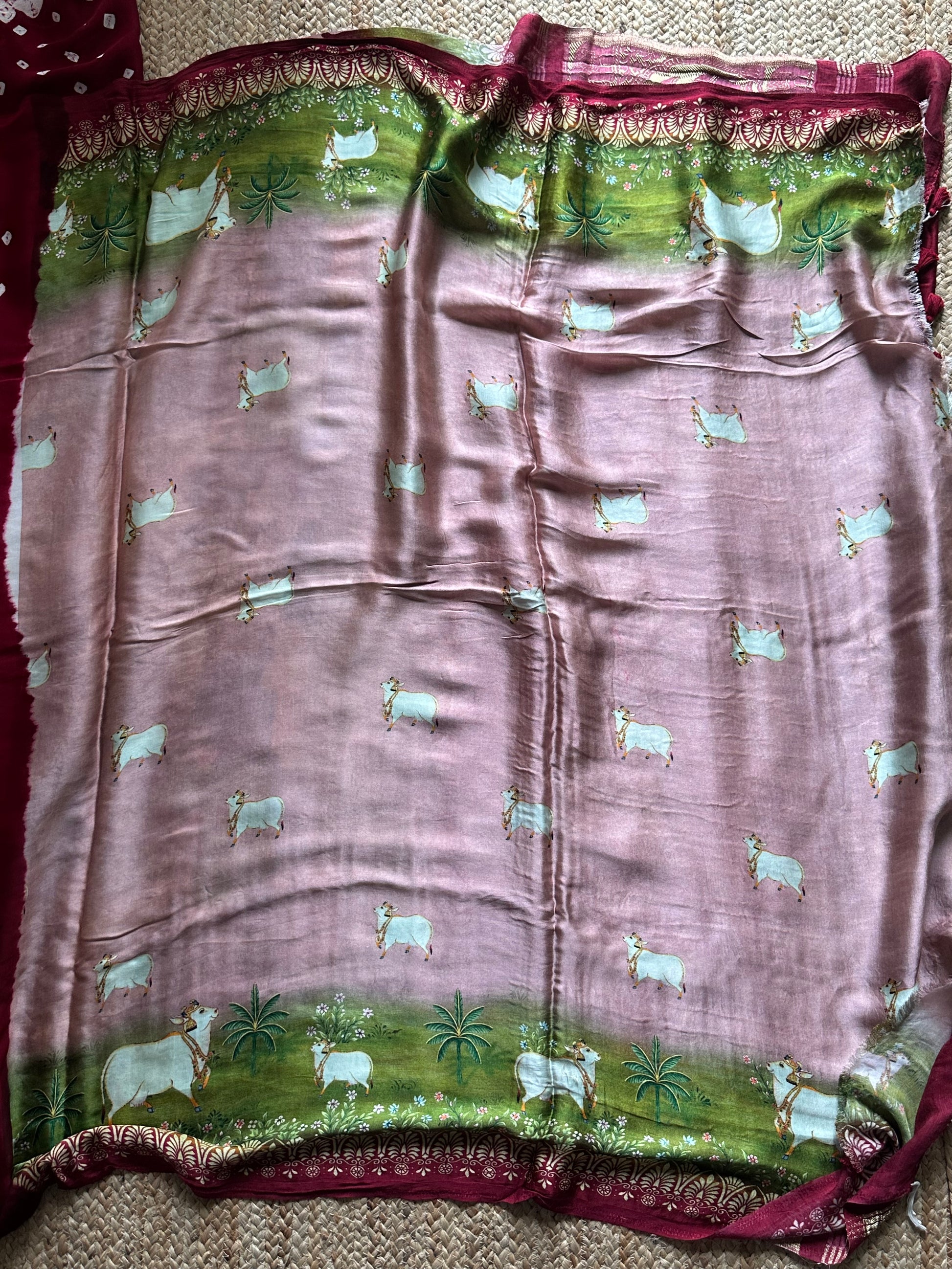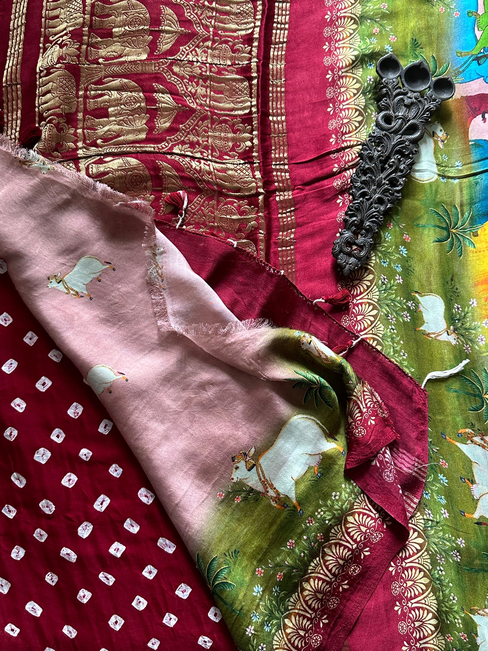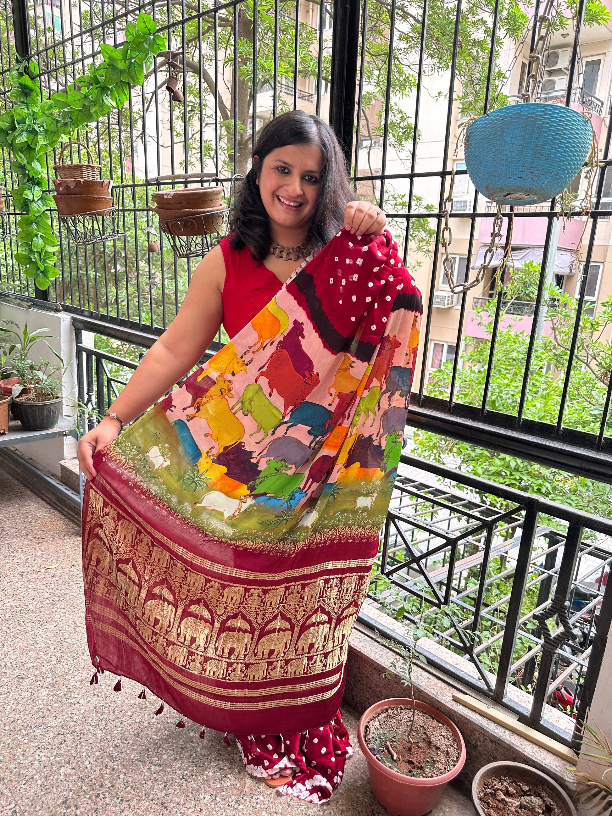 Maroon Modal silk bandhani handcrafted with Pichwai Print Sari in Nakshi Elephant Border BPS 11