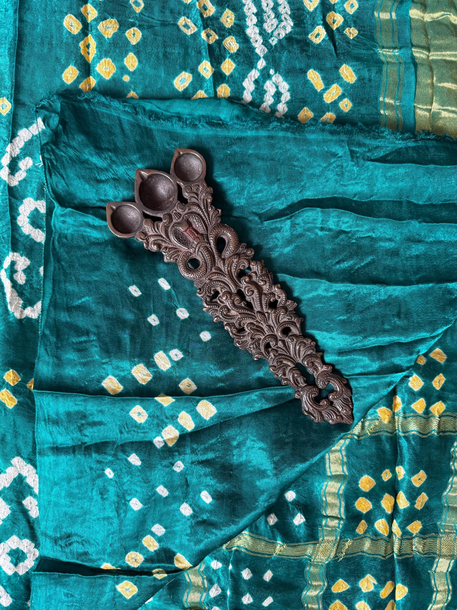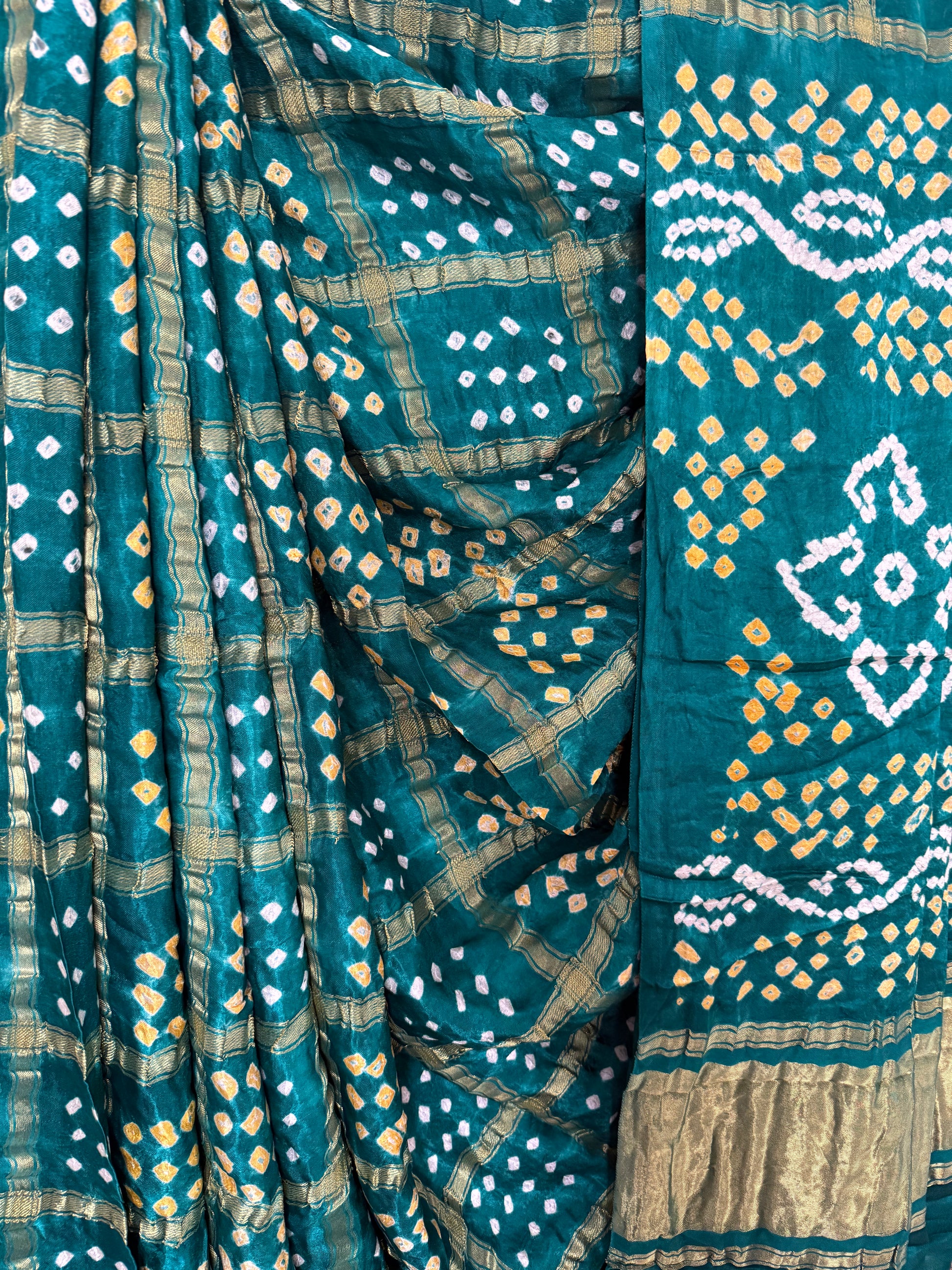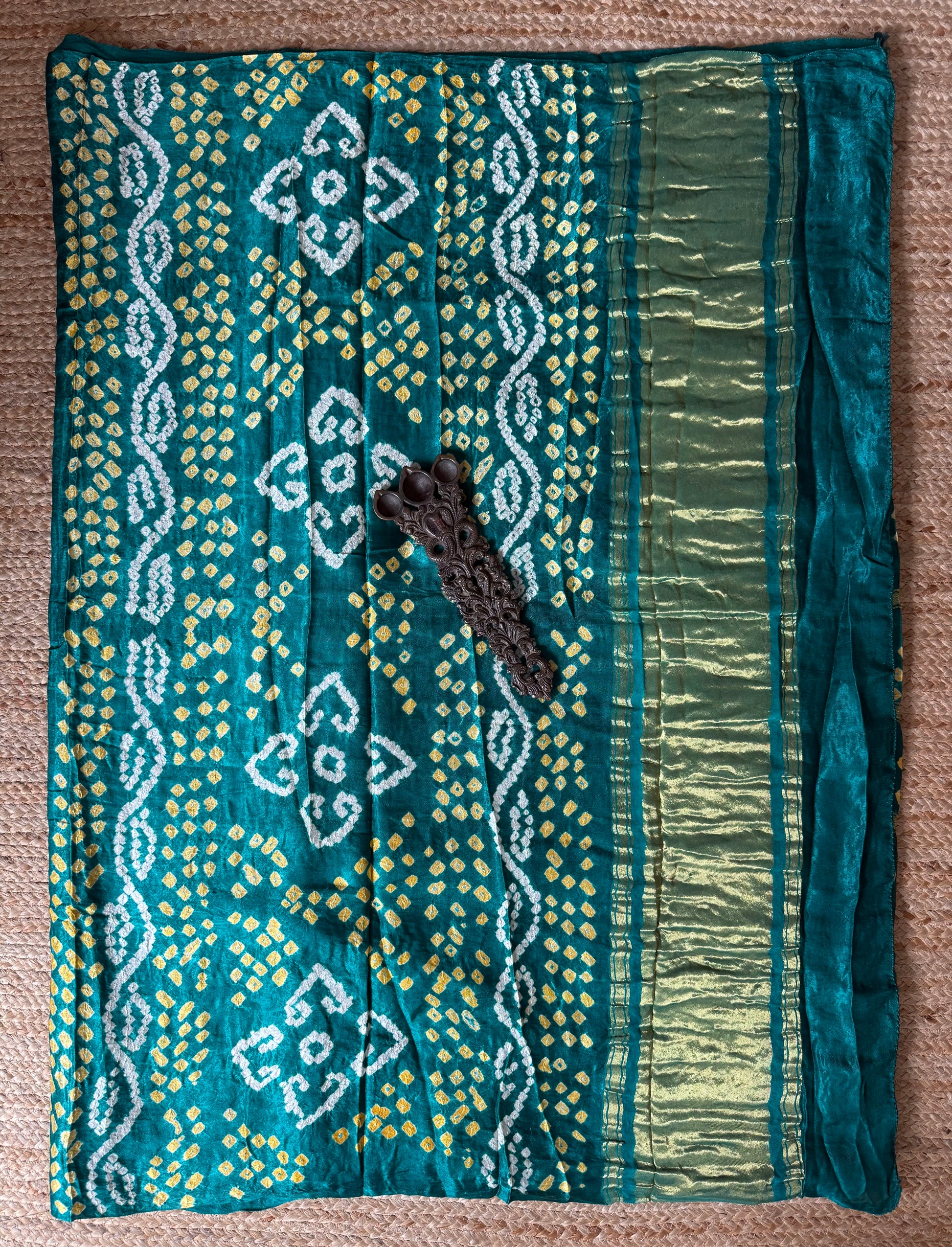 Turquoise Green silk gharchola bandhani handknotted zari woven sari with blouse piece