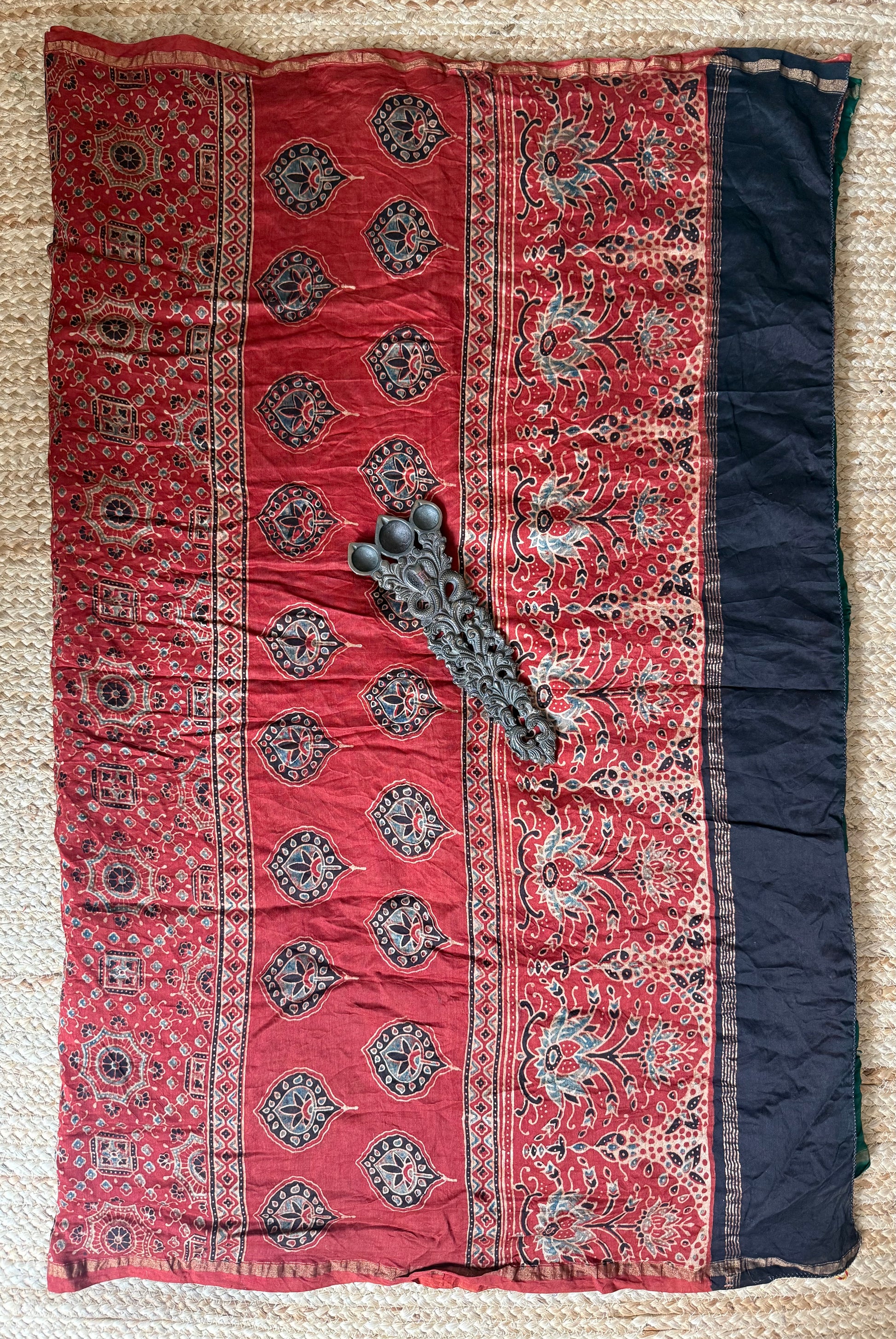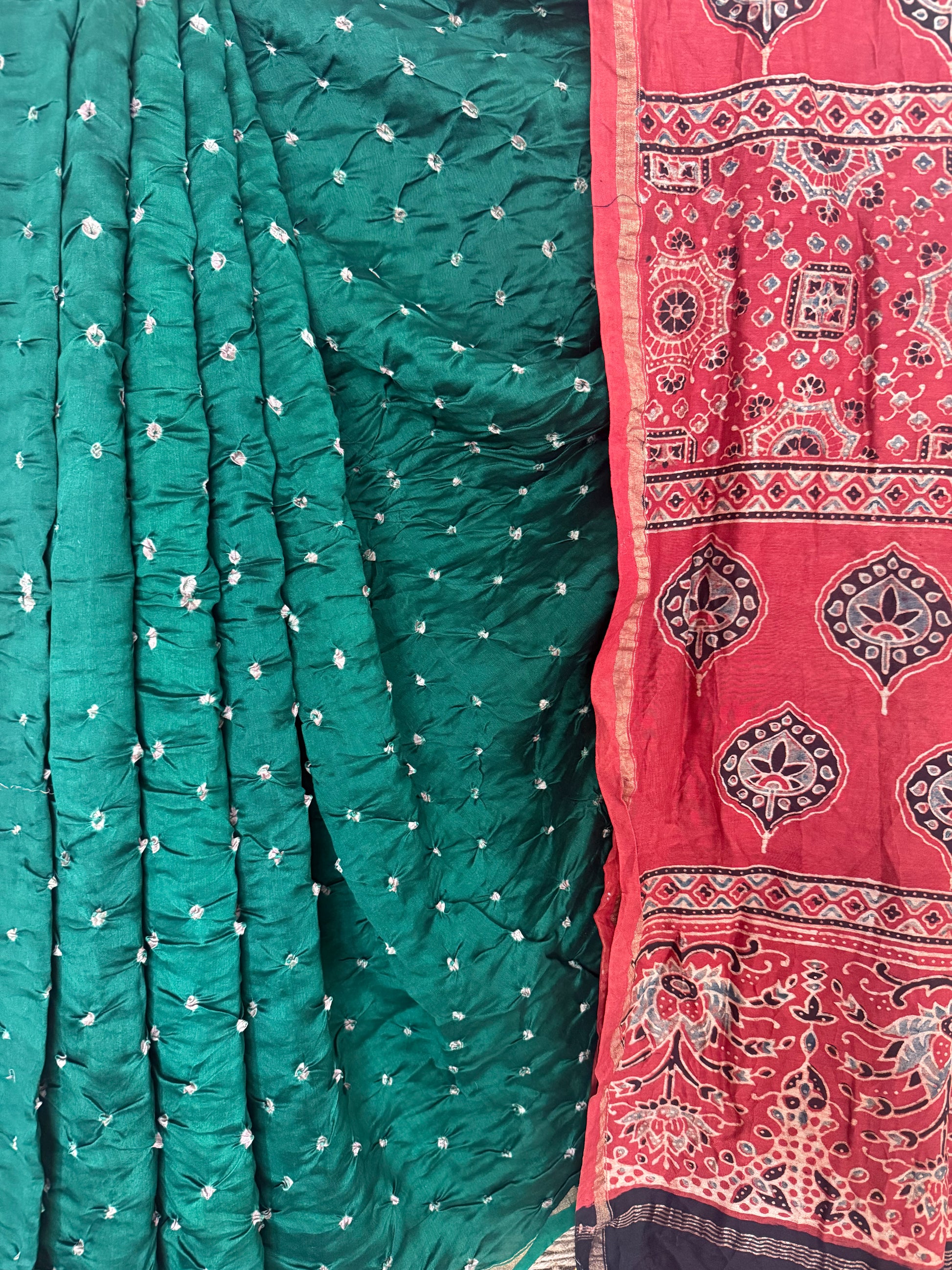 GREEN CHANDERI SILK BANDHANI HANDCRAFTED AJRAKH SARI