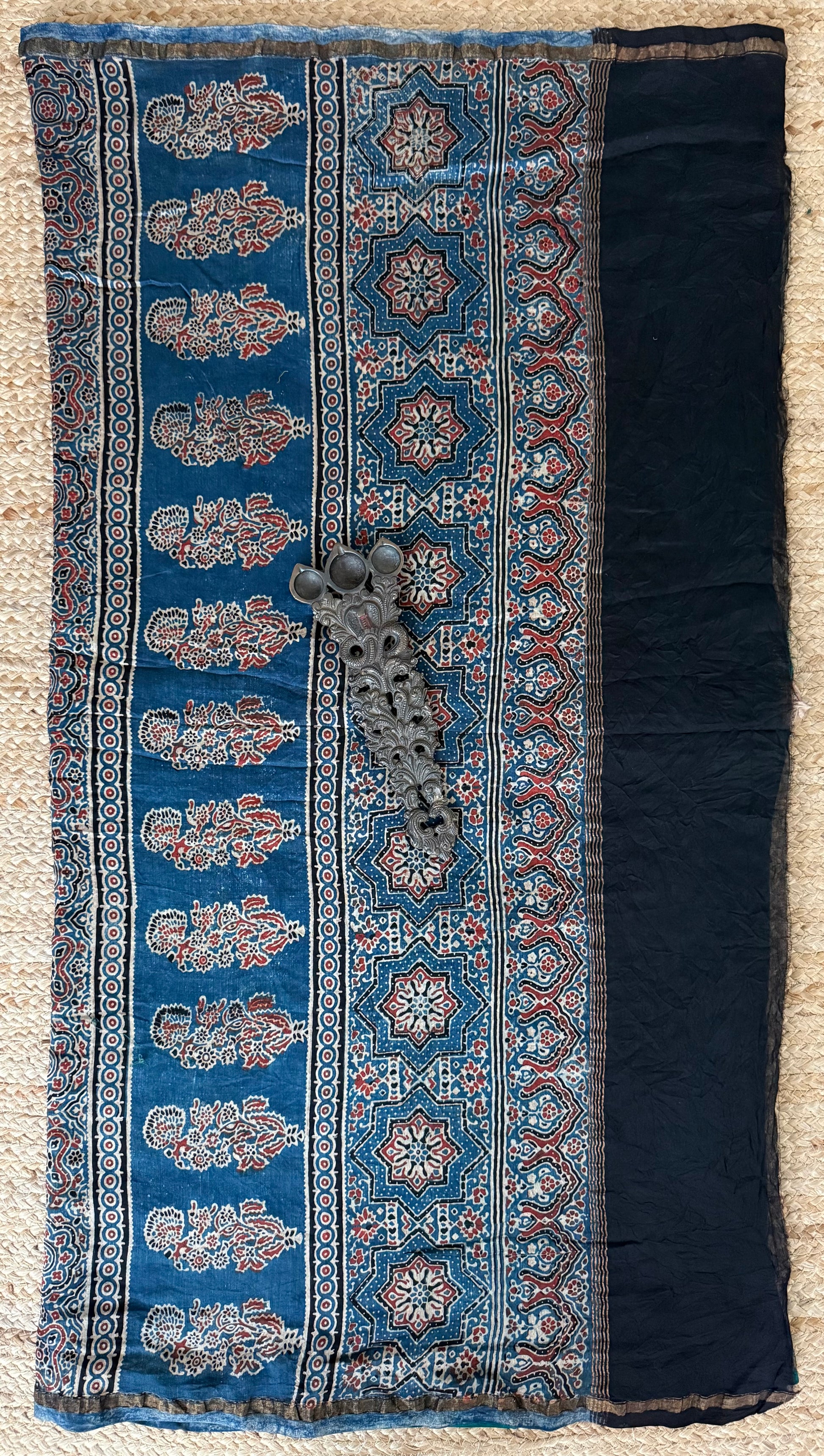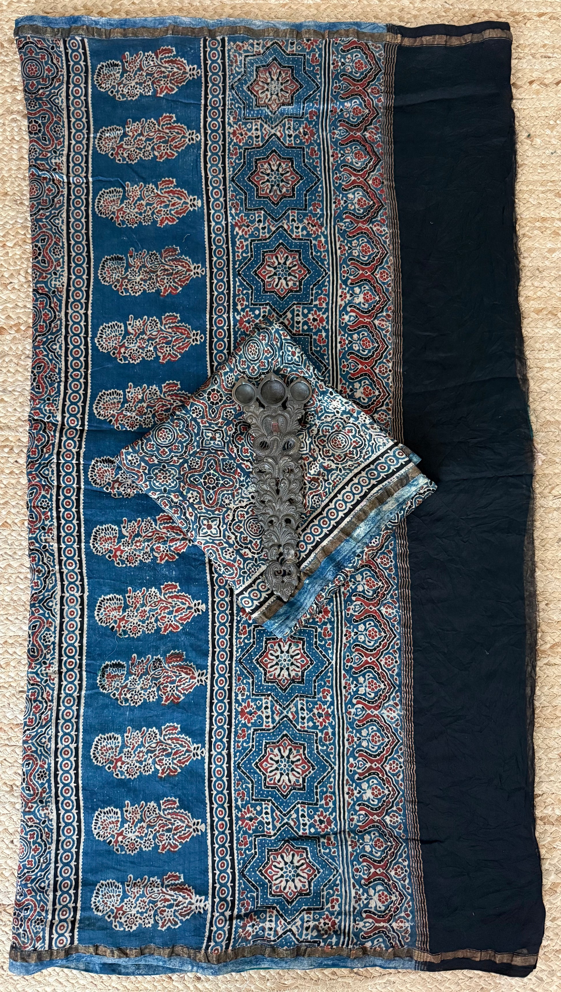 TEAL BLUE CHANDERI SILK BANDHANI AJRAKH HANDCRAFTED SAREE WITH BLOUSE PIECE