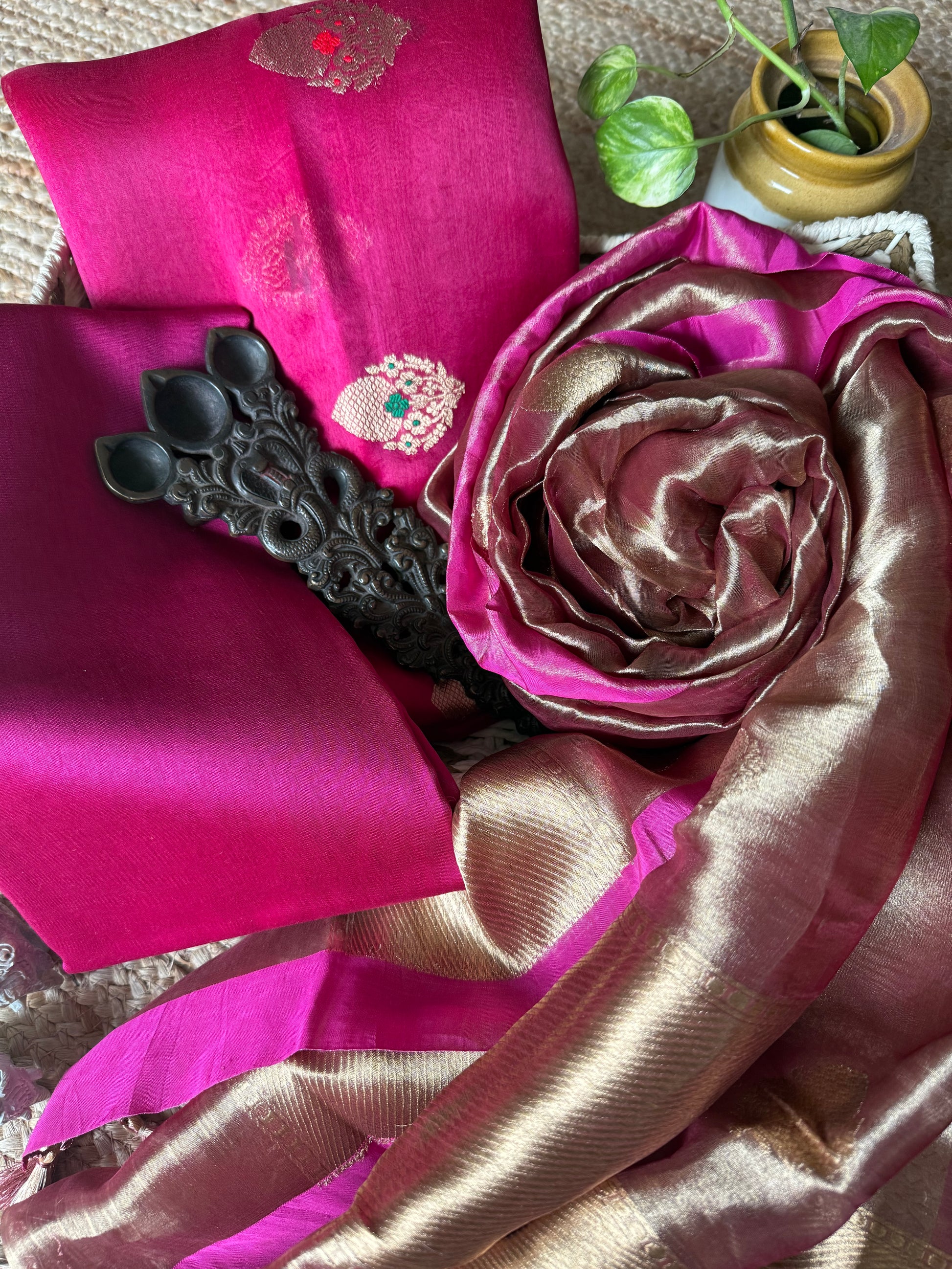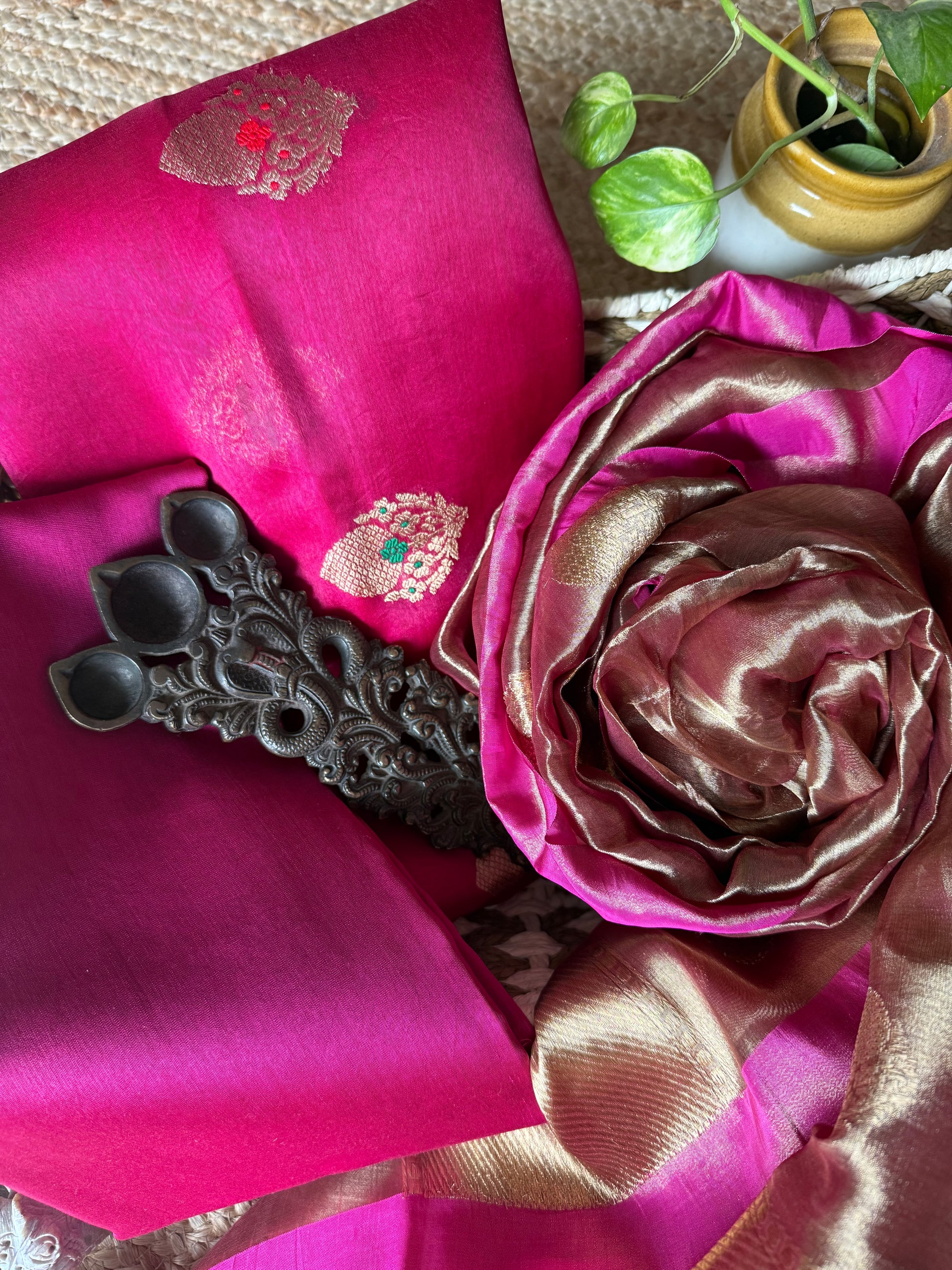Bright pink Kora Silk certified  handloom  Banarsi kadwa booti meenakari 3 piece suit set