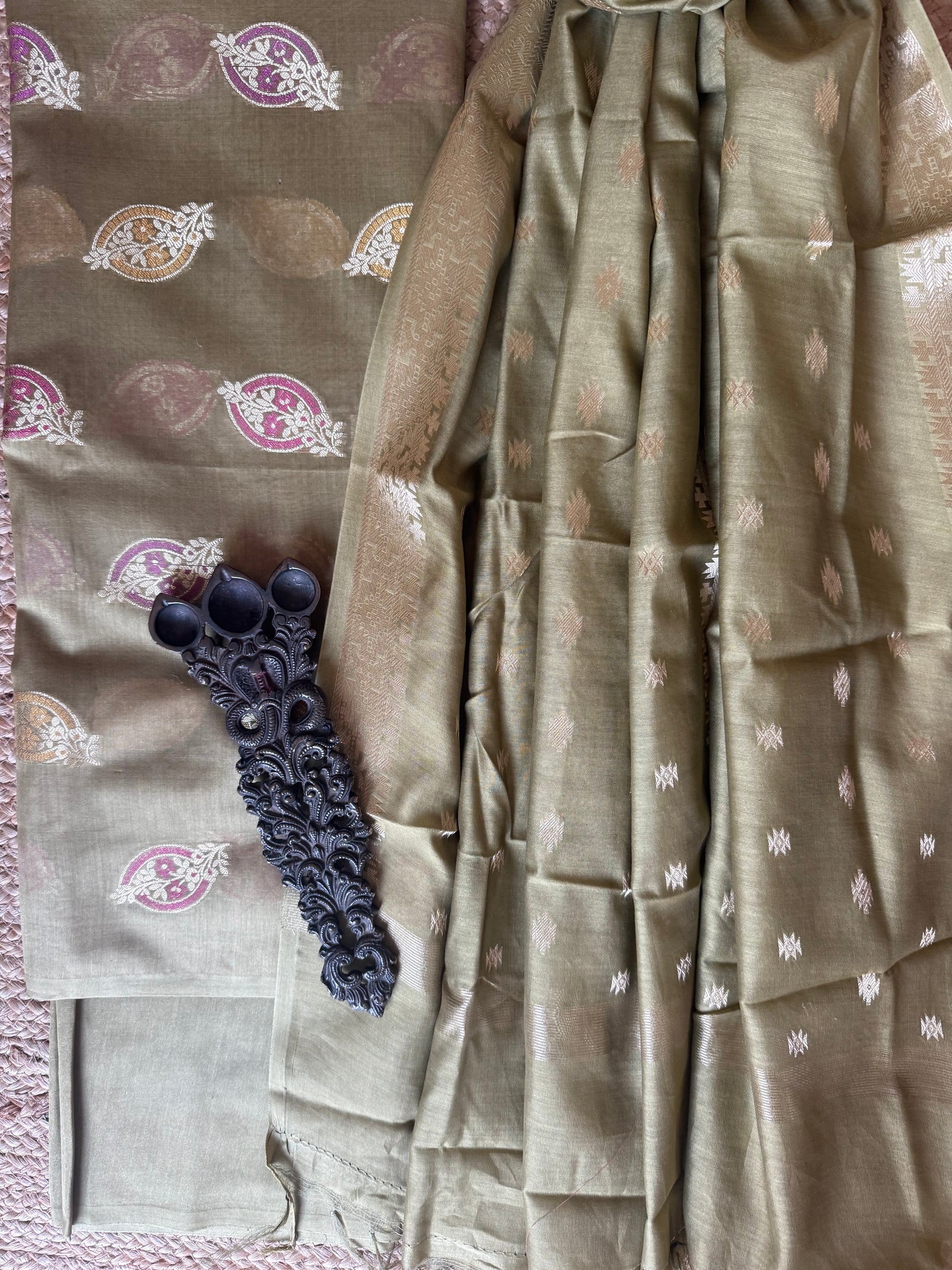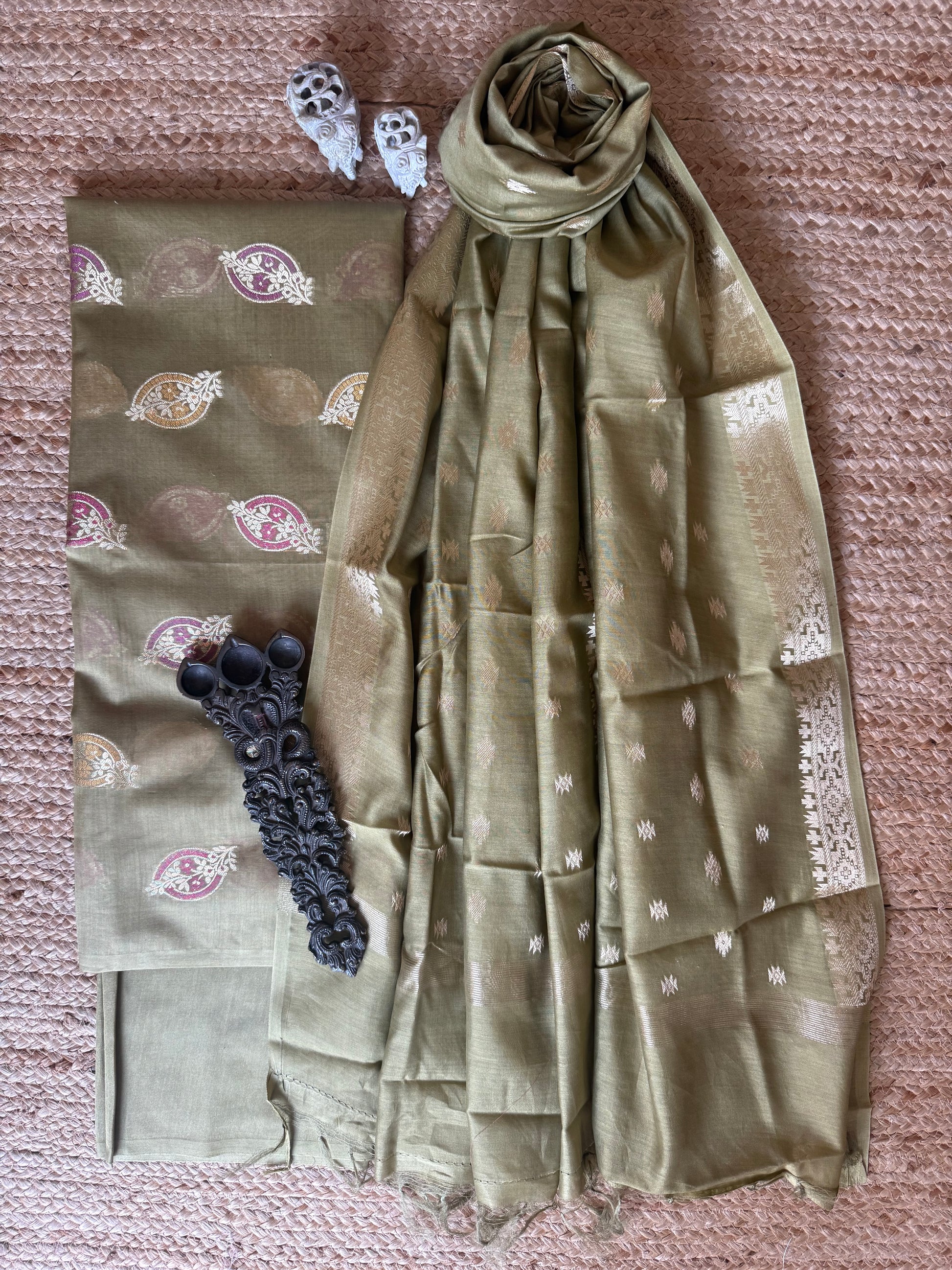 OLIVE GREEN CHANDERI HANDLOOM 3 PIECE SUIT SETS The dupatta is CHANDERI with Banarsi border FABRIC: 2.5 MTRS METER BOTTOM:2.5 MTS DUPATTA: 2.5 MTRS * 35'' A SLIGHT DIFFERENCE IN SHADE COULD BE DUE TO THE CAMERA & LIGHTS. EMBRACE THE IMPERFECTION !! HAPPY HANDLOOM DRY CLEAN ONLY |