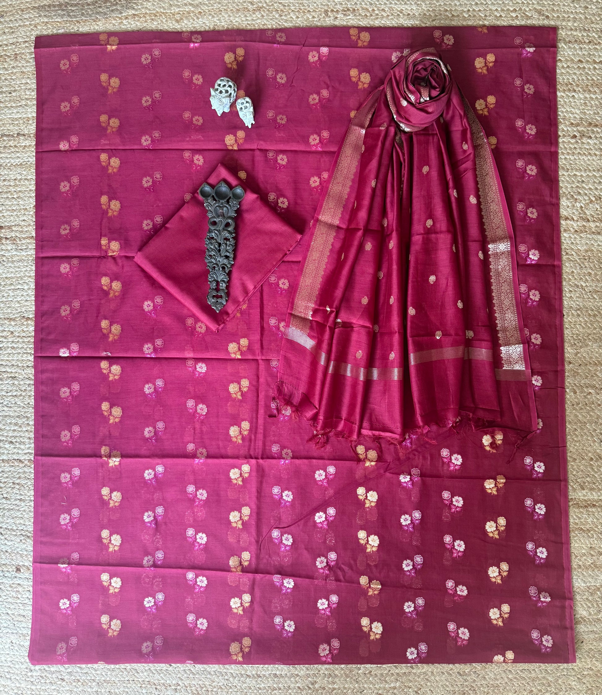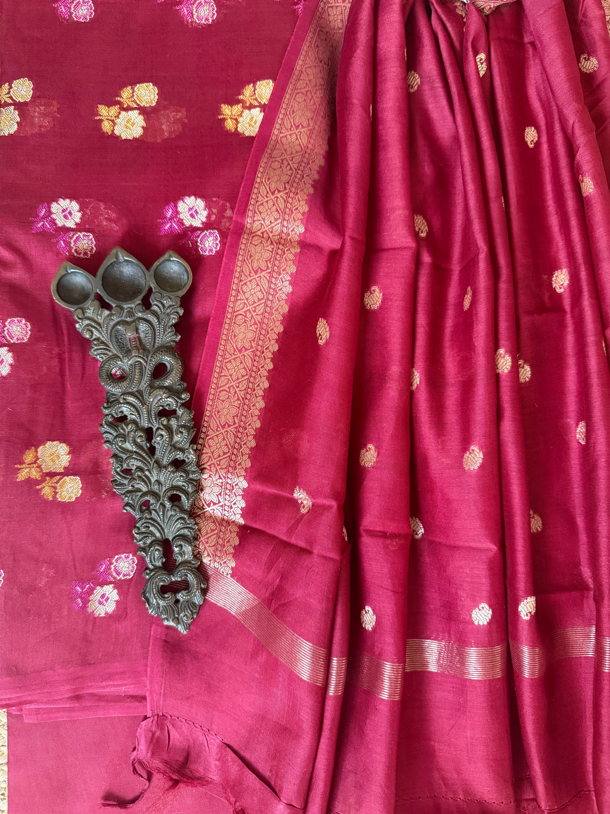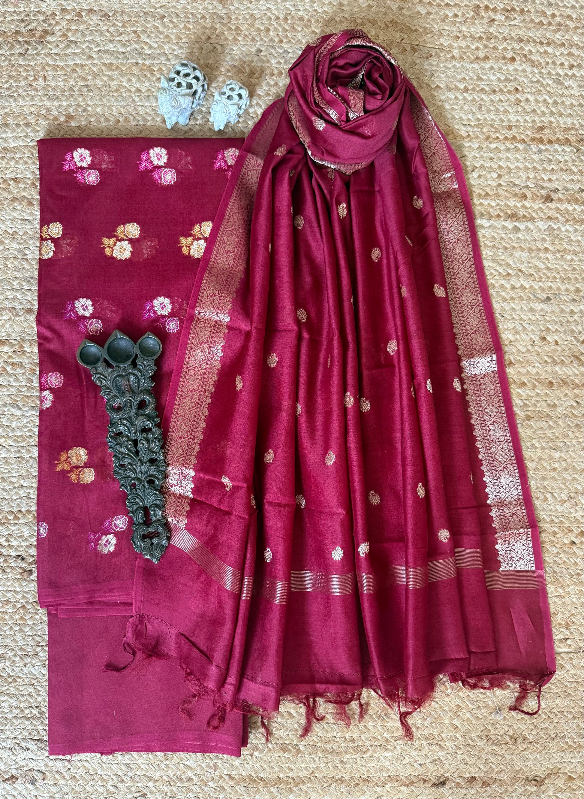 Vivid Maroon Chanderi handloom Banarsi Booti three piece suit CBS-304