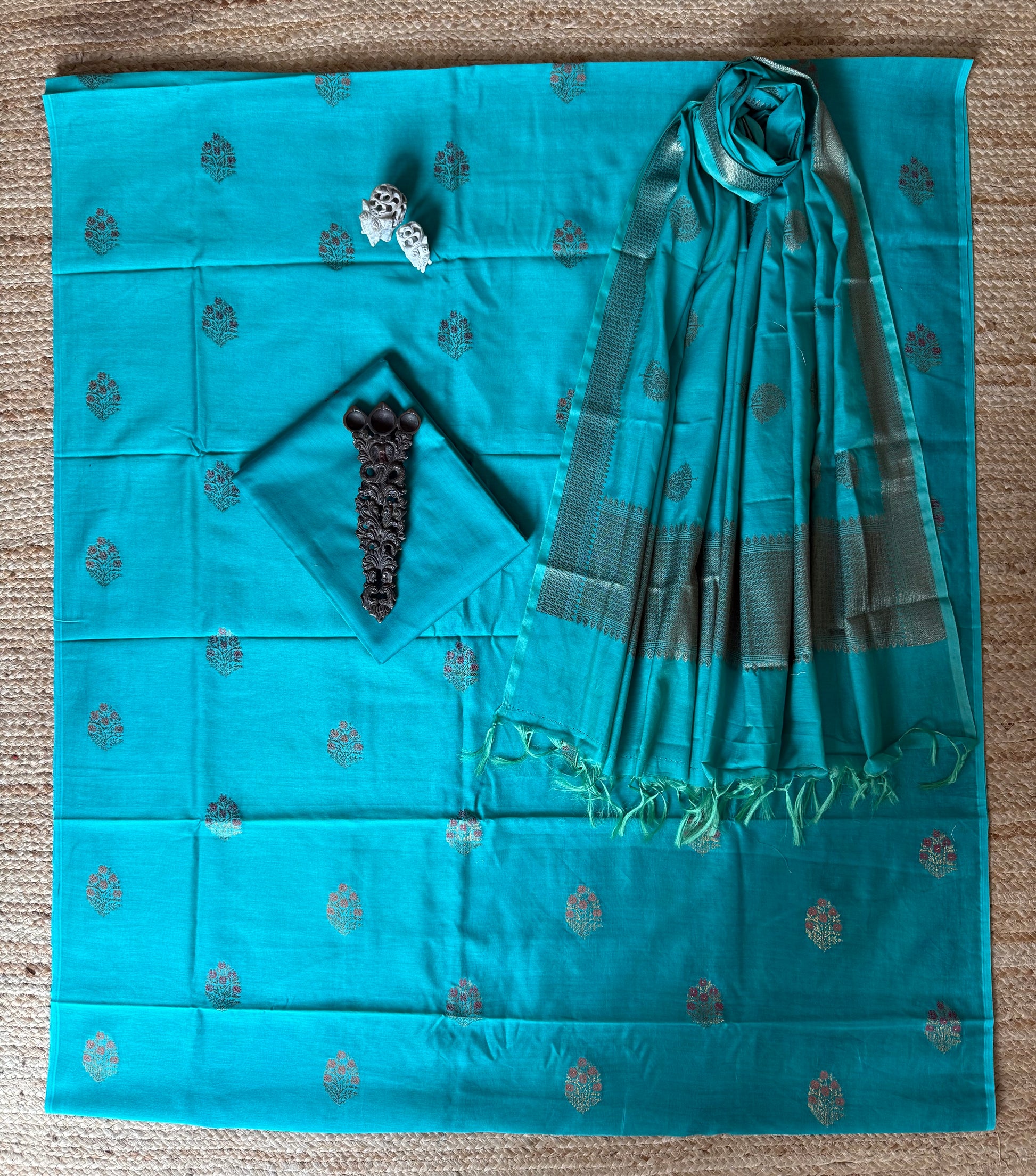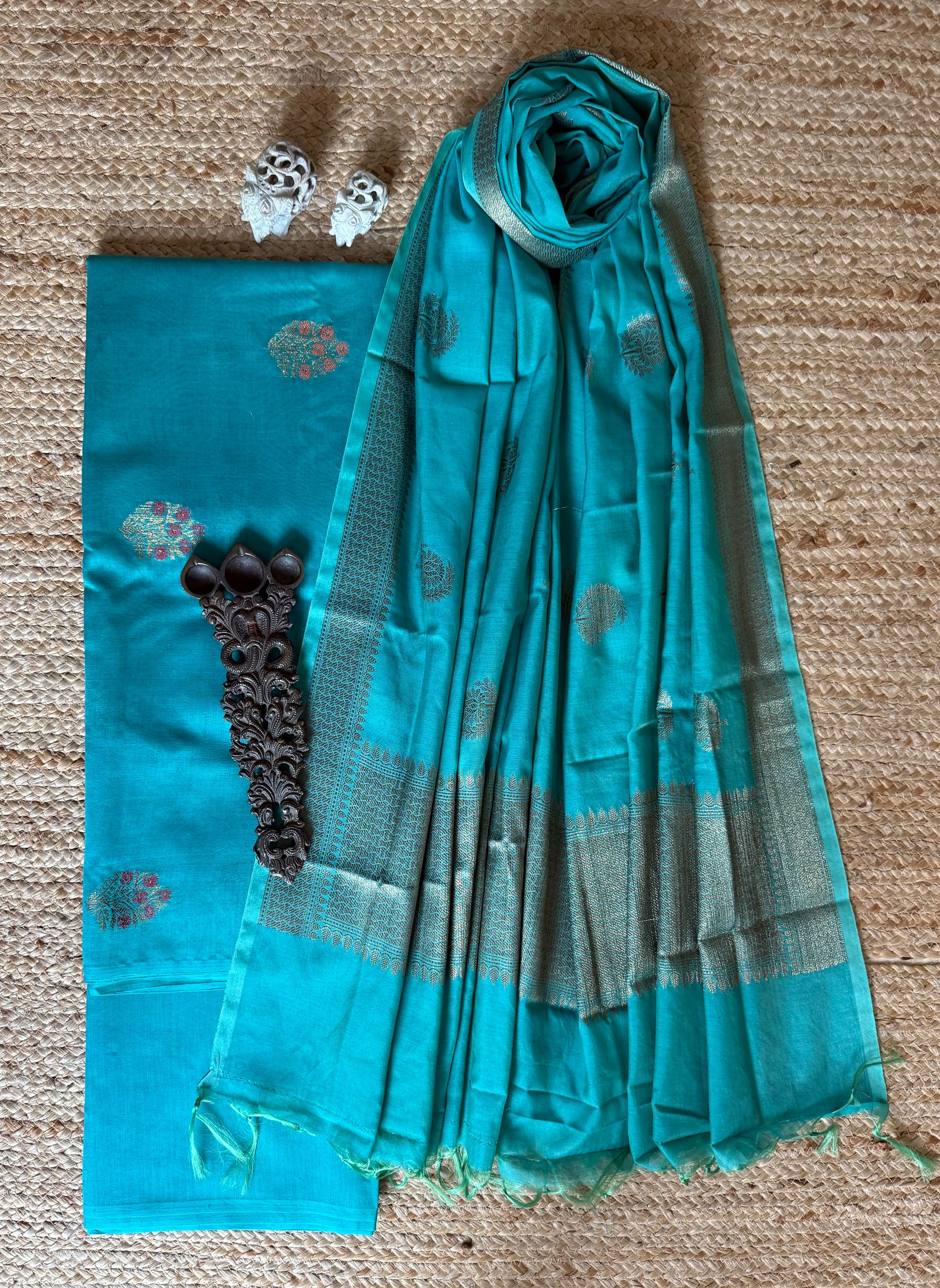 CYAN BLUE CHANDERI HANDLOOM 3 PIECE SUIT SETS The dupatta is CHANDERI with Banarsi border FABRIC: 2.5 MTRS METER BOTTOM:2.5 MTS DUPATTA: 2.5 MTRS * 35'' A SLIGHT DIFFERENCE IN SHADE COULD BE DUE TO THE CAMERA & LIGHTS. EMBRACE THE IMPERFECTION !! HAPPY HANDLOOM DRY CLEAN ONLY |
