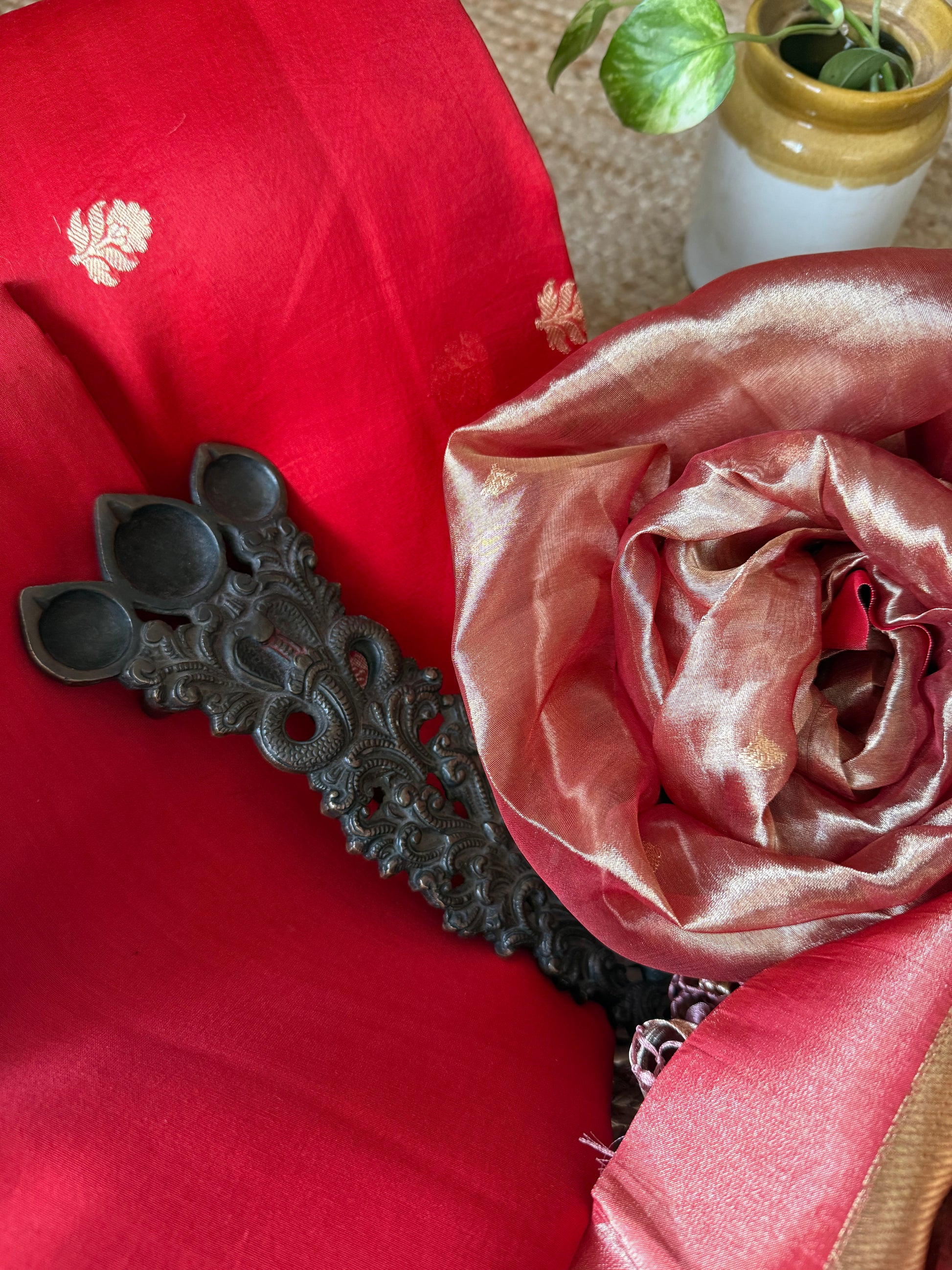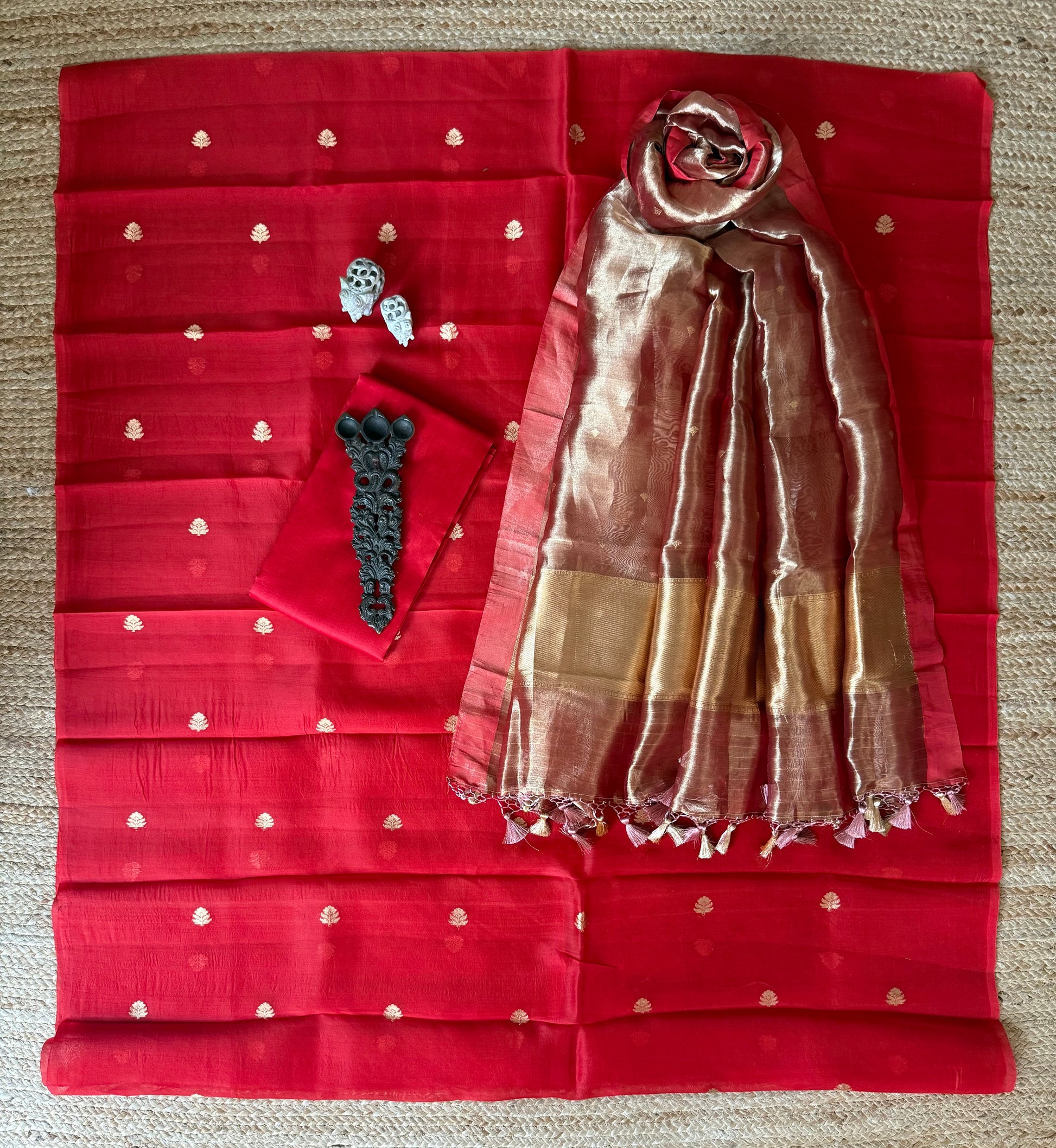 Crimson Red Kora Silk certified handloom Banarsi kadwa booti meenakari 3 piece suit set The dupatta is Kota with Banarsi border FABRIC: 2.5 MTRS METER BOTTOM:2.5 MTS DUPATTA: 2.5 MTRS * 35'' A SLIGHT DIFFERENCE IN SHADE COULD BE DUE TO THE CAMERA & LIGHTS. EMBRACE THE IMPERFECTION !! HAPPY HANDLOOM DRY CLEAN ONLY |