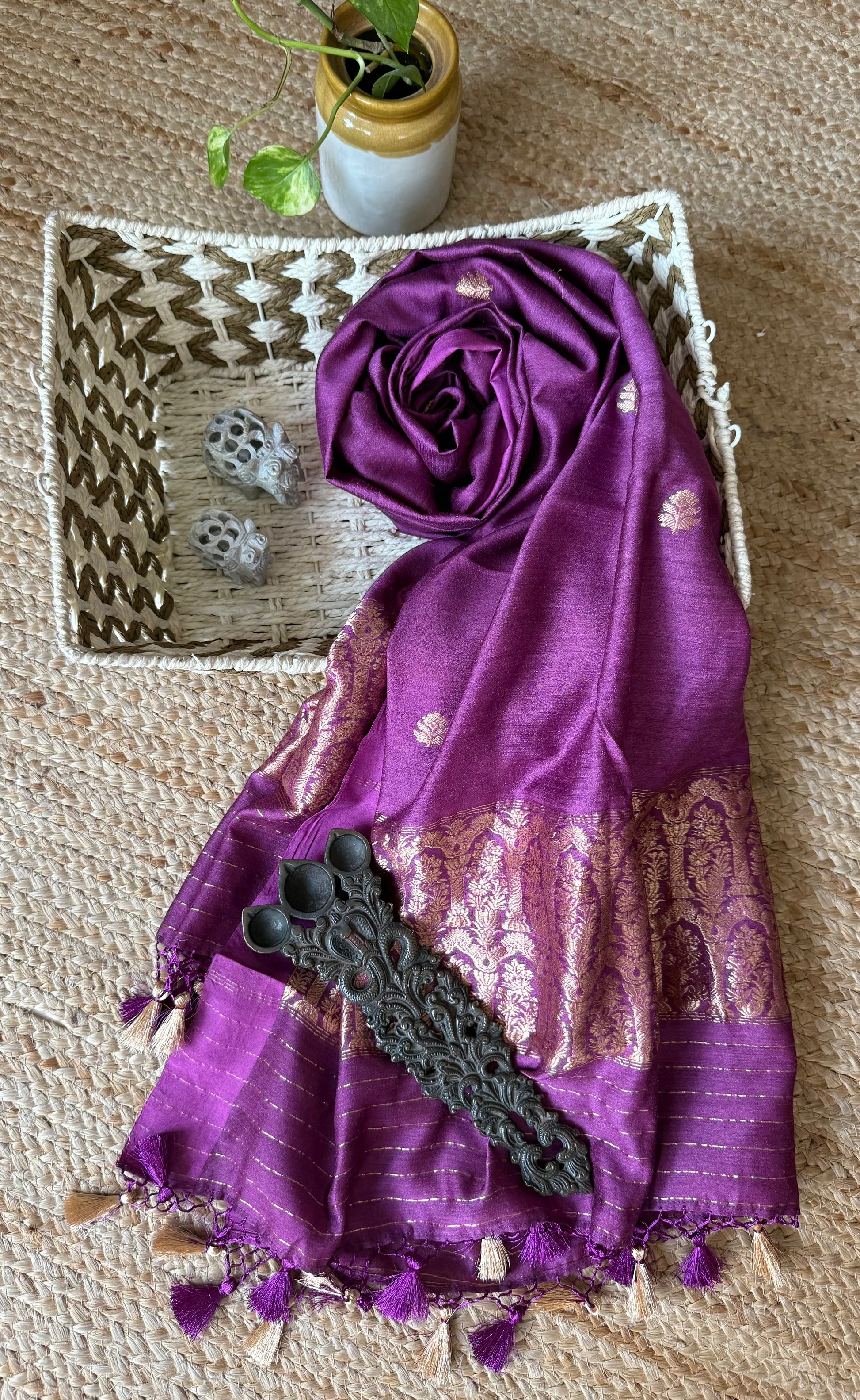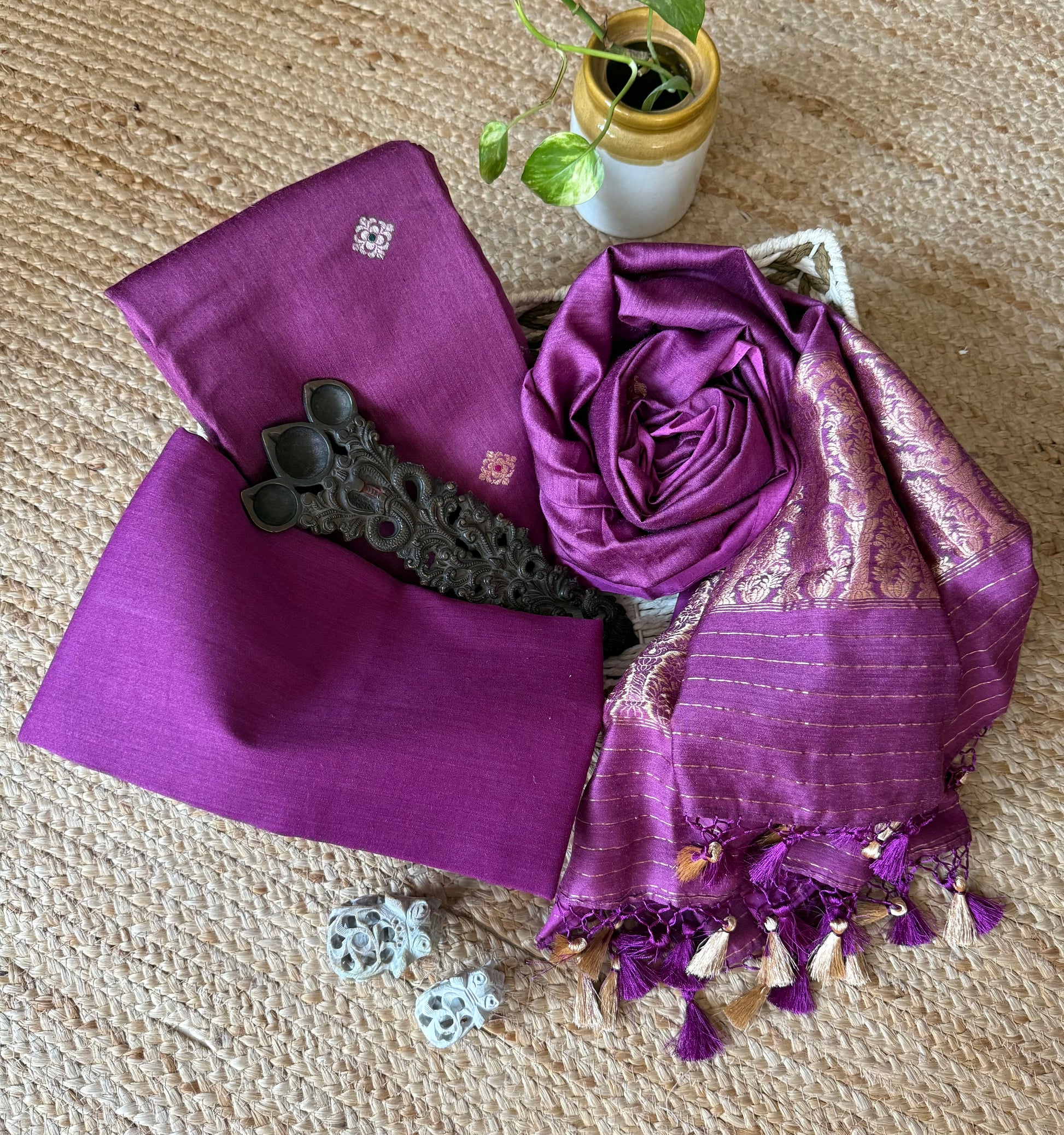 Purple Munga Silk certified handloom Banarsi kadwa booti meenakari 3 piece suit set The dupatta is Kota with Banarsi border FABRIC: 2.5 MTRS METER BOTTOM:2.5 MTS DUPATTA: 2.5 MTRS * 35'' A SLIGHT DIFFERENCE IN SHADE COULD BE DUE TO THE CAMERA & LIGHTS. EMBRACE THE IMPERFECTION !! HAPPY HANDLOOM DRY CLEAN ONLY |