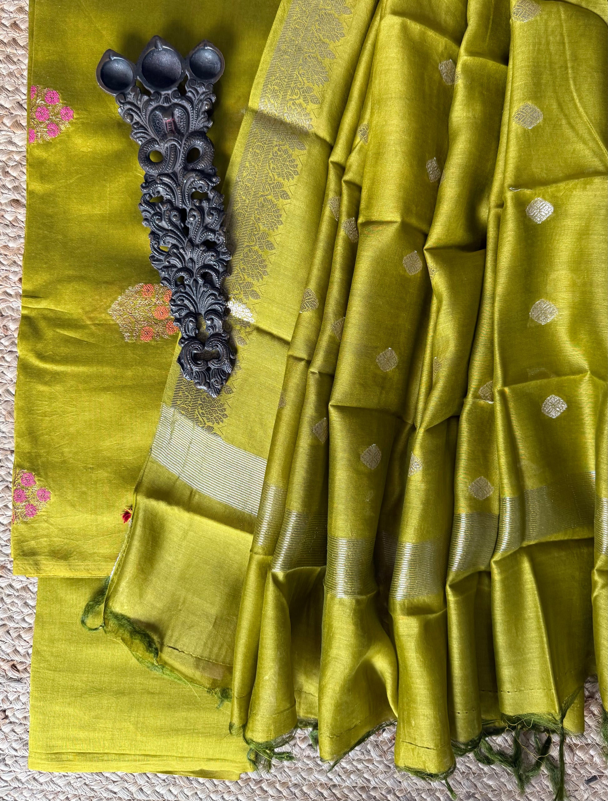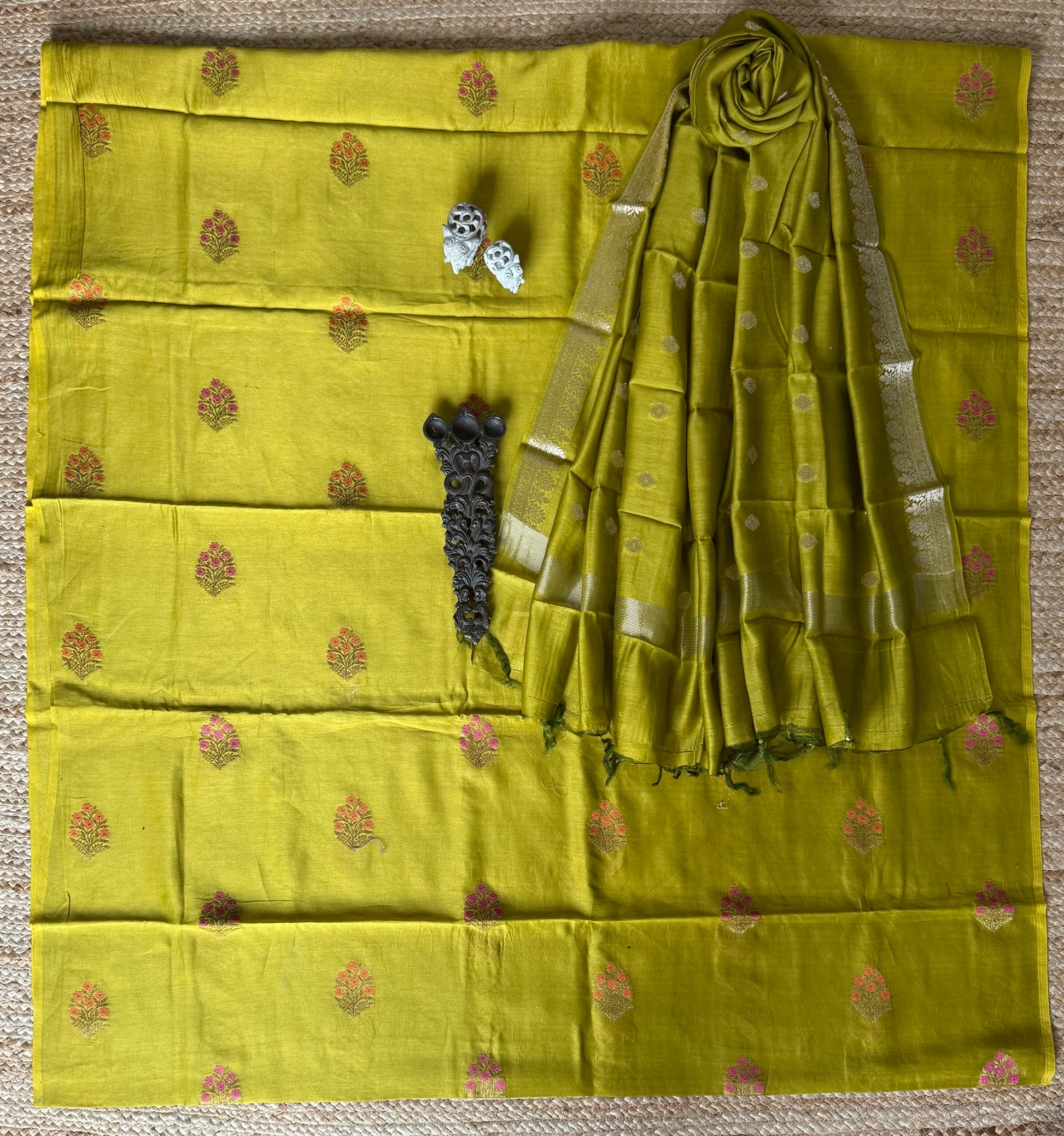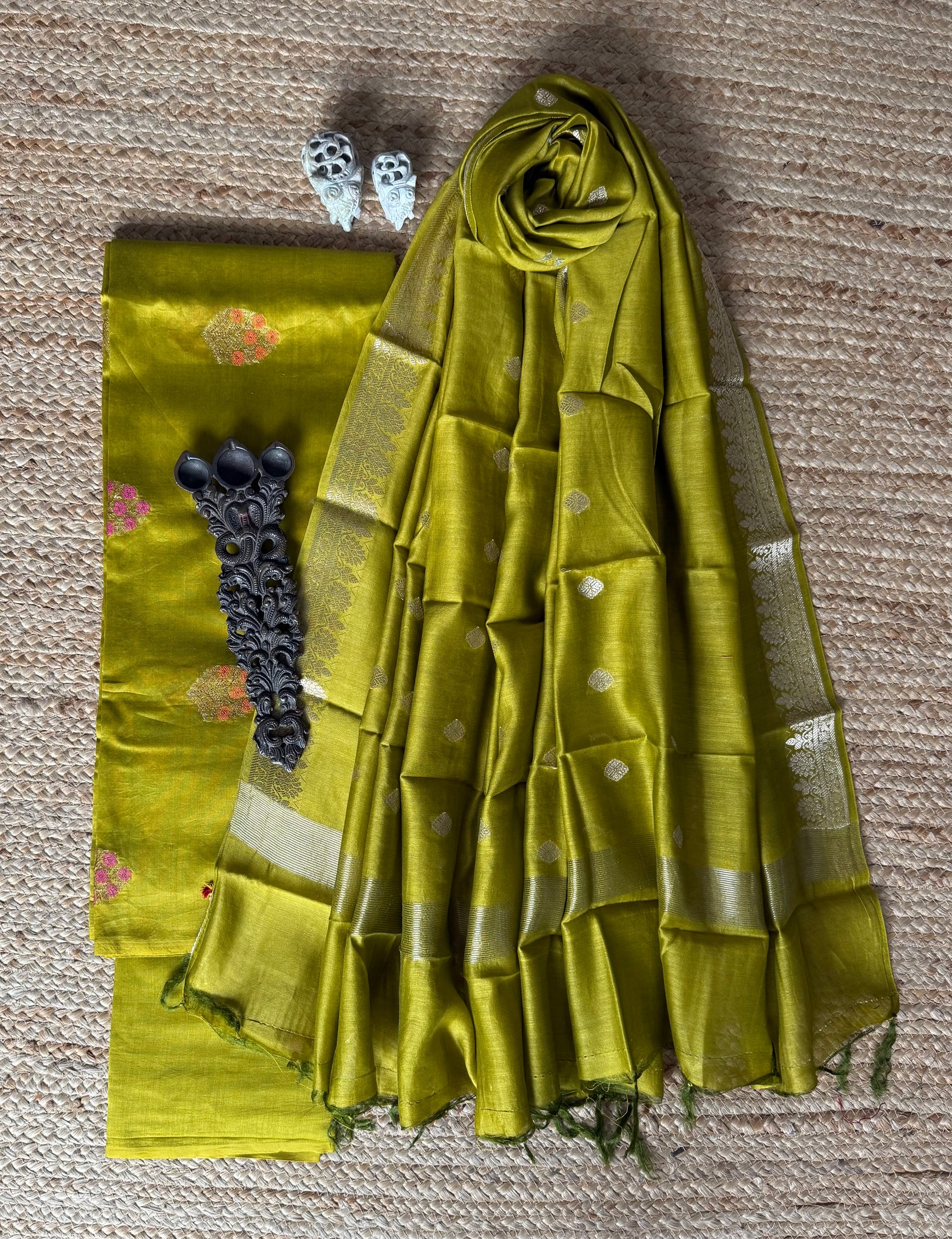 MEHENDI GREEN CHANDERI HANDLOOM 3 PIECES SUIT SET The dupatta is CHANDERI with Banarsi border FABRIC: 2.5 MTRS METER BOTTOM:2.5 MTS DUPATTA: 2.5 MTRS * 35'' A SLIGHT DIFFERENCE IN SHADE COULD BE DUE TO THE CAMERA & LIGHTS. EMBRACE THE IMPERFECTION !! HAPPY HANDLOOM DRY CLEAN ONLY |