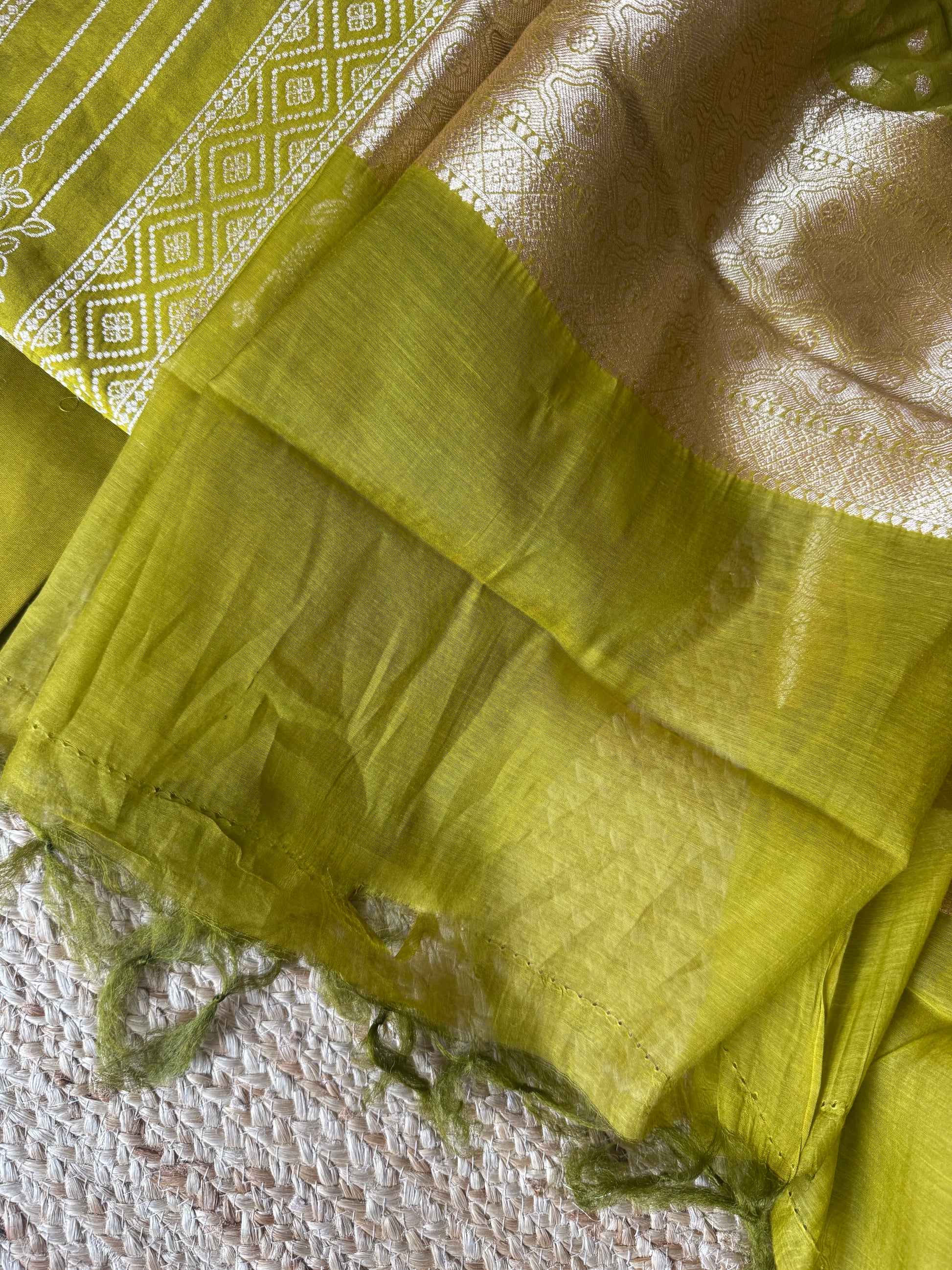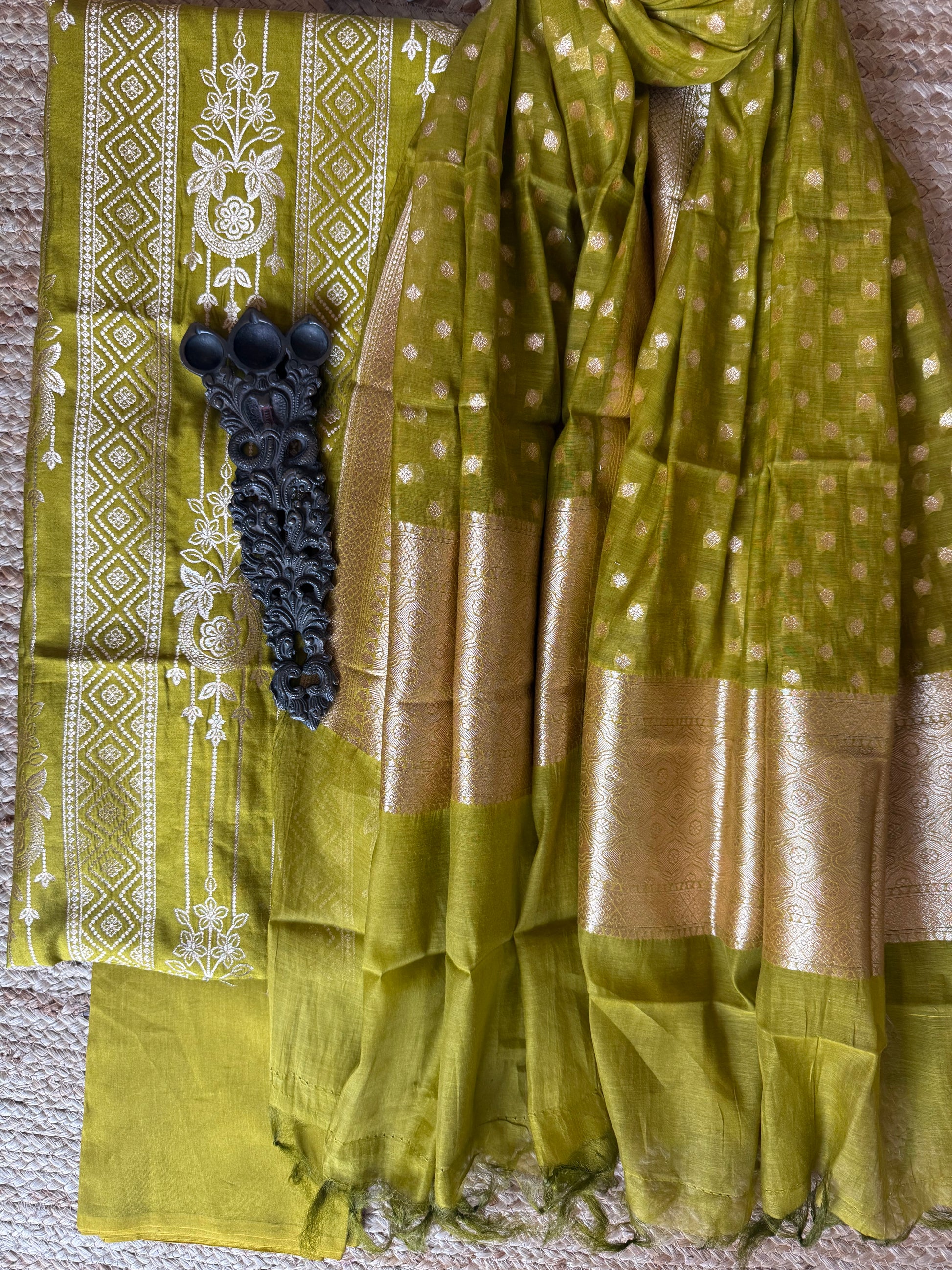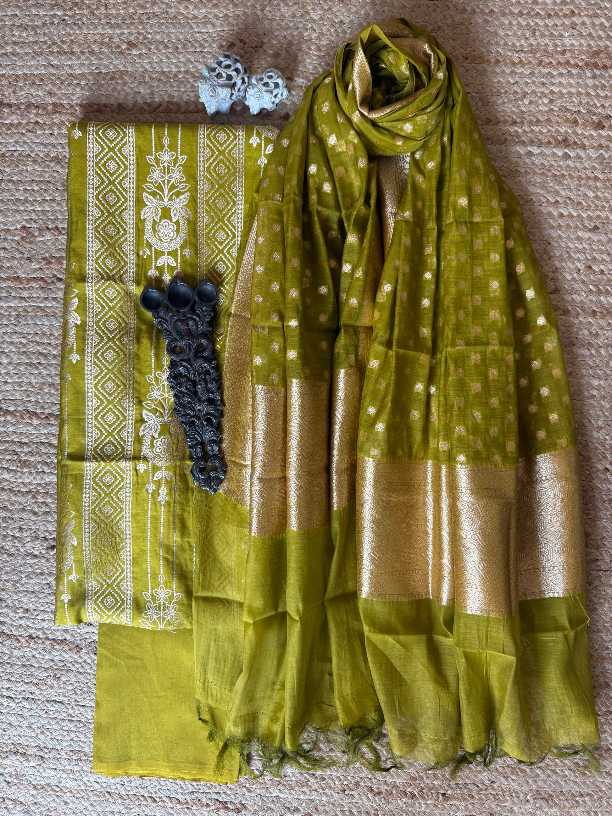 Mehendi Green Chinia Silk certified handloom 3 piece suit set The dupatta is Kota with Banarsi border FABRIC: 2.5 MTRS METER BOTTOM:2.5 MTS DUPATTA: 2.5 MTRS * 35'' A SLIGHT DIFFERENCE IN SHADE COULD BE DUE TO THE CAMERA & LIGHTS. EMBRACE THE IMPERFECTION !! HAPPY HANDLOOM DRY CLEAN ONLY |