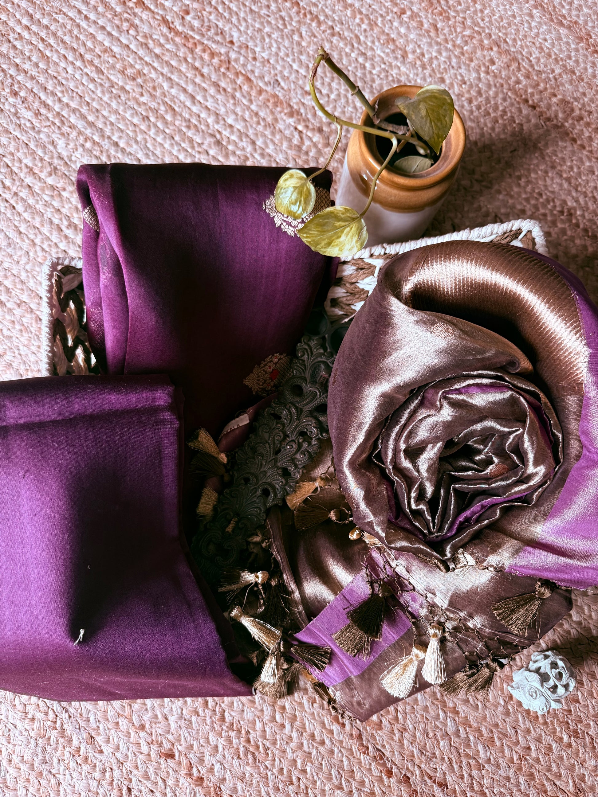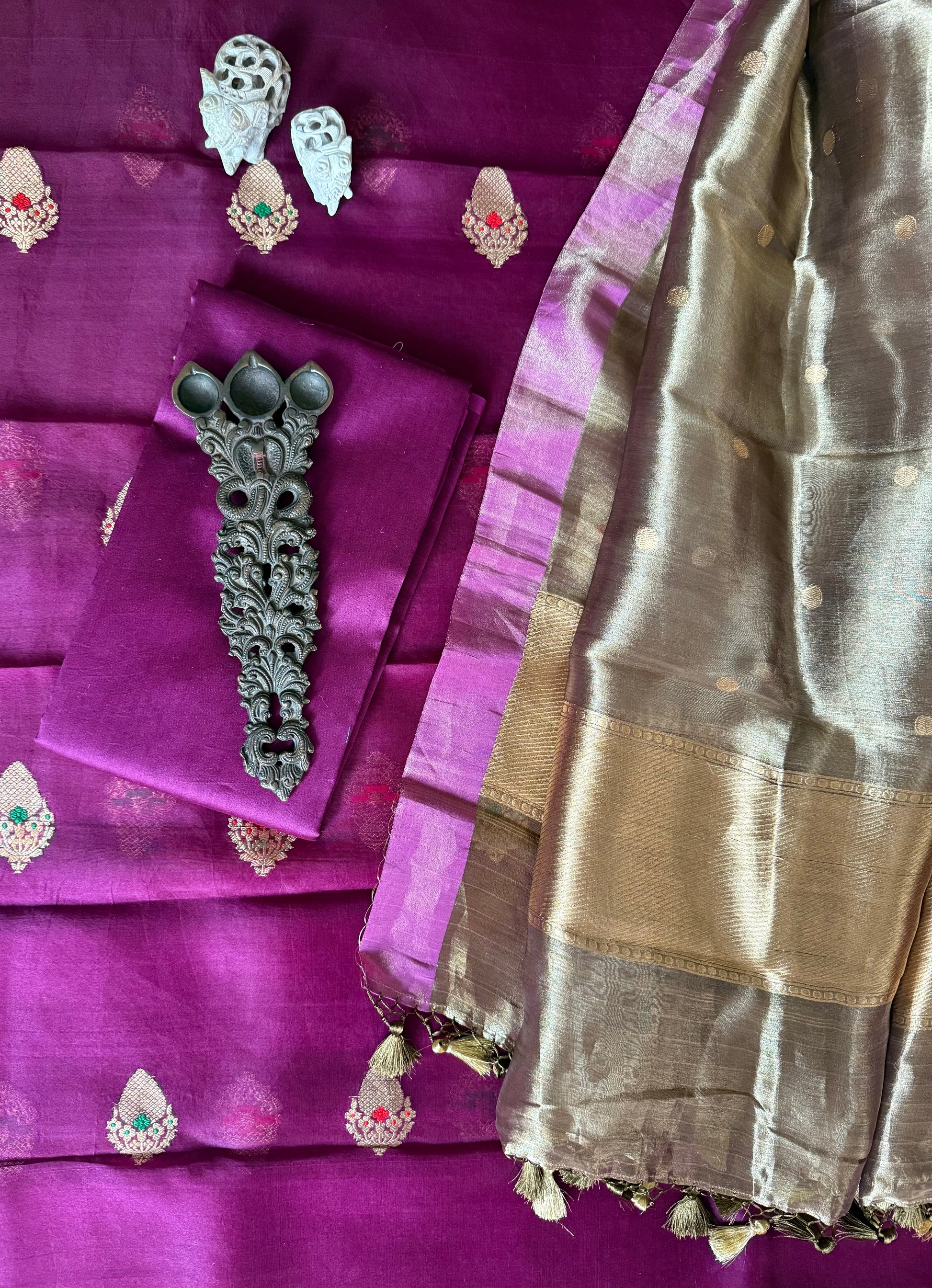 Midnight Purple Kora Silk certified handloom Banarsi kadwa booti meenakari 3 piece suit set The dupatta is Kota with Banarsi border FABRIC: 2.5 MTRS METER BOTTOM:2.5 MTS DUPATTA: 2.5 MTRS * 35'' A SLIGHT DIFFERENCE IN SHADE COULD BE DUE TO THE CAMERA & LIGHTS. EMBRACE THE IMPERFECTION !! HAPPY HANDLOOM DRY CLEAN ONLY |