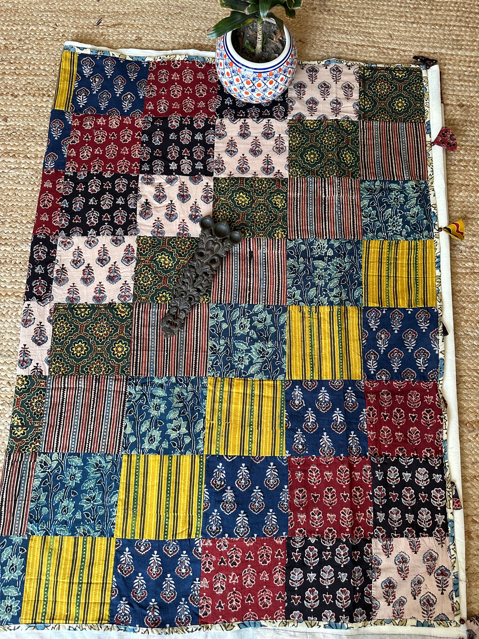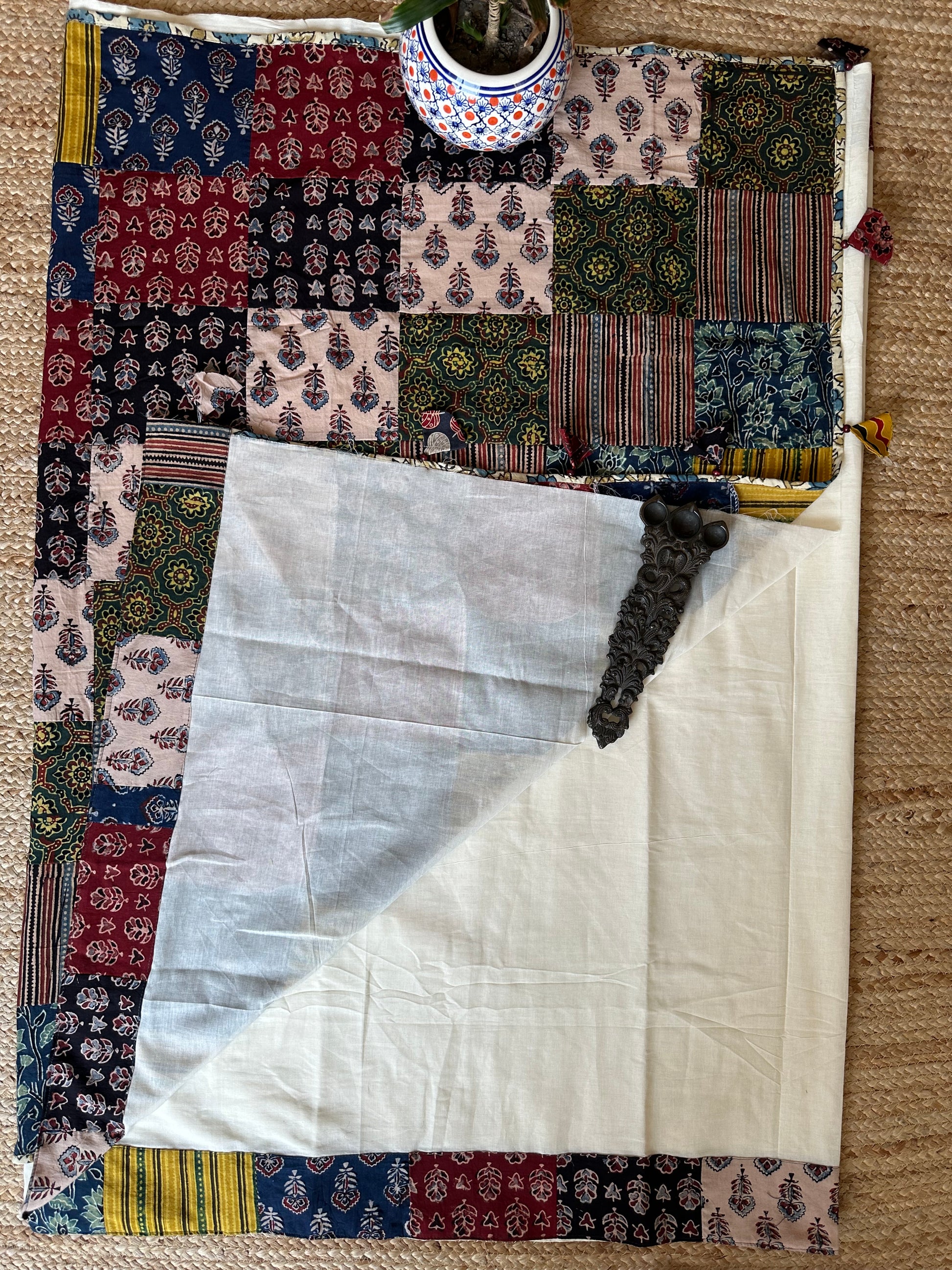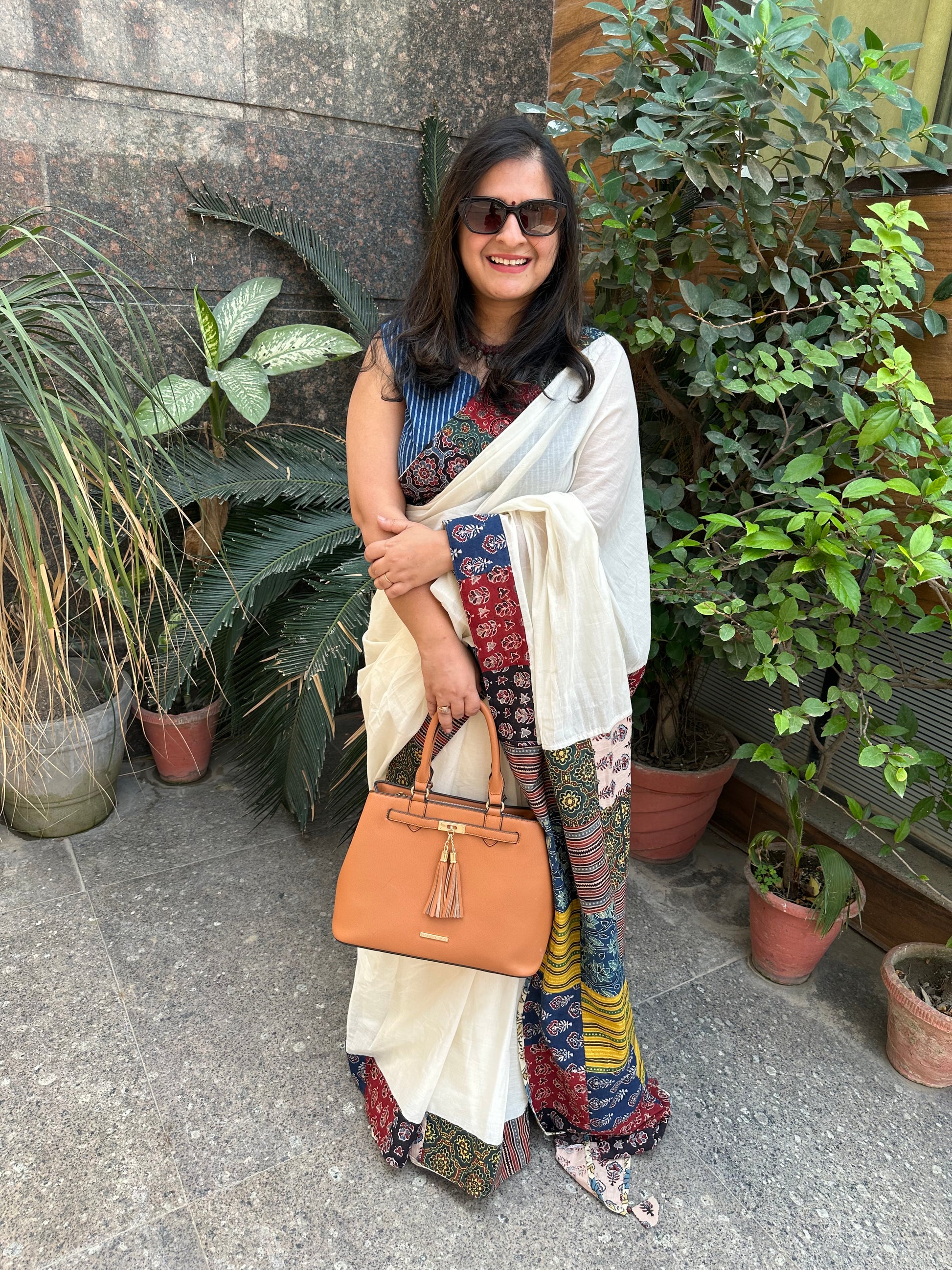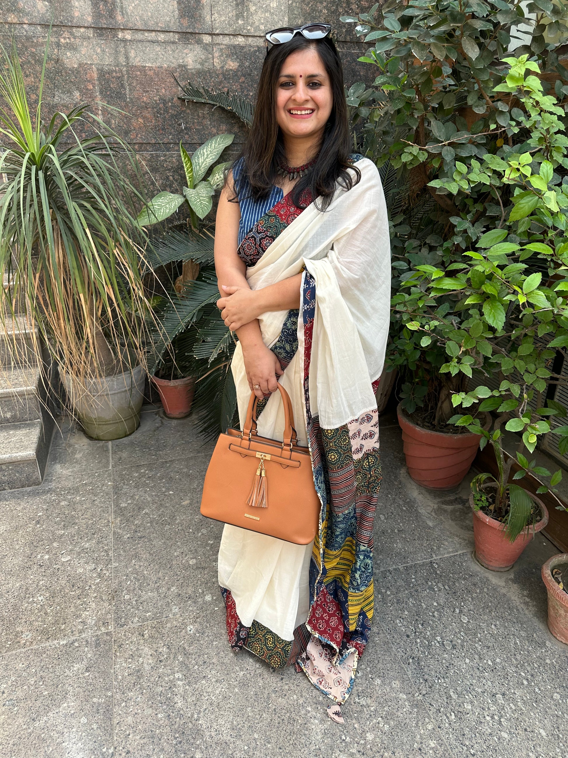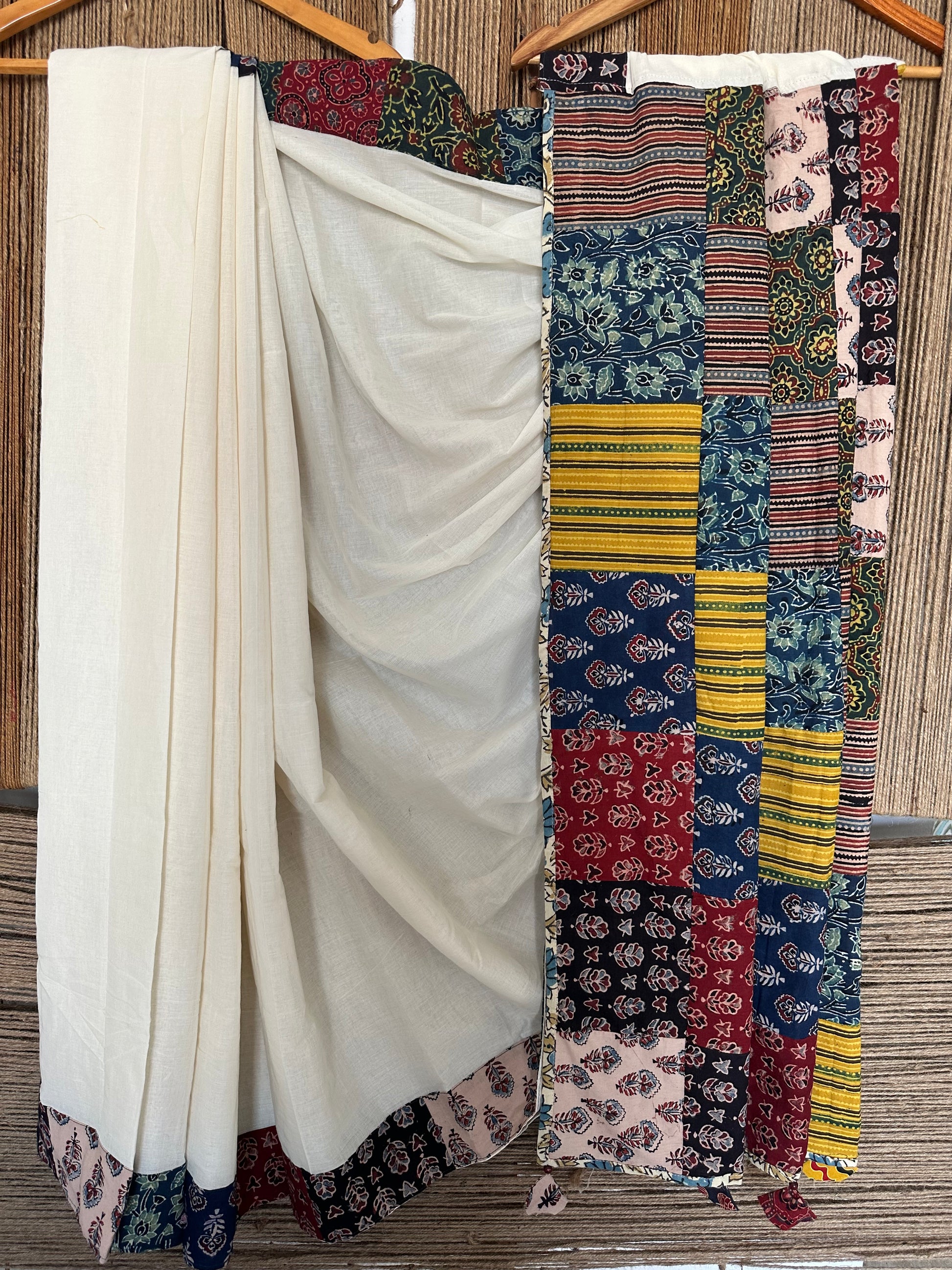 WHITE PATCH WORK AJRAKH HAND CRAFTED MULL SAREE