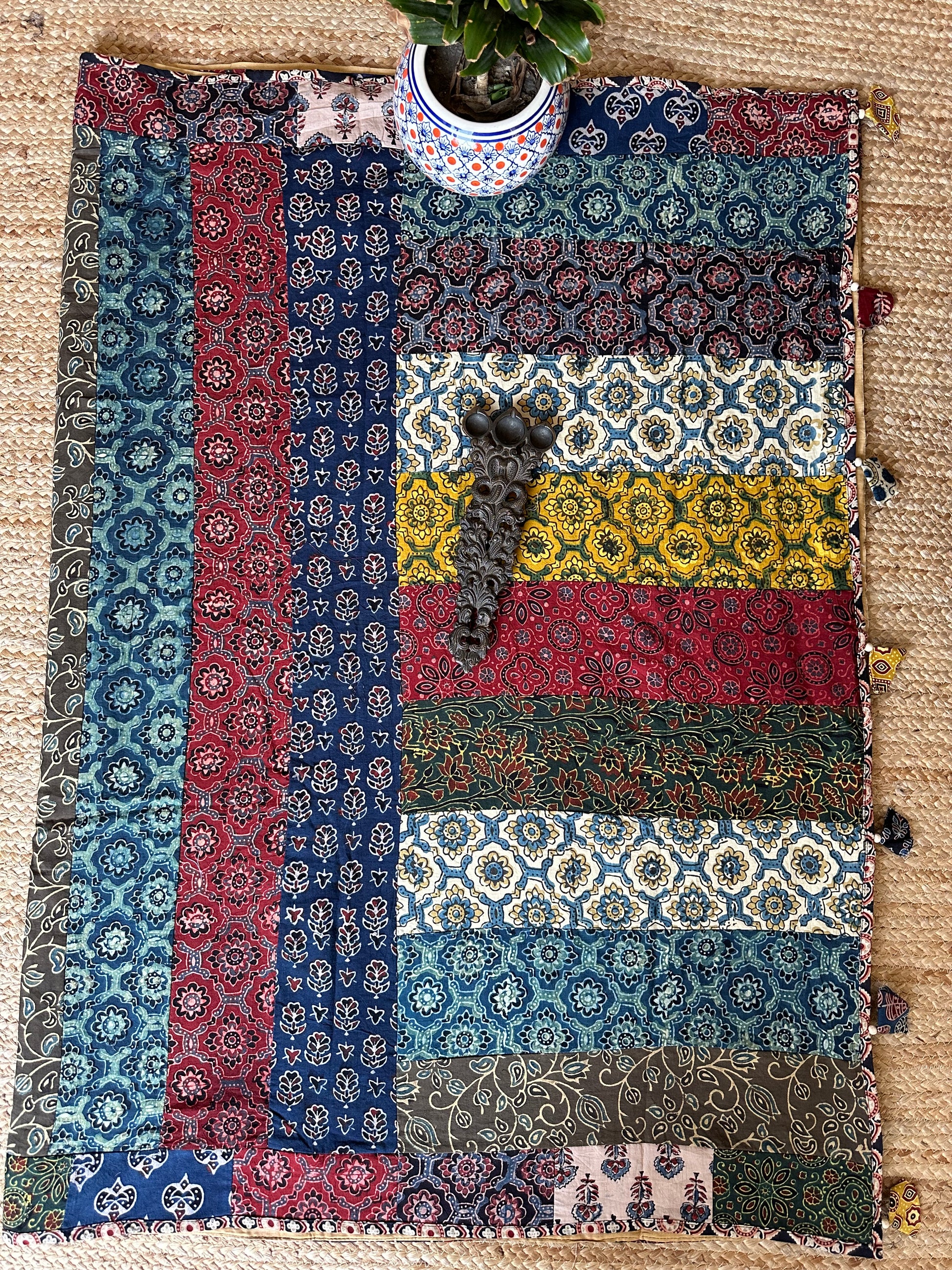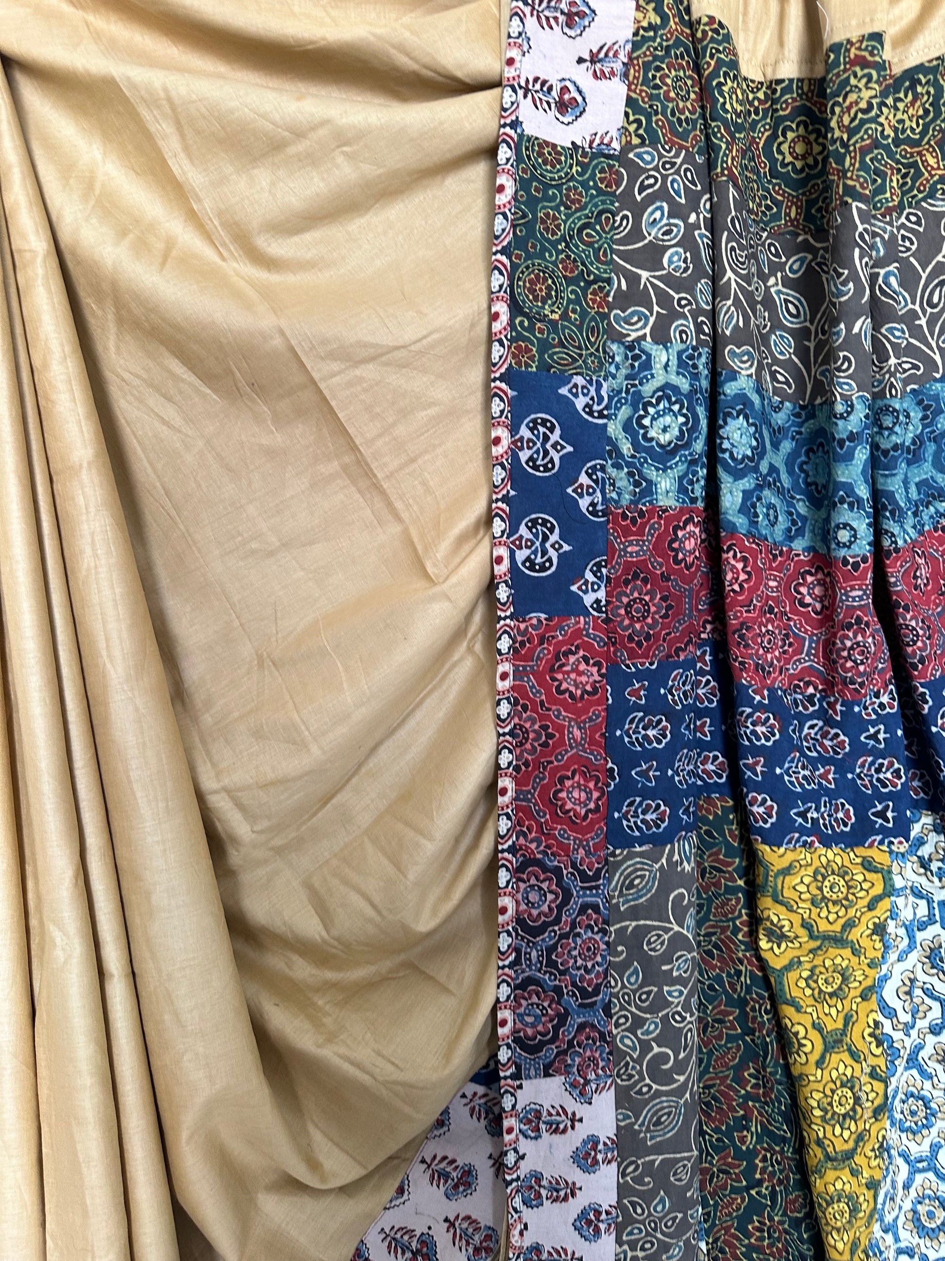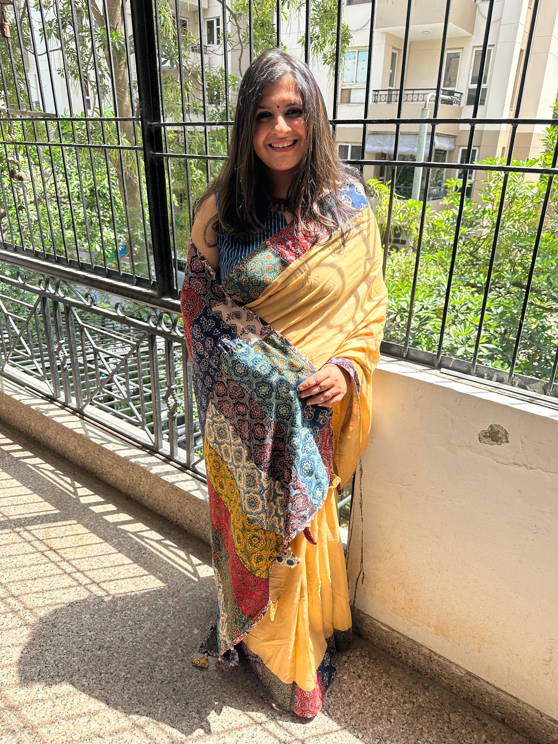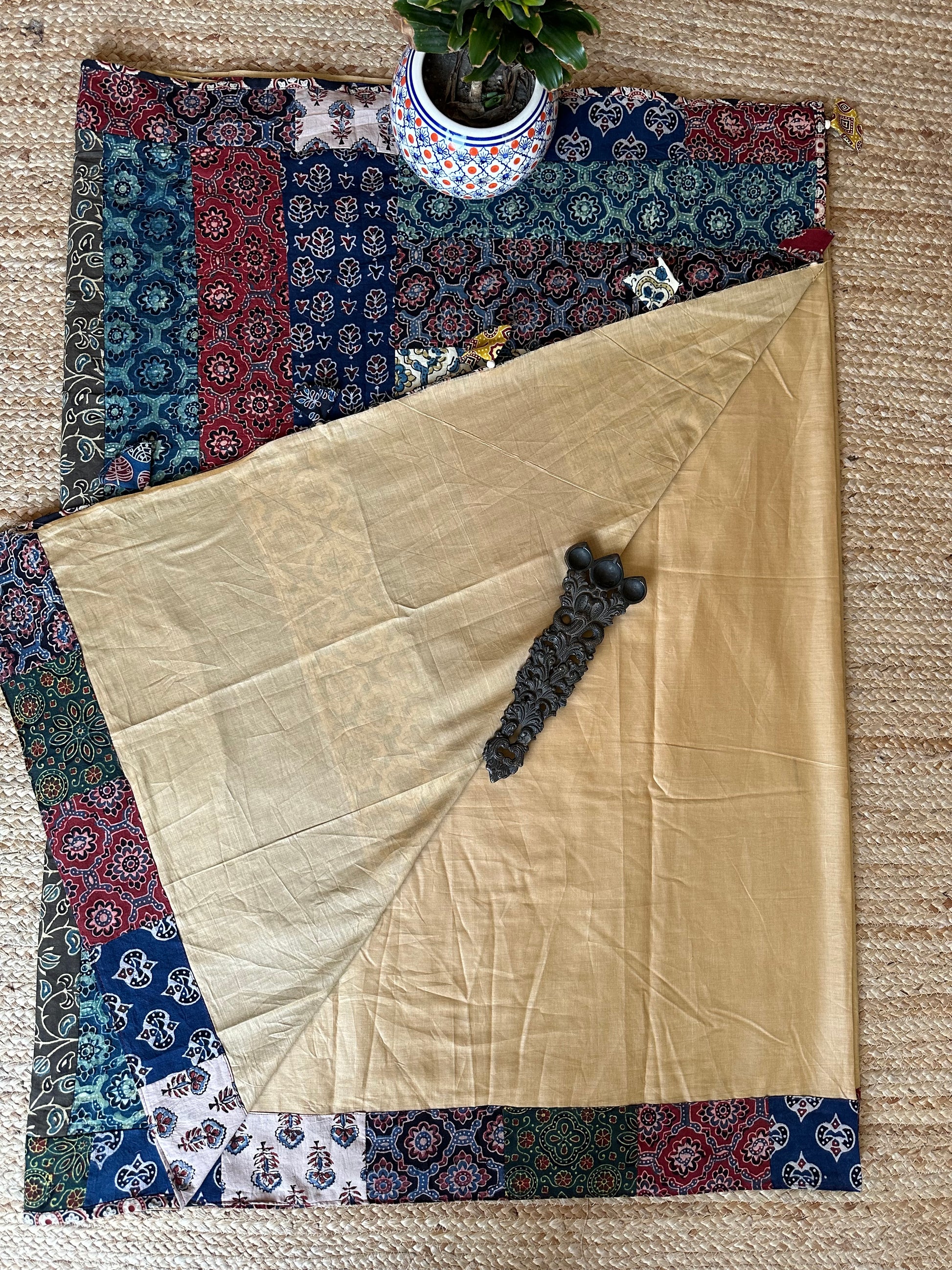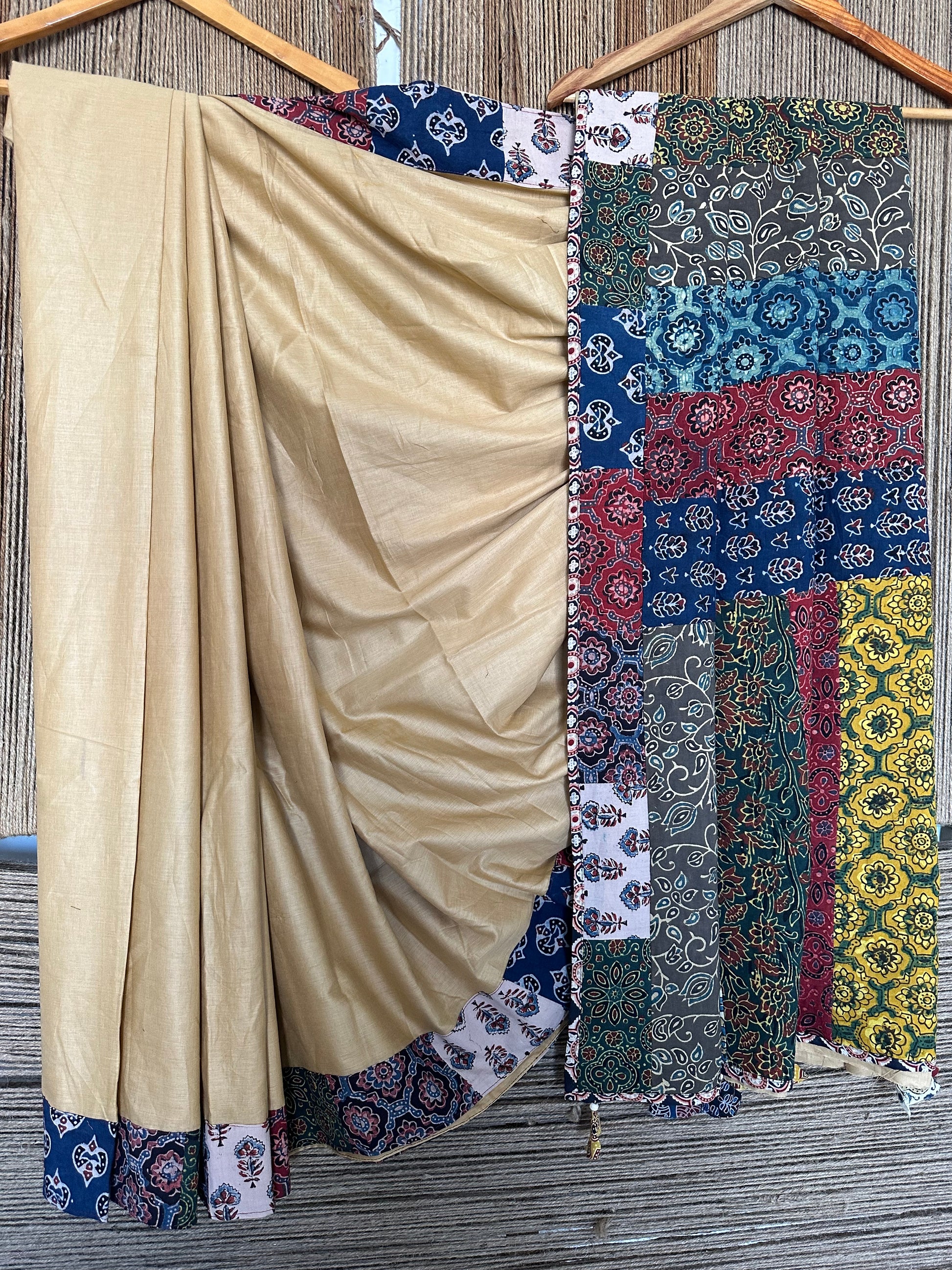 TAN BROWN PATCH WORK AJRAKH HAND CRAFTED MULL SAREE