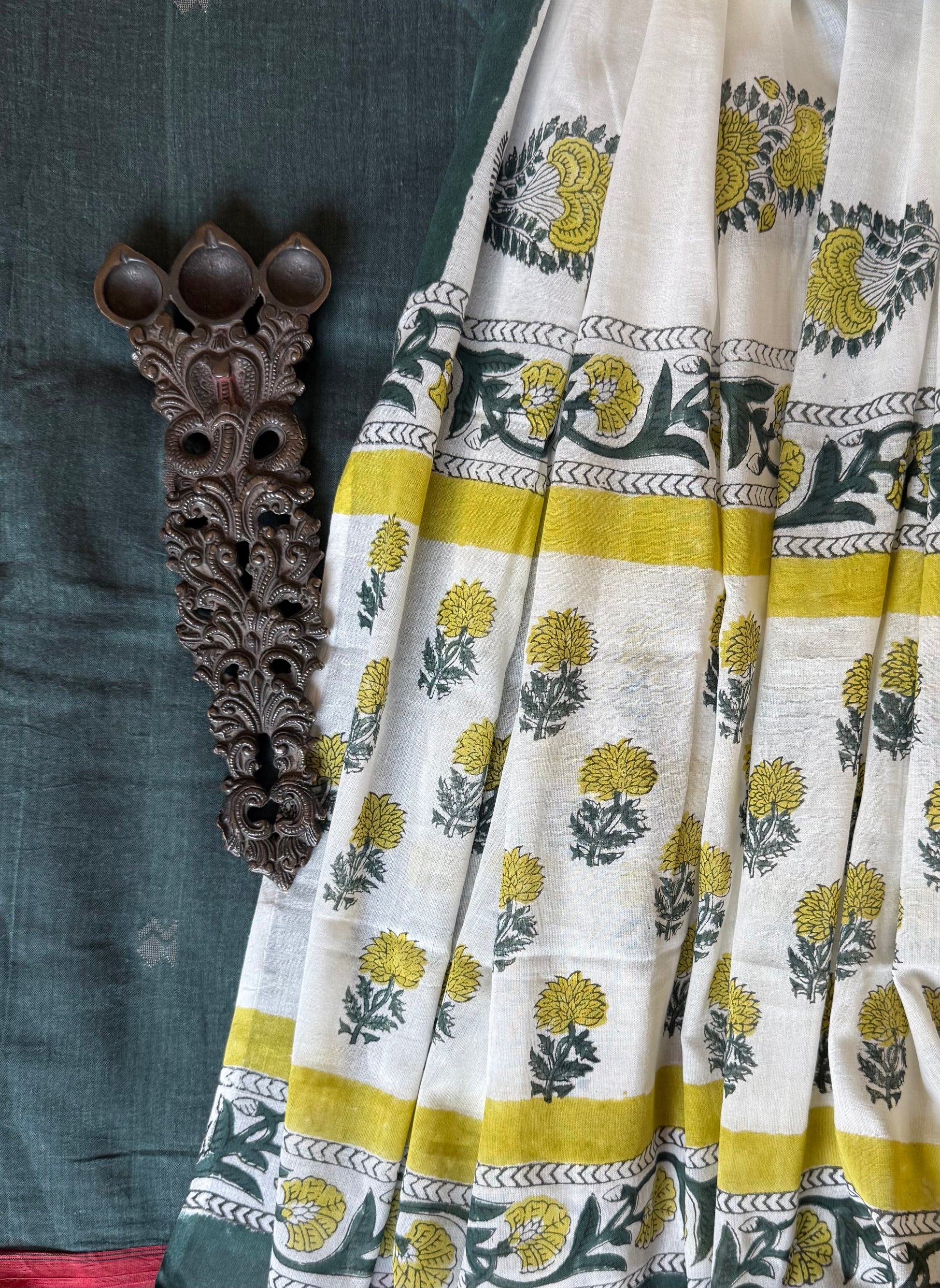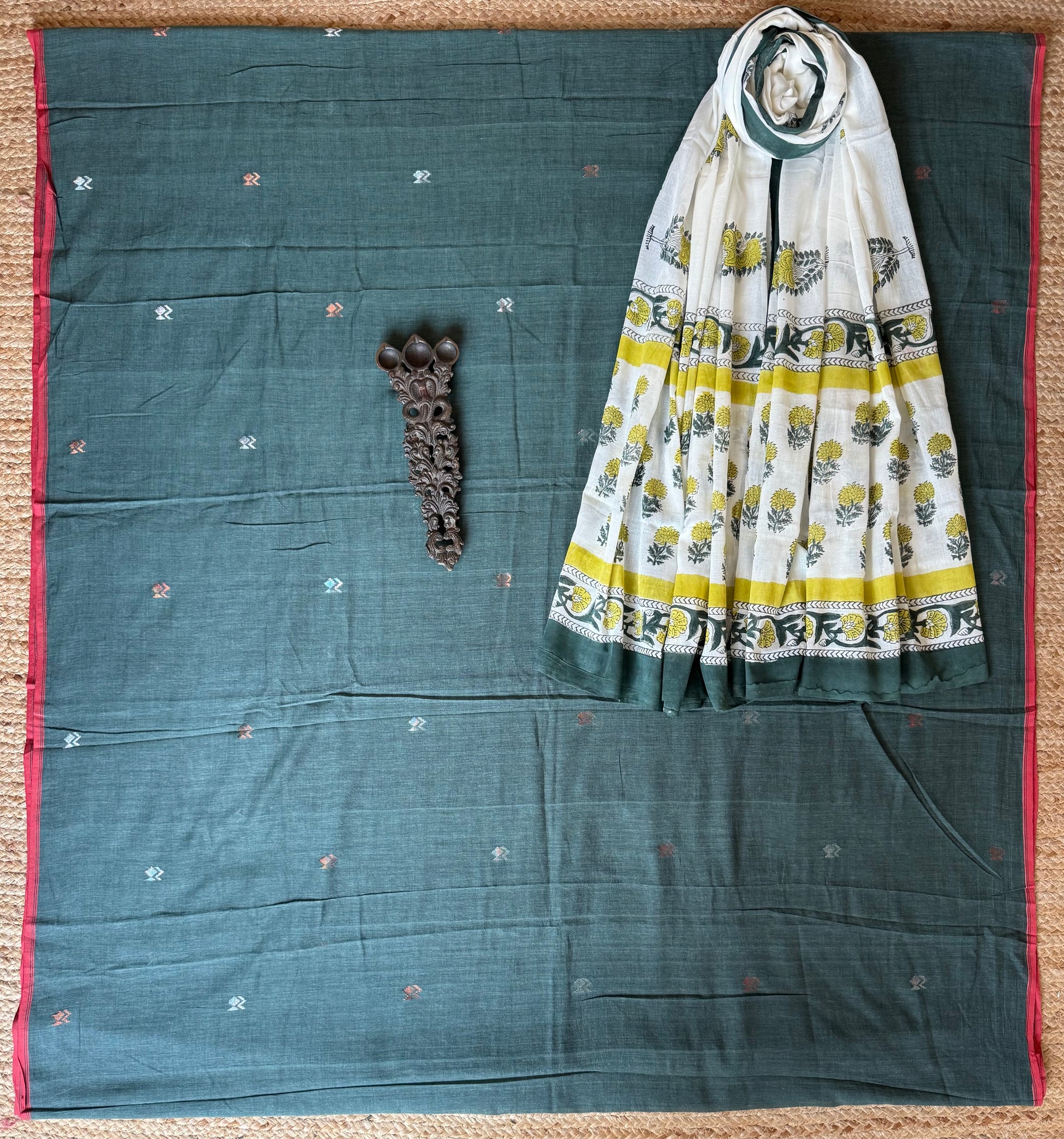 MYRTLE GREEN JAMDANI  HAND WOVEN MULL COTTON KURTA BLOCK PRINT COTTON DUPATTA