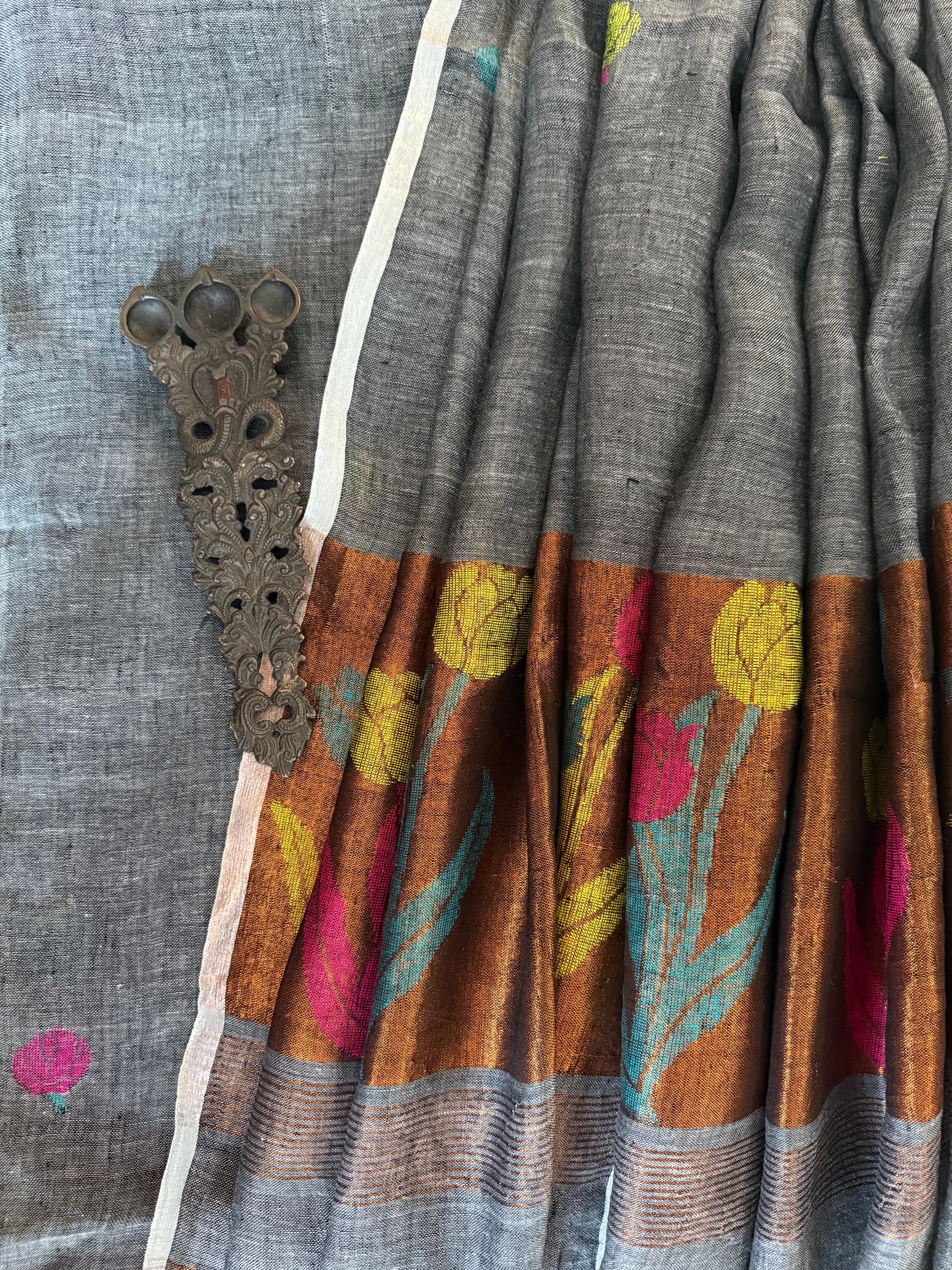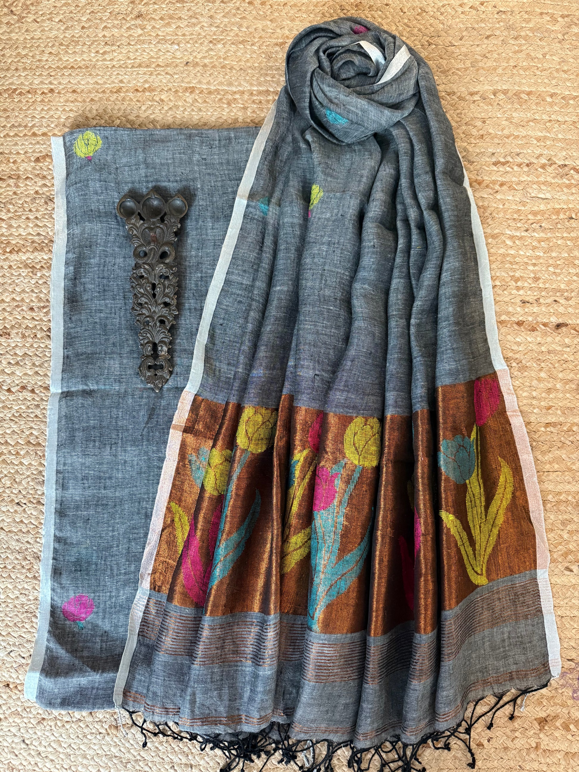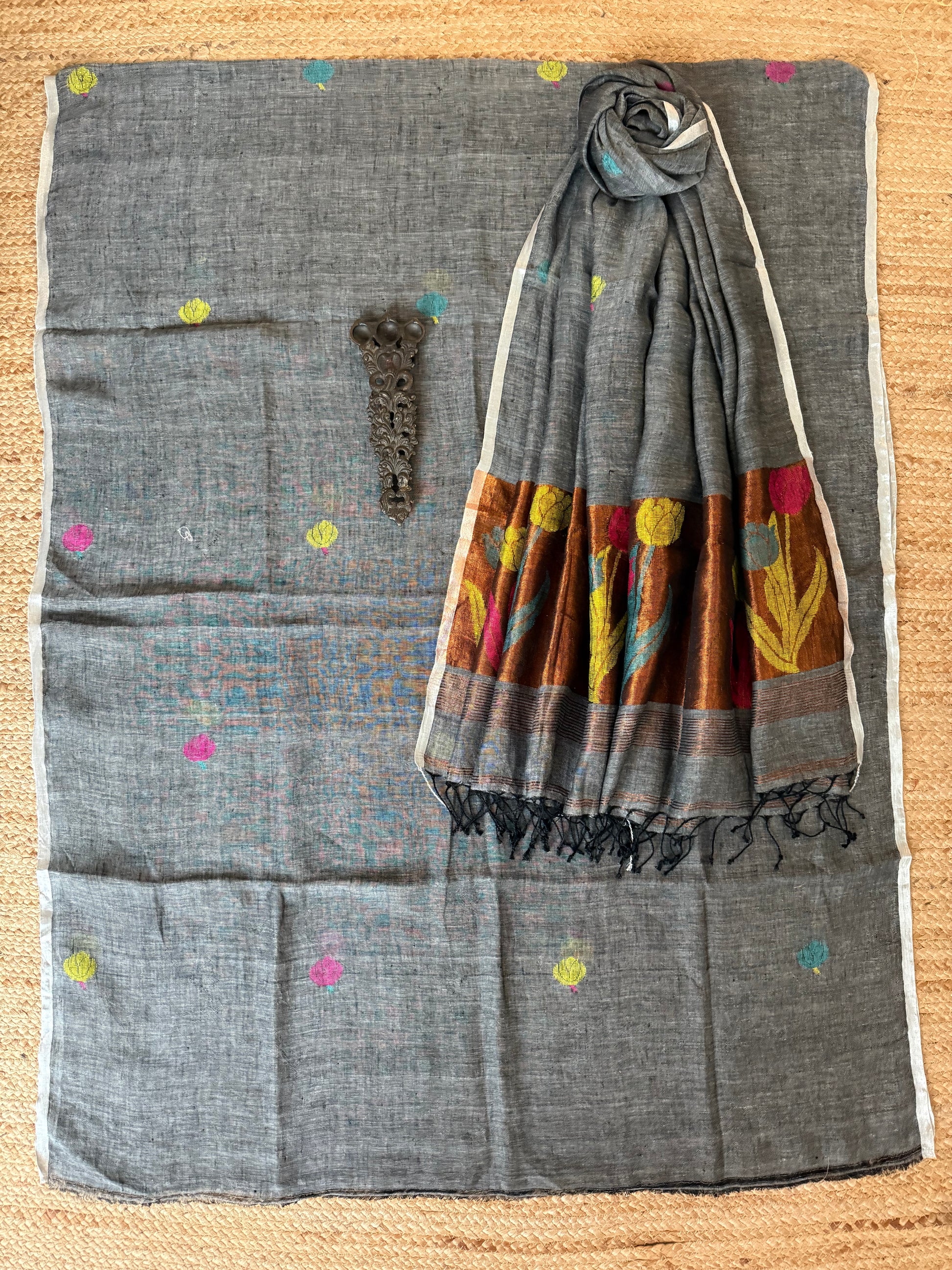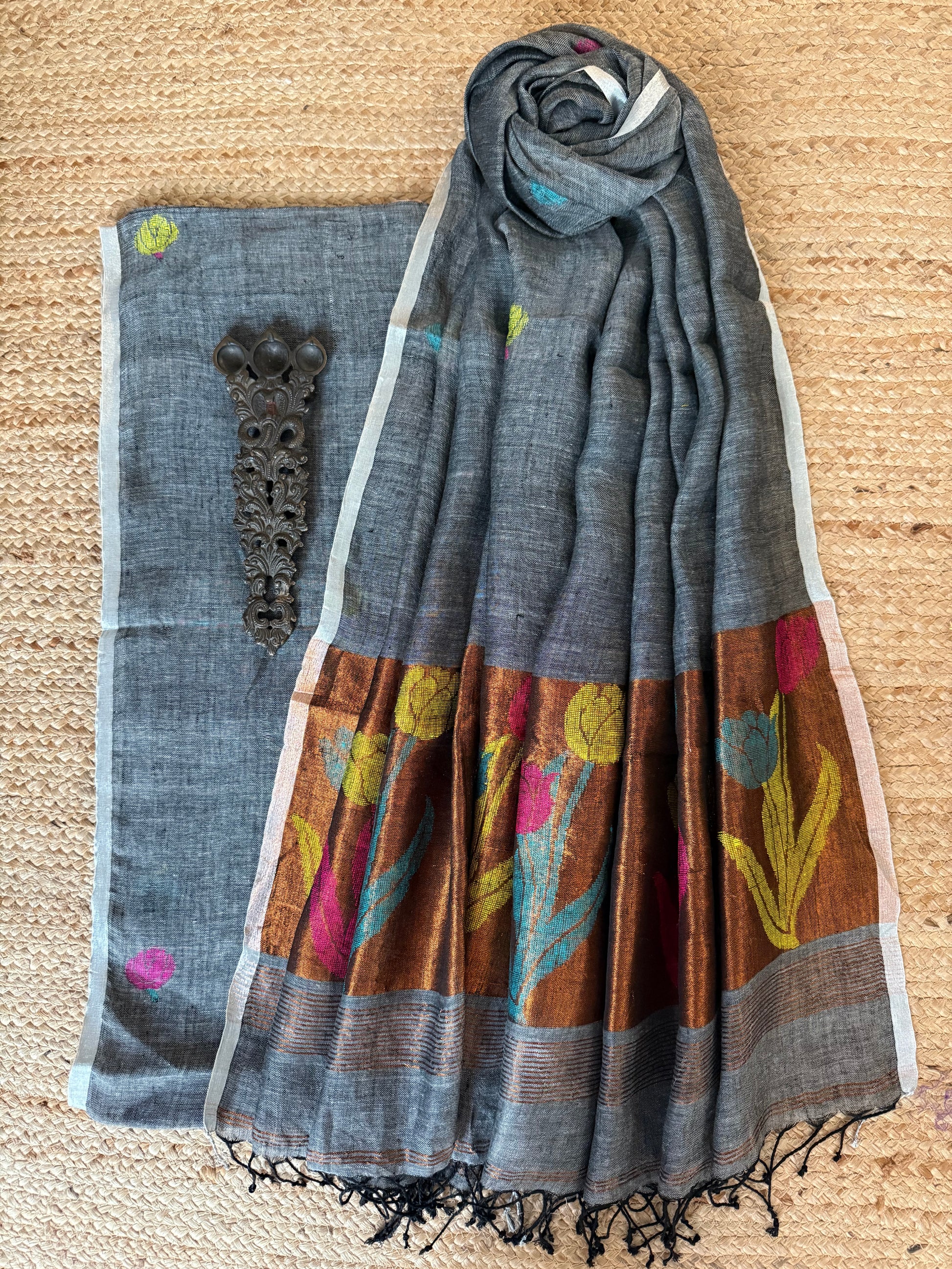 | IRON GRAY JAMDANI WOVEN LINEN KURTA SET WITH HAND EMBROIDERY JAMDANI DUPATTA