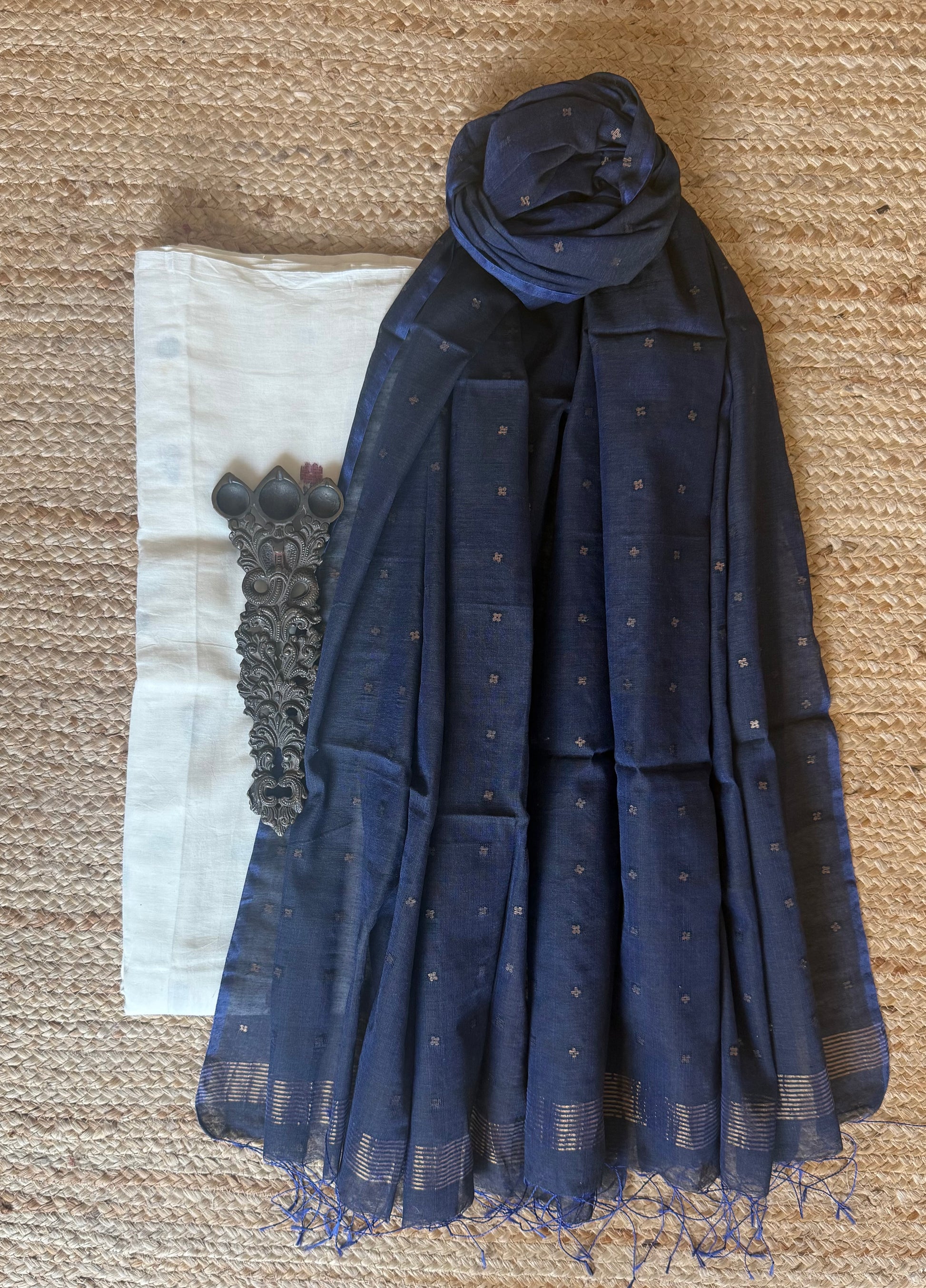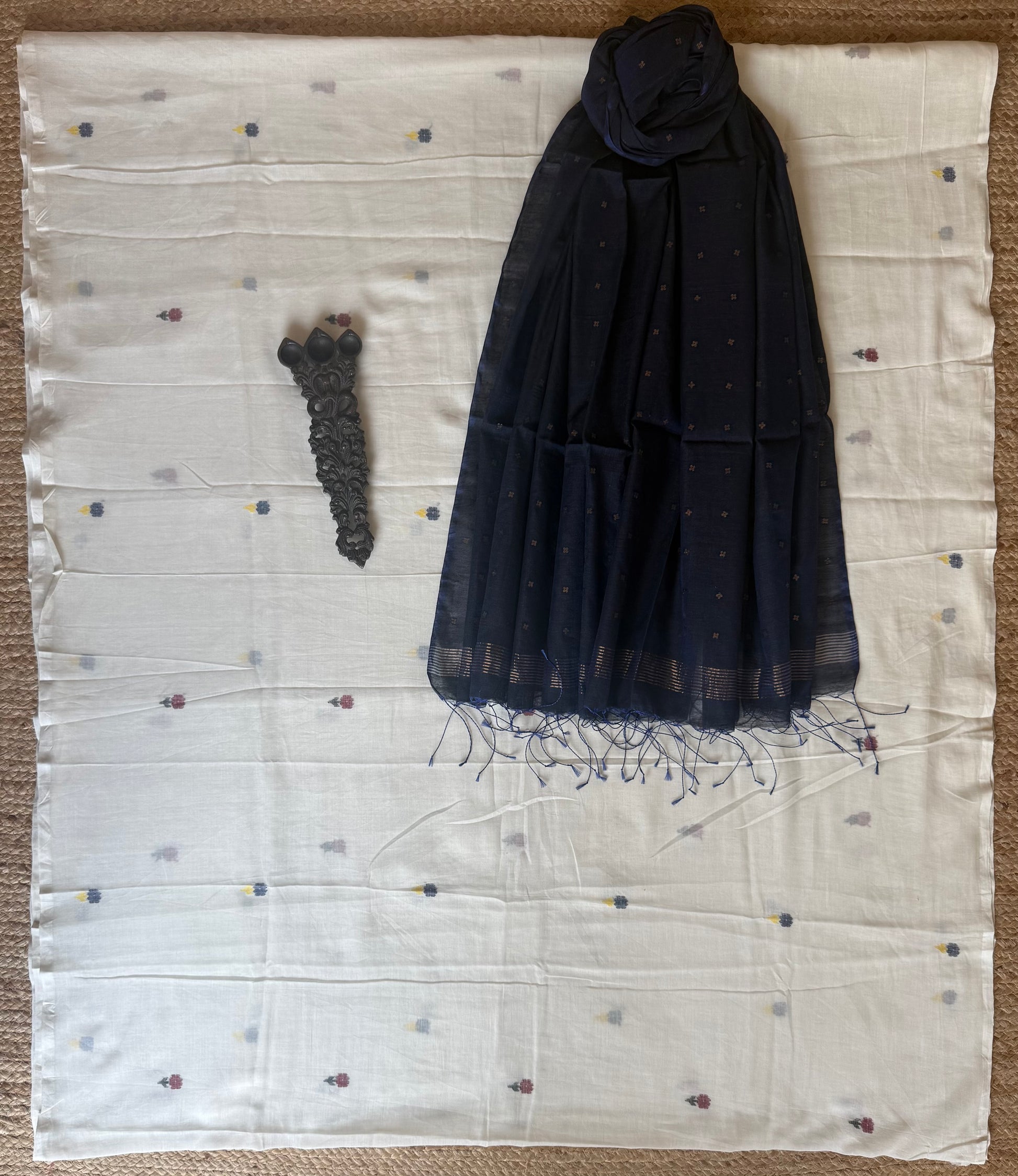 WHITE HAND WOVEN JAMDANI MULL COTTON KURTA WITH SEQUENCE DUPATTA