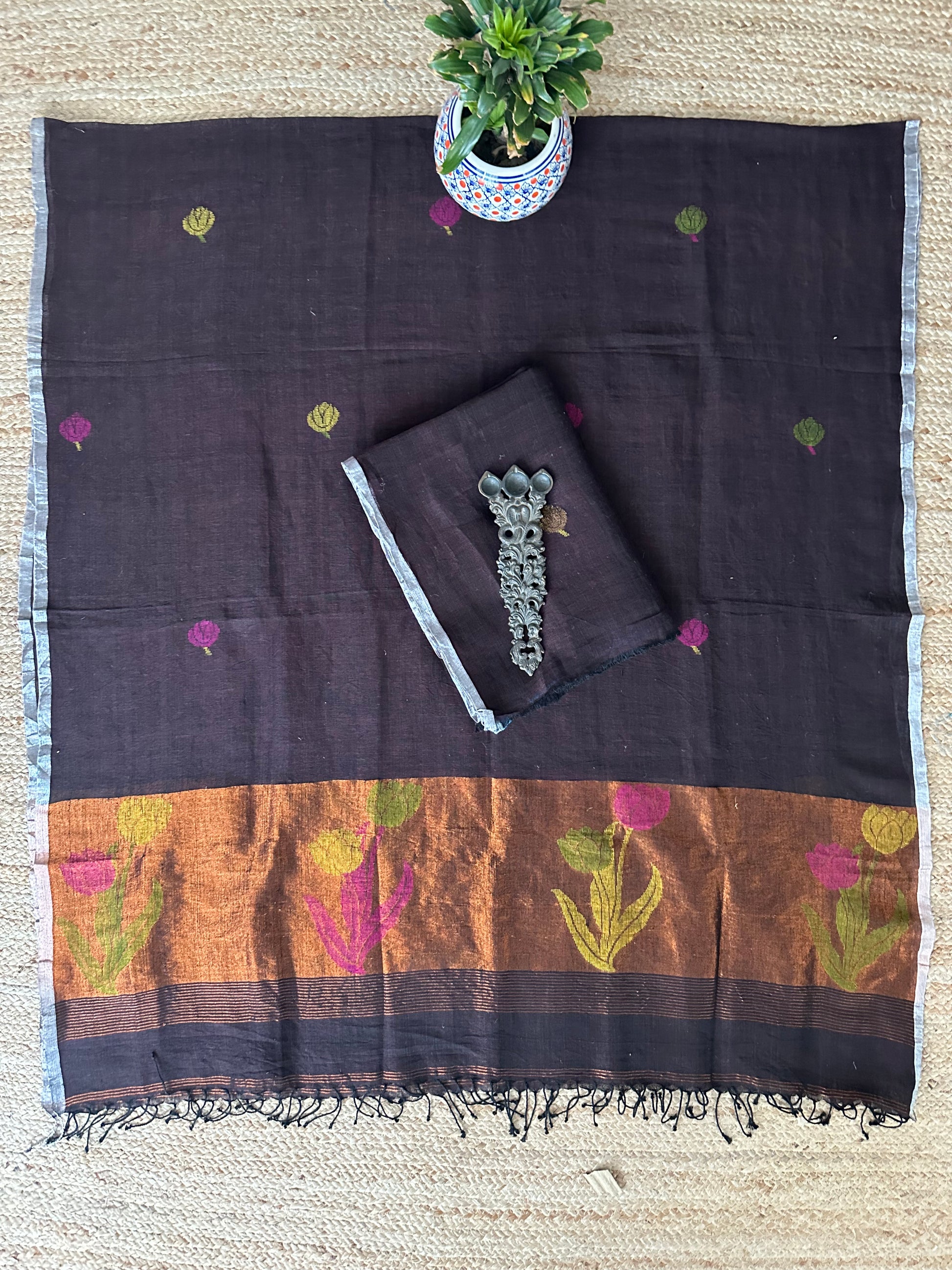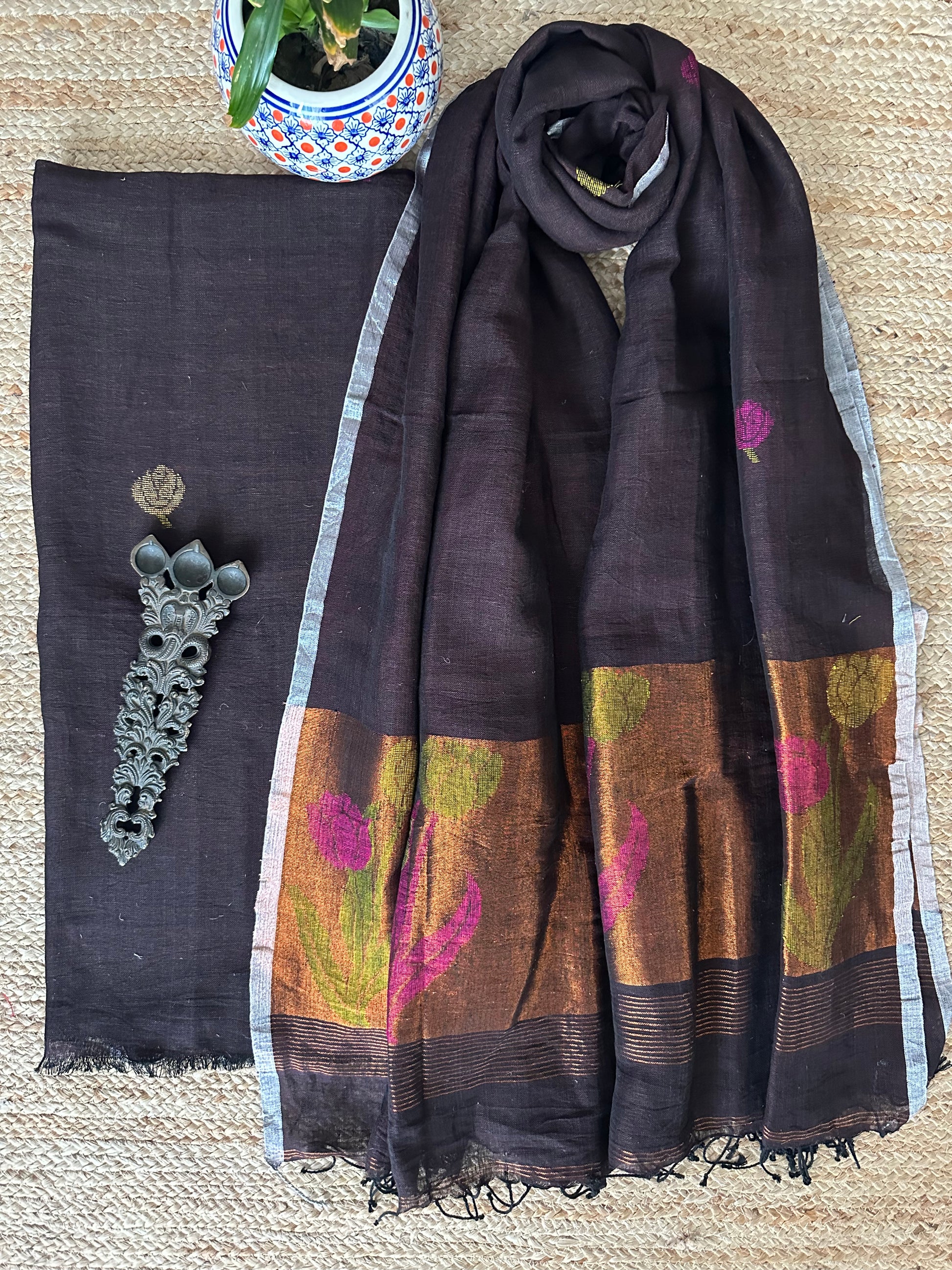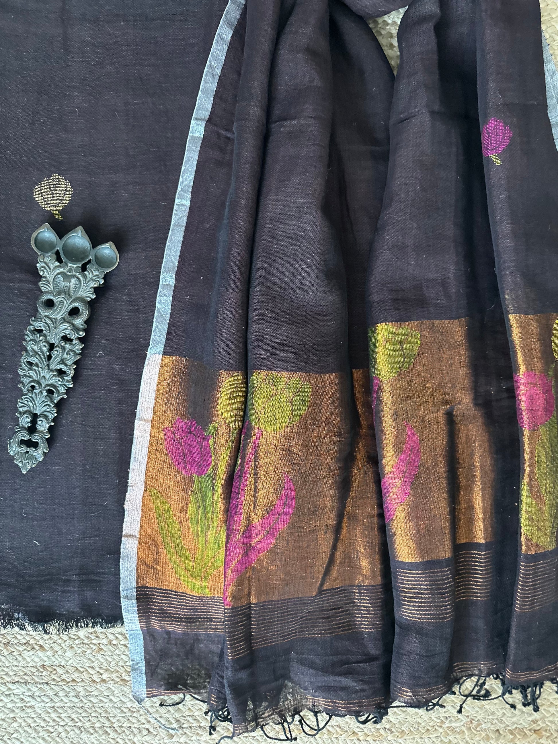 CHARCOAL JAMDANI WOVEN LINEN  KURTA SET WITH HAND EMBROIDERY JAMDANI DUPATTA