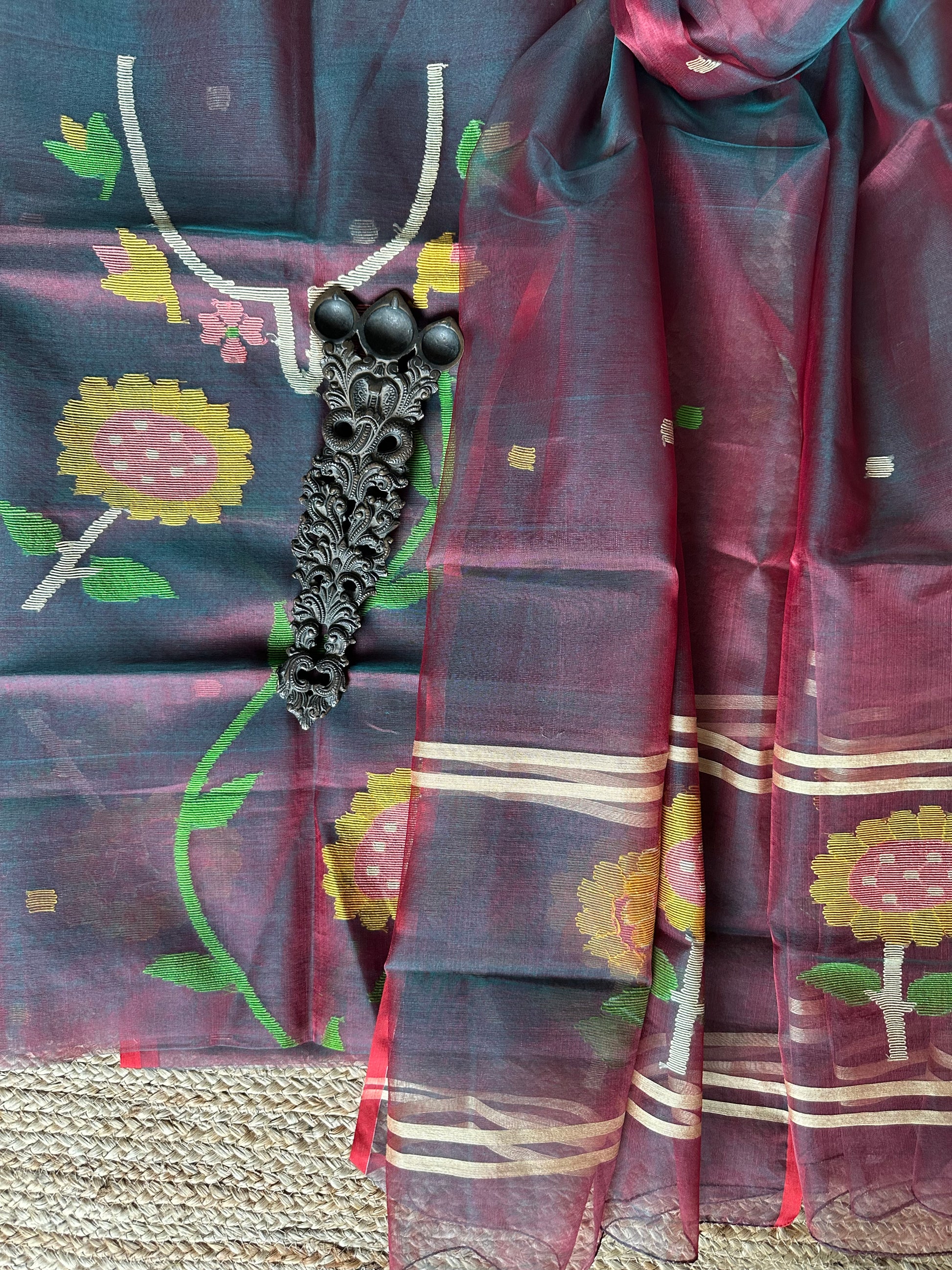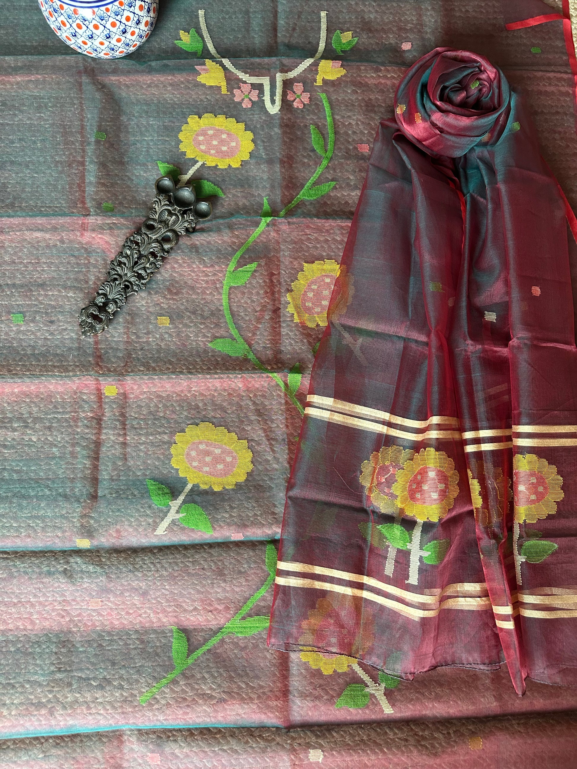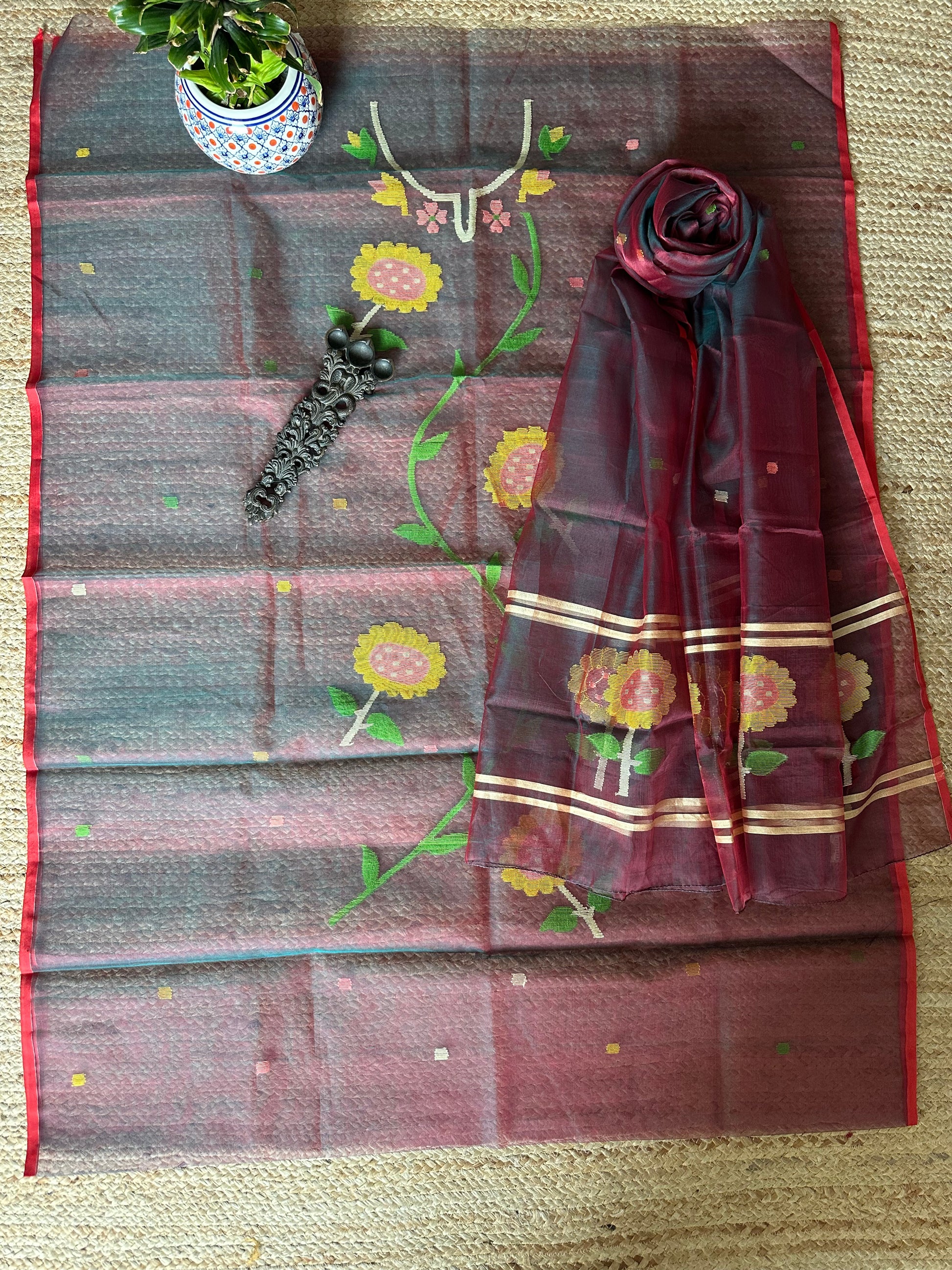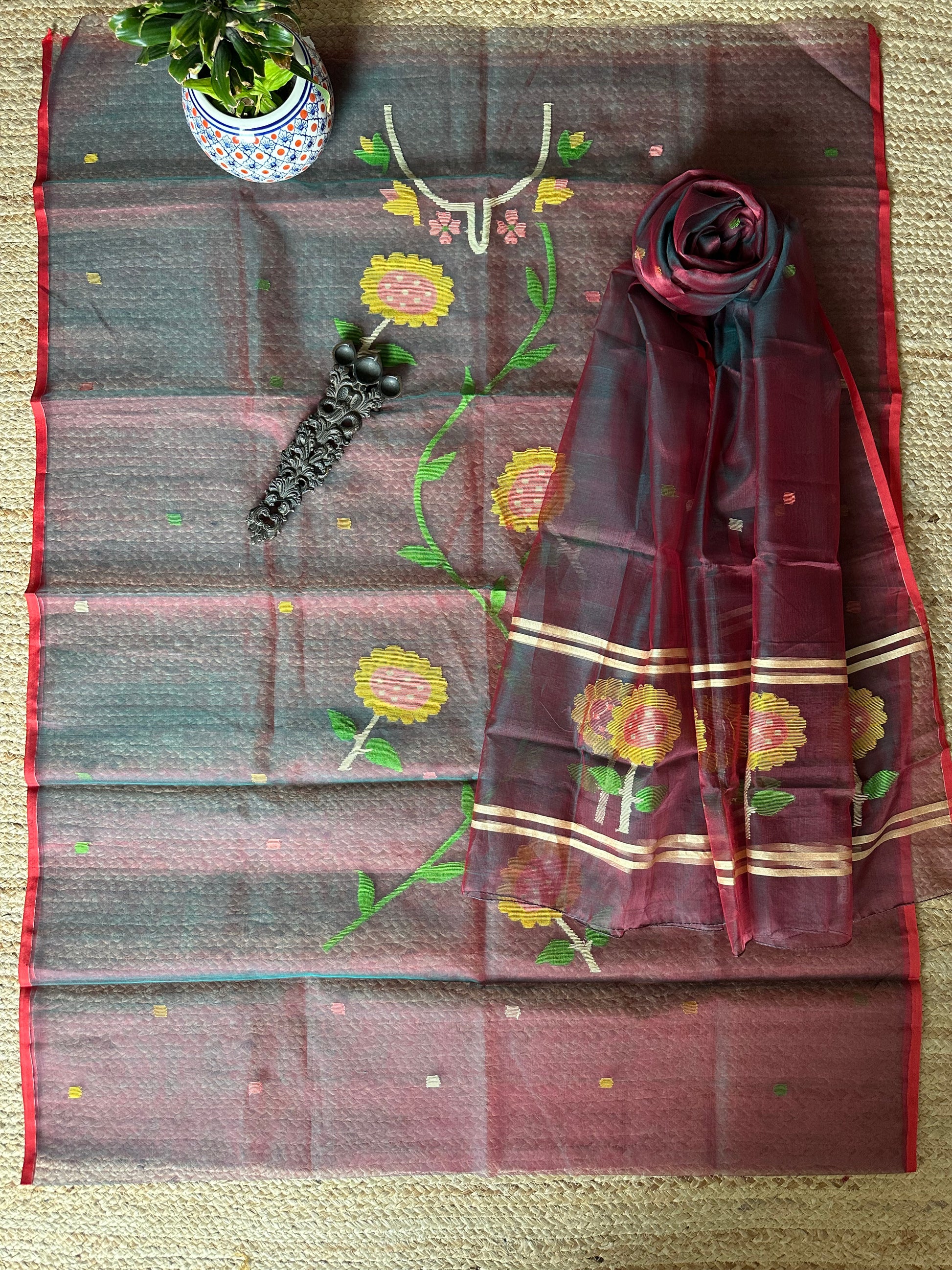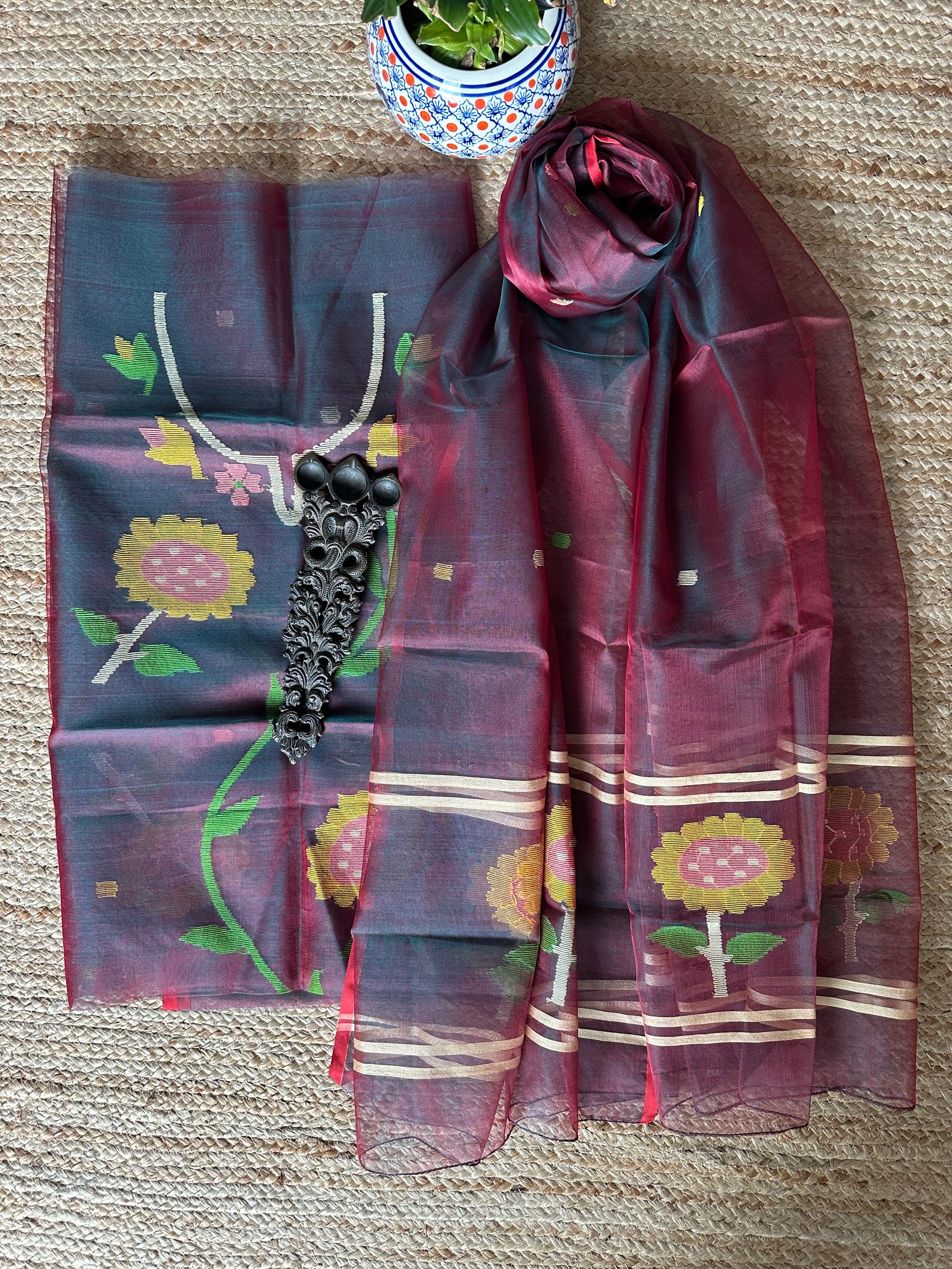 | Greenish maroon dual shade handwoven pure muslin silk kurta with resham jamdani muslin dupatta fabric: 2.5 mtrs meter dupatta : 2.5 mtrs * 35'' slight difference in shade could be due to camera & lights. embrace the imperfection !! happy handloom dry clean only |