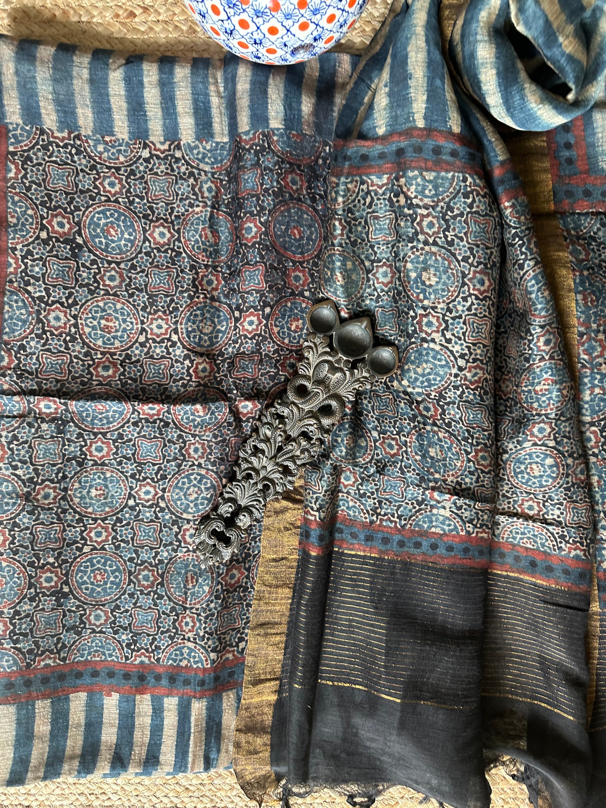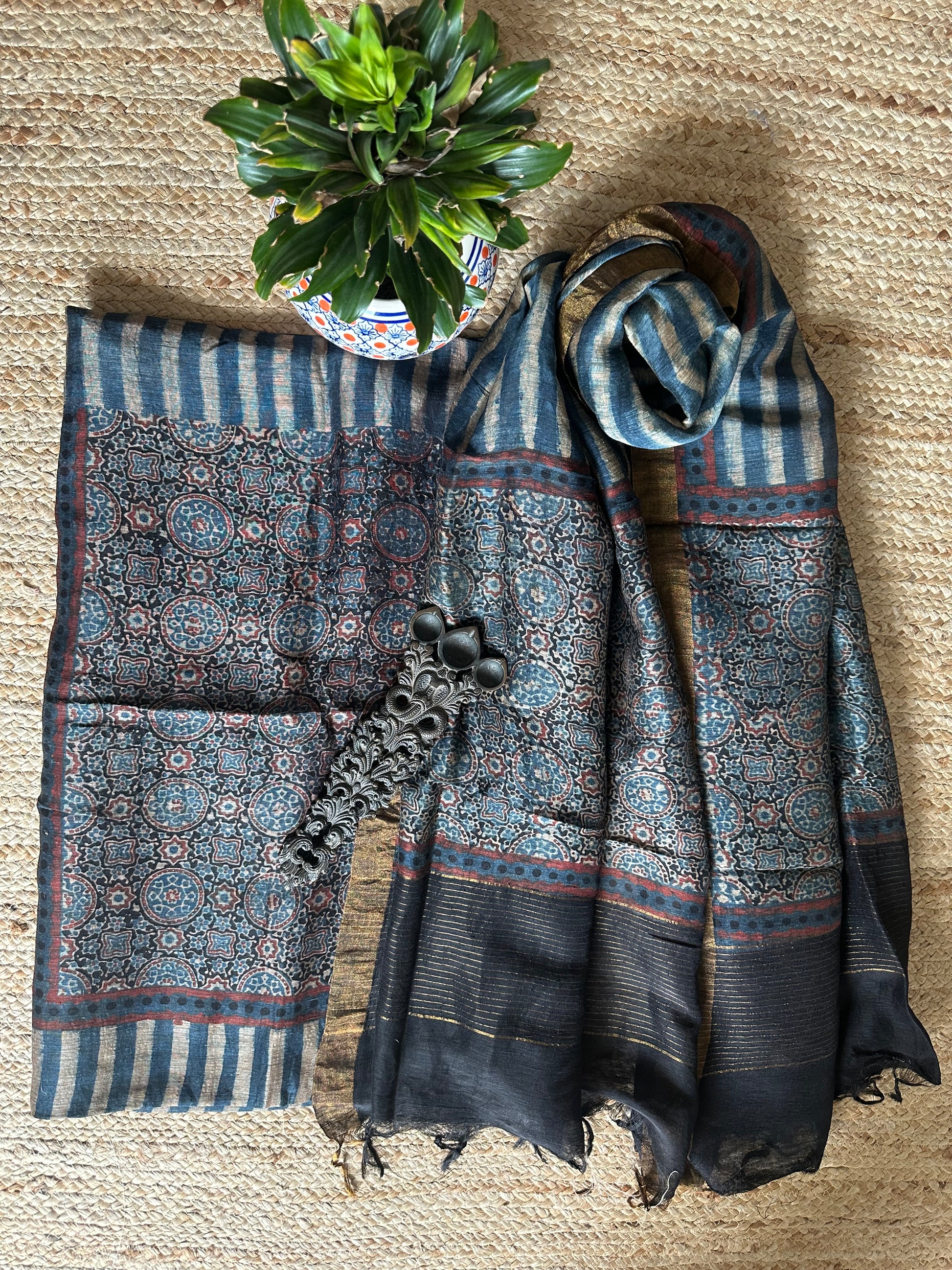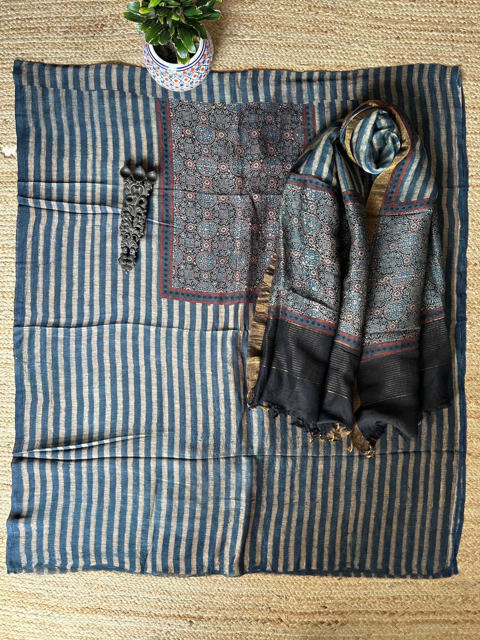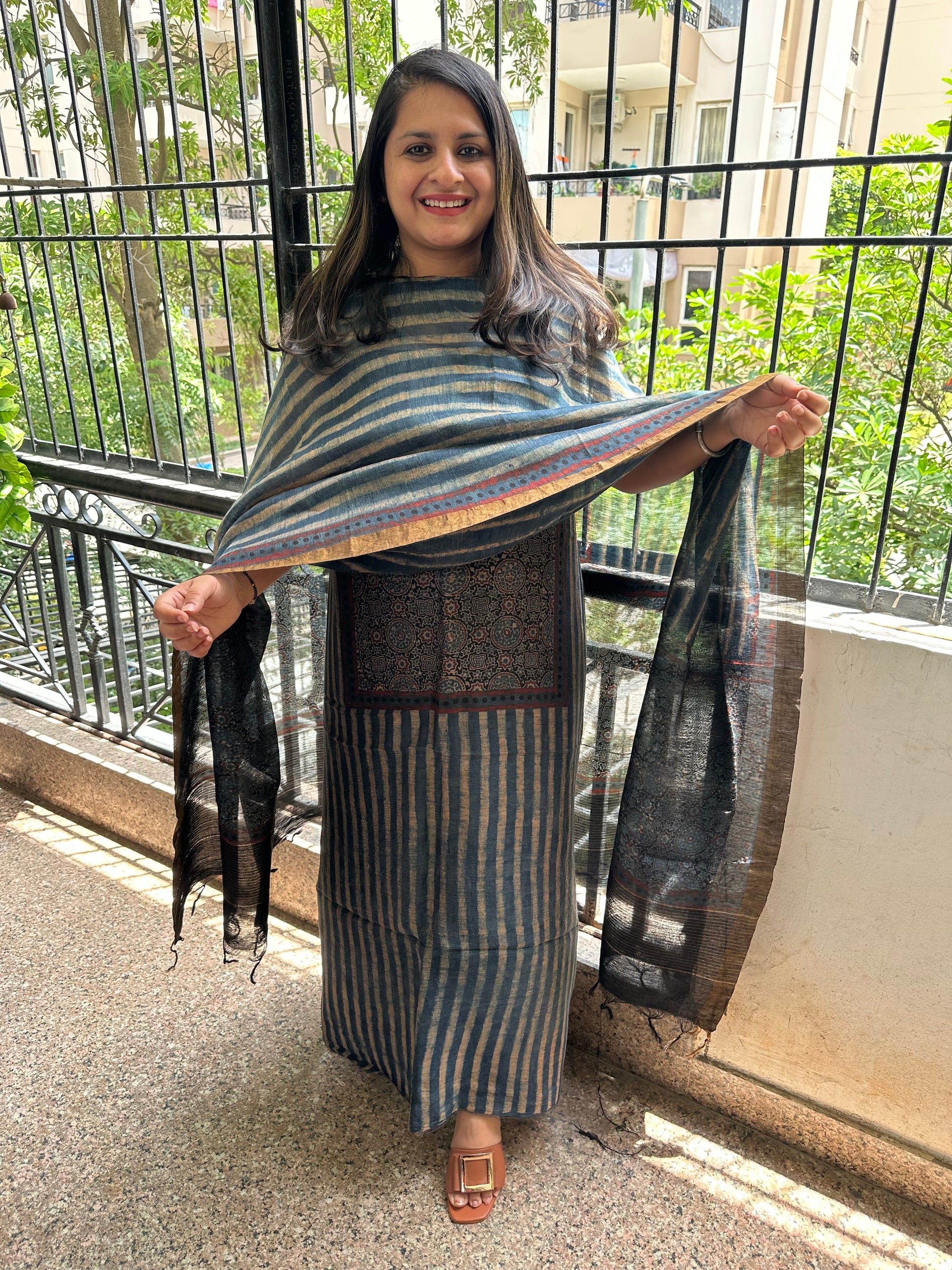 Indigo blue Linen hand block kurta with linen silk ajrakh hand crafted dupatta with zari border