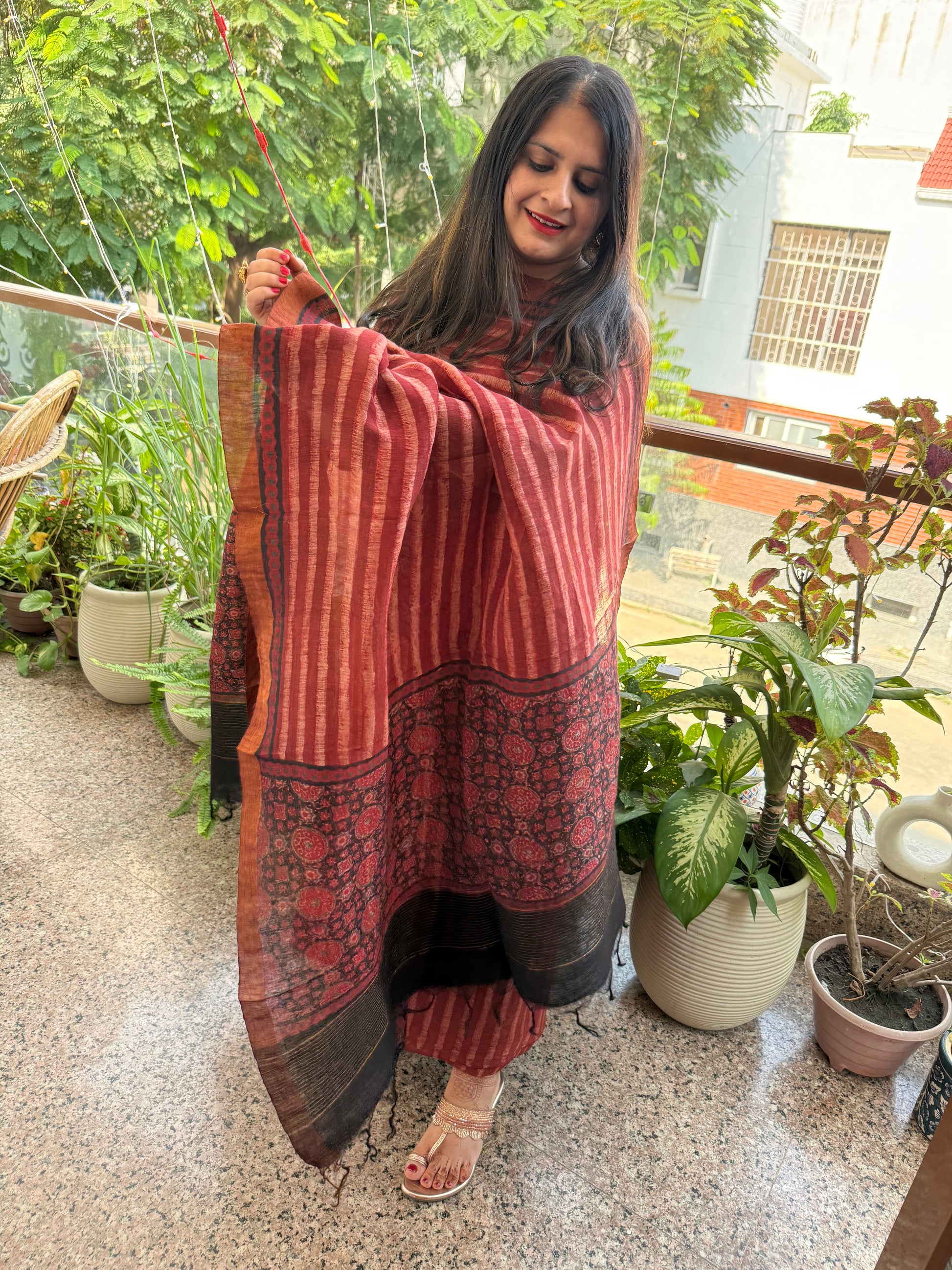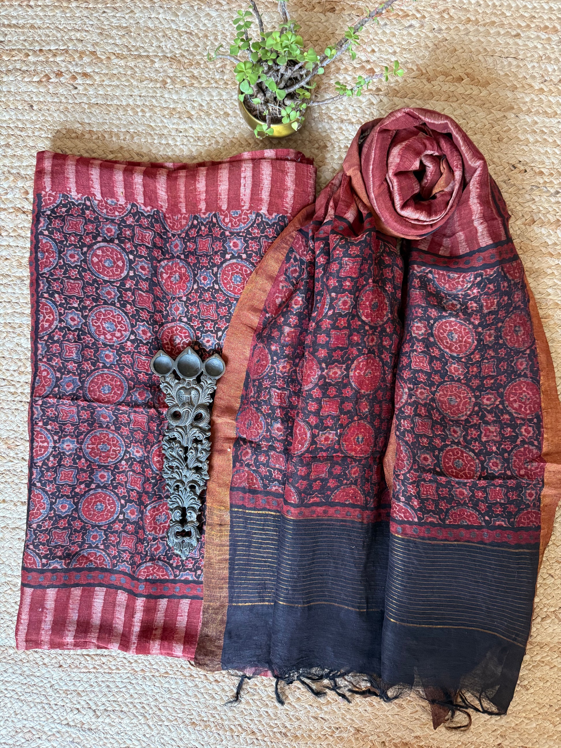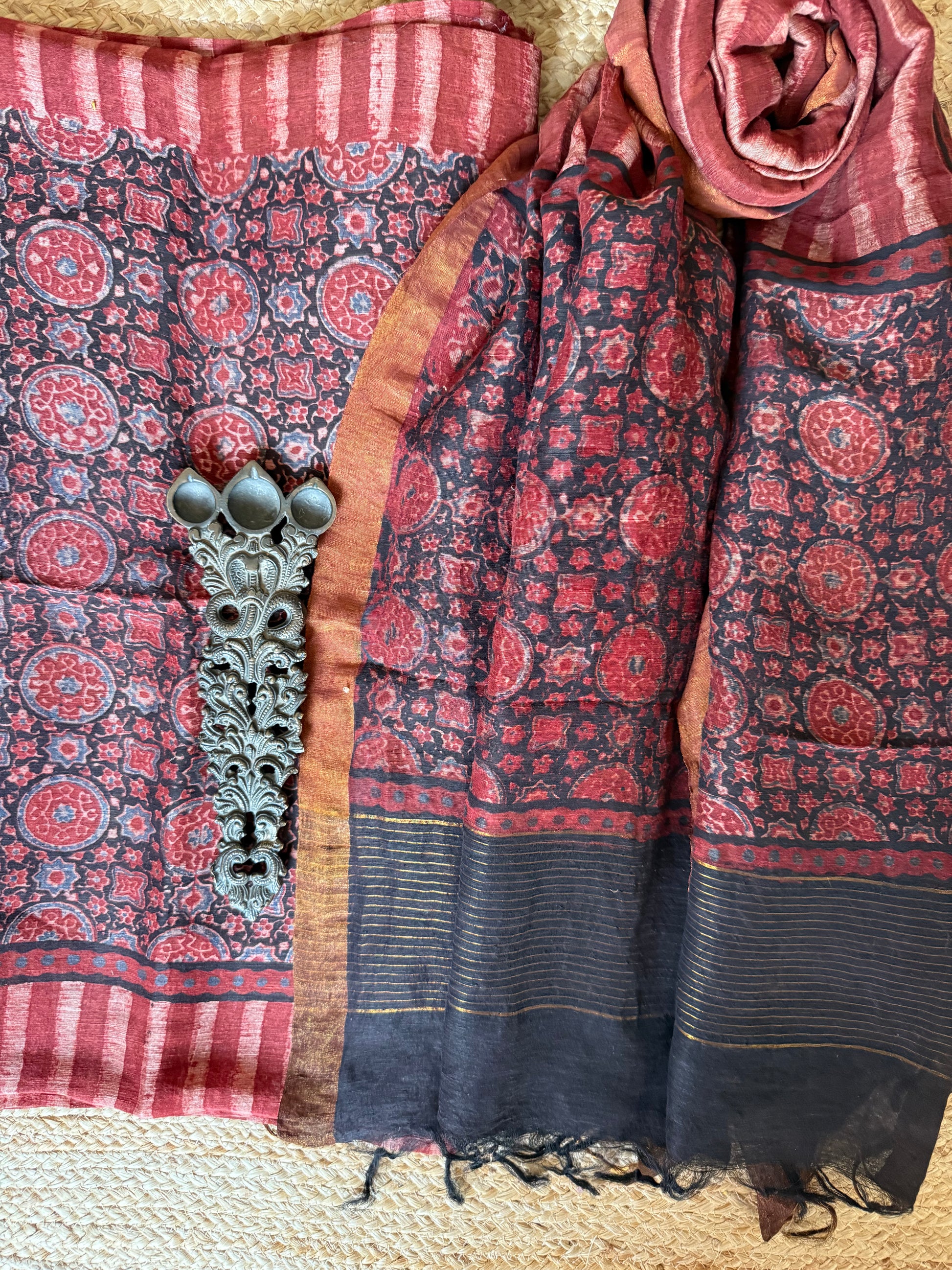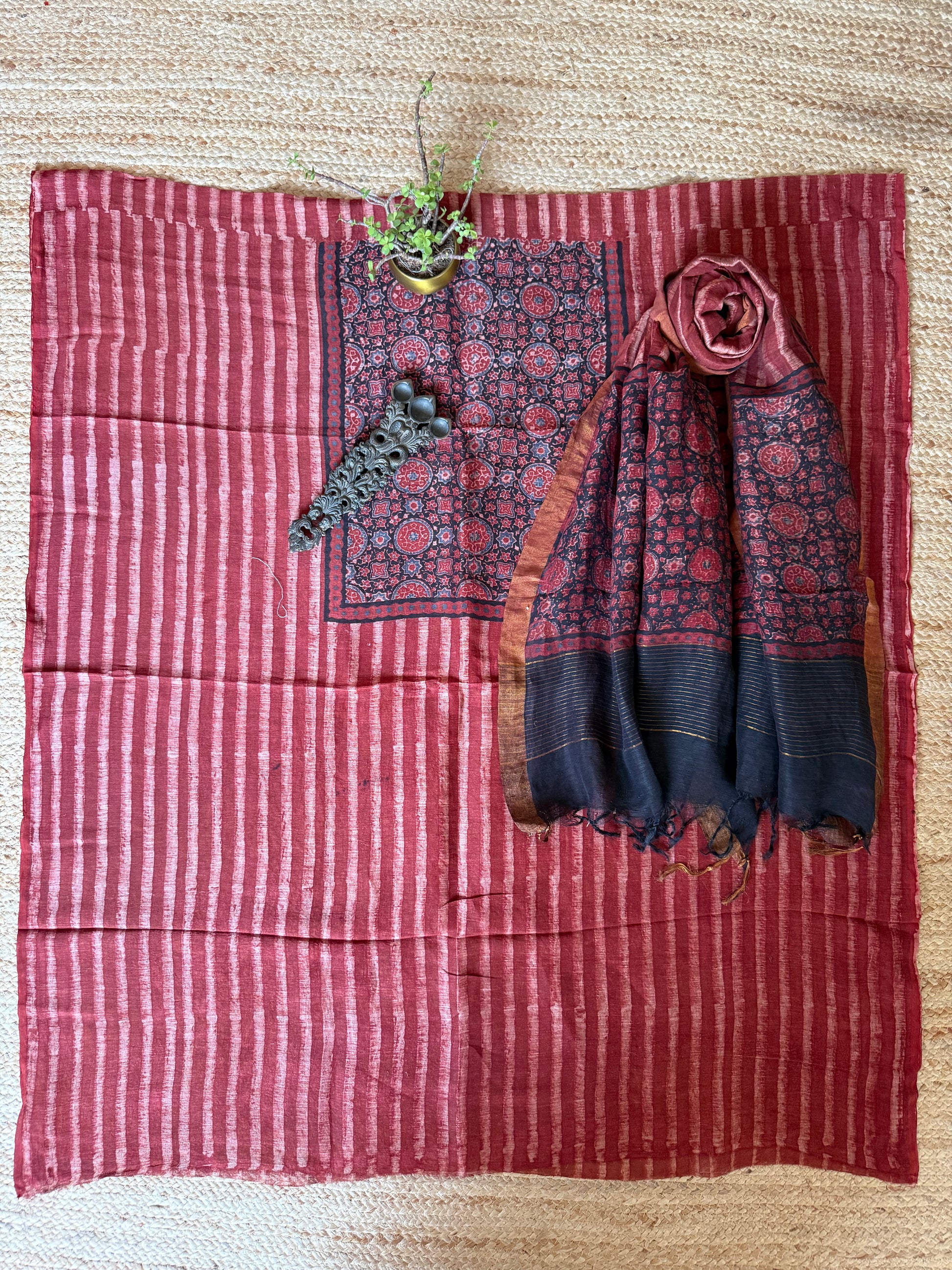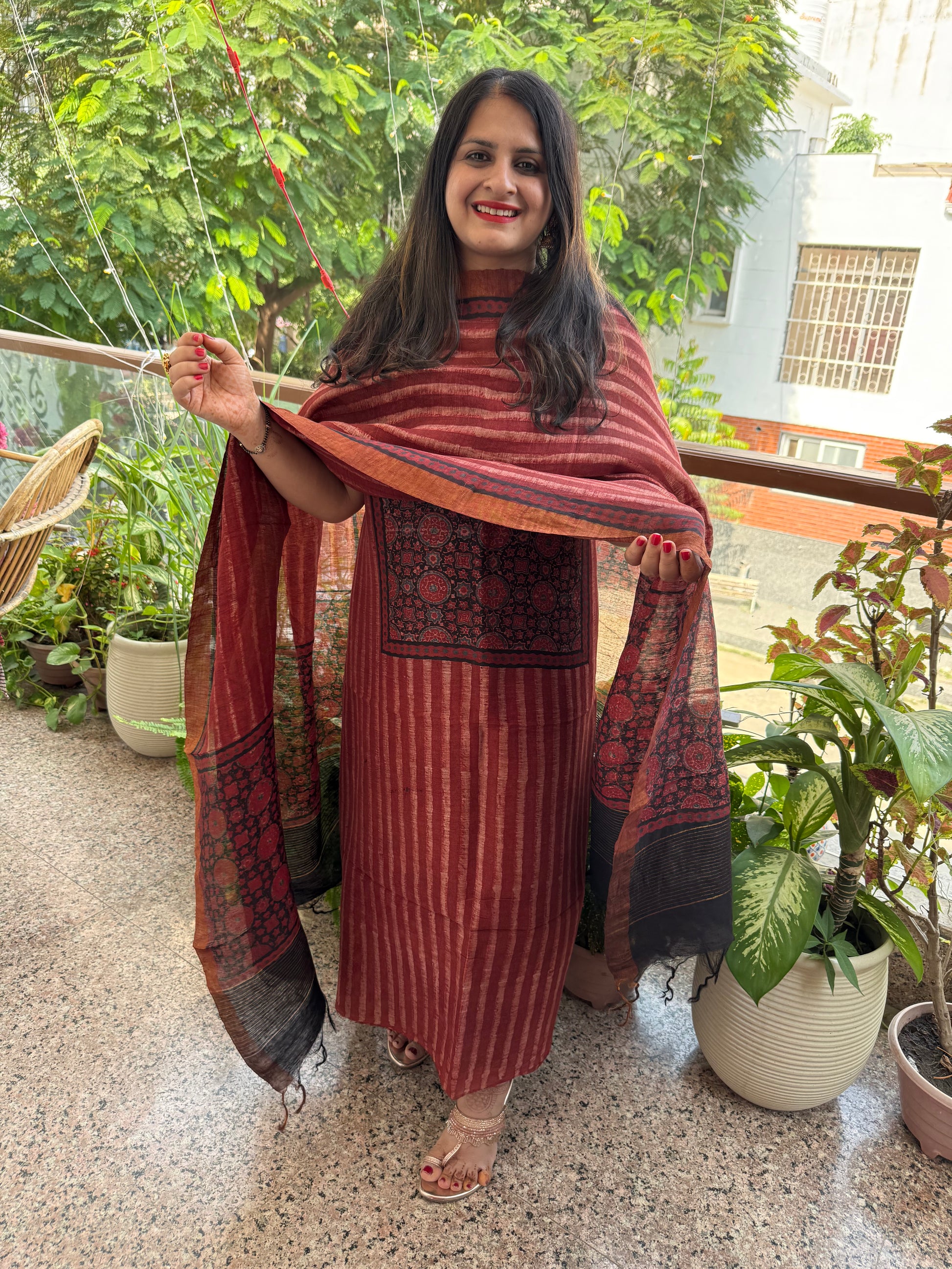 MAROON Linen hand block kurta with linen silk ajrakh hand crafted dupatta with zari border
