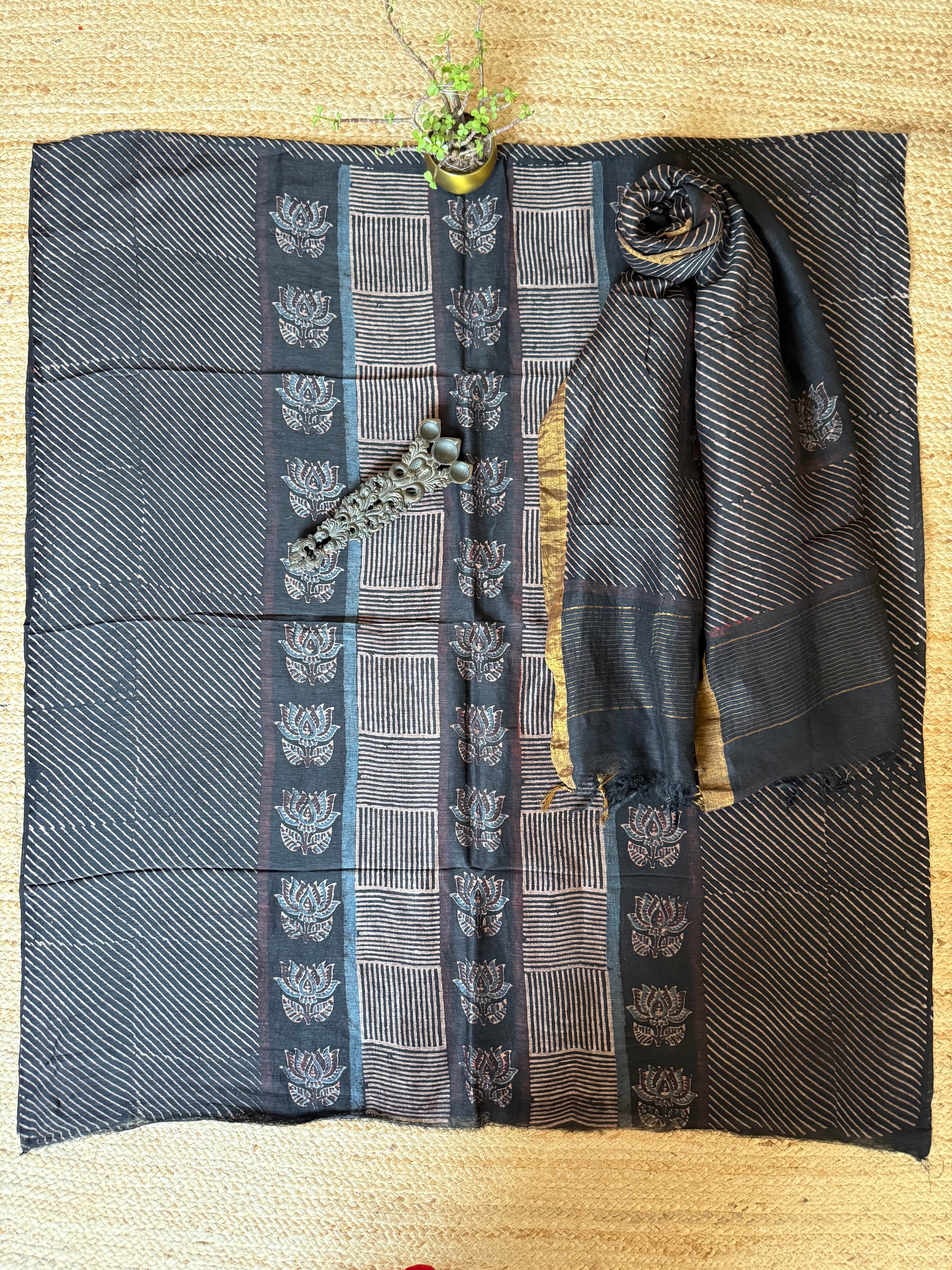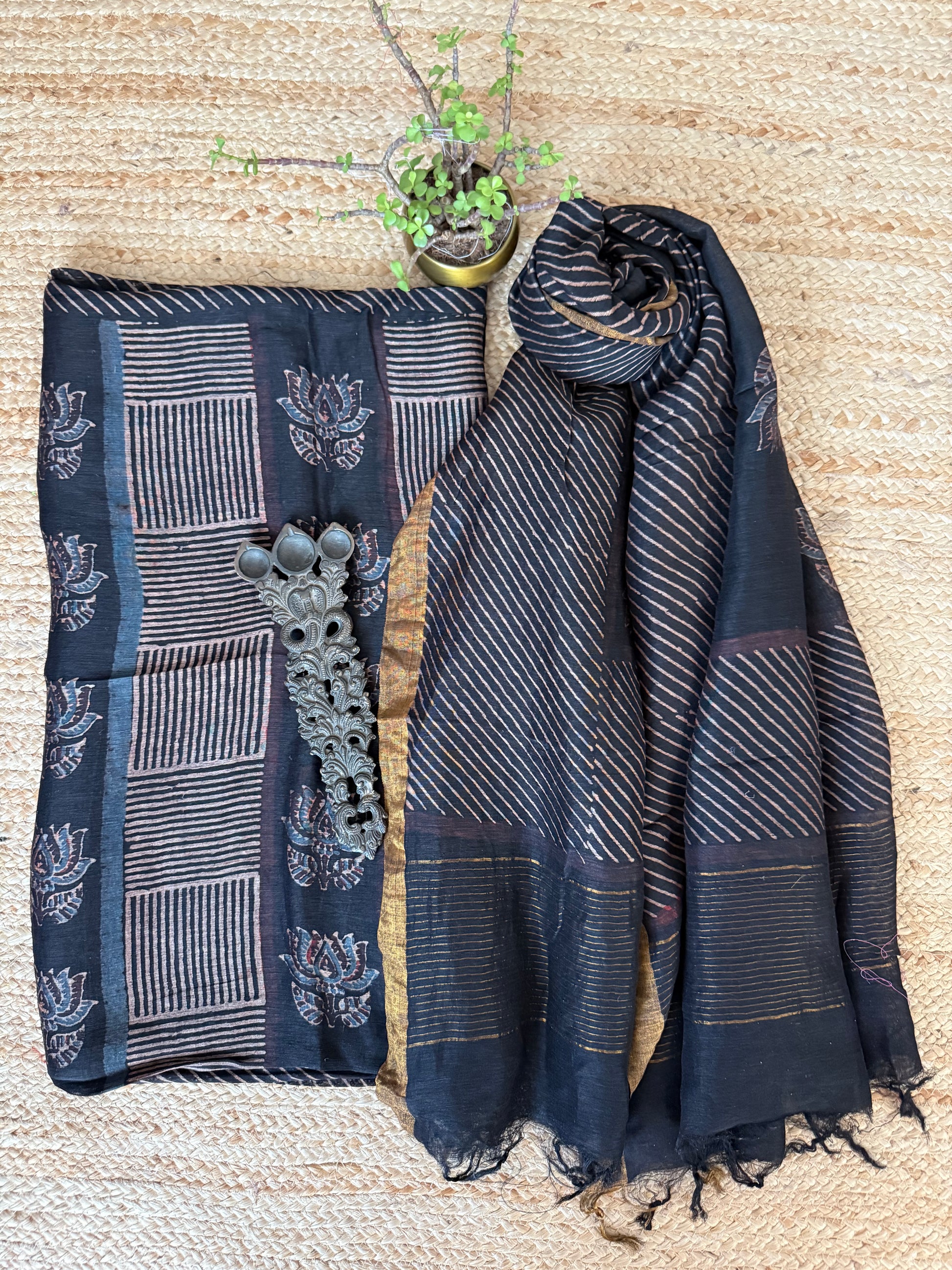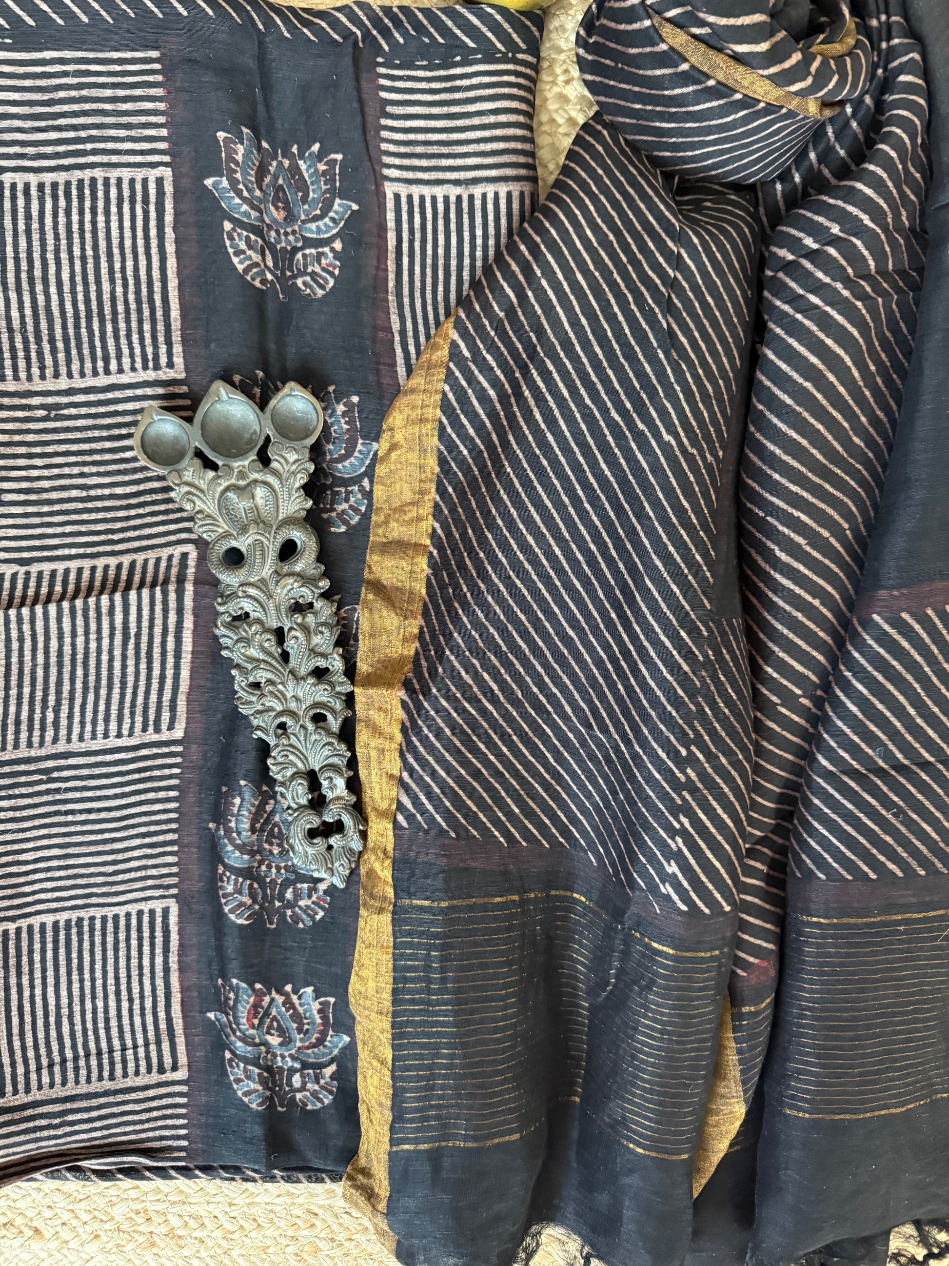 BLACK AJRAKH LINEN SILK HANDBLOCK SUIT SET AL-10301