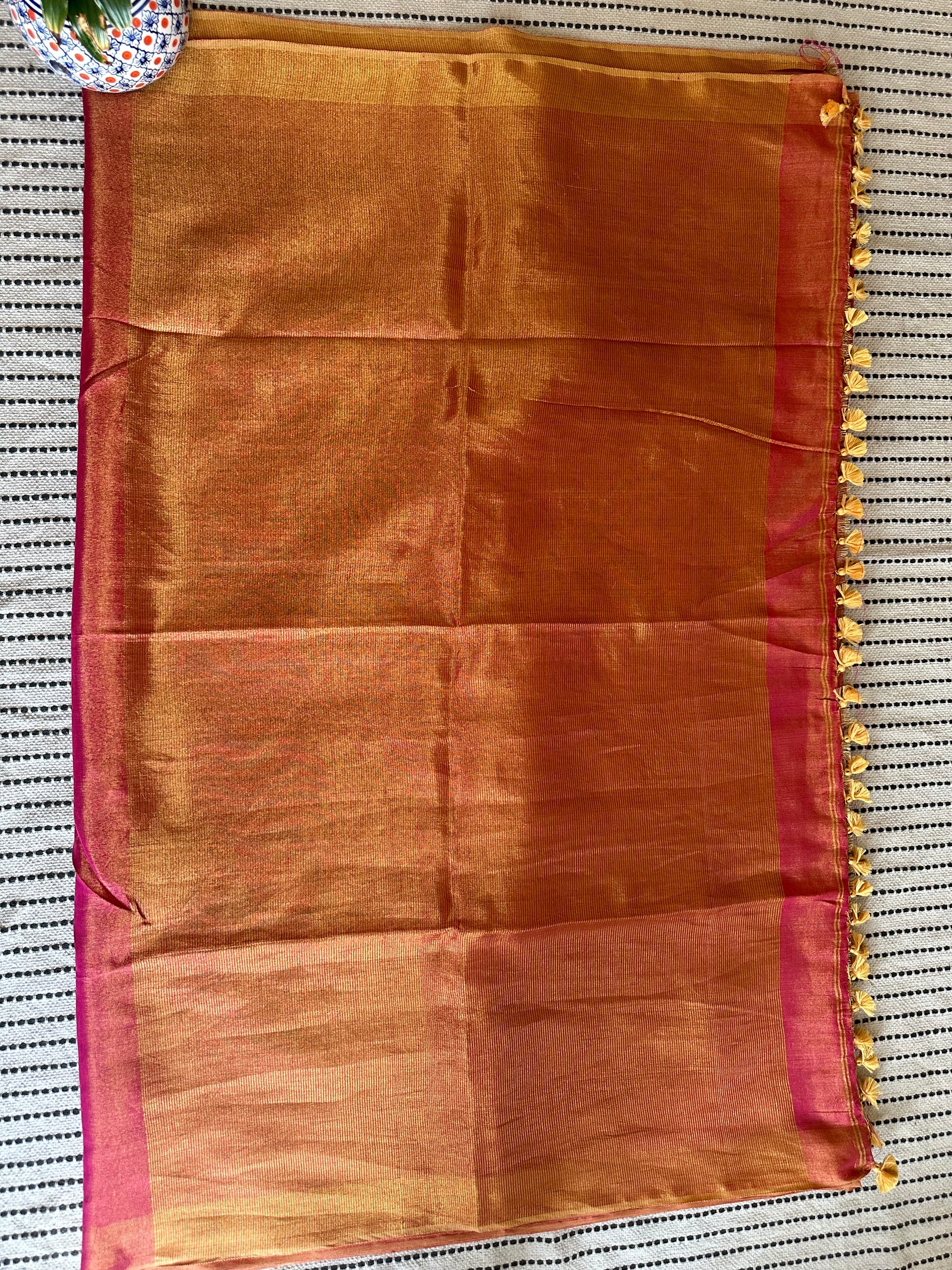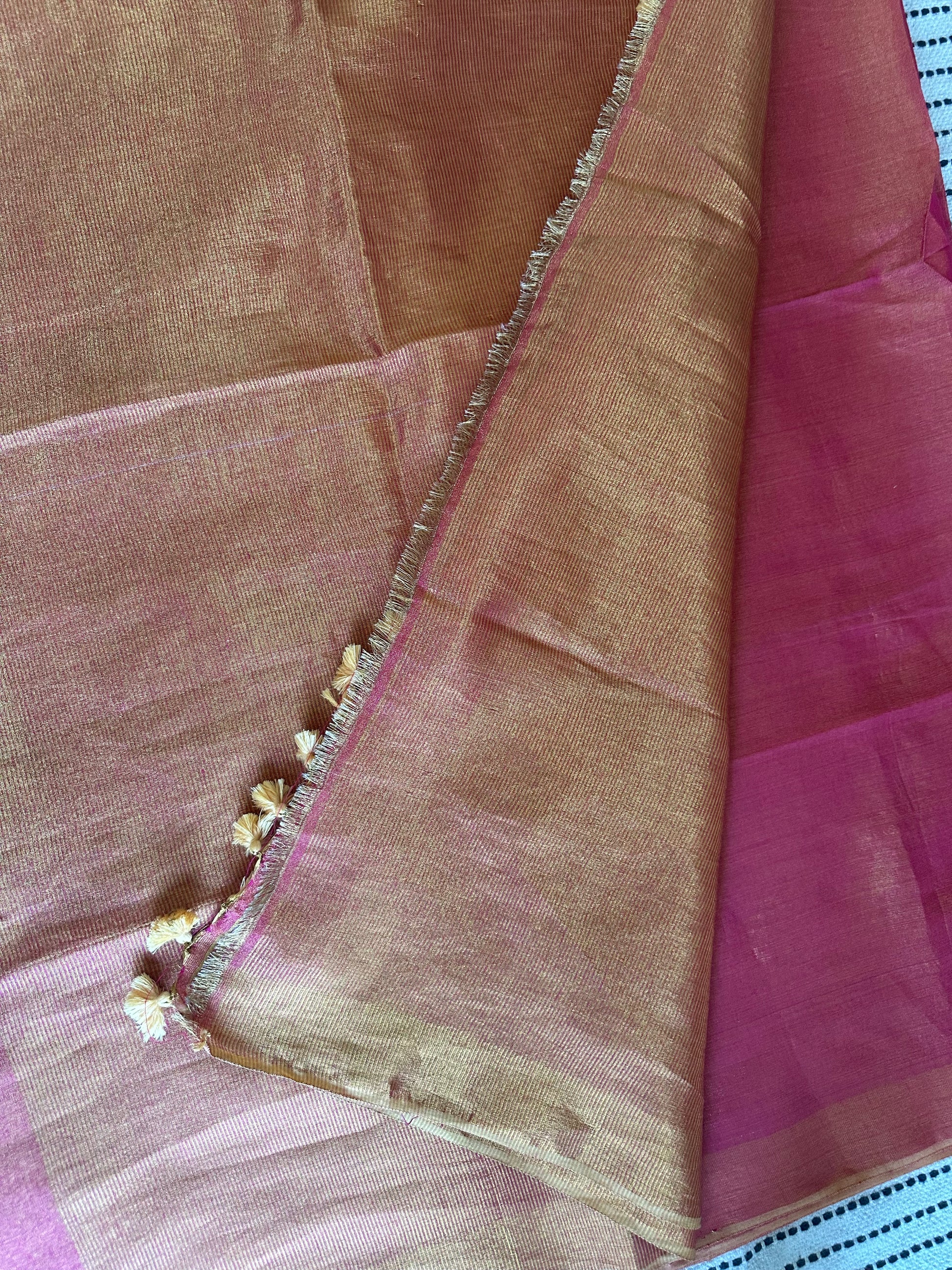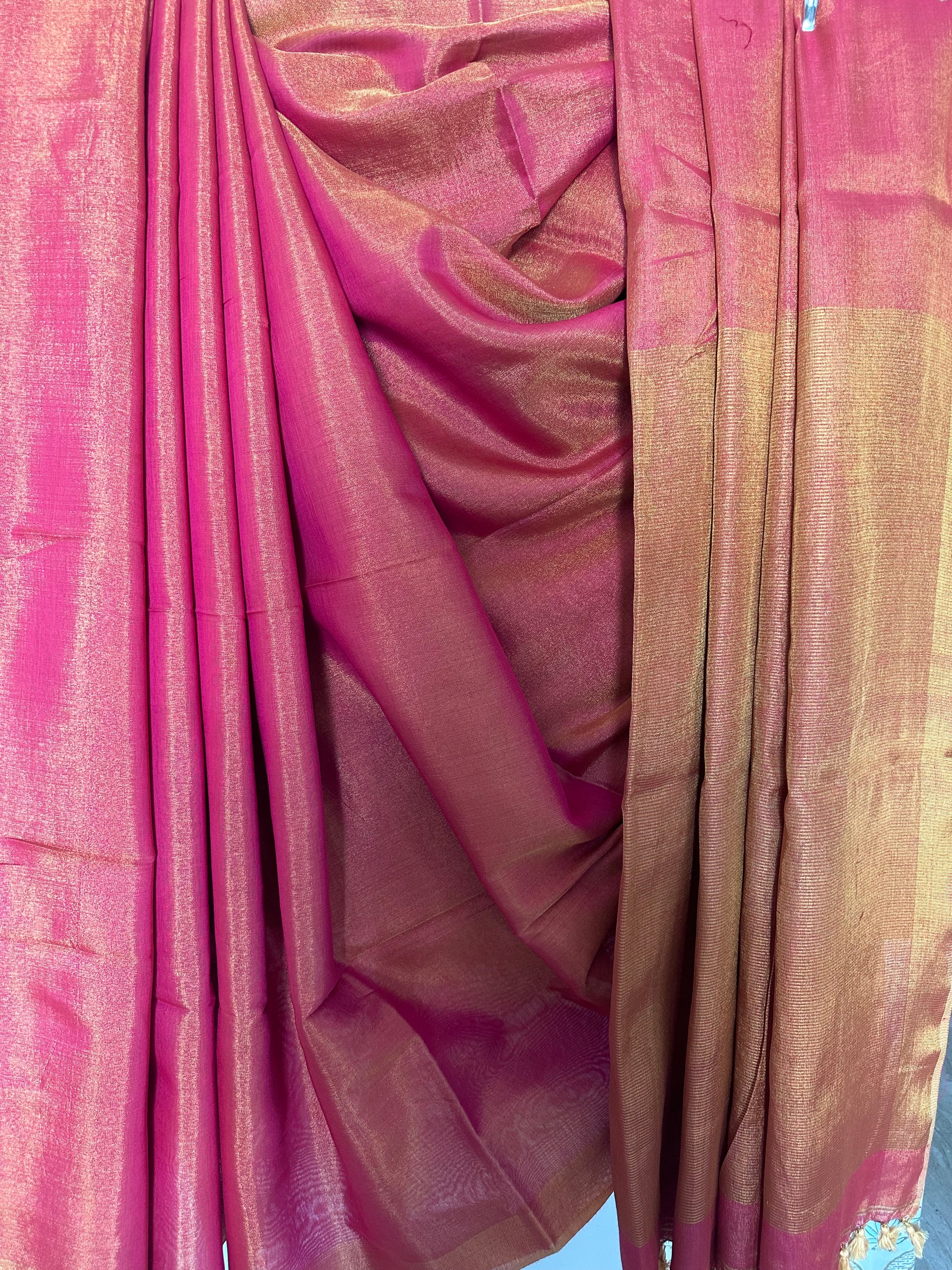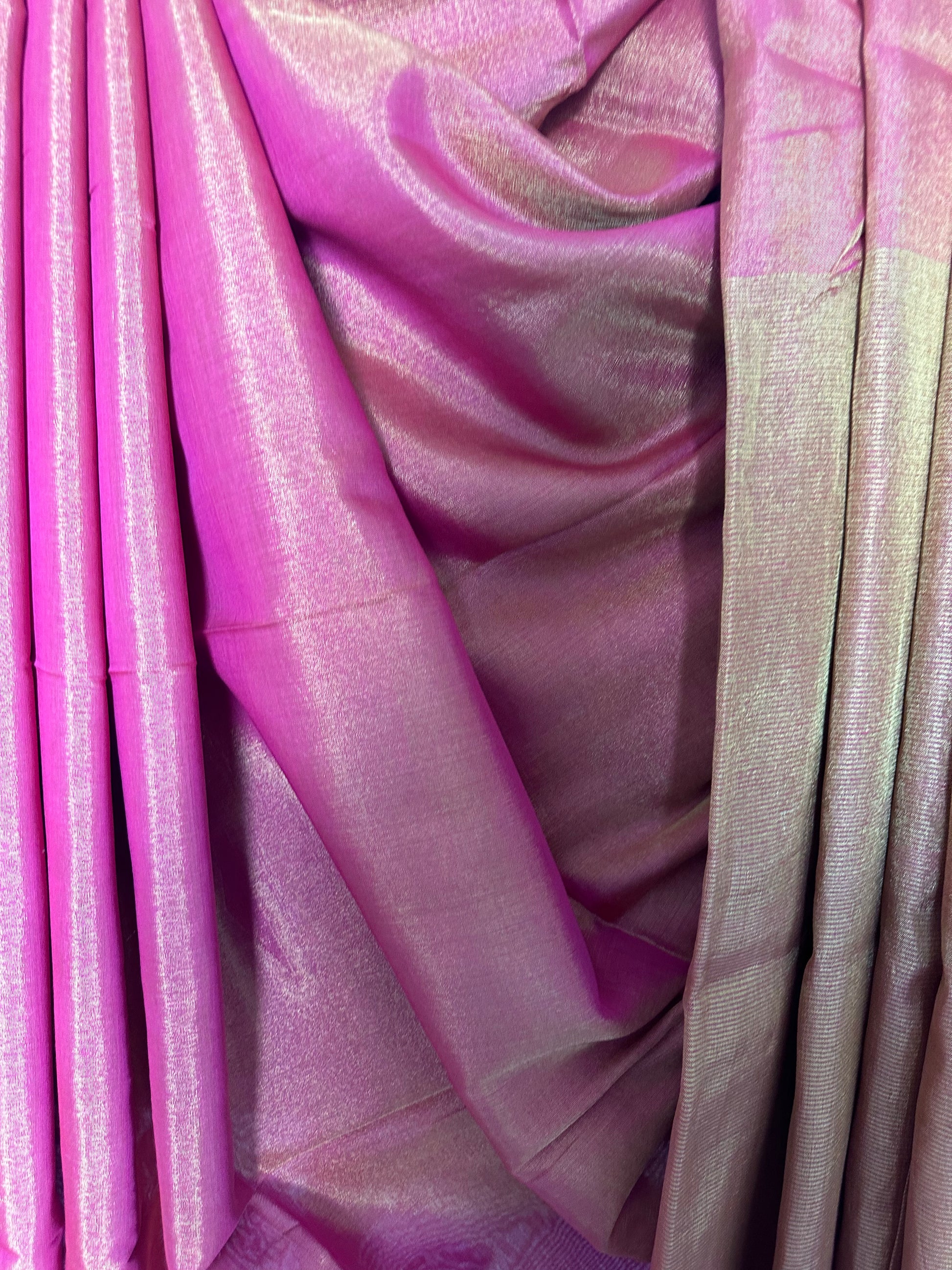 FUSCHIA PINK TISSUE LINEN ZARI SARI WITH WOVEN MAROON BORDER TL-15