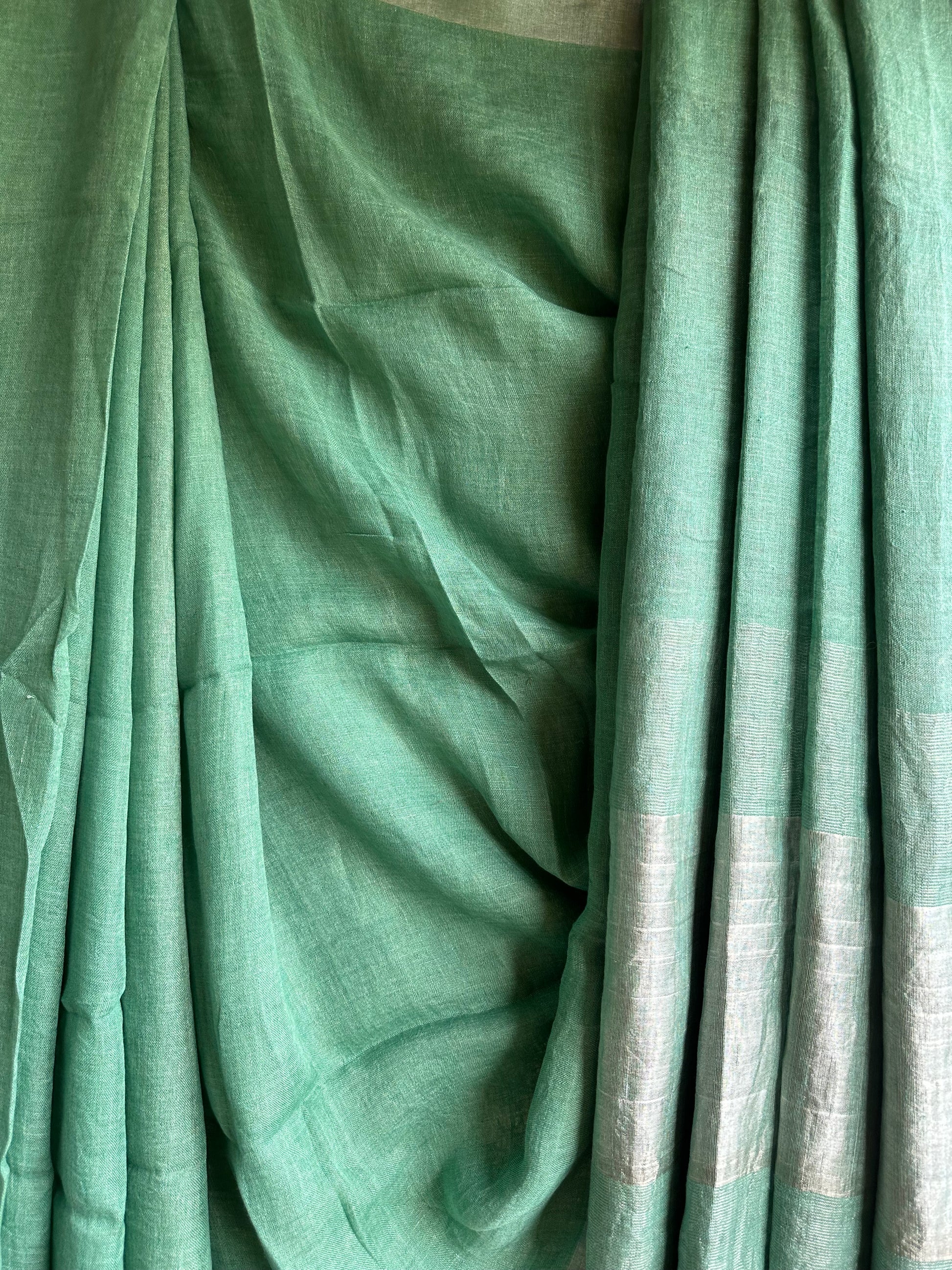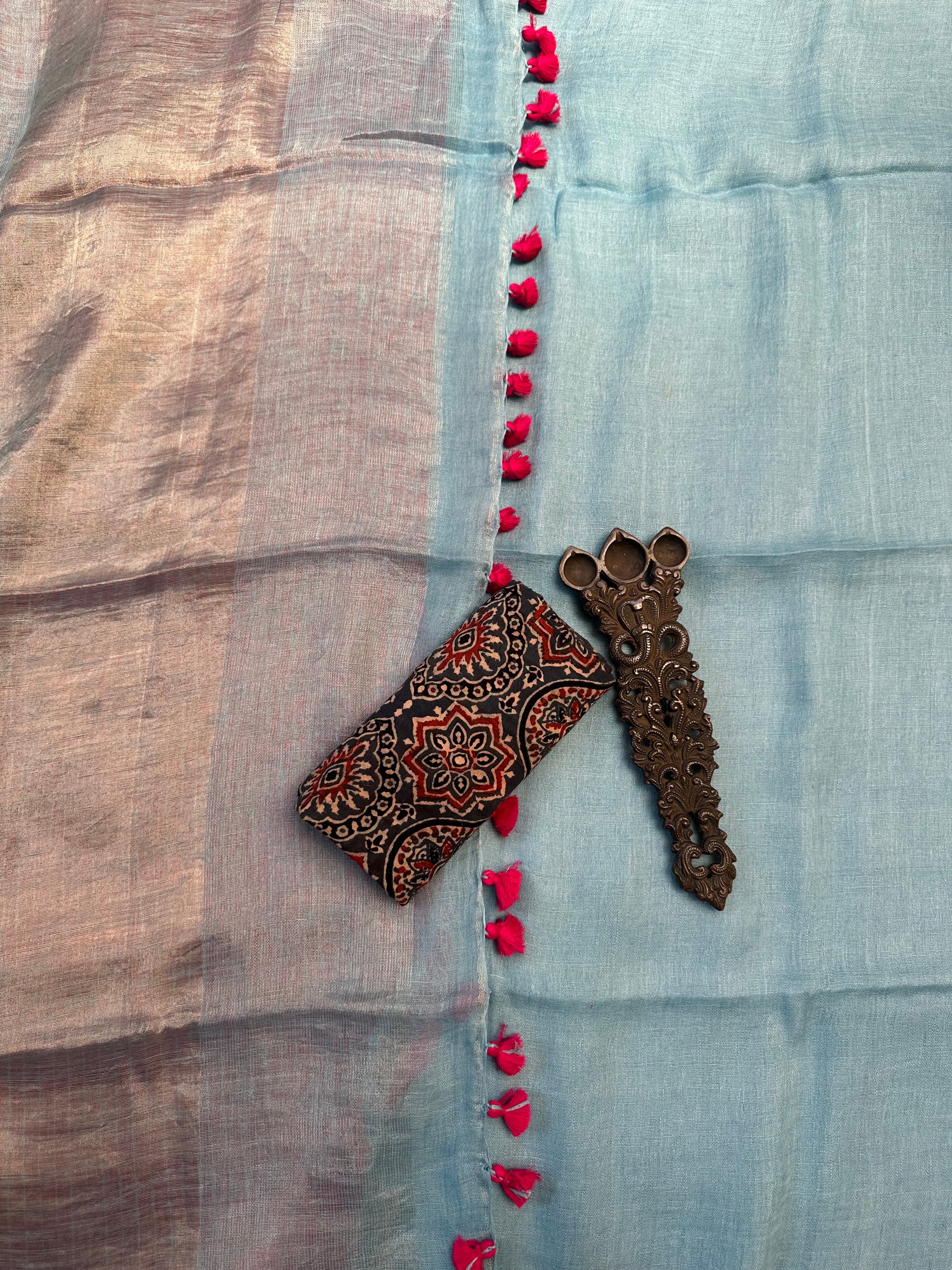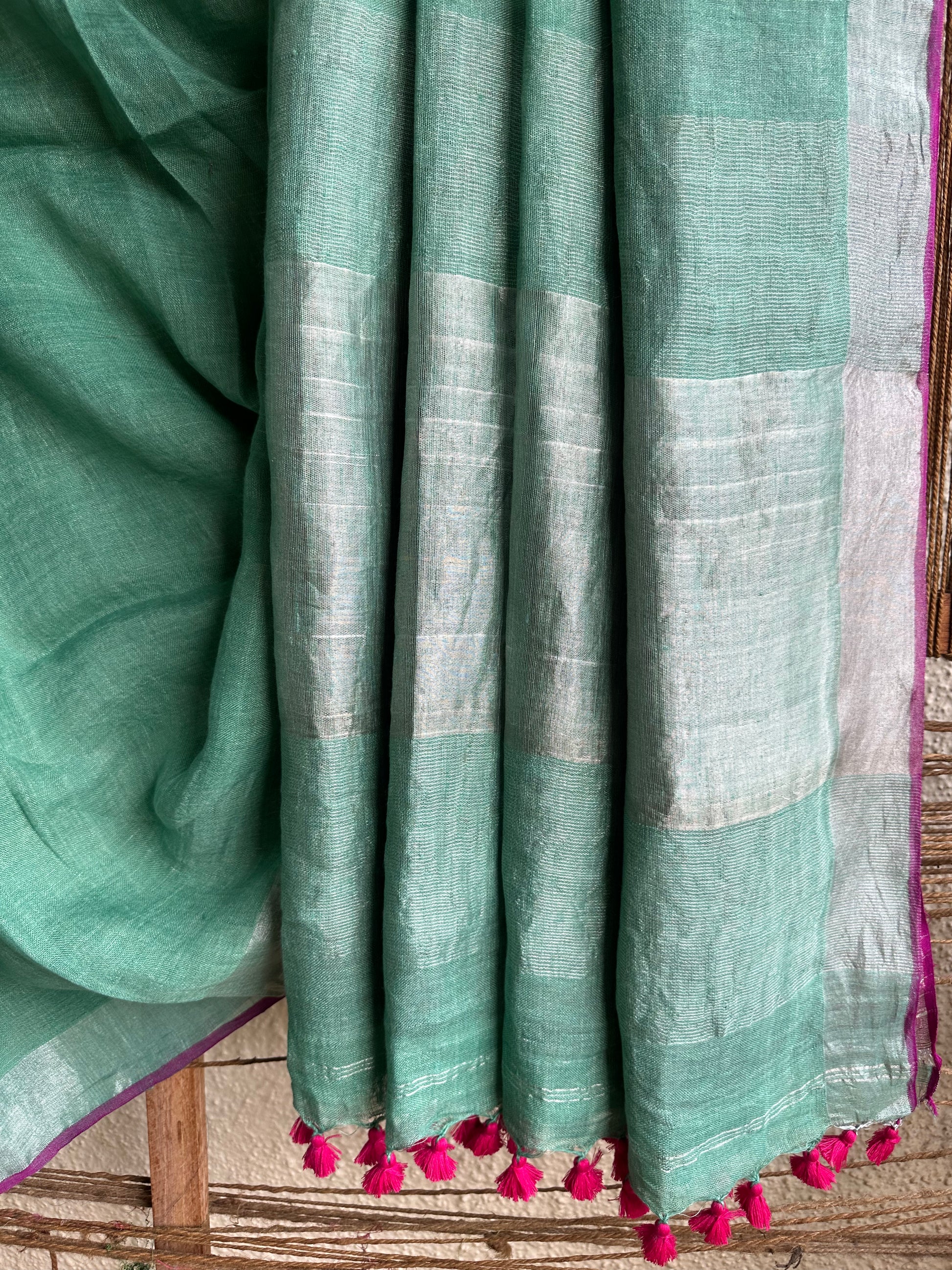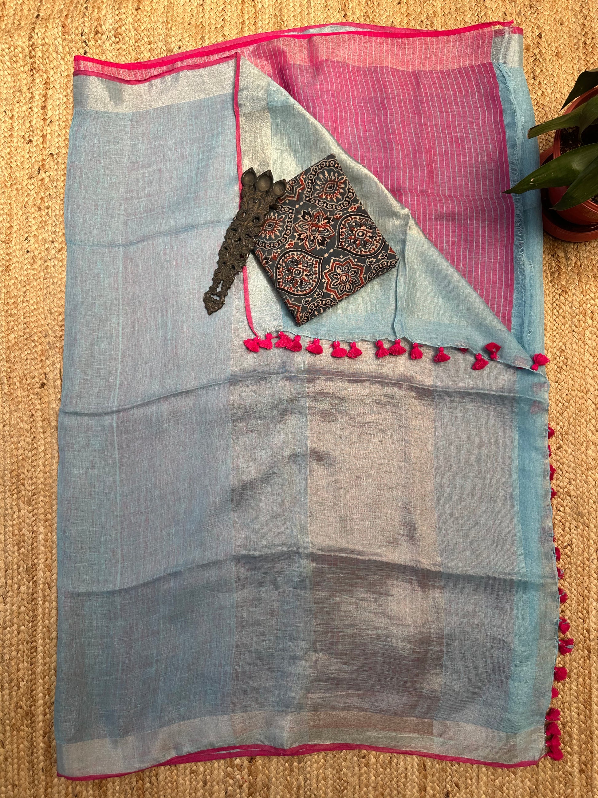 FIROZI LAVENDER LINEN COTTON SARI WITH WOVEN WHITE BORDER & ORANGE TASSELS